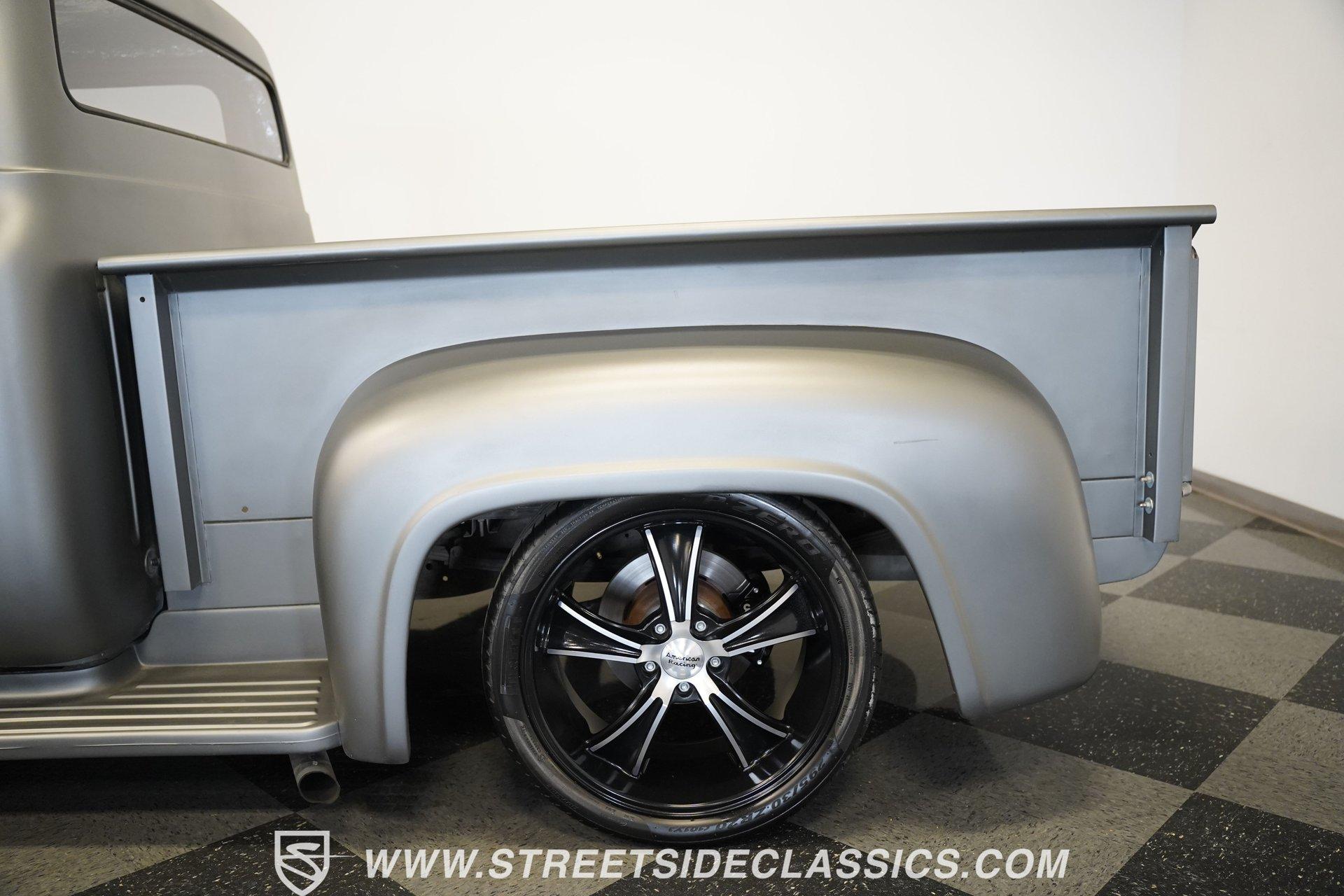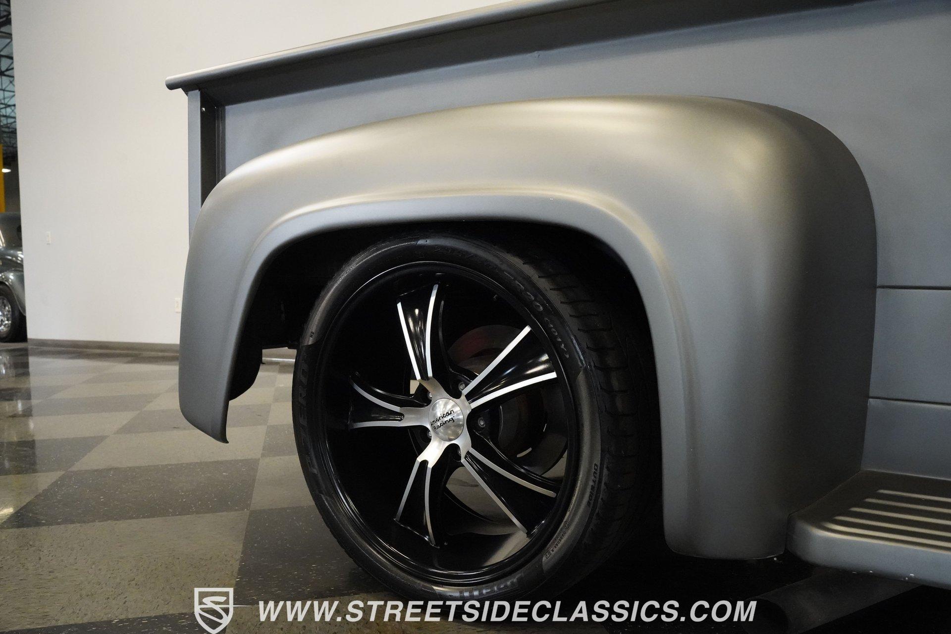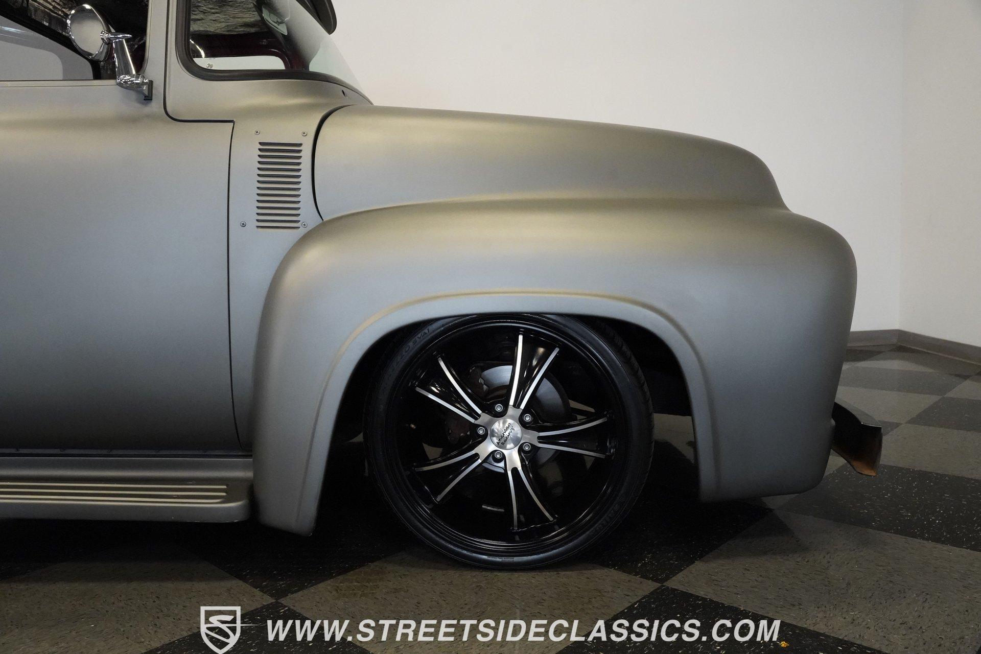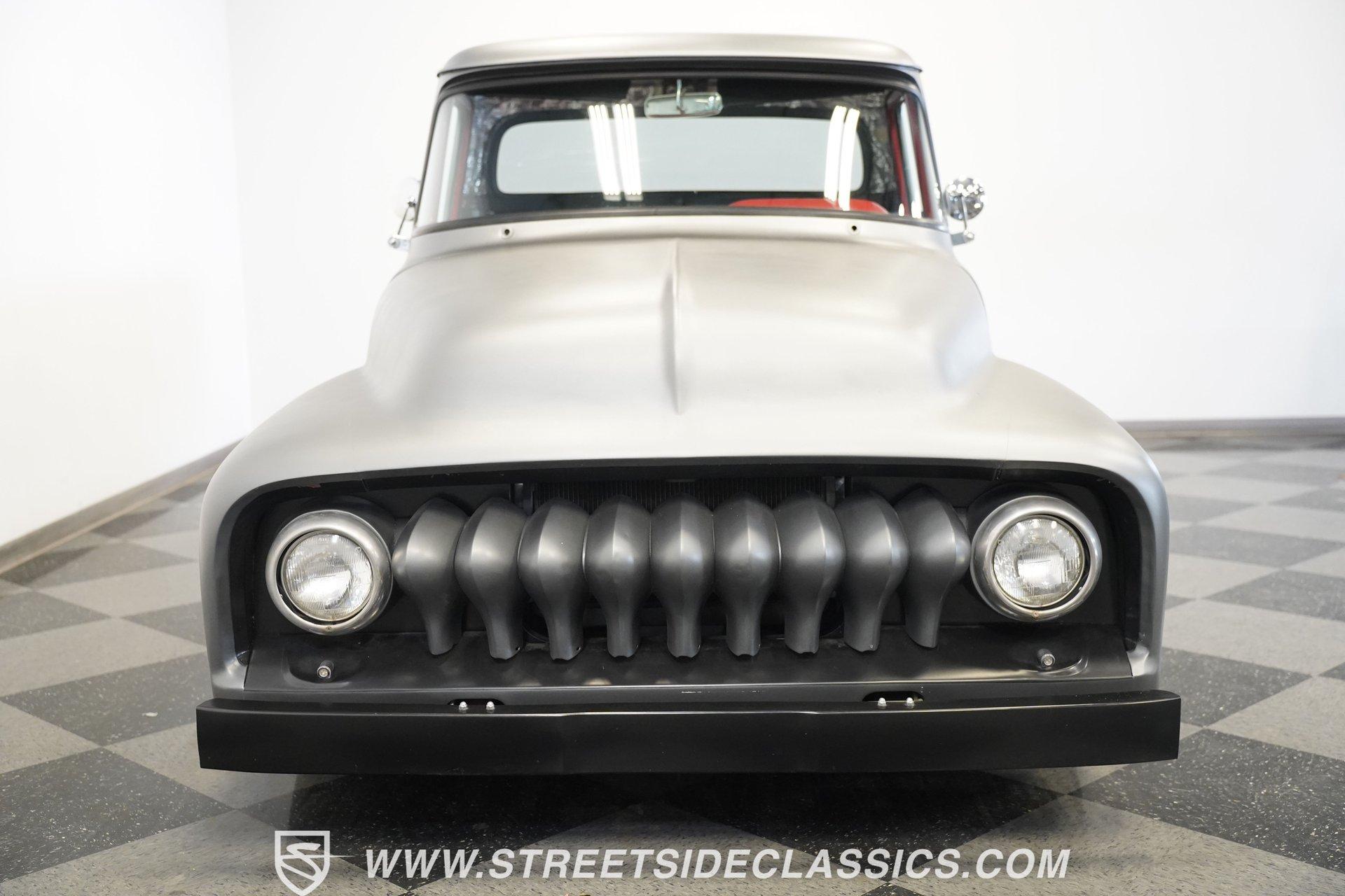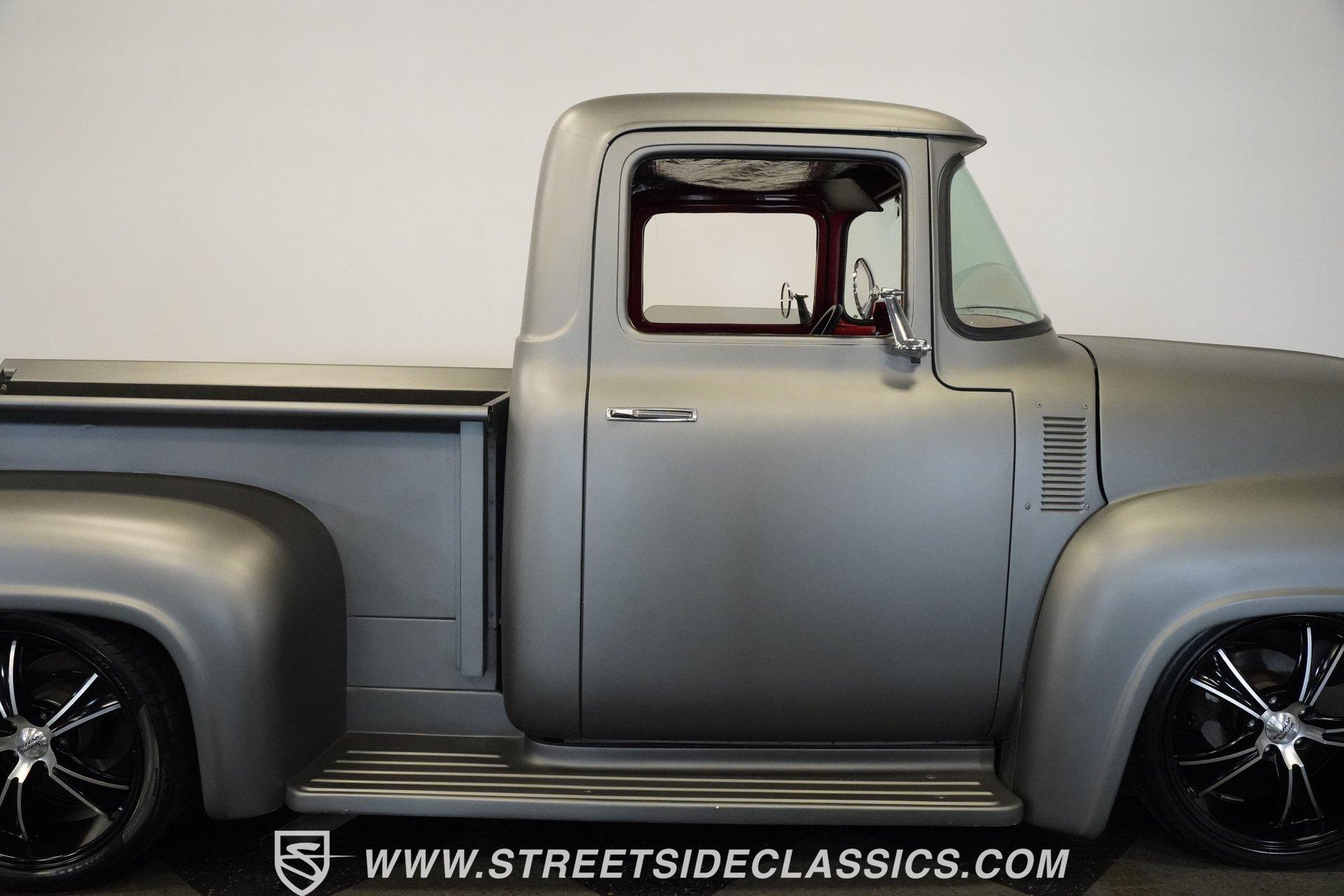 There is something about a classic truck that has been modified and selectively modernized that is just special. Whether it is goosebumps or a Joker-like smile, one look at a truck like this 1956 Ford F-100 in person is guaranteed to elicit a reaction. Fully repainted in a matte grey, this resto-modded truck features a custom one-piece tilt-forward front end, custom first-gen-inspired front grille, and upgraded windows with a vent window delete, allowing for a clean single-pane side glass look. Inside, we find a red and black interior highlighted by a set of wild-looking aftermarket steel bucket seats separated by a custom-fabricated steel center console, complete with dual cupholders. A banjo-style, power-assisted steering wheel sits just in front of a six-pod Dolphin gauge cluster, accentuated by a large 140 mph speedometer and an 8,000 rpm tachometer, each flanked by a set of auxiliary gauges on either side. A Pioneer AM/FM/CD/Aux/Bluetooth head unit offers far more soundtrack options than the original AM unit it replaces, and situated under the dash, does not upset the clean look of the dashboard. Tilt that big front end forward, and inside, we find a 350 cubic-inch V-8 engine. A single four-barrel Edelbrock carburetor sits mounted on a polished air gap-style intake manifold. An aftermarket cam operates lightweight aluminum heads, while spent gases are expelled through a set of shorty headers connected to a dual exhaust and ultimately exiting via a set of Glasspack-style mufflers. Power is routed through a column-shifted TH400 three-speed automatic transmission before being sent out to the 12-bolt rear end. *Restomod *Custom One Piece Front End *Custom Grille *Matte Grey Paint *350 CID V8 *Aluminum Heads *Air Gap Style Intake *Edelbrock Four Barrel Carb *Custom Cam *Shorty Headers *Dual Exhaust *Glasspack Style Mufflers *20 Inch American Racing Wheels *Low Profile Tires *Power Steering *Power Brakes *Four Wheel Discs *Steel Bucket Seats *Custom Center Console *Dolphin Gauges *Pioneer Head Unit *Bluetooth This 1956 Ford F-100 achieves its slammed look thanks to an independent front end suspension that appears to have been donated by a late-model GM vehicle, while its solid axle rear end maintains the old-school feel of the line. A quartet of massive 20-inch American Racing wheels are shod in a staggered set of tires, with a set of 235/55R-20 Atrezzo rubber up front, and a pair of wide 295/30R-20 Pirelli PZero tires out back. Barely hiding behind those huge wheels are a set of power disc brakes at all four corners, giving this muscle truck a well-rounded performance personality. If you are like us and can't help but react when a well-done throwback truck rumbles by, then don't wait another second. Call today!