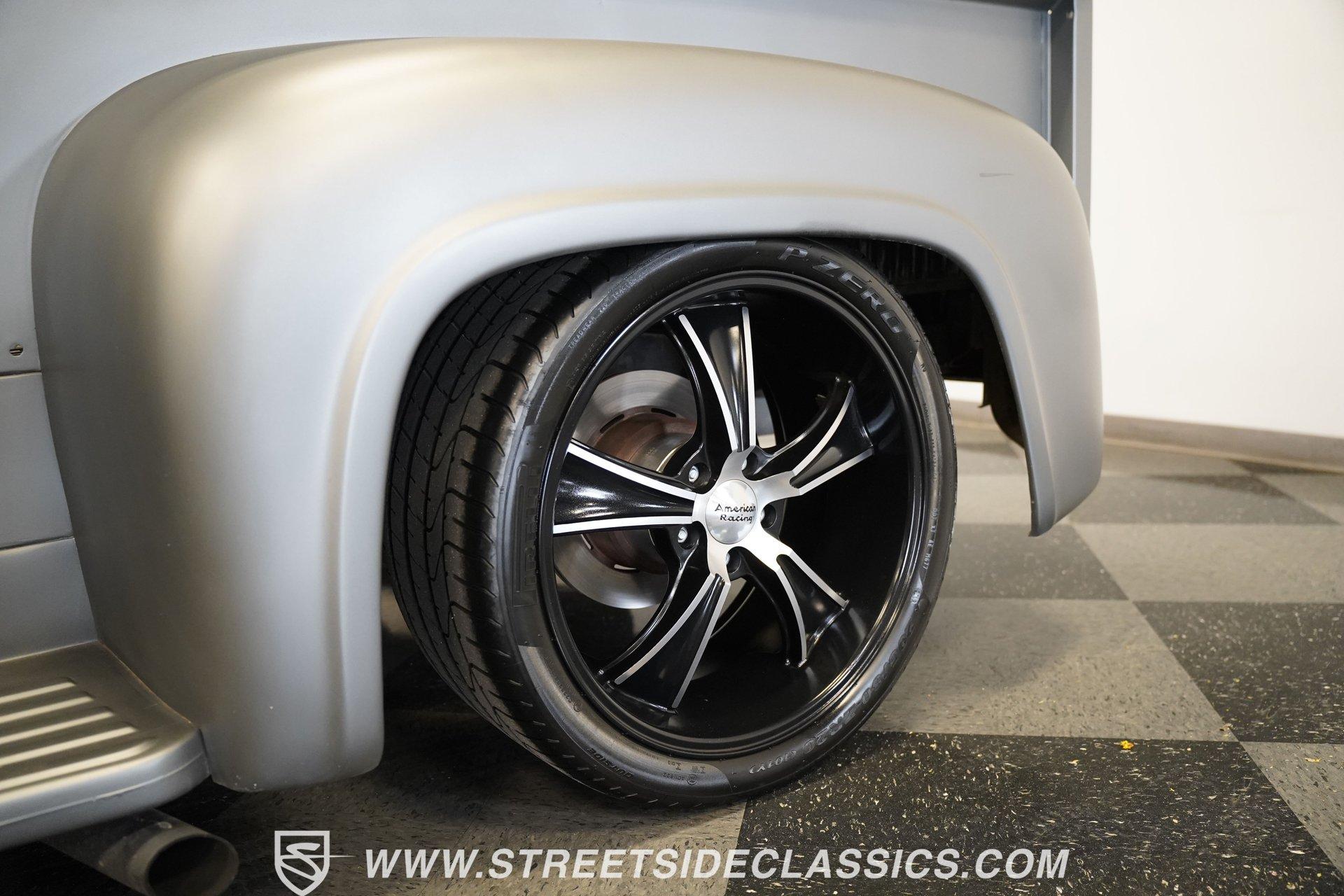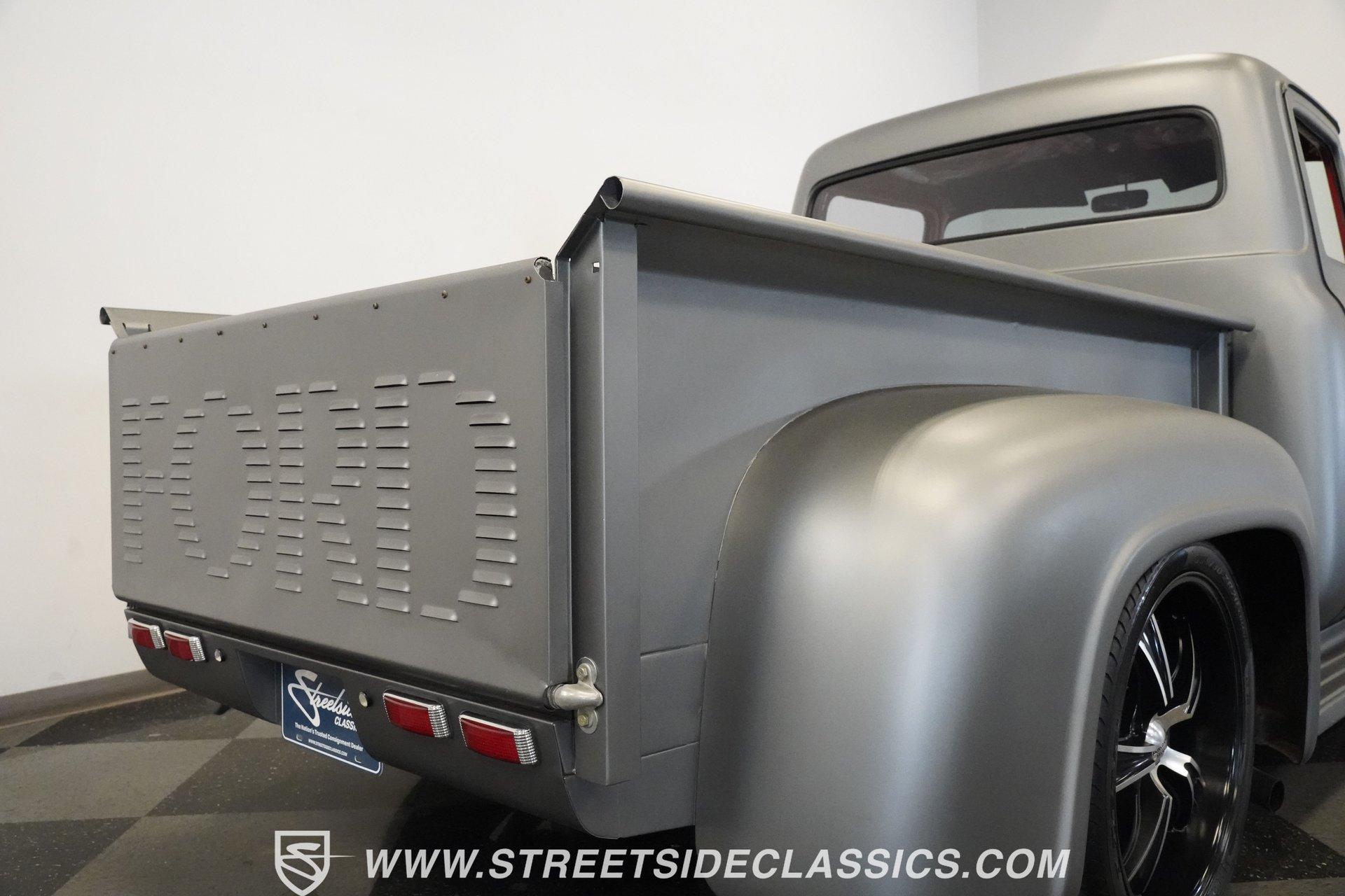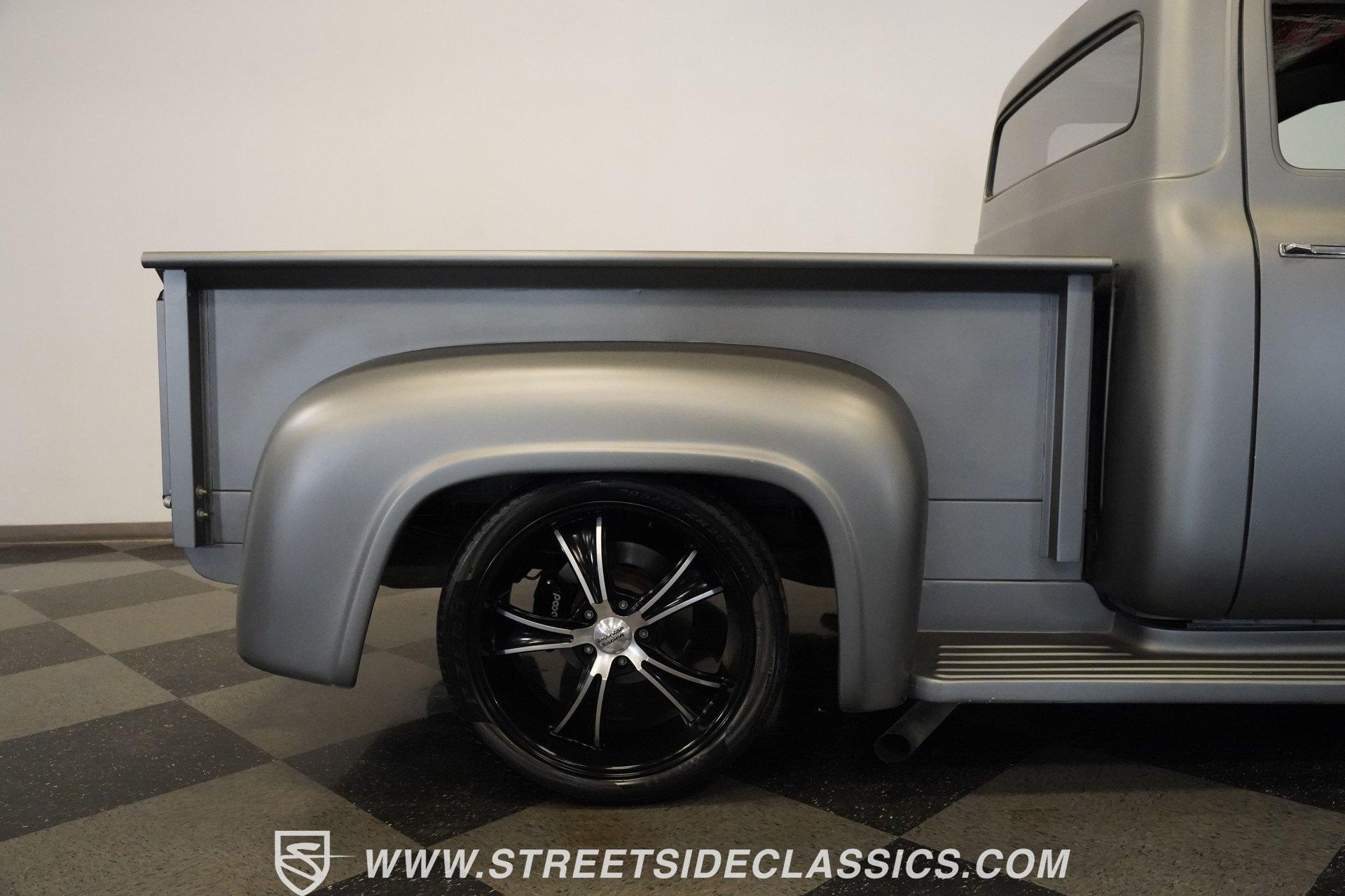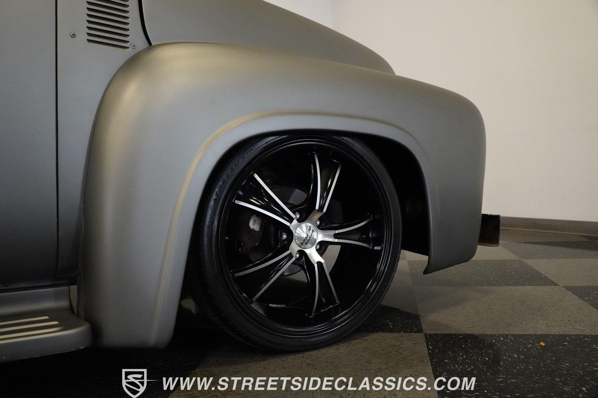 There is something about a classic truck that has been modified and selectively modernized that is just special. Whether it is goosebumps or a Joker-like smile, one look at a truck like this 1956 Ford F-100 in person is guaranteed to elicit a reaction. Fully repainted in a matte grey, this resto-modded truck features a custom one-piece tilt-forward front end, custom first-gen-inspired front grille, and upgraded windows with a vent window delete, allowing for a clean single-pane side glass look. Inside, we find a red and black interior highlighted by a set of wild-looking aftermarket steel bucket seats separated by a custom-fabricated steel center console, complete with dual cupholders. A banjo-style, power-assisted steering wheel sits just in front of a six-pod Dolphin gauge cluster, accentuated by a large 140 mph speedometer and an 8,000 rpm tachometer, each flanked by a set of auxiliary gauges on either side. A Pioneer AM/FM/CD/Aux/Bluetooth head unit offers far more soundtrack options than the original AM unit it replaces, and situated under the dash, does not upset the clean look of the dashboard. Tilt that big front end forward, and inside, we find a 350 cubic-inch V-8 engine. A single four-barrel Edelbrock carburetor sits mounted on a polished air gap-style intake manifold. An aftermarket cam operates lightweight aluminum heads, while spent gases are expelled through a set of shorty headers connected to a dual exhaust and ultimately exiting via a set of Glasspack-style mufflers. Power is routed through a column-shifted TH400 three-speed automatic transmission before being sent out to the 12-bolt rear end. *Restomod *Custom One Piece Front End *Custom Grille *Matte Grey Paint *350 CID V8 *Aluminum Heads *Air Gap Style Intake *Edelbrock Four Barrel Carb *Custom Cam *Shorty Headers *Dual Exhaust *Glasspack Style Mufflers *20 Inch American Racing Wheels *Low Profile Tires *Power Steering *Power Brakes *Four Wheel Discs *Steel Bucket Seats *Custom Center Console *Dolphin Gauges *Pioneer Head Unit *Bluetooth This 1956 Ford F-100 achieves its slammed look thanks to an independent front end suspension that appears to have been donated by a late-model GM vehicle, while its solid axle rear end maintains the old-school feel of the line. A quartet of massive 20-inch American Racing wheels are shod in a staggered set of tires, with a set of 235/55R-20 Atrezzo rubber up front, and a pair of wide 295/30R-20 Pirelli PZero tires out back. Barely hiding behind those huge wheels are a set of power disc brakes at all four corners, giving this muscle truck a well-rounded performance personality. If you are like us and can't help but react when a well-done throwback truck rumbles by, then don't wait another second. Call today!