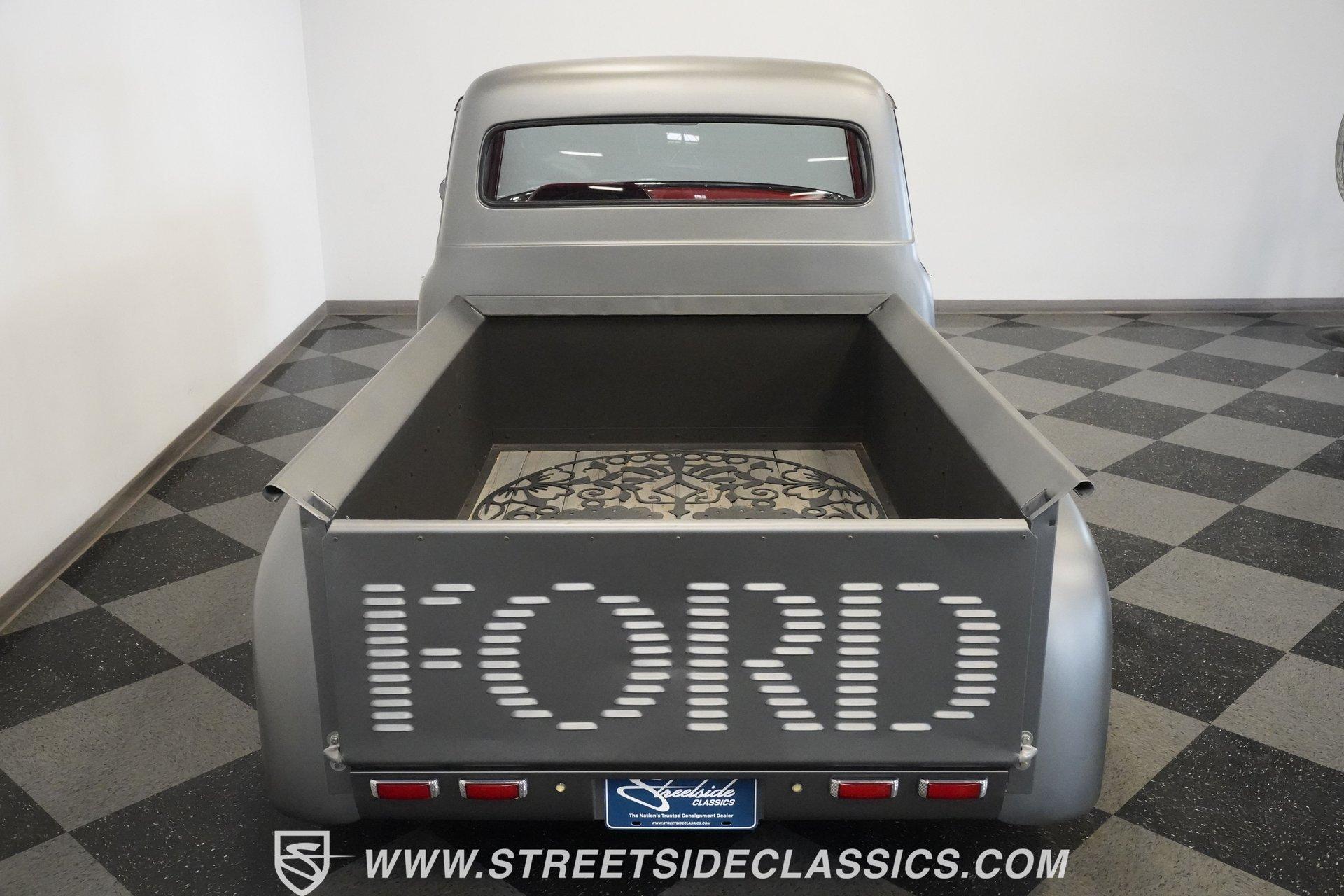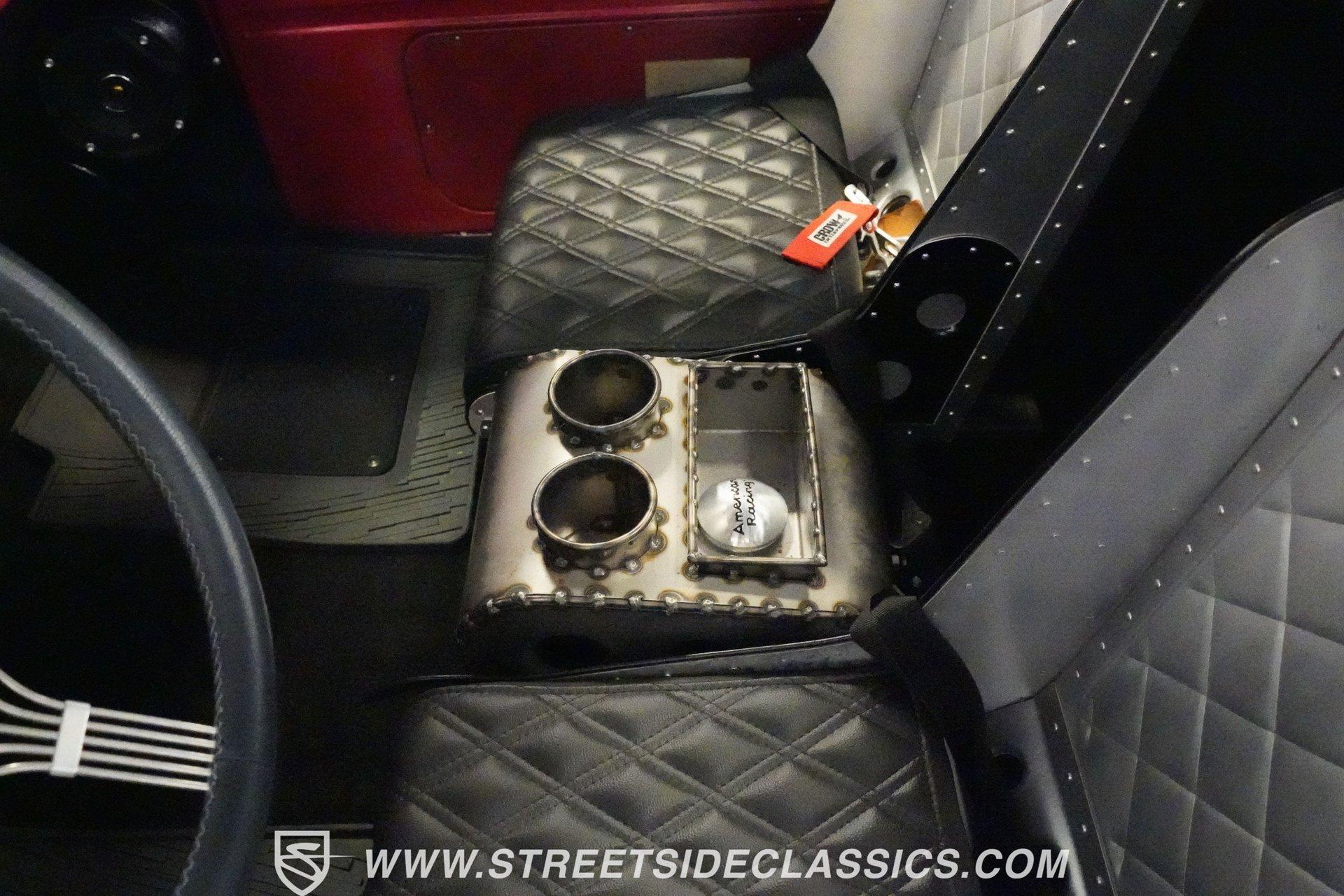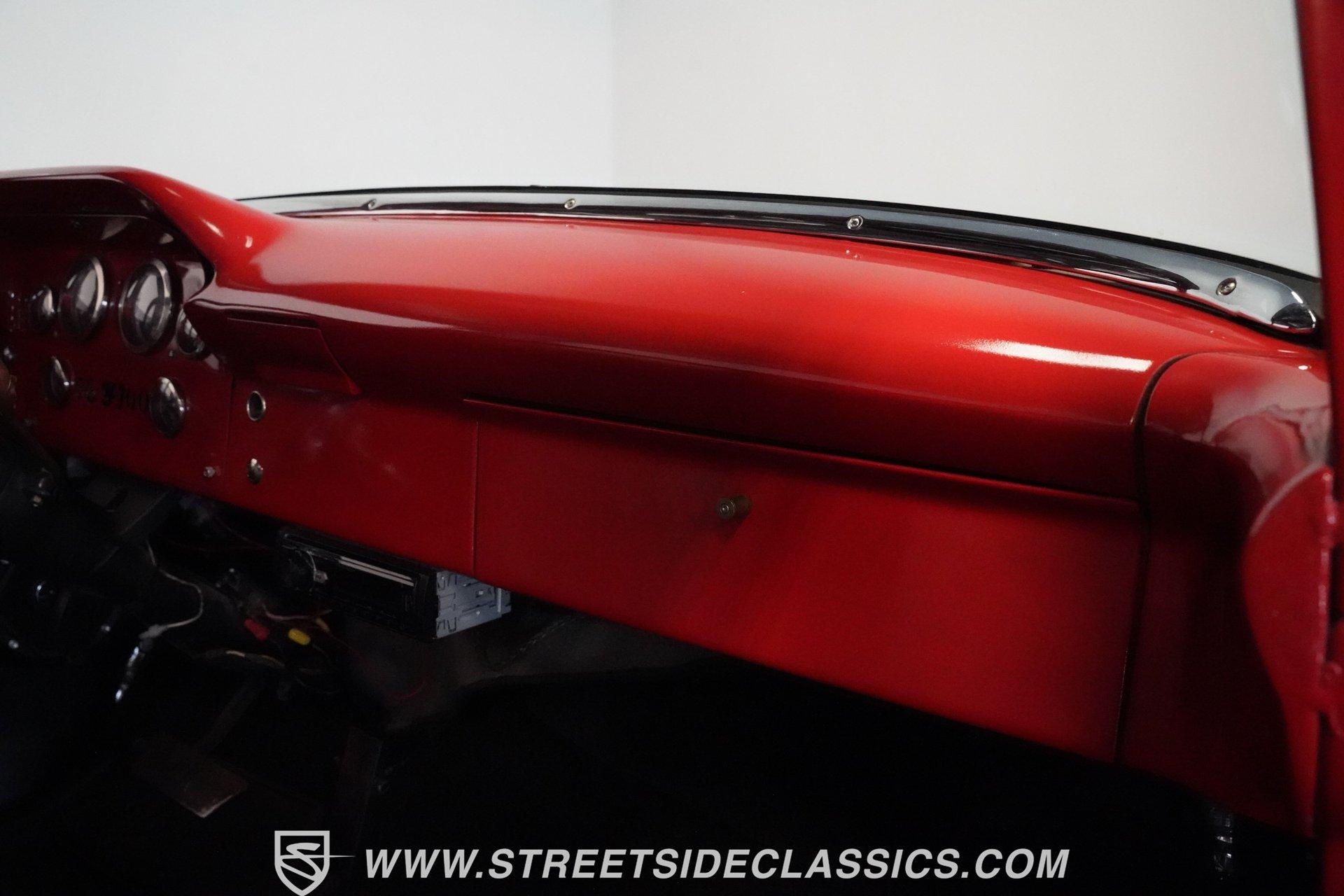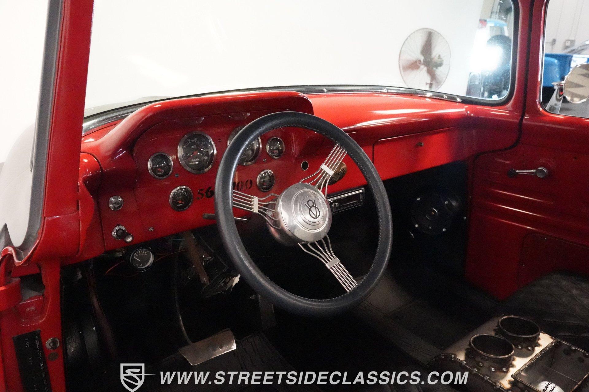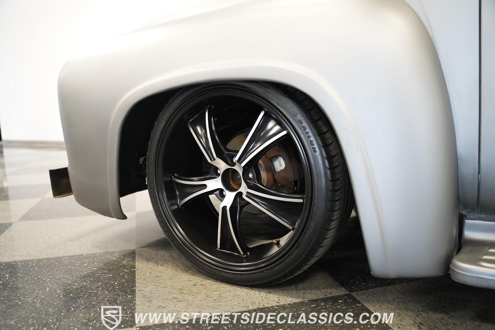 There is something about a classic truck that has been modified and selectively modernized that is just special. Whether it is goosebumps or a Joker-like smile, one look at a truck like this 1956 Ford F-100 in person is guaranteed to elicit a reaction. Fully repainted in a matte grey, this resto-modded truck features a custom one-piece tilt-forward front end, custom first-gen-inspired front grille, and upgraded windows with a vent window delete, allowing for a clean single-pane side glass look. Inside, we find a red and black interior highlighted by a set of wild-looking aftermarket steel bucket seats separated by a custom-fabricated steel center console, complete with dual cupholders. A banjo-style, power-assisted steering wheel sits just in front of a six-pod Dolphin gauge cluster, accentuated by a large 140 mph speedometer and an 8,000 rpm tachometer, each flanked by a set of auxiliary gauges on either side. A Pioneer AM/FM/CD/Aux/Bluetooth head unit offers far more soundtrack options than the original AM unit it replaces, and situated under the dash, does not upset the clean look of the dashboard. Tilt that big front end forward, and inside, we find a 350 cubic-inch V-8 engine. A single four-barrel Edelbrock carburetor sits mounted on a polished air gap-style intake manifold. An aftermarket cam operates lightweight aluminum heads, while spent gases are expelled through a set of shorty headers connected to a dual exhaust and ultimately exiting via a set of Glasspack-style mufflers. Power is routed through a column-shifted TH400 three-speed automatic transmission before being sent out to the 12-bolt rear end. *Restomod *Custom One Piece Front End *Custom Grille *Matte Grey Paint *350 CID V8 *Aluminum Heads *Air Gap Style Intake *Edelbrock Four Barrel Carb *Custom Cam *Shorty Headers *Dual Exhaust *Glasspack Style Mufflers *20 Inch American Racing Wheels *Low Profile Tires *Power Steering *Power Brakes *Four Wheel Discs *Steel Bucket Seats *Custom Center Console *Dolphin Gauges *Pioneer Head Unit *Bluetooth This 1956 Ford F-100 achieves its slammed look thanks to an independent front end suspension that appears to have been donated by a late-model GM vehicle, while its solid axle rear end maintains the old-school feel of the line. A quartet of massive 20-inch American Racing wheels are shod in a staggered set of tires, with a set of 235/55R-20 Atrezzo rubber up front, and a pair of wide 295/30R-20 Pirelli PZero tires out back. Barely hiding behind those huge wheels are a set of power disc brakes at all four corners, giving this muscle truck a well-rounded performance personality. If you are like us and can't help but react when a well-done throwback truck rumbles by, then don't wait another second. Call today!