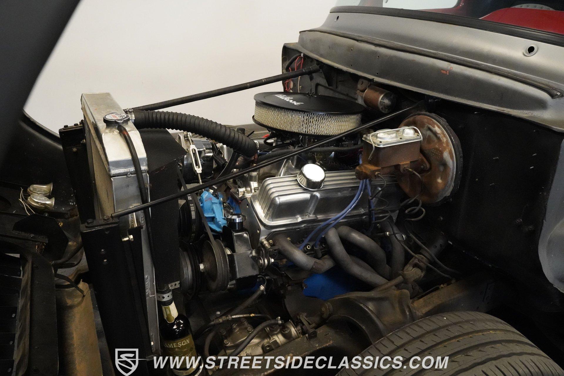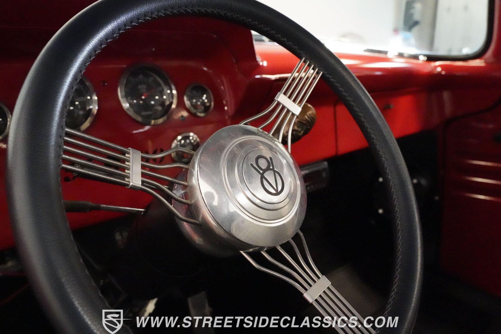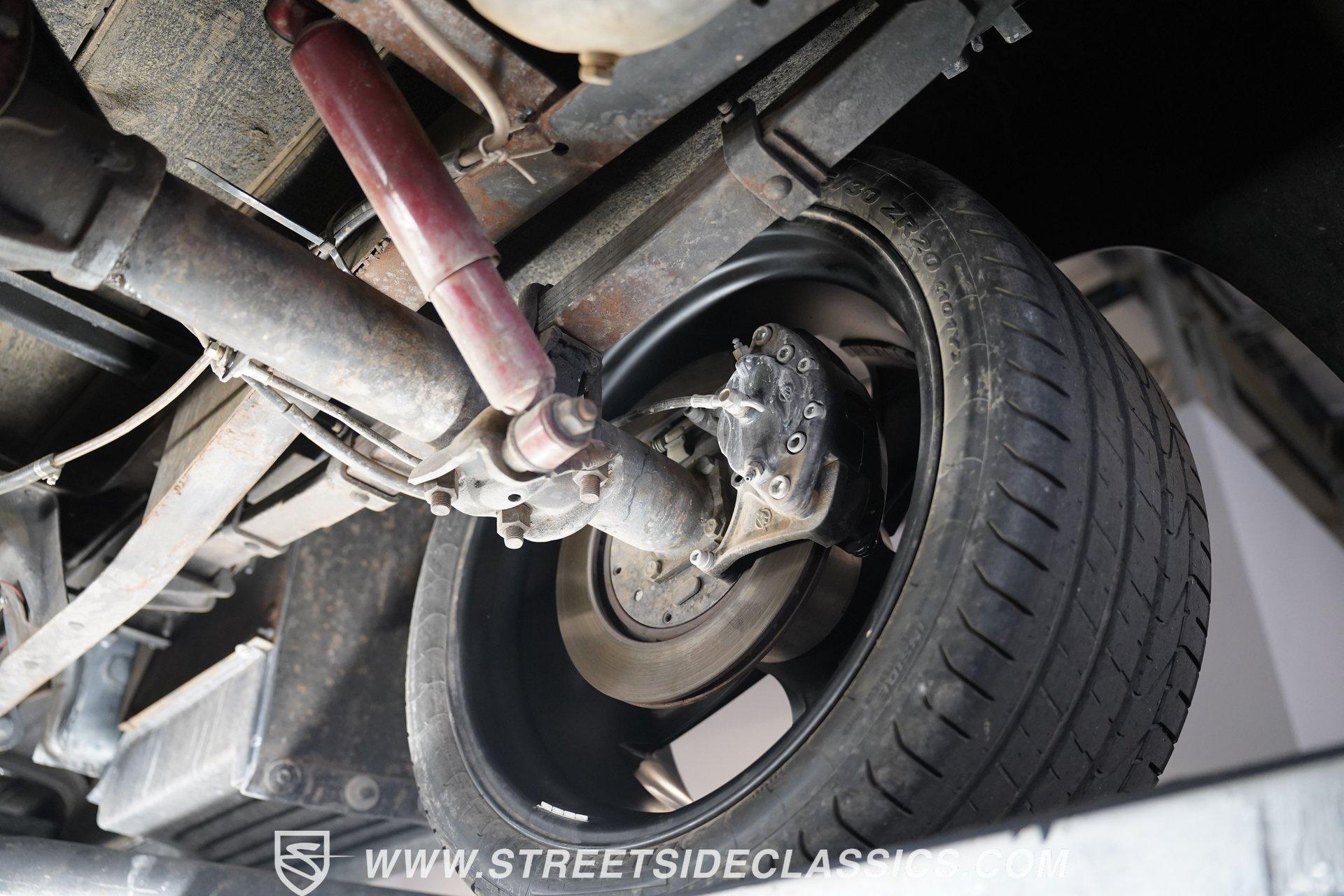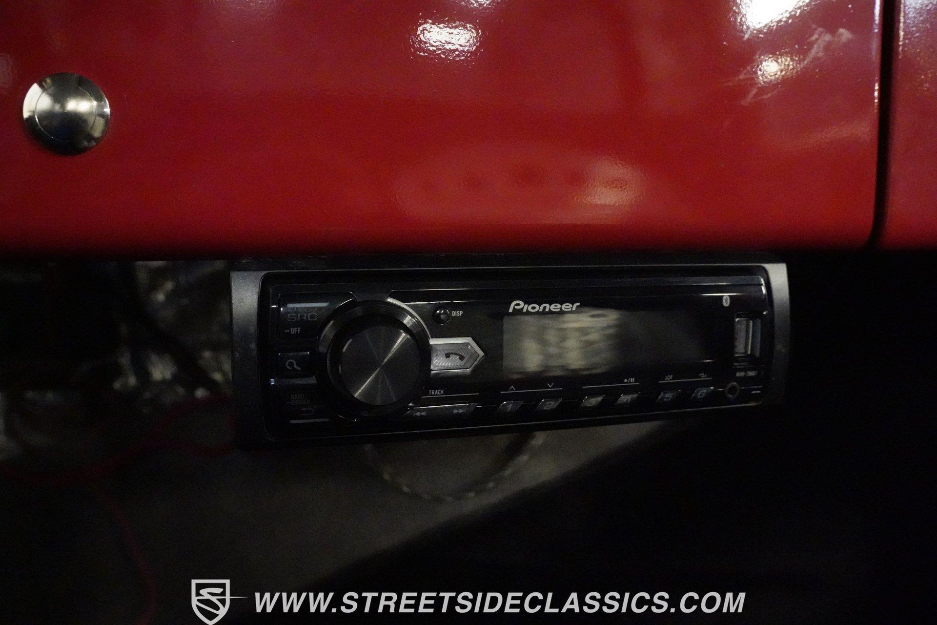 There is something about a classic truck that has been modified and selectively modernized that is just special. Whether it is goosebumps or a Joker-like smile, one look at a truck like this 1956 Ford F-100 in person is guaranteed to elicit a reaction. Fully repainted in a matte grey, this resto-modded truck features a custom one-piece tilt-forward front end, custom first-gen-inspired front grille, and upgraded windows with a vent window delete, allowing for a clean single-pane side glass look. Inside, we find a red and black interior highlighted by a set of wild-looking aftermarket steel bucket seats separated by a custom-fabricated steel center console, complete with dual cupholders. A banjo-style, power-assisted steering wheel sits just in front of a six-pod Dolphin gauge cluster, accentuated by a large 140 mph speedometer and an 8,000 rpm tachometer, each flanked by a set of auxiliary gauges on either side. A Pioneer AM/FM/CD/Aux/Bluetooth head unit offers far more soundtrack options than the original AM unit it replaces, and situated under the dash, does not upset the clean look of the dashboard. Tilt that big front end forward, and inside, we find a 350 cubic-inch V-8 engine. A single four-barrel Edelbrock carburetor sits mounted on a polished air gap-style intake manifold. An aftermarket cam operates lightweight aluminum heads, while spent gases are expelled through a set of shorty headers connected to a dual exhaust and ultimately exiting via a set of Glasspack-style mufflers. Power is routed through a column-shifted TH400 three-speed automatic transmission before being sent out to the 12-bolt rear end. *Restomod *Custom One Piece Front End *Custom Grille *Matte Grey Paint *350 CID V8 *Aluminum Heads *Air Gap Style Intake *Edelbrock Four Barrel Carb *Custom Cam *Shorty Headers *Dual Exhaust *Glasspack Style Mufflers *20 Inch American Racing Wheels *Low Profile Tires *Power Steering *Power Brakes *Four Wheel Discs *Steel Bucket Seats *Custom Center Console *Dolphin Gauges *Pioneer Head Unit *Bluetooth This 1956 Ford F-100 achieves its slammed look thanks to an independent front end suspension that appears to have been donated by a late-model GM vehicle, while its solid axle rear end maintains the old-school feel of the line. A quartet of massive 20-inch American Racing wheels are shod in a staggered set of tires, with a set of 235/55R-20 Atrezzo rubber up front, and a pair of wide 295/30R-20 Pirelli PZero tires out back. Barely hiding behind those huge wheels are a set of power disc brakes at all four corners, giving this muscle truck a well-rounded performance personality. If you are like us and can't help but react when a well-done throwback truck rumbles by, then don't wait another second. Call today!