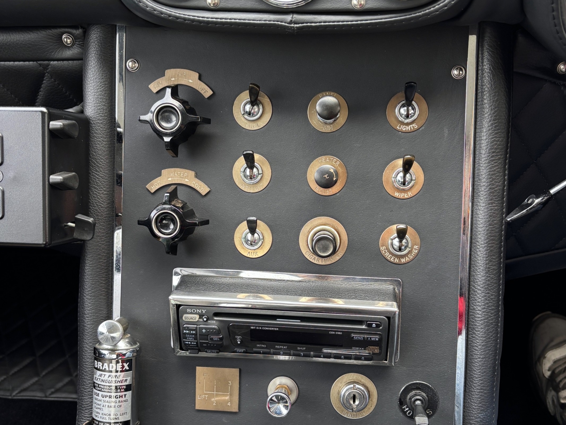The interior of a Gordon Keeble is stunning in any case. It features all the beautiful details that belong in a classic GT, such as the diamond pattern finish. The dashboard is lavishly equipped with beautiful gauges and toggle switches, and everything exudes handmade quality. During the restoration, everything was renewed with respect for the originality. The interior is therefore in top condition. The seats have been reupholstered and covered with new black leather in the correct pattern. The dashboard is beautiful and without any damage. The new wooden steering wheel and large aluminium gear knob fit perfectly into such a classic interior. A Rally Twin Master and a Bradex high-pressure fire extinguisher have also been installed.