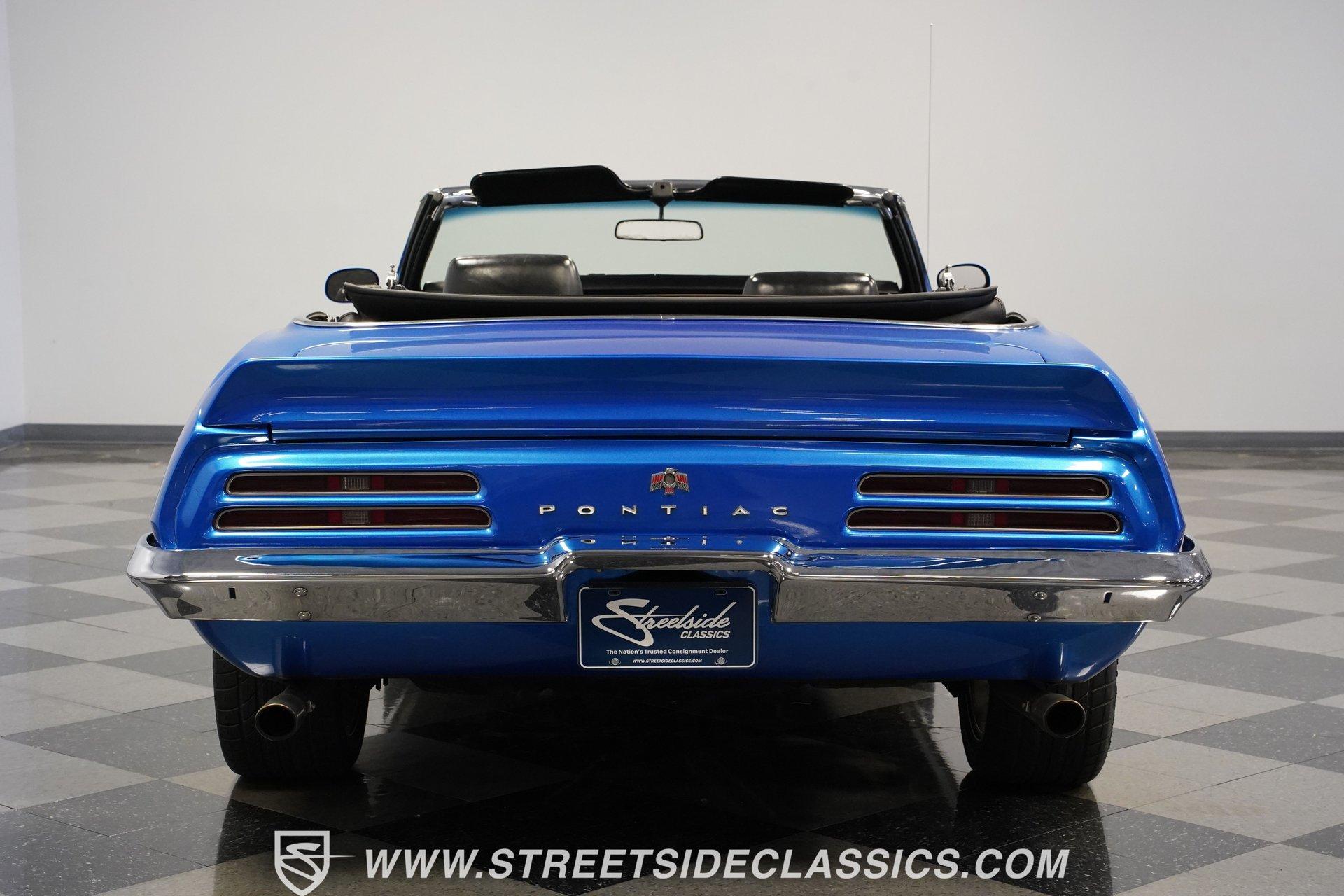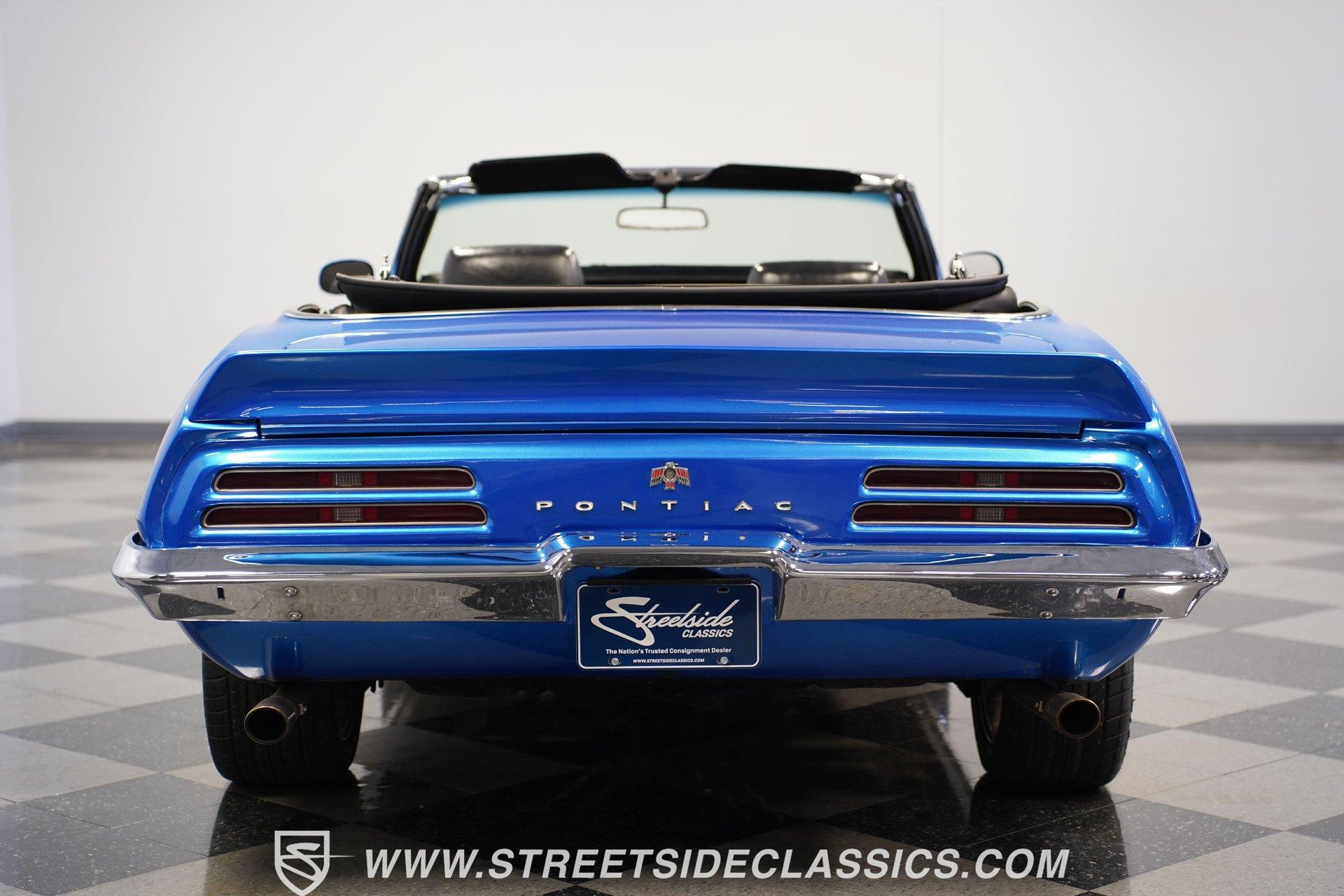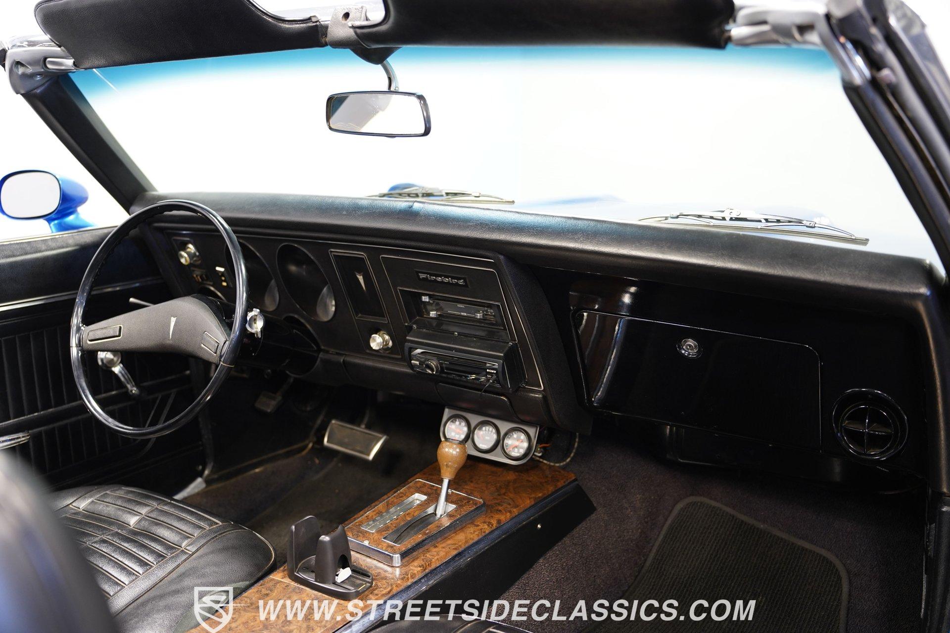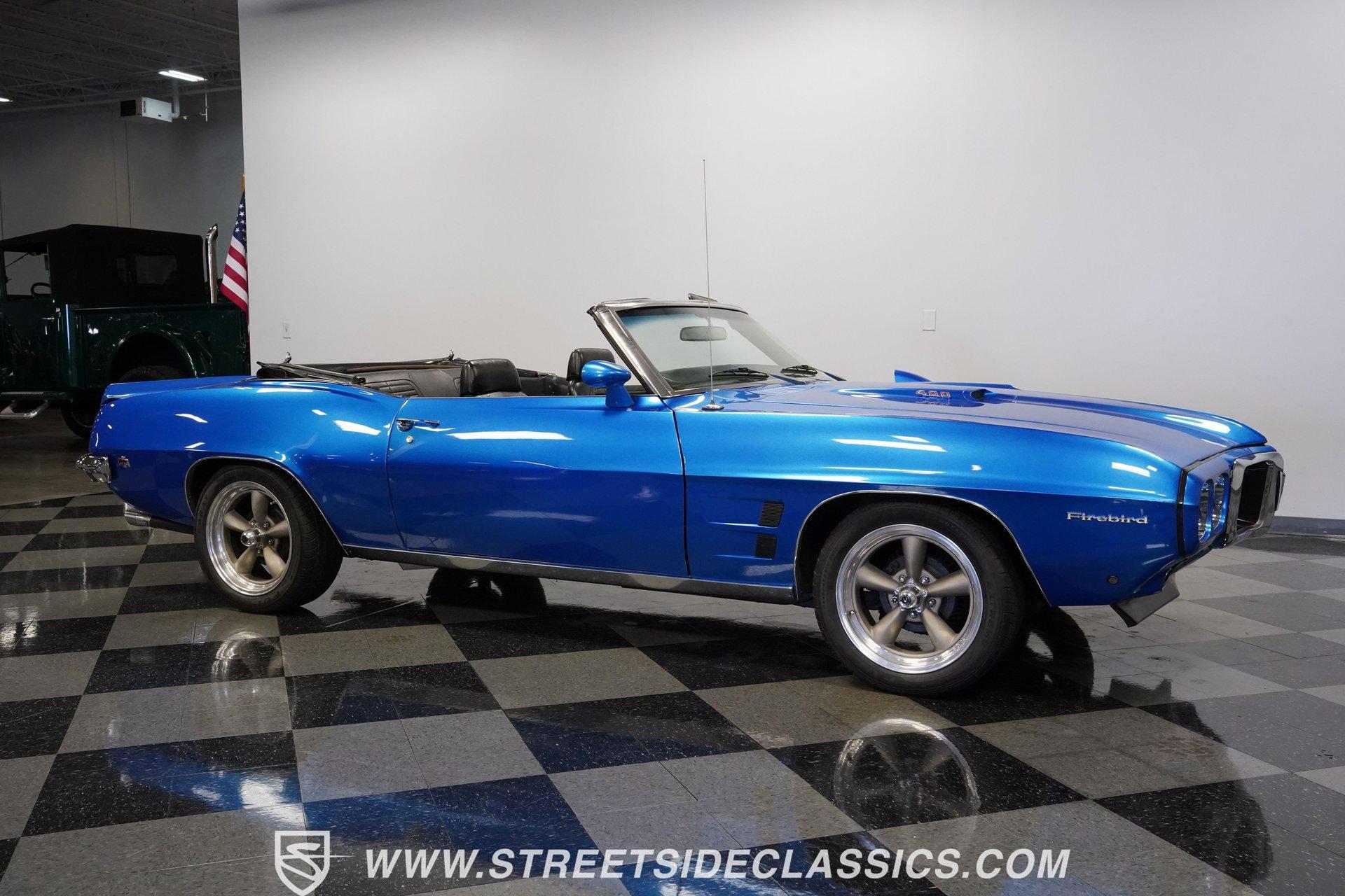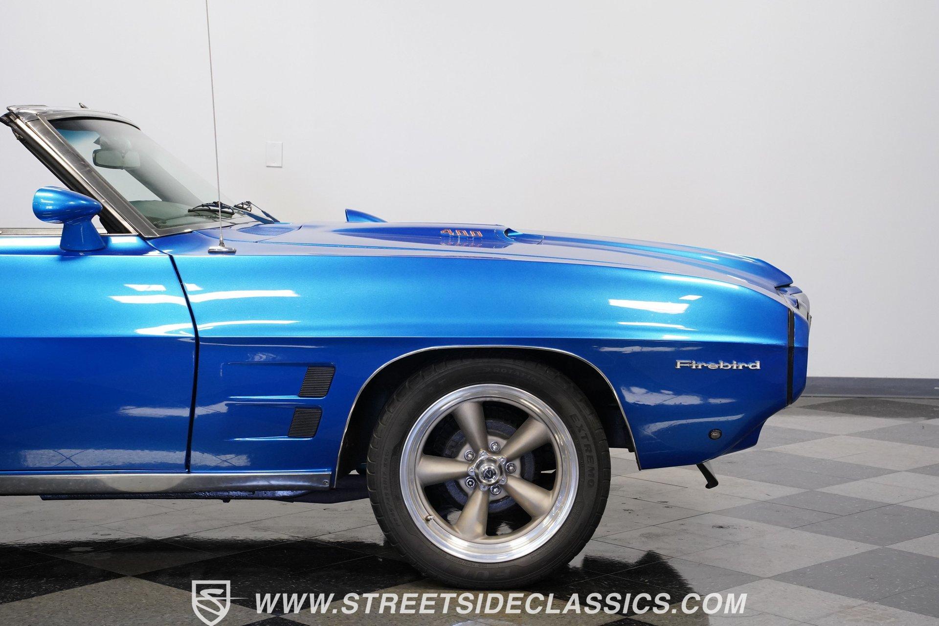 There's no denying the timeless curb appeal of a sharp-looking classic muscle car, especially when it's wearing a great color and is mechanically well-appointed. That's definitely an apt description for this 1969 Pontiac Firebird 400 Convertible. Dressed in a very eye-catching shade of metallic blue, this open-air ride would make an outstanding weekend cruiser and, with just a little work, could even be transformed into a contender on the local car show scene. That appealing paint is paired with brightwork that's in consistently good shape, and this Pontiac's collection of proper 400 badging is securely in place. Featuring consistent body lines, its doors close solidly and, if you look a little closer, you'll see that both its window glass and weatherstripping are in good shape. As a big added plus, that hood-mounted tach you see, which is so often in non-operable shape on classics, is in strong working order. Inside, you'll find a factory-style interior that may show signs of wear but remains perfectly usable in its current state and could easily be brought up to speed without much trouble. The front bucket seats are structurally sound and still properly aligned, and they straddle the signature wood-accented center console that upper-tier Firebirds were known for. The gauges in the instrument cluster appear to be surprisingly clear, especially given that this is a convertible, and are joined by a trio of aftermarket gauges that sit at the bottom of the dash area, just below a Sony AM/FM stereo with an auxiliary port to add more audio options. While power convertible works as it should. Propelled by a factory-correct drivetrain that's anchored by a 400 cubic-inch V8, this Pontiac has very solid driving manners. The smooth-running engine appears nice and clean and is dressed up with some sharp chrome accessories. Fed by a Quadrajet 4-barrel carburetor perched on an Edelbrock aluminum intake manifold, it's paired with a 3-speed automatic TH350 that shifts without issue. This Pontiac's power steering shows none of the excessive play you might expect, and its power brakes offer confidence-inspiring stops. Yes, this is a really nice, driving classic, to be sure. HIGHLIGHTS PERIOD-CORRECT 400 CUBIC-INCH V8 ENGINE 4-BARREL CARBURETOR 3-SPEED AUTOMATIC TH350 TRANSMISSION LONG TUBE HEADERS DUAL EXHAUST, WITH GLASSPACK-STYLE MUFFLERS FACTORY SUSPENSION POWER BRAKES 17" VINTAGE WHEEL WORKS WHEELS ULTRA-SHARP METALLIC BLUE PAINT BLACK VINYL UPHOLSTERY BUCKET SEATS CENTER CONSOLE POWER STEERING SONY AM/FM STEREO WITH AN AUXILIARY PORT Prowling the asphalt on a set of 17" Vintage Wheel Works wheels that are the perfect complement to its timeless good looks, this 1969 Pontiac Firebird 400 Convertible is a great representative of its manufacturer as the '60s were drawing to a close and will be a fun-filled open-air cruiser for its next lucky owner. Call today!