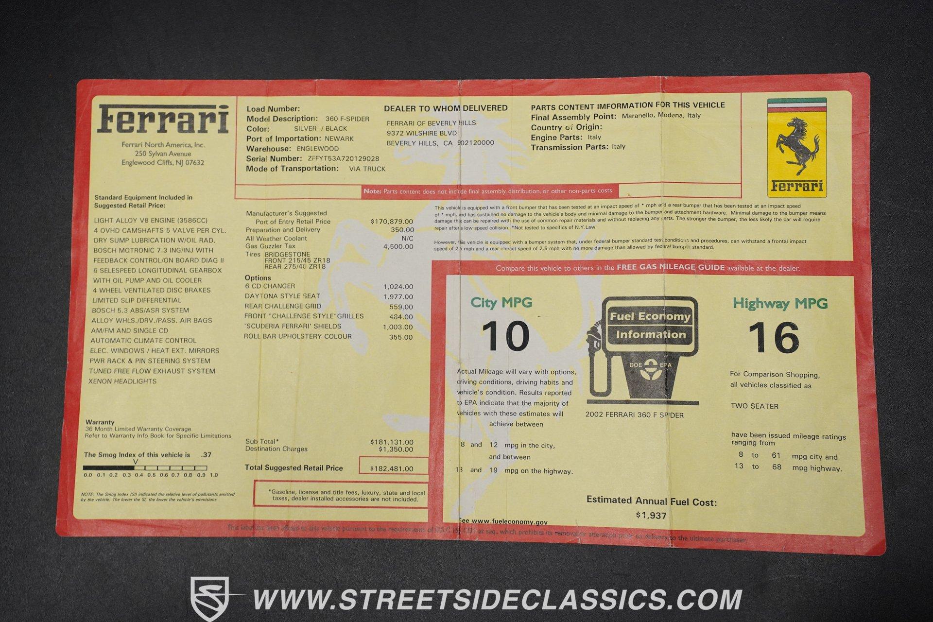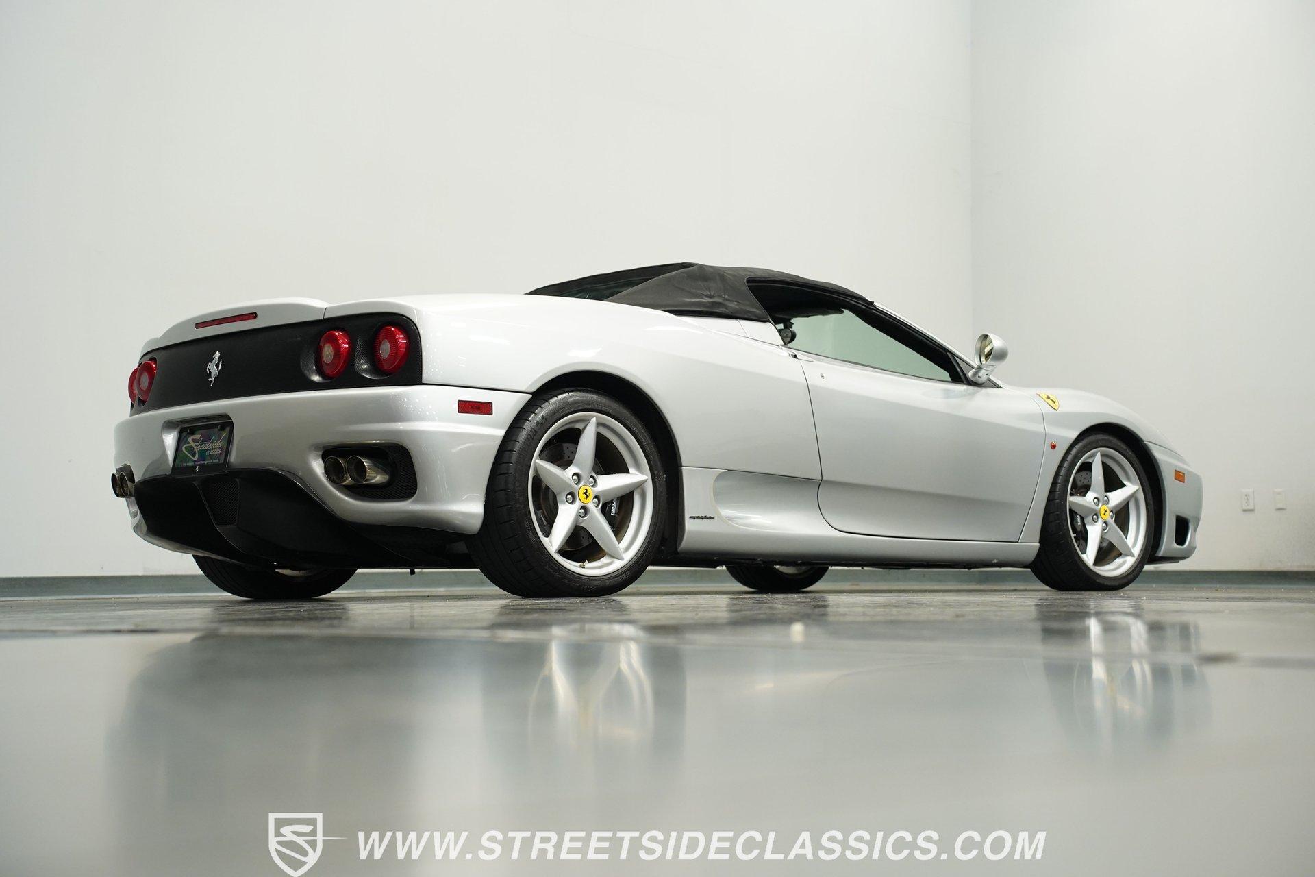 Owning a Ferrari is more than just having a car; it's embracing a lifestyle of passion and precision. The 2002 Ferrari 360 Spider is a symbol of automotive artistry, blending Italian craftsmanship with exhilarating performance. This convertible embodies the spirit of open-air driving and the thrill of a roaring V8 engine, ready to create unforgettable memories on every journey. Whether you're cruising coastal roads or showing off at car meets, this Ferrari promises to turn heads and ignite excitement. Experience the allure of a meticulously restored classic that feels just as vibrant today as it did when it first hit the streets. Step inside the 360 Spider and discover an interior that balances sporty elegance with modern convenience. Featuring two Ferrari sport bucket seats, the cabin offers both comfort and support for spirited drives. The upgraded AM/FM Bluetooth head unit ensures your favorite tunes accompany you on the road, while power windows, power locks, and a tilt steering wheel add to the ease of driving. The leather upholstery and well-maintained surfaces highlight the care and attention dedicated to preserving this car's refined ambiance. Under the rear boot lies a quick 3.6L DOHC V8 engine, delivering impressive power and responsiveness. Paired with a six-speed automatic transmission featuring paddle shifters, the Ferrari "F1" automated manual setup offers smooth, engaging gear changes. This Spider rides on factory-style suspension with power steering and four-wheel power disc brakes complete with ABS, ensuring confident handling and stopping power. The car's mechanical integrity is complemented by original components and slight use, making it a thrilling yet reliable ride for enthusiasts. Highlights: 2002 Ferrari 360 Spider Actual Mileage 37,910 3.6L DOHC V8 Engine Six-Speed Automatic Transmission Paddle Shift "F1" Automated Manual Four-Wheel Power Disc Brakes Power Steering with ABS Factory Style Suspension Power Convertible Top Leather Sport Bucket Seats Upgraded Bluetooth AM/FM Head Unit Original Paint and Body Panels Power Windows and Locks Tilt Steering Wheel Financing Available Vehicle Protection Plans Available Worldwide Shipping This 2002 Ferrari 360 Spider stands out as a superbly maintained and lightly used sports car that offers both style and performance. Its combination of classic Ferrari engineering and thoughtful upgrades makes it a compelling choice for collectors and drivers alike. Don't miss the chance to own a piece of automotive excellence. Call, email, or come visit our showroom today!