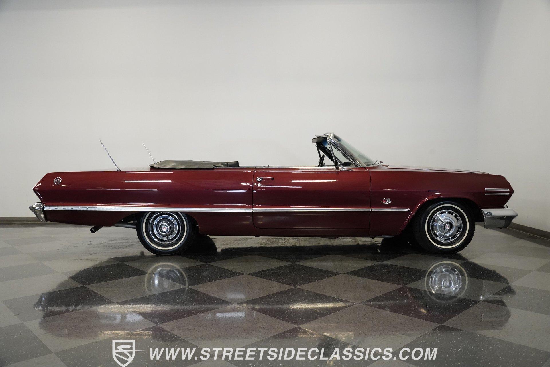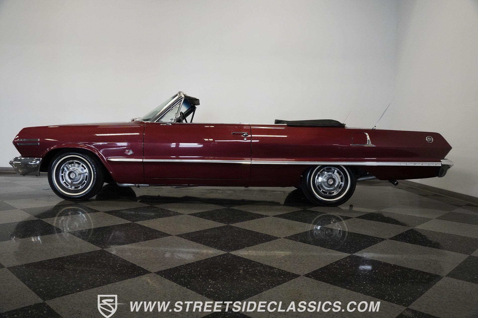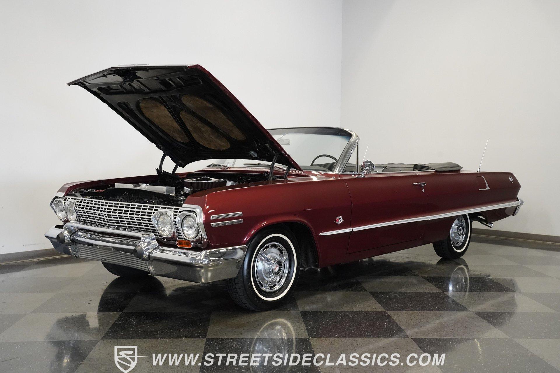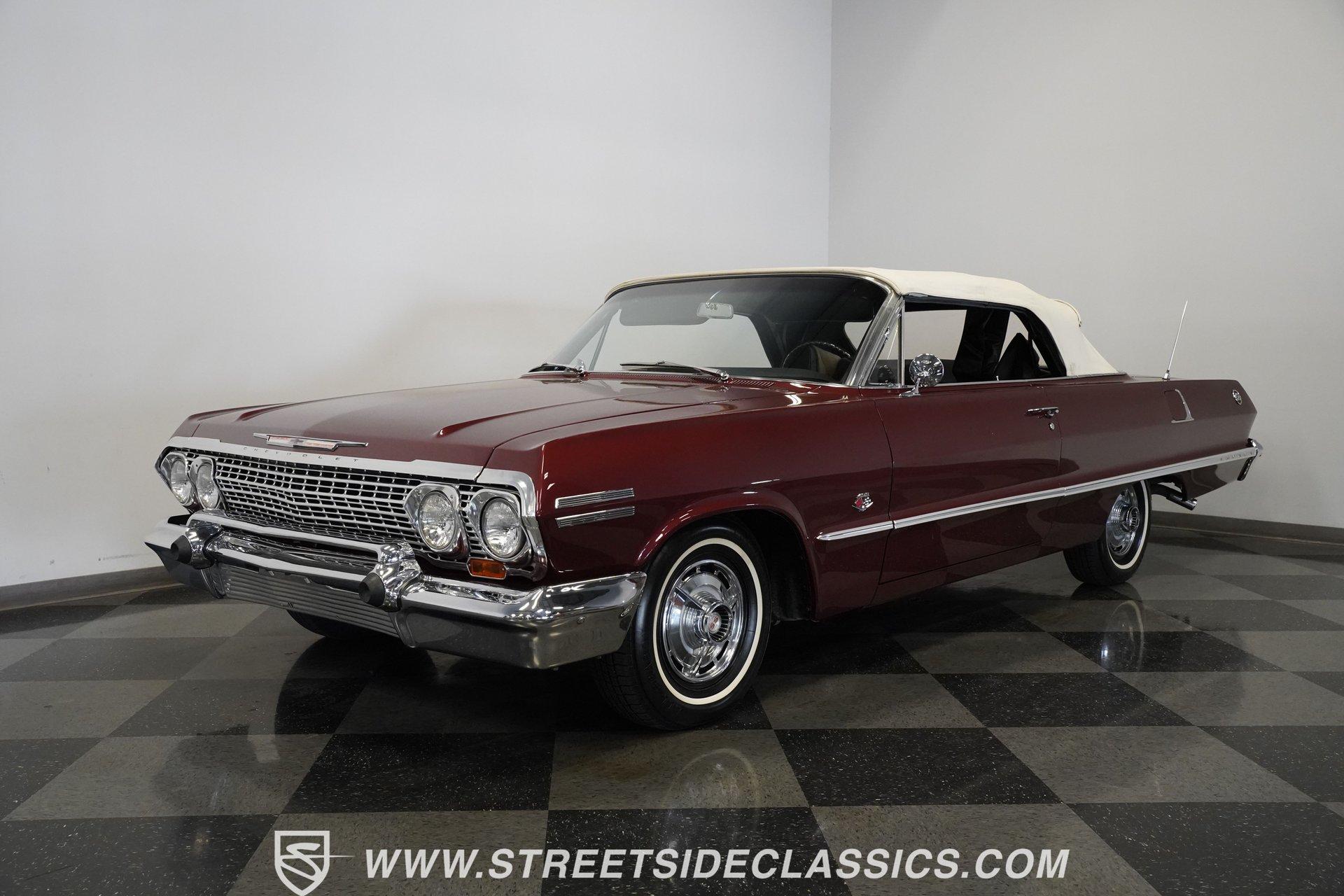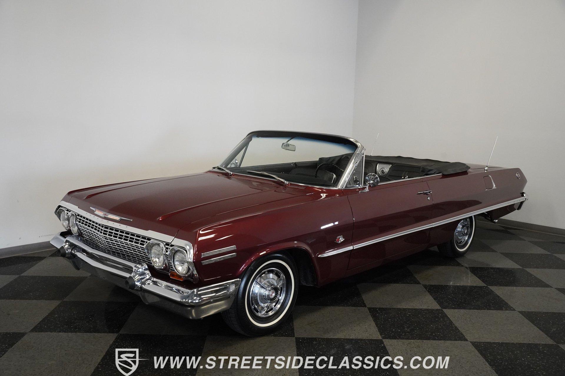 There is something about slipping behind the wheel of a classic convertible that turns an ordinary drive into a lasting memory. This 1963 Chevrolet Impala convertible wears its era with pride, blending boulevard presence and muscle car attitude in equal measure. Finished in Palomar Maroon with a white convertible soft top, SS trim, and 409 badging, it makes a strong case for weekend cruises, parades, or simply enjoying the satisfaction of rolling up in a car that commands attention. Inside, the cabin presents with authentic Super Sport style. Low-back bucket seats, a stainless-trimmed full console, and an SS steering wheel create the period look, while a column-mounted tach and floor shifter add a driver-focused feel. The interior shows clean presentation throughout and pairs well with the convertible top for comfortable open-air motoring. Under the hood sits a 409 big-block V8 paired with a TH400 three-speed automatic transmission. Fuel delivery has been modernized with a Holley Sniper EFI system on the stock intake, while cooling is upgraded with a Champion aluminum radiator, dual electric fans, and an aluminum overflow tank. Power steering and Wilwood power brakes give the Impala confident road manners, making it far more enjoyable in modern traffic than its factory-original counterparts. Restored in its correct Palomar Maroon, this Impala carries SS badging, silverleaf rear trim, and sits on classic 14-inch steel wheels with SS hubcaps. The stance, chrome, and brightwork give it timeless appeal while mechanical updates ensure a more reliable ownership experience. This Impala represents the best of both worlds - a driver-quality classic convertible with authentic looks, modernized fuel delivery, and tasteful upgrades to keep it enjoyable. For enthusiasts who appreciate vintage presence with dependable performance, this 1963 Chevrolet Impala convertible is ready for its next chapter. Call today to arrange a closer look and test drive.