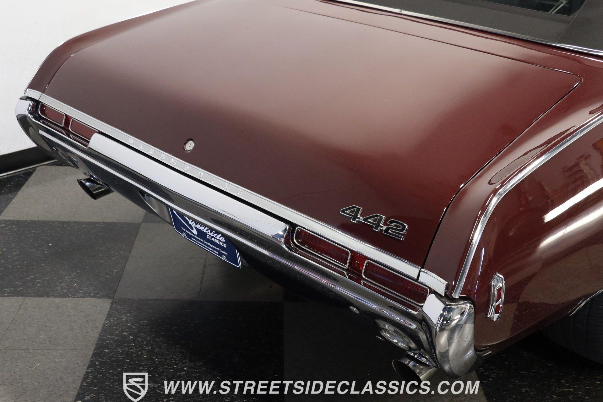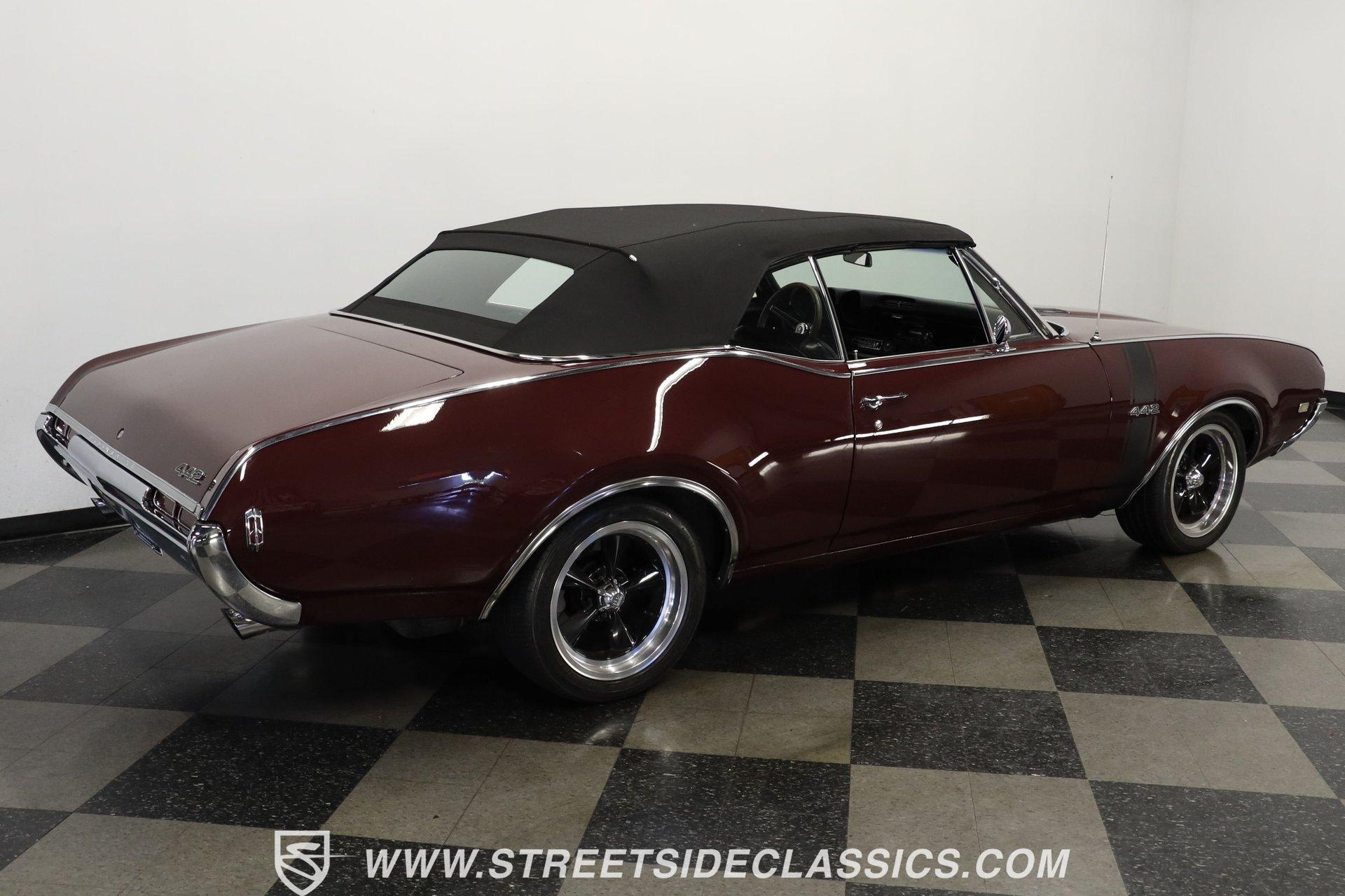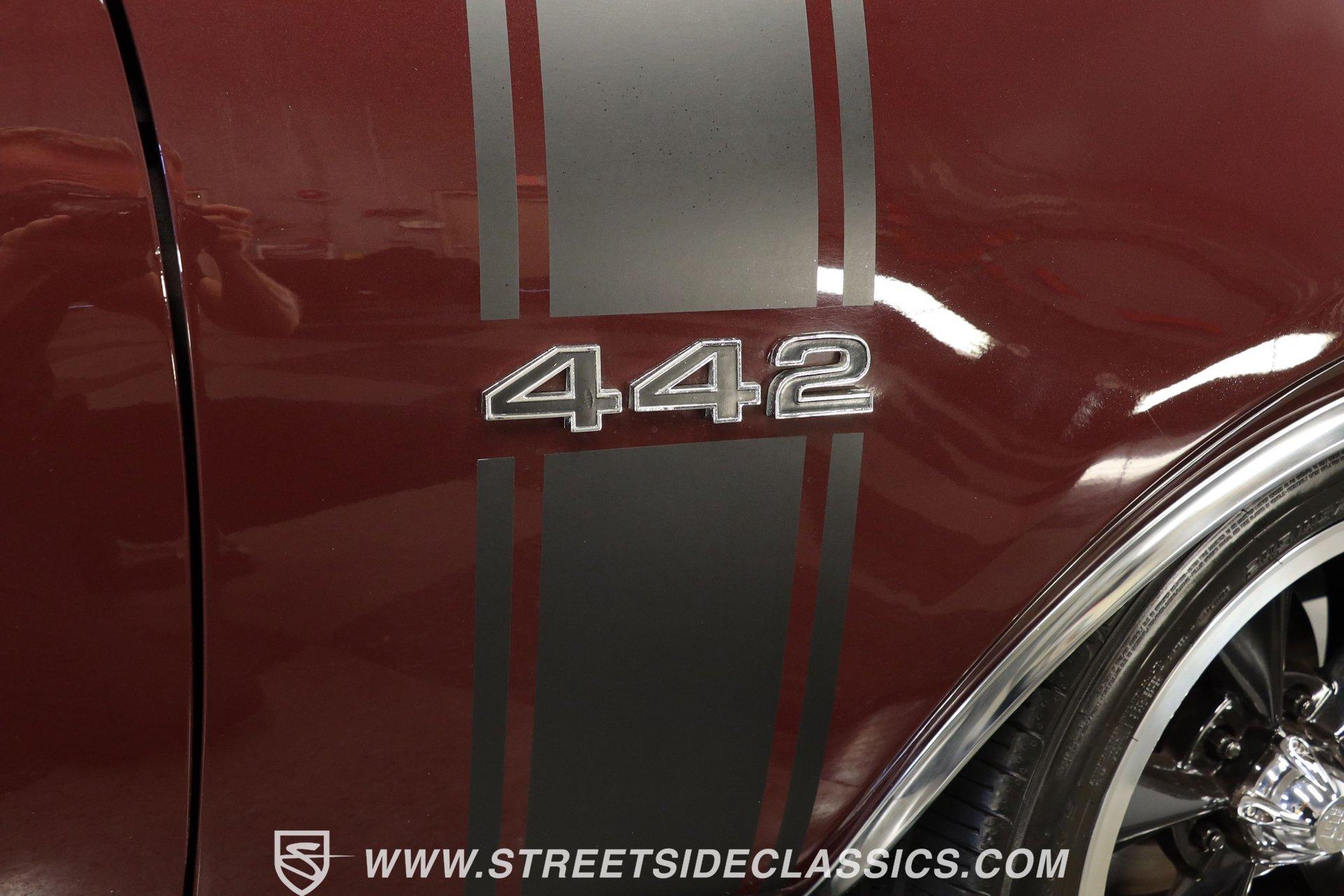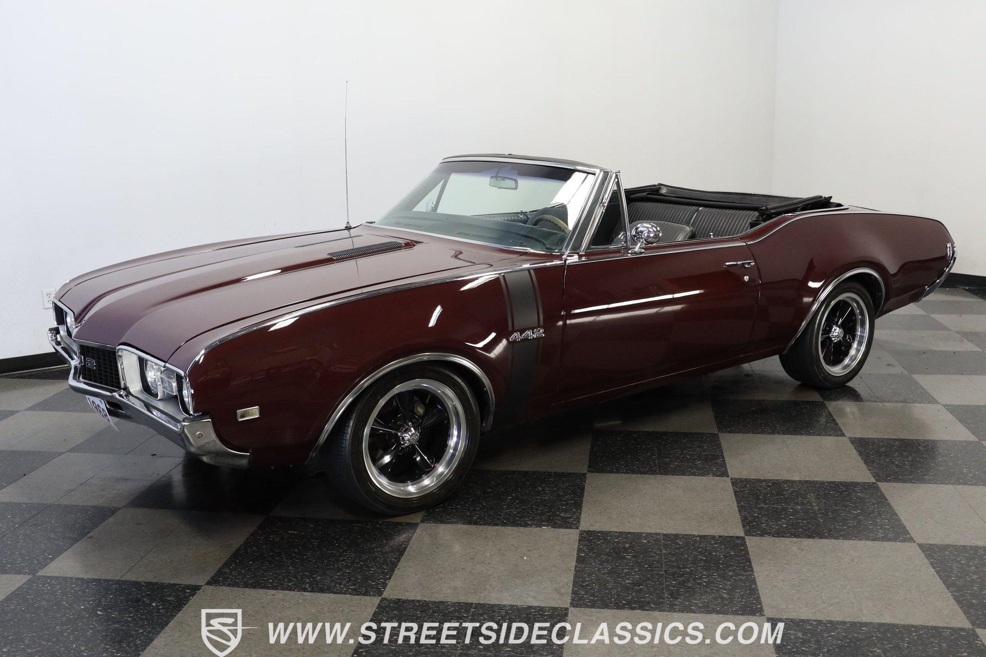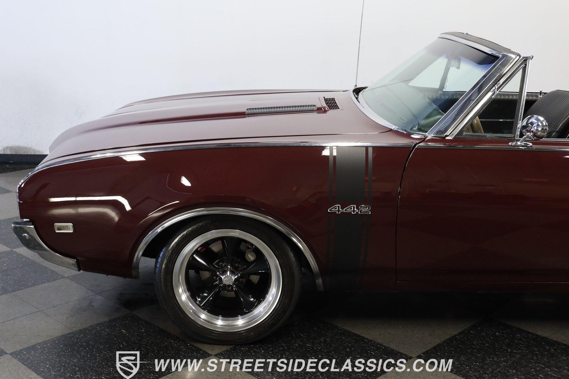 Experience the thrill and timeless appeal of American muscle with this stunning 1968 Oldsmobile 442 convertible, a true restomod masterpiece that blends classic style with modern performance. Imagine cruising with the top down, turning heads with a sharp black cherry paint complemented by subtle matte black stripes, embodying both elegance and attitude. This car is more than just a vehicle; it's a statement of passion and craftsmanship, reflecting three years of meticulous restoration and thoughtful upgrades. If you're ready to own a car that offers iconic design and contemporary drivability, this 1968 Oldsmobile 442 is calling your name. Step inside to find an interior that balances period-correct aesthetics with practical enhancements. The cabin features black vinyl bucket seats with a center console, all in great shape, alongside a wood steering wheel and upgraded Dakota Digital VHX series gauges that add a modern touch while maintaining classic charm. Chrome accents gleam throughout, and the AM/FM radio provides classic tunes as you enjoy the ride. The interior's thoughtful design ensures comfort and style, making every drive a memorable experience. Under the hood, this restomod packs a powerful 5.3L LM7 V8 engine paired with a 4-speed automatic 4L60e transmission, delivering smooth and responsive performance. The upgraded drivetrain features fuel injection, a serpentine belt setup with upgraded pulleys, and a robust aluminum radiator with dual electric fans to keep things cool. Power steering and hydro-boost power brakes with Wilwood master cylinder ensure confident handling and stopping power. The suspension is enhanced with UMI Performance coil-overs and Viking adjustable shocks, while a 9-inch Ford rear end and Hooker headers feeding dual exhaust complete the performance package for an exhilarating drive. Highlights 1968 Oldsmobile 442 Convertible 5.3L LM7 V8 Engine 4-Speed Automatic Transmission Fuel Injection System Power Steering & Hydro-Boost Power Brakes Wilwood Master Cylinder & Brakes Aluminum Radiator with Dual Electric Fans R134a Air Conditioning 4-Wheel Disc Brakes 9-Inch Ford Rear End with 3.70 Gears UMI Performance Suspension Components 17" U.S. Mags Wheels with 2022 ZR-Rated Tires Dakota Digital VHX Series Gauges Black Cherry Paint with Matte Black Stripes Power Convertible Top Financing Available Vehicle Protection Plans Available Worldwide Shipping This 1968 Oldsmobile 442 restomod is a fantastic blend of classic muscle car heritage and modern reliability, making it a compelling choice for enthusiasts and collectors alike. With its well-executed restoration, upgraded mechanicals, and striking appearance, it's ready to provide both thrilling drives and lasting enjoyment. Don't miss your chance to own this exceptional convertible. Call, email, or come visit our showroom today! We can assist you with getting an Extended Vehicle Service Plan from Freedom Warranty, which provides comprehensive coverage that can save thousands of dollars on unexpected repairs. Inquire for more details and pricing!