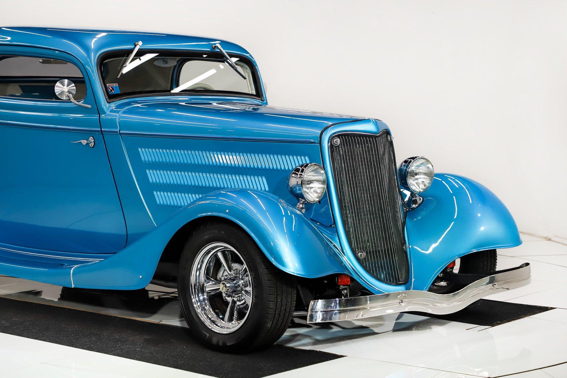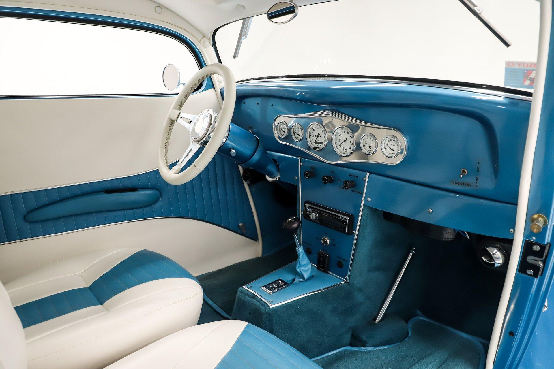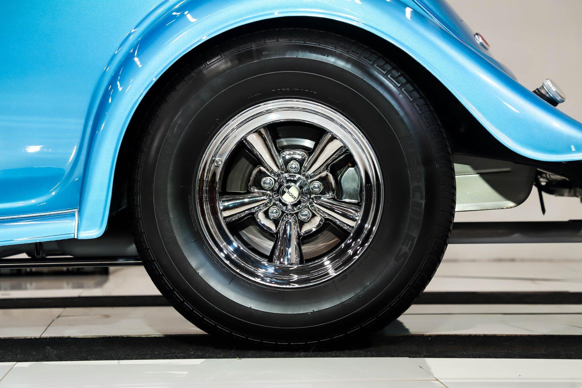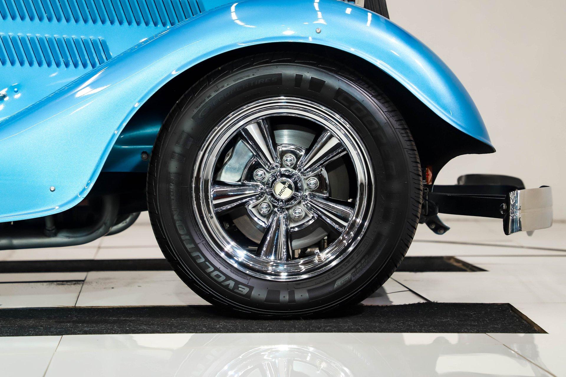 Celebrating our 65 year anniversary! This family owned and operated business was established in 1960, making us the oldest classic car dealership in America. Special thank you to all our customers for entrusting us to park the car of your dreams in your driveway while preserving automotive history for future generations to embrace and enjoy. -Grams family & Volo Museum staff INTRODUCTION: This is a beautiful 34 Ford hot rod that's going to turn heads, it's worthy of any car show and yet you can get in and drive as far as your heart desires! EXTERIOR: A full fendered, chopped top, three window coupe with suicide doors; your classic Hot Rod! This one has a very sturdy Outlaw fiberglass body that is absolutely straight with no damage and fits very nicely. The original style metal hood has louvered sides and the same type chrome handles as the original. It also has original style door handles and bumpers. Painted Bimini blue, it really stands out on this car. We have the paint code and extra paint. The metallic is laid out evenly and it's polished to a very smooth, glossy finish. It has chrome headlights with small turn signals down by the bumper brackets and in back it has LED taillights and a third brake light in the window. Staggered size Unique chrome wheels and much fatter tires in back really adds to the hot rod stance, up front is 14 inch and 15s in back. There is a small hitch receiver if you want to pull a small trailer for lawn chairs and a cooler. INTERIOR: The white interior is really refreshing against the beautiful blue paint. It has an American Auto Wire wiring system and fuse block. There are 12 volt receptacles, Specialty power windows and LED light indicators. A matched set of white face gauges are set in a nice billet bezel. The controls are clearly marked for the heat, air and lights. The Locar shifter is in the mini console along with a CD stereo, speakers are in the kick panels and behind the seats. The seats, door panels and inside of the cab are upholstered to match: white with blue trim. You do have some room behind the seats for extra storage. I like the white cushion grip wheel mounted on the tilt column. I'm 6 ft and fit in the car comfortably. ENGINE COMPARTMENT: That's a crate motor from GM Performance, a 350 Ramjet making 351 horsepower. It features a nostalgic looking fuel injection system with modern technology, stainless headers and electronic ignition. Dressed up with some chrome, it's a nice looking motor. It has a Powermaster alternator and polished compressor. A big aluminum radiator and electric fan keeps it cool. It even features an ooga horn! TRUNK COMPARTMENT: It has a power lift trunk lid with a billet hinges. Inside is boxed and upholstered like the interior with a carpeted floor. A car cover and headrests are included. UNDERSIDE: It was built using a TCI chassis which includes a boxed frame. Up front it has polished tubular control arms and swaybar, coil over adjustable gas shocks, rack and pinion steering. In back it has a 4 link set up with polished tubular control arms and panhard bar, and coilover adjustable gas shocks. Custom aluminum fuel tank, dual exhaust with cherry bomb style mufflers sounds great and it has power disc brakes at all four wheels with polished calipers. Looking up at the motor it is clean with a Powermaster high torque starter. The 700R4 overdrive automatic has a B&M remote oil cooler. A custom drive shaft leads back to the Currie Fab 9 rear end. There are also remote battery terminals so you never get locked out of the trunk because of a dead battery. It's actually very, very clean under here, I'm still having a hard time believing this car has more than 1,000 miles on it. SERVICE: We take pride in our cars and reputation. Therefore, we built a 2 million dollar, 10,000 square ft service center, and hired a team of technicians to service the essentials on every car we sell. CONCLUSION: The colors on this one really sets it apart from the others, the compliments will be nice but the true pleasure will be getting out on the road and driving it, it's dialed in and TurnKey ready! For nearly 30 years, I, Jay Grams, have personally written the highlights for almost every car in our collection. What I provide is my professional opinion based on my experience with these vehicles. However, opinions can vary, and I strongly recommend a personal inspection to form your own view. Our sales team is always available to answer any questions you may have. One great option is to request a personalized walk-around video, where we can showcase the car and share our team’s insights. **Our cars are displayed within a museum setting. If you are interested in a specific vehicle, please schedule an appointment with a salesperson to view it. Without an appointment, there is an admission fee to enter the showroom. If you decide to purchase a car, your admission will be refunded, and you'll receive a one-year museum membership. ☎️ 815 385 3644 9-5 central ? Sales@volocars.com Answered ASAP Air conditioning Power brakes 4 wheel disc Rack & pinion Fuel injection Cruise control Power windows Power lift trunk Stereo system Tilt wheel
