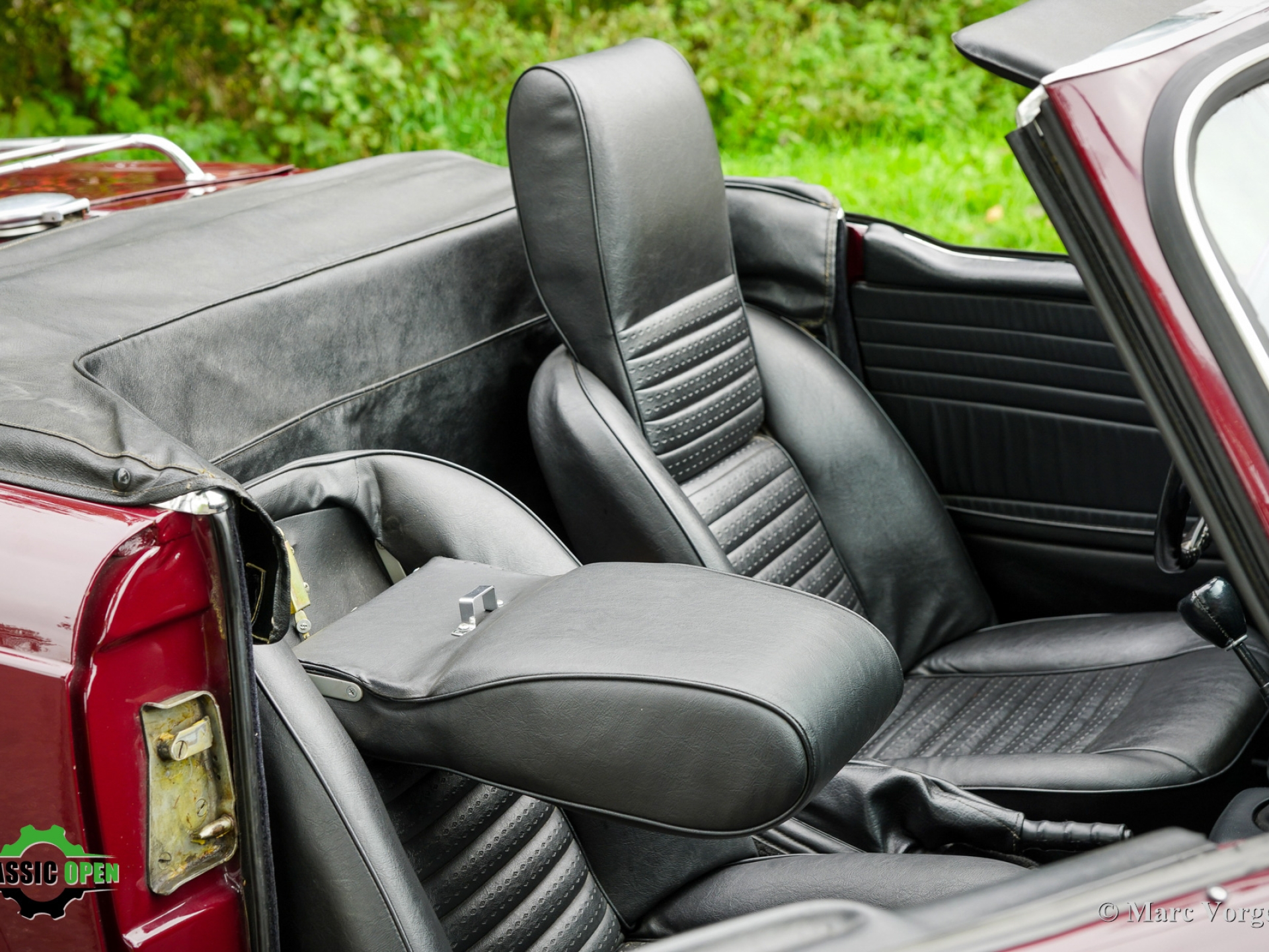 Bodywork finished in dark red (Damson) combined with a black faux leather interior and a black mohair soft-top.