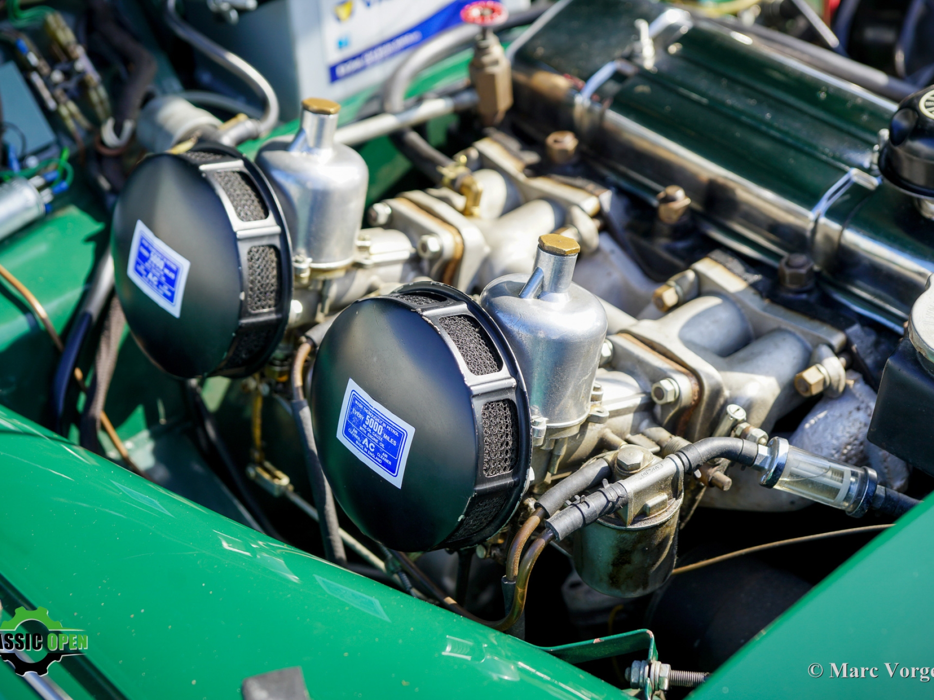 This example is fitted with silver painted wire wheels, Lucas wide-beam fog/cornering lamps, overdrive, power brakes, inertia reel safety belts, an electric cooling fan and a MotoLita sports steering wheel with wood rim.