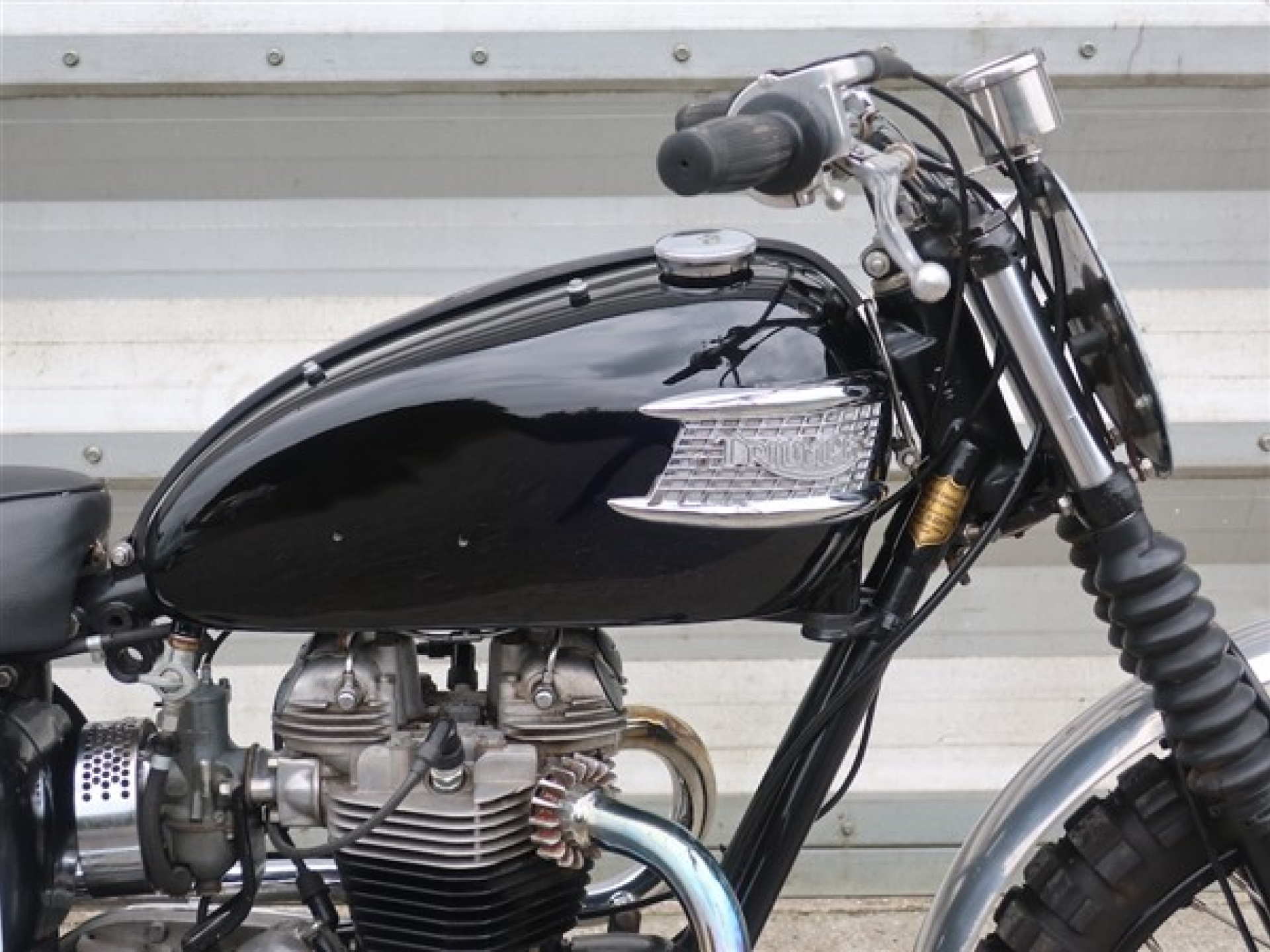 Declared manufactured 1962 as Tiger T110 and road registered 09/03/78 this bike has been converted from its original 650cc capacity with a Morgo 750cc kit. Used as an ‘off road’ Scrambles bike mainly for fun not competition it can be ridden on road under the daylight rules as it has no lights.