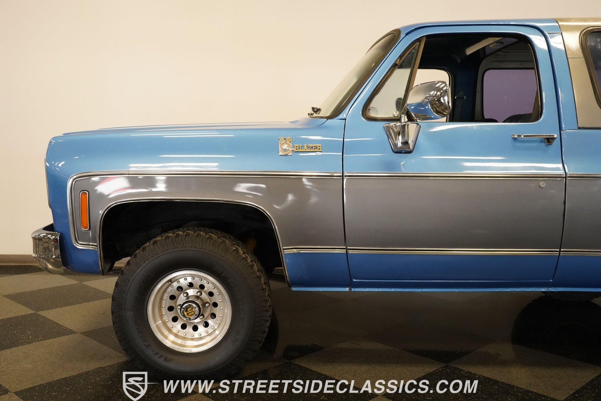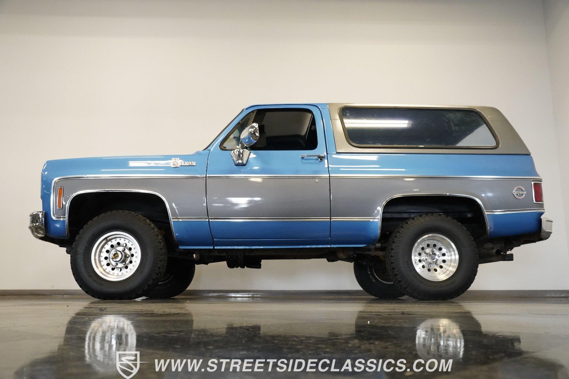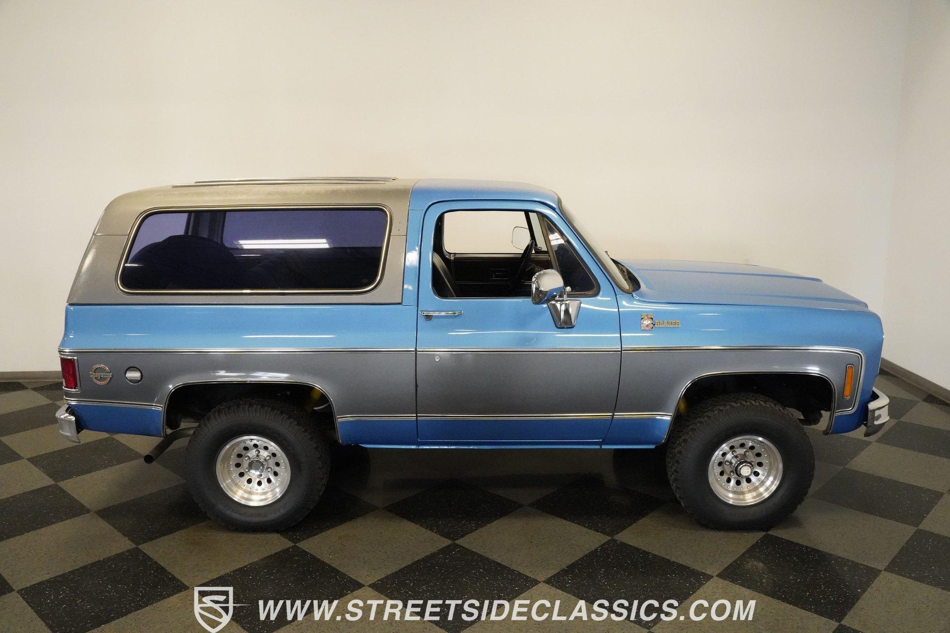 Step back in time and embrace the rugged charm of a true American classic with this 1976 Chevrolet Blazer. This iconic 4x4 represents the spirit of adventure and freedom that defined an era, inviting you to create new memories on and off the road. With its distinctive two-tone blue and gray paint scheme and premium Cheyenne-level trim, this Blazer stands out with character and style. Whether you're a seasoned enthusiast or a newcomer to classic trucks, this vintage Chevy offers a unique blend of nostalgia and capability that's hard to resist. Inside, the Blazer features vinyl bucket seats both front and rear, accented with bright highlights true to the Cheyenne trim package. The interior showcases wood-like trim and practical door map pockets, adding a touch of authenticity and functionality. While the cabin shows its age with original carpeting and some wear, it retains a stock style that invites restoration or customization to suit your personal taste. Under the hood, you'll find a robust 350 cubic inch engine equipped with a Holley single 4-barrel carburetor mounted on an Edelbrock EPS intake manifold. This powertrain is paired with a 4-speed Muncie manual transmission, delivering smooth shifting and engaging driving dynamics. The drivetrain includes a solid Dana 44 front axle and a 12-bolt rear axle, complemented by power disc brakes up front and power drum brakes at the rear. Rugged BFG All-Terrain tires on 15-inch Outlaw II style wheels complete the capable off-road package. Highlights 1976 Chevrolet Blazer Model 350 Cubic Inch Engine Holley Single 4-Barrel Carburetor Edelbrock EPS Intake Manifold 4-Speed Muncie Manual Transmission Dana 44 Front Axle 12-Bolt Rear Axle Power Disc Front Brakes Power Drum Rear Brakes Power Steering Air Conditioning (Blowing Cold) Two-Tone Blue and Gray Paint Vinyl Bucket Seating Front and Rear BFG All-Terrain Tires Financing Available Vehicle Protection Plans Available Worldwide Shipping This 1976 Chevrolet Blazer is a solid opportunity to own a classic off-road vehicle with great potential. It combines nostalgic appeal with practical upgrades and solid mechanicals. Call, email, or come visit our showroom today!