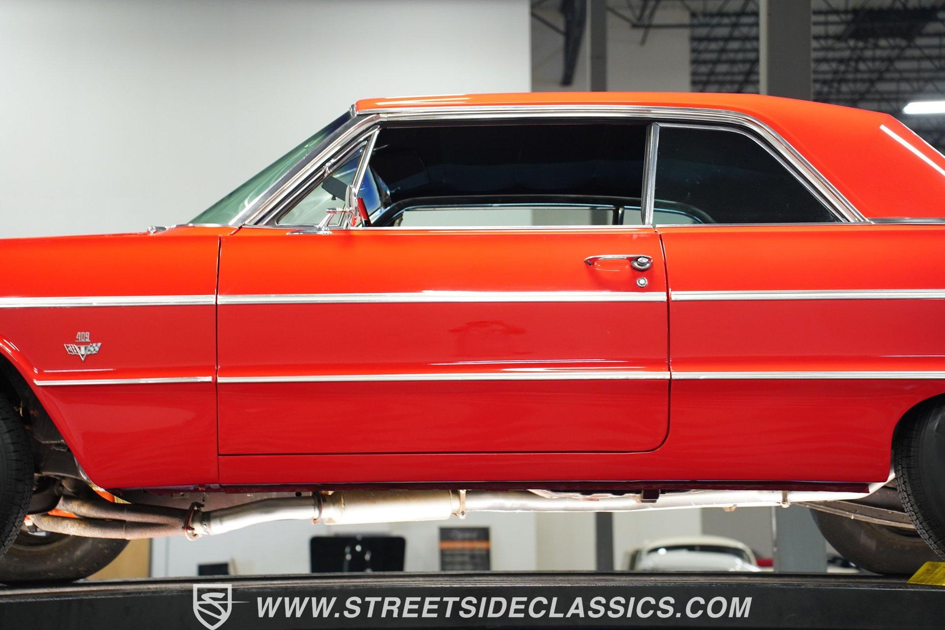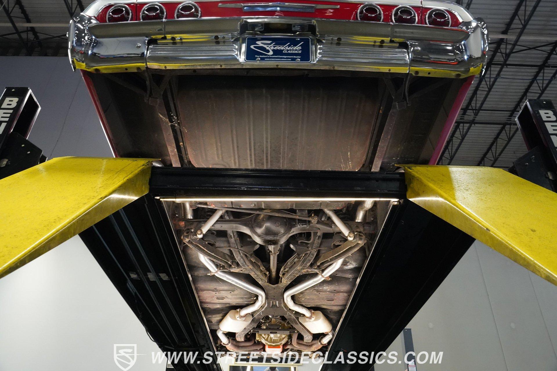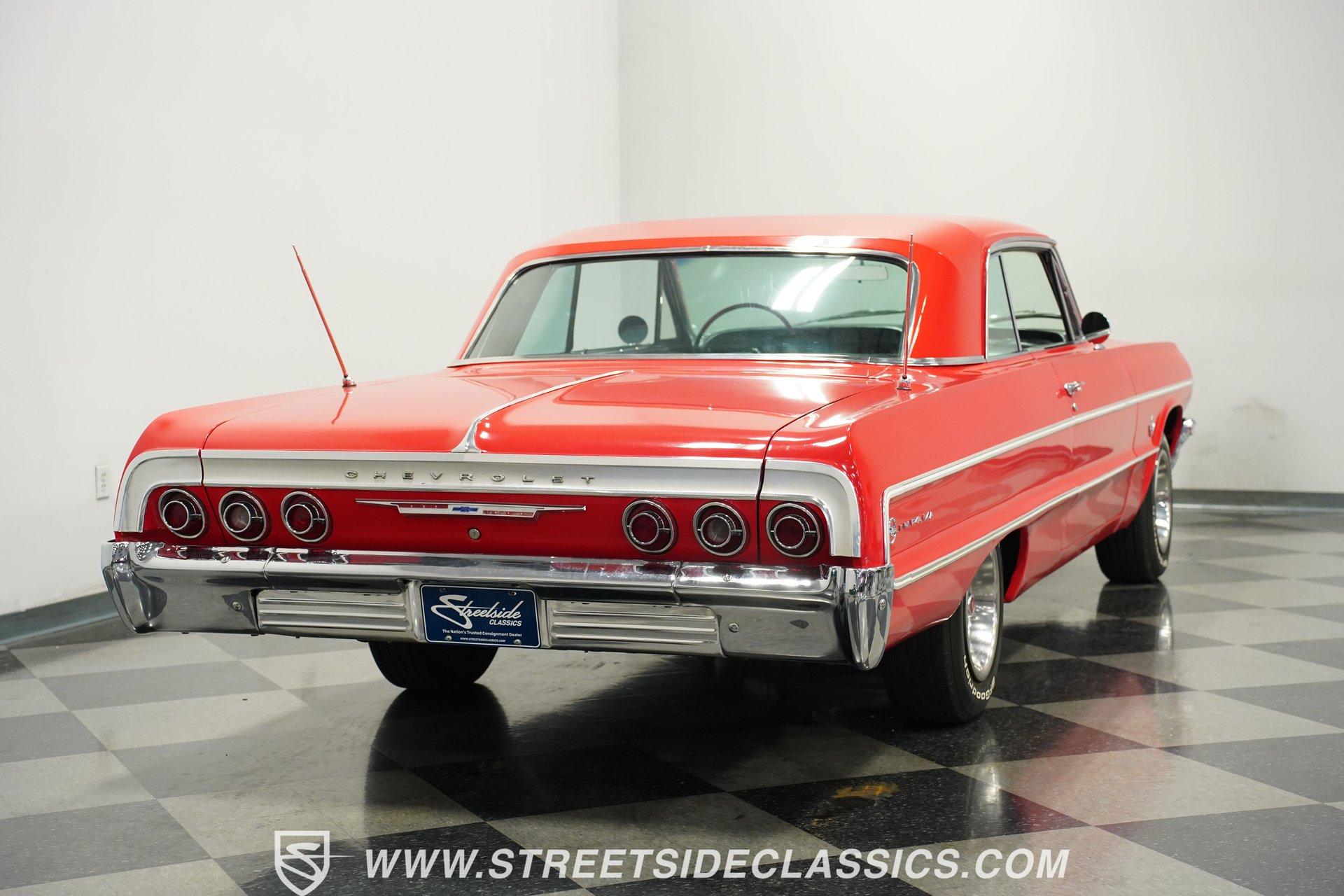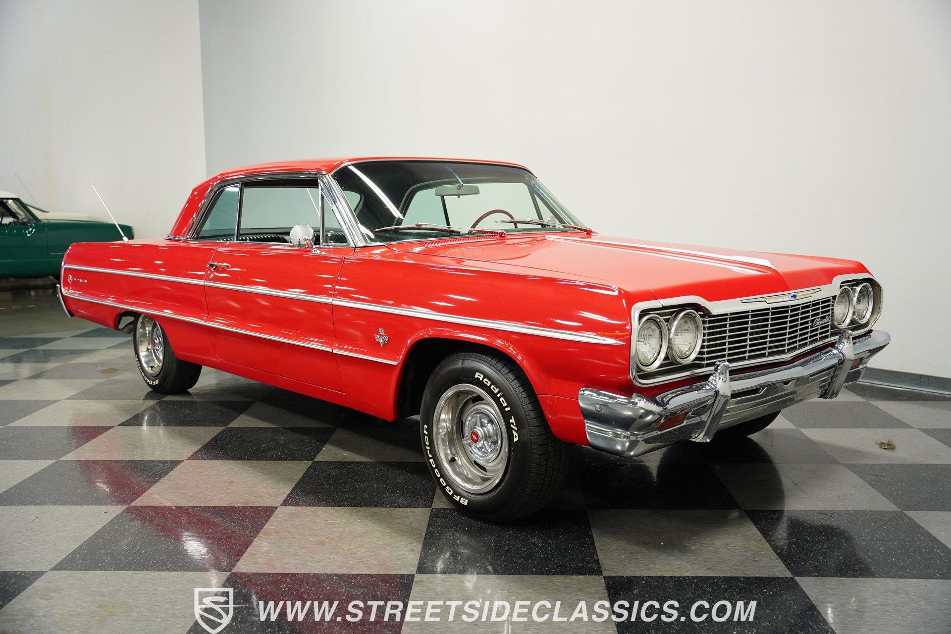 For the iconic Beach Boys to write a hit song about an engine, it had to be a special motor attached to a special kind of car. One look at this 1964 Chevrolet Impala SS 409, decked out in a beautiful Bright Red repaint and stretched over its two-door coupe configuration, showcasing its straight lines, shimmering chrome trim, and trick dual-triplet taillight arrangement, and it's easy to see why this car was so inspiring. Inside, we find a mostly stock restored black vinyl interior. A split-bench front seat leaves plenty of room up front. At the same time, the old-school two-spoke, power-assisted steering wheel adds a splash of body-color red, sitting just ahead of a column-mounted 6,000 rpm tachometer and a horizontal 120 mph speedometer. A trio of auxiliary gauges sits under the dashboard, while the sliding HVAC controls and an AM/FM/Cassette radio sit against an SS-style machine-turned dashboard insert. Under that expansive hood, we find out what all the fuss is about. Centered in a clean engine bay sits a 409 cubic-inch V-8. Part of Chevy's famous W-series big-block motor family, this 409 sports a set of chrome valve covers and an aluminum radiator. Topped with a four-barrel Holley Performance carburetor, Edelbrock intake manifold, and lightweight Edelbrock aluminum heads, spent gases are expelled via FlowMaster dual exhaust. That power is routed through a tried-and-true Muncie M20 four-speed manual transmission before heading out to the stock-style rear end, which transfers those ponies to the pavement through a set of beautiful, 15-inch Rallye wheels sporting knock-off-style center caps, shod in BFGoodrich tires. HIGHLIGHTS: Bright Red Repaint Dual Aerials 409 CID V8 MSD Distributor Holley Four Barrel Edelbrock Intake Edelbrock Aluminum Heads Long Tubes FlowMaster Dual Exhaust Muncie M20 Four Speed Stock Restored Interior Black Vinyl Power Steering SS Style Dash Insert AM/FM/Cassette Owner's Manual This 1964 Chevrolet Impala SS 409 features a traditional coil-and-shock suspension, complemented by an old-school live rear axle. Power brakes, featuring a set of front discs, are ready to scrub off speed at a moment's notice. So, if owning a classic 409-powered Impala has been on your bucket list and you've saved your pennies and saved your dimes, then maybe it's time you buy a (not quite) brand-new 409! Don't wait, call today!