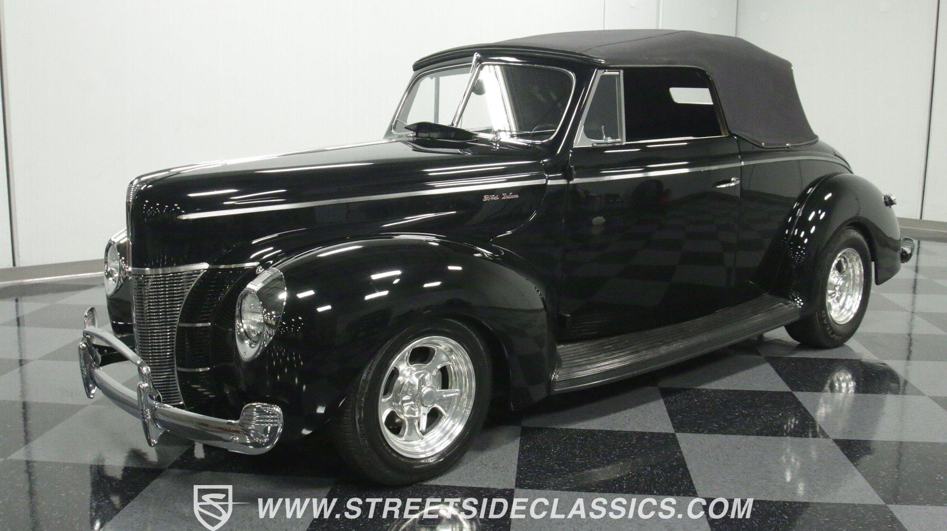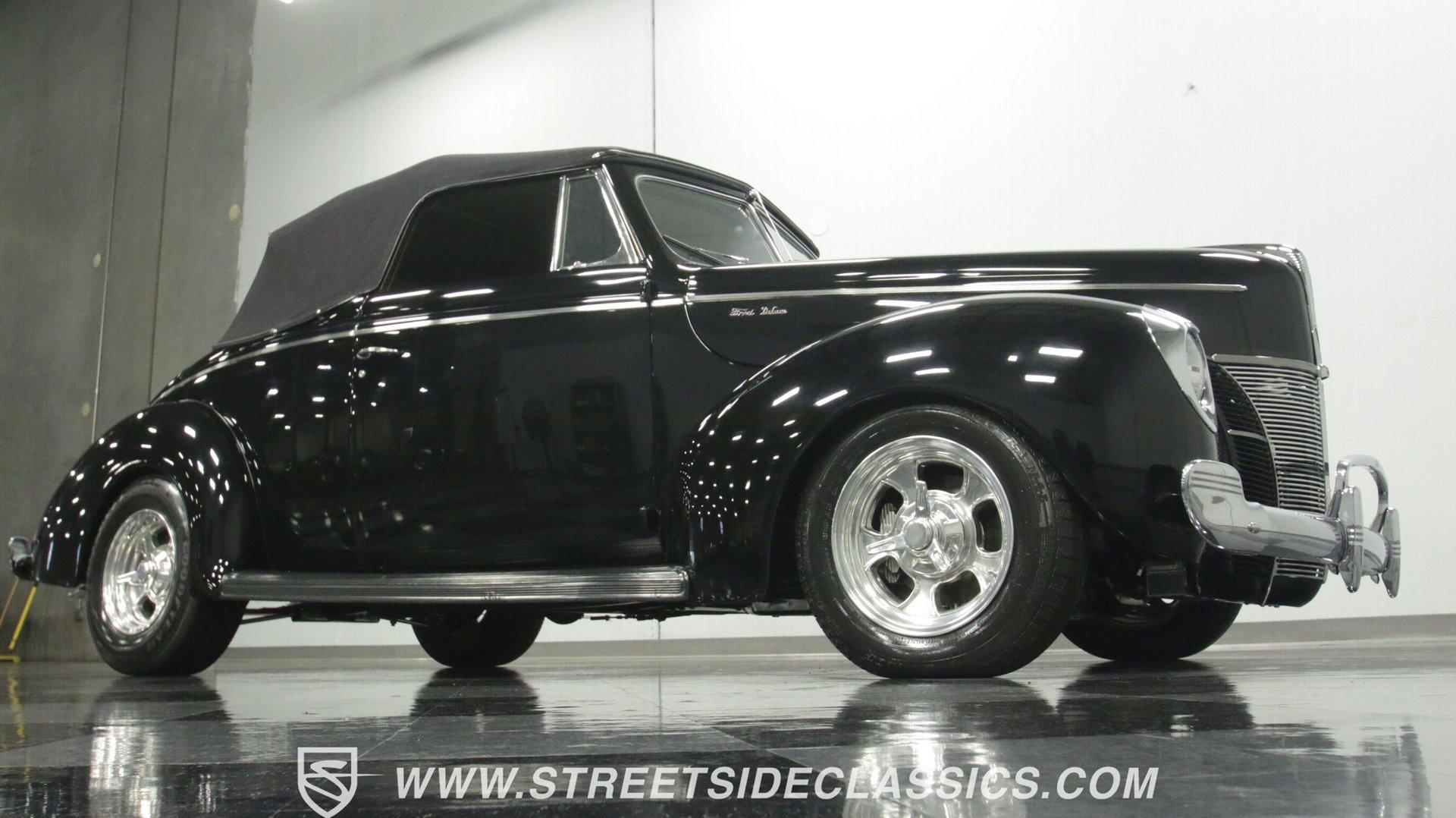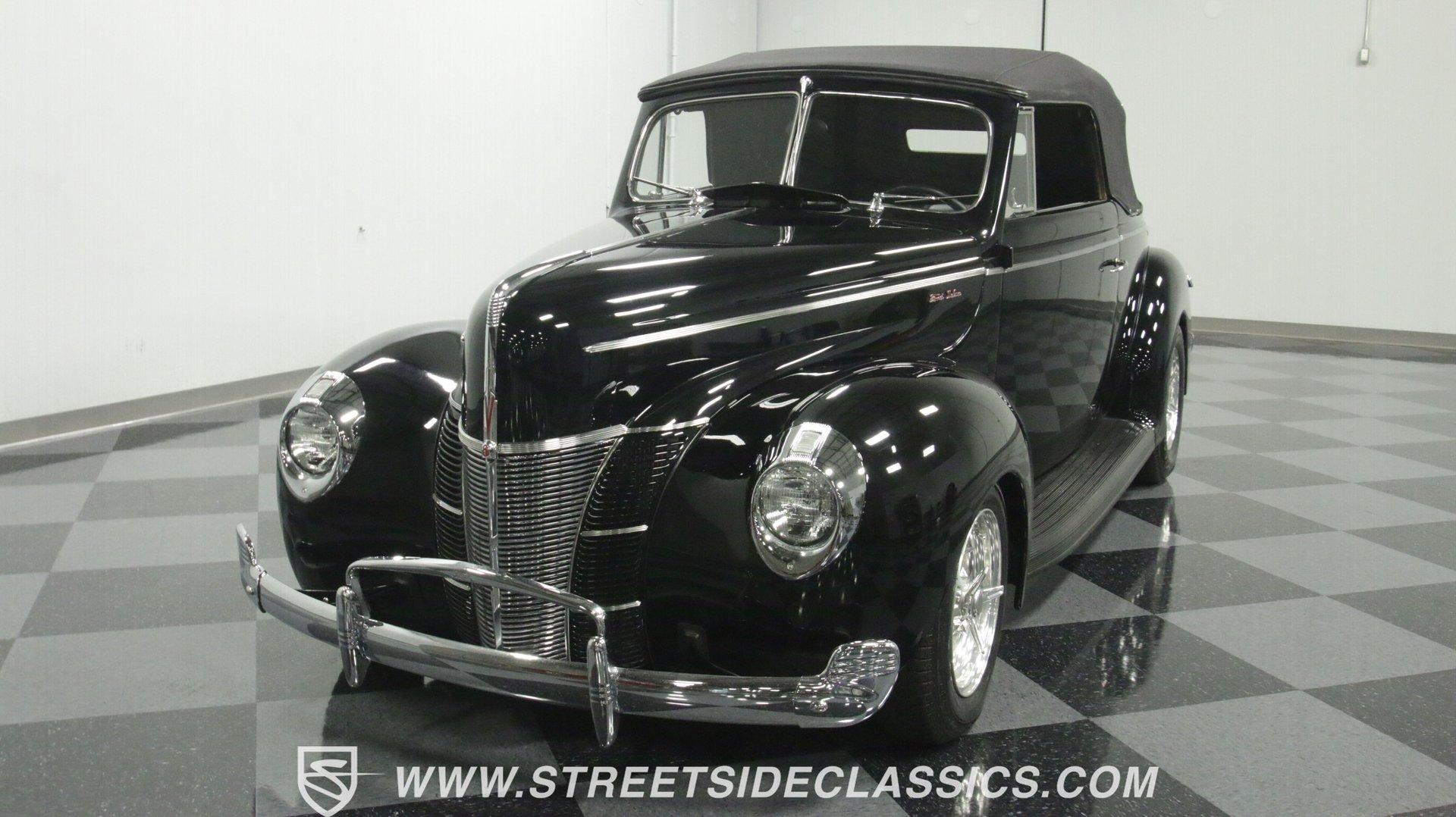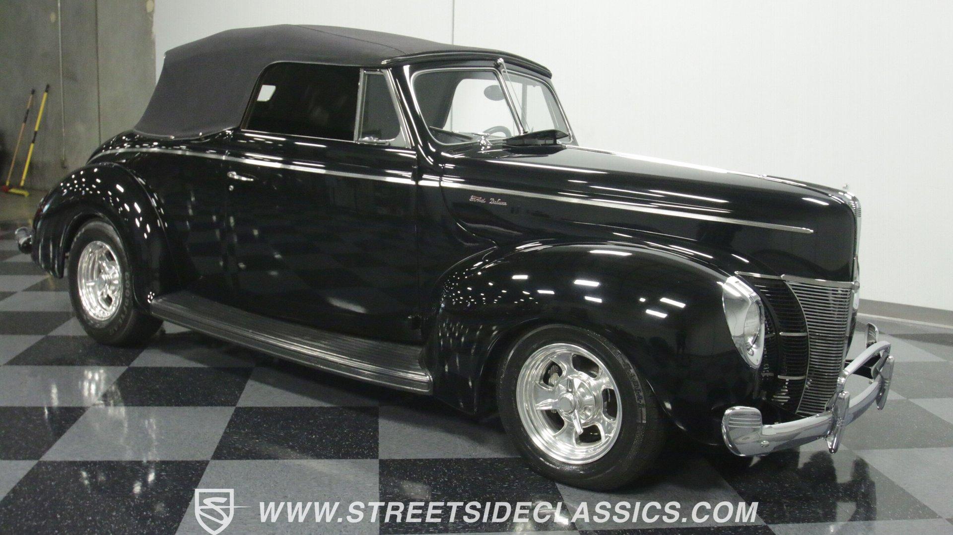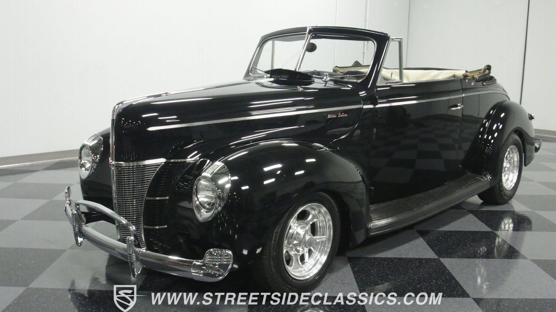 This show-stopping, sinister 1940 Ford Deluxe Convertible is the epitome of a grown-up hotrod. No gaudy flames, no goofy body mods, no obnoxious exhaust, just a show-quality custom build that likely cost thousands more than the asking price that delivers a professional level of performance and curb appeal. With a powerful 350 V8 under the hood, an upgraded sports suspension featuring power 4-wheel disc brakes, a luxurious black leather interior, and a super-slick, steel body covered in gallons of elegant black paint, this all-time favorite hotrod was built to show-or-go, and it does it all in a very BIG way. Everybody loves the iconic 1940 Ford, so much so that they're still cranking out fiberglass replicas today. Fortunately, this one has a steel body and fenders, so it feels incredibly substantial and was put together by professionals so it looks loads better than it did when it was new. The pointed hood and grille are icons in the hobby and despite the amazing build and practically flawless performance of this car, they decided to keep things low-key and let the paint do all the talking. When it comes to a black finish, you better ensure the body is laser-straight and free of flaws because dark colors are very unforgiving when it comes to poor prep-work, and it's obvious the builders spent countless hours getting this one lined up just right. It's been driven and enjoyed since the restoration was completed, so it's no longer perfect, but any imperfections are very minor and can barely be seen by the naked eye. The miles-deep, shiny black finish accentuates the Ford's generous curves without hiding anything, and the traditional color will never look dated and always bring out the crowds. That's good news, because fit and finish are fantastic as well, with excellent gaps and a spectacular luster that should most of the trophies at your local car show. They didn't shave or chop anything, and the original brightwork and trim was restored and reinstalled, so it looks like a 1940 Ford in every way. Stock chrome bumpers fore and aft, teardrop headlights, and chevron-style taillights all give this Ford a very high-quality look and feel, and it looks slick-as-can-be with the top up or down. Open those long, heavy doors and take a look inside where the stunning black leather interior is essentially a work of art. Subtle and sophisticated, it was custom crafted to maximize space inside, so just about anyone can get comfortable behind the wheel or in the passenger's seat. The black leather hides are almost completely unmarked (other than a few minor comfort marks), and the supportive bucket seats up front and matching rear seat in the back make this '40 Ford all-day comfortable for the whole crew. Sculpted door panels integrate billet door handles and modern power window switches, plush black carpets line the floors and insulate things inside, and the dash was beautifully painted to match and really pops thanks to those chrome accents. A custom chrome bezel houses a host of VDO gauges ahead of the driver, and they do a great job keeping an eye on the motor up ahead while still giving the cabin a very 1940s look. The leather-wrapped, banjo-style steering wheel feels great in the hands of the driver, and thanks to the tilt column it can be adjusted to accommodate just about anyone, and even the billet pedals were carefully selected to match the theme of the interior. A Lokar shifter manages the automatic transmission below, and there's a beautifully stitched black cloth convertible top that's power-actuated and seals up the cabin from the outside world. Out back, the spacious trunk was lined with plush black carpets to match the cabin, and there's plenty of room inside to account for most travel plans. Under all that chrome, there's a 350 cubic inch V8, chosen specifically because of its low demands for the new owner. Plenty powerful, it's a crate motor from GM Performance Parts that's reported to have been stroked to 383 cubes (although, unfortunately we don't have any paperwork to prove this claim), and with all that added horsepower and torque it moves the Ford with effortless ease. Performance parts include GM Performance heads, an Edelbrock 4-barrel carburetor, a polished aluminum intake, and long-tube headers at the flanks that make the small block extremely responsive. Just about everything you can see was polished or plated, including the finned valve covers and matching air cleaner, and the builders went to great lengths to hide all the wiring and plumbing. Backed by a TH350 3-speed automatic transmission and a swapped-in Corvette C3 rear end, it's an effortless high-speed tourer that rides and handles like a modern car, and a big aluminum radiator up front keeps the whole show nice and cool. The front suspension is all independent and features tubular A-arms with coilovers and rack-and-pinion steering, and there's a power disc brake at each corner. The frame is heavily reinforced while the custom stainless exhaust system tucks up underneath for excellent ground clearance, and it sounds amazing, too. Staggered chrome alloys with spinners carry 165/15 front and 235/70/15 rear Dunlop radials that really fill the fenders perfectly in the classic big-and-little stance. This isn't your average hotrod, but if you're an adult who is tired of the same-old, same-old at all the car shows, this stunning 1940 Ford convertible is the antidote. Call today!