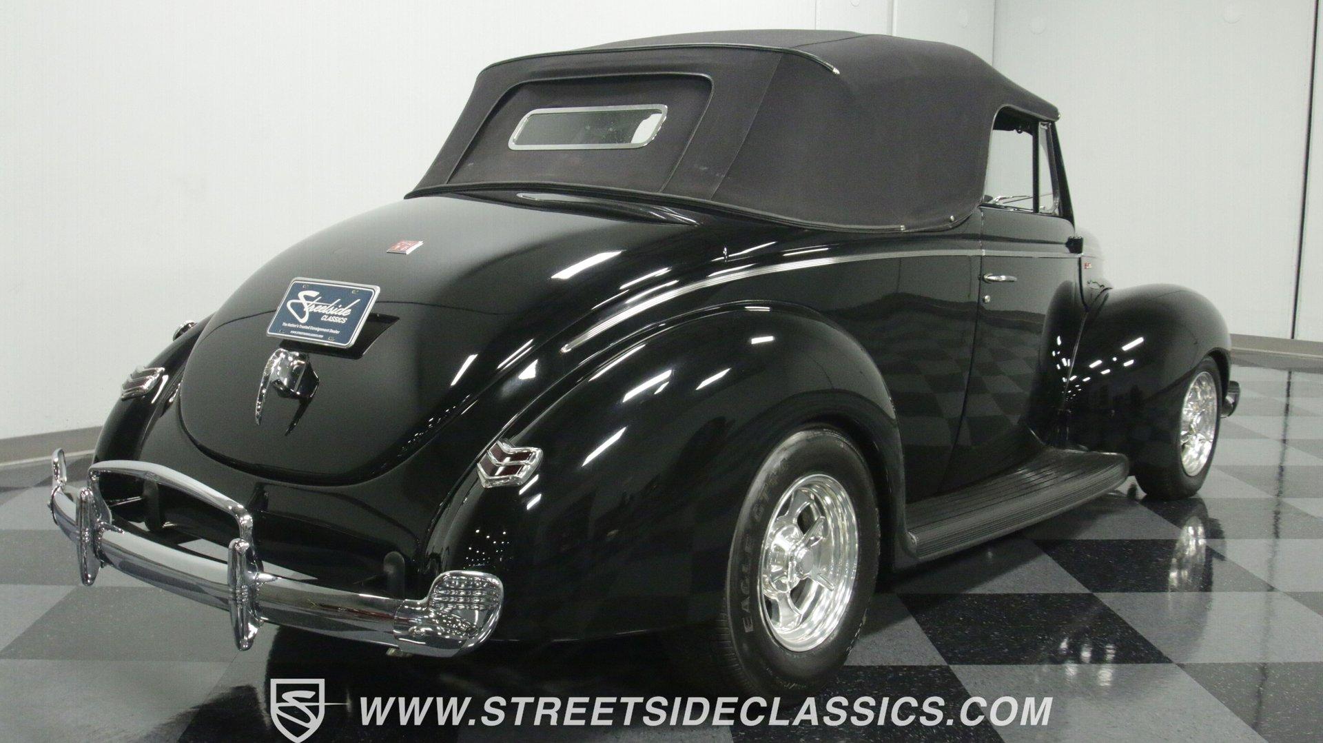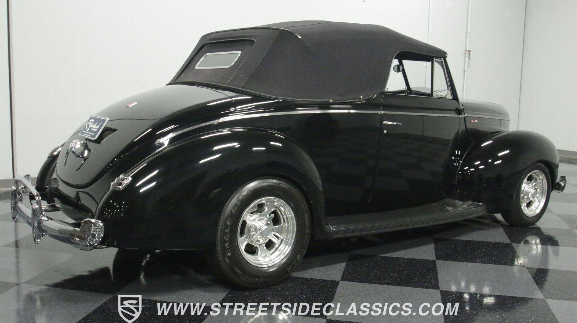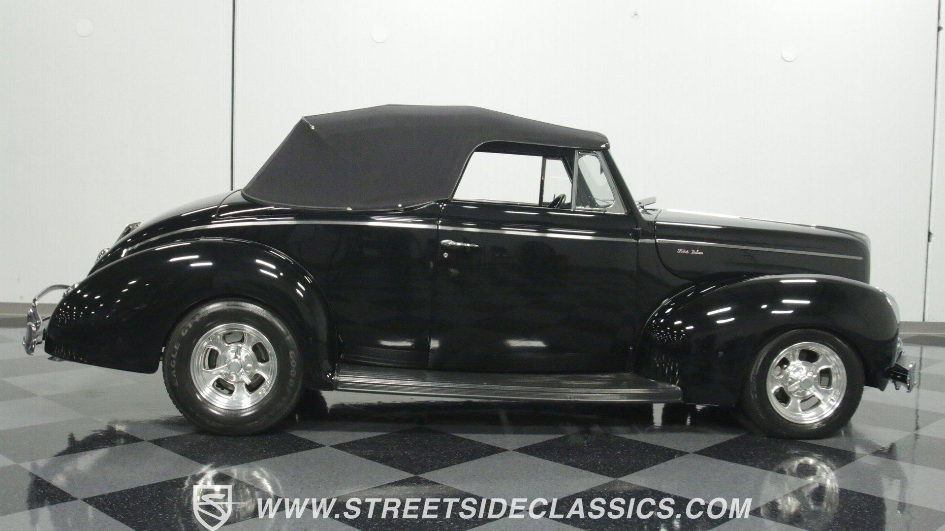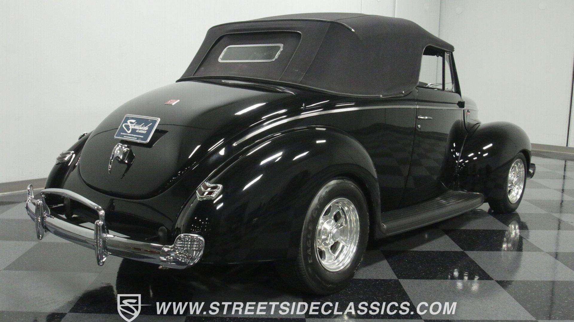 This show-stopping, sinister 1940 Ford Deluxe Convertible is the epitome of a grown-up hotrod. No gaudy flames, no goofy body mods, no obnoxious exhaust, just a show-quality custom build that likely cost thousands more than the asking price that delivers a professional level of performance and curb appeal. With a powerful 350 V8 under the hood, an upgraded sports suspension featuring power 4-wheel disc brakes, a luxurious black leather interior, and a super-slick, steel body covered in gallons of elegant black paint, this all-time favorite hotrod was built to show-or-go, and it does it all in a very BIG way. Everybody loves the iconic 1940 Ford, so much so that they're still cranking out fiberglass replicas today. Fortunately, this one has a steel body and fenders, so it feels incredibly substantial and was put together by professionals so it looks loads better than it did when it was new. The pointed hood and grille are icons in the hobby and despite the amazing build and practically flawless performance of this car, they decided to keep things low-key and let the paint do all the talking. When it comes to a black finish, you better ensure the body is laser-straight and free of flaws because dark colors are very unforgiving when it comes to poor prep-work, and it's obvious the builders spent countless hours getting this one lined up just right. It's been driven and enjoyed since the restoration was completed, so it's no longer perfect, but any imperfections are very minor and can barely be seen by the naked eye. The miles-deep, shiny black finish accentuates the Ford's generous curves without hiding anything, and the traditional color will never look dated and always bring out the crowds. That's good news, because fit and finish are fantastic as well, with excellent gaps and a spectacular luster that should most of the trophies at your local car show. They didn't shave or chop anything, and the original brightwork and trim was restored and reinstalled, so it looks like a 1940 Ford in every way. Stock chrome bumpers fore and aft, teardrop headlights, and chevron-style taillights all give this Ford a very high-quality look and feel, and it looks slick-as-can-be with the top up or down. Open those long, heavy doors and take a look inside where the stunning black leather interior is essentially a work of art. Subtle and sophisticated, it was custom crafted to maximize space inside, so just about anyone can get comfortable behind the wheel or in the passenger's seat. The black leather hides are almost completely unmarked (other than a few minor comfort marks), and the supportive bucket seats up front and matching rear seat in the back make this '40 Ford all-day comfortable for the whole crew. Sculpted door panels integrate billet door handles and modern power window switches, plush black carpets line the floors and insulate things inside, and the dash was beautifully painted to match and really pops thanks to those chrome accents. A custom chrome bezel houses a host of VDO gauges ahead of the driver, and they do a great job keeping an eye on the motor up ahead while still giving the cabin a very 1940s look. The leather-wrapped, banjo-style steering wheel feels great in the hands of the driver, and thanks to the tilt column it can be adjusted to accommodate just about anyone, and even the billet pedals were carefully selected to match the theme of the interior. A Lokar shifter manages the automatic transmission below, and there's a beautifully stitched black cloth convertible top that's power-actuated and seals up the cabin from the outside world. Out back, the spacious trunk was lined with plush black carpets to match the cabin, and there's plenty of room inside to account for most travel plans. Under all that chrome, there's a 350 cubic inch V8, chosen specifically because of its low demands for the new owner. Plenty powerful, it's a crate motor from GM Performance Parts that's reported to have been stroked to 383 cubes (although, unfortunately we don't have any paperwork to prove this claim), and with all that added horsepower and torque it moves the Ford with effortless ease. Performance parts include GM Performance heads, an Edelbrock 4-barrel carburetor, a polished aluminum intake, and long-tube headers at the flanks that make the small block extremely responsive. Just about everything you can see was polished or plated, including the finned valve covers and matching air cleaner, and the builders went to great lengths to hide all the wiring and plumbing. Backed by a TH350 3-speed automatic transmission and a swapped-in Corvette C3 rear end, it's an effortless high-speed tourer that rides and handles like a modern car, and a big aluminum radiator up front keeps the whole show nice and cool. The front suspension is all independent and features tubular A-arms with coilovers and rack-and-pinion steering, and there's a power disc brake at each corner. The frame is heavily reinforced while the custom stainless exhaust system tucks up underneath for excellent ground clearance, and it sounds amazing, too. Staggered chrome alloys with spinners carry 165/15 front and 235/70/15 rear Dunlop radials that really fill the fenders perfectly in the classic big-and-little stance. This isn't your average hotrod, but if you're an adult who is tired of the same-old, same-old at all the car shows, this stunning 1940 Ford convertible is the antidote. Call today!