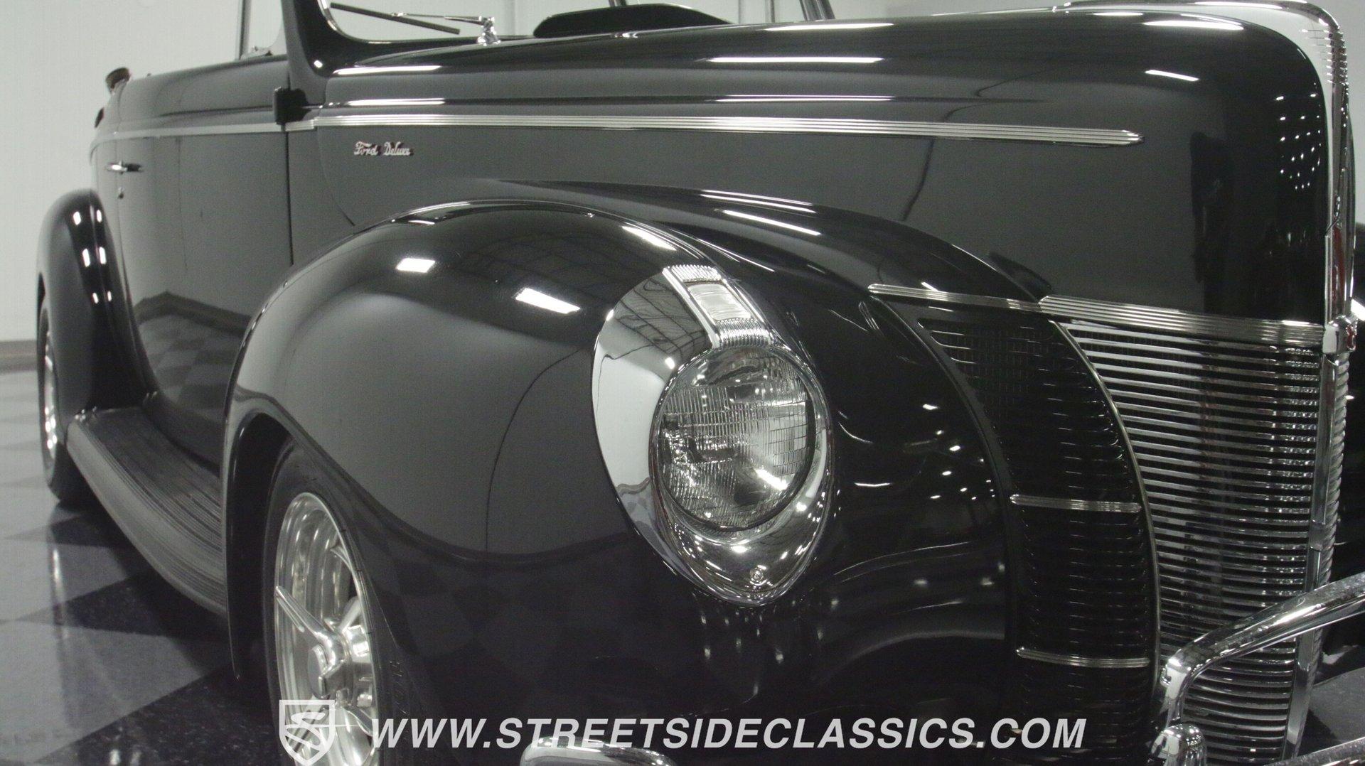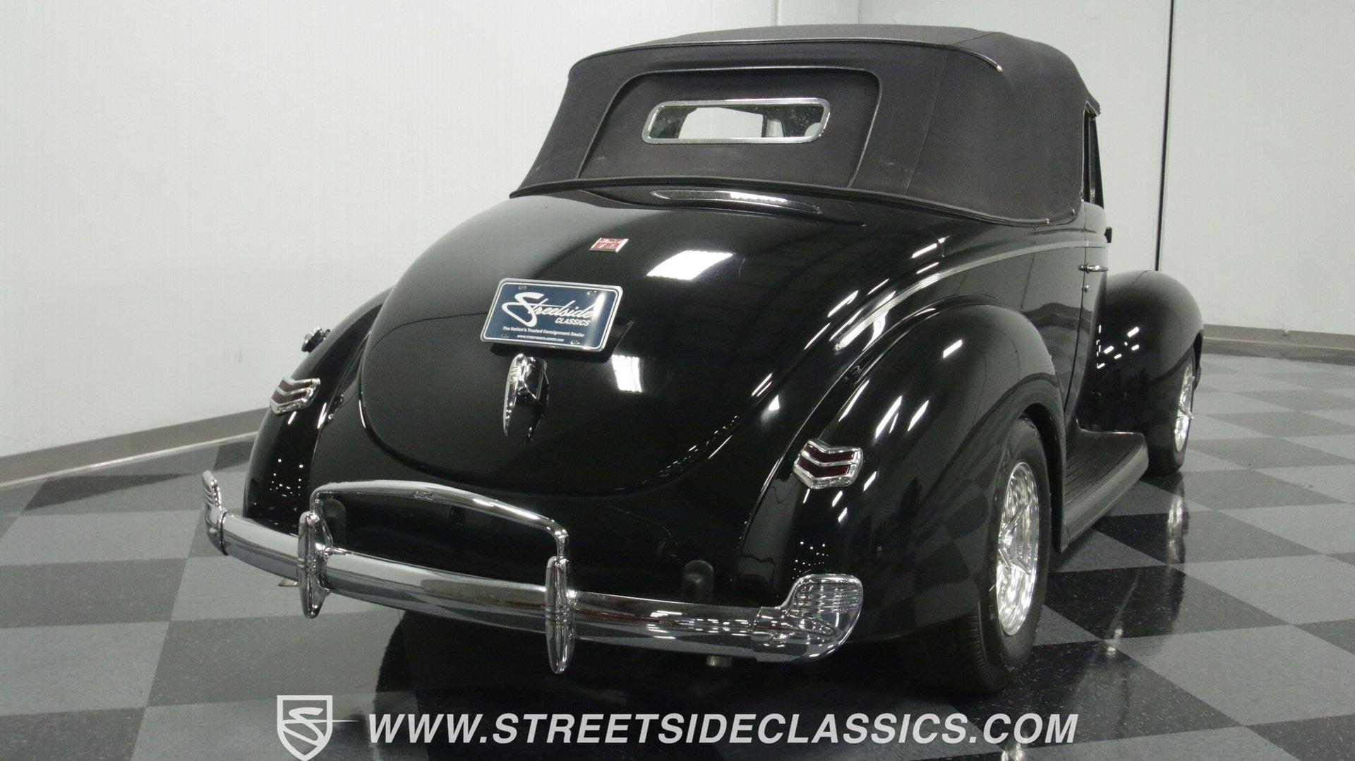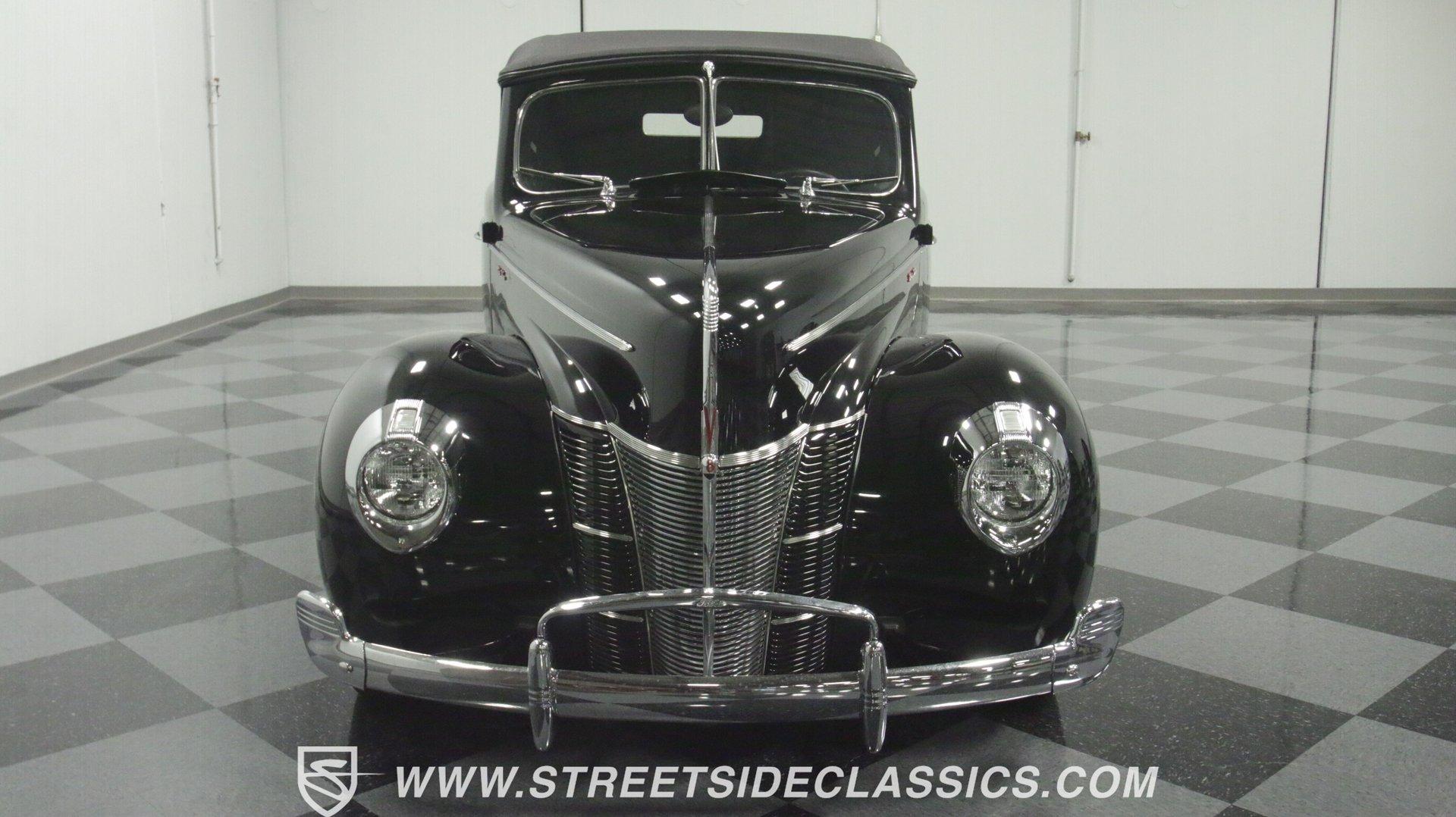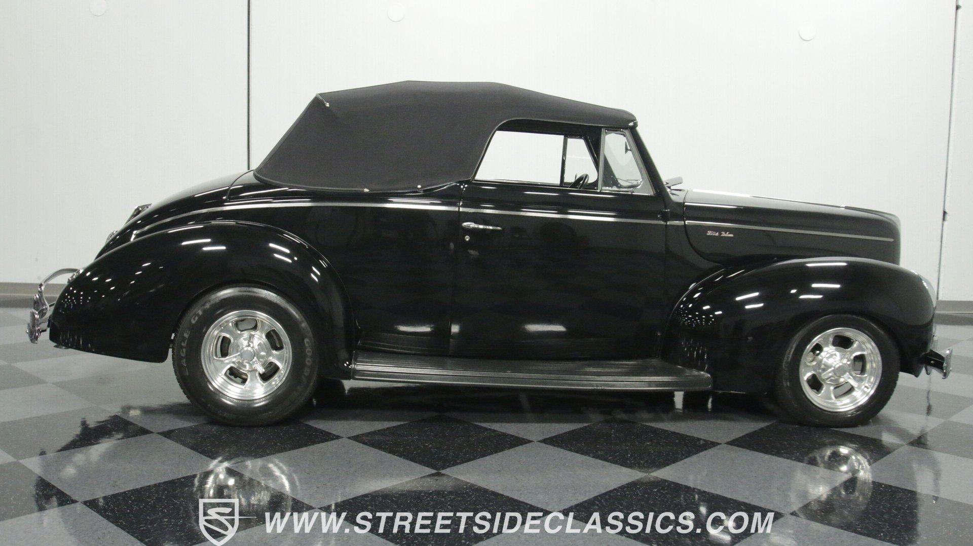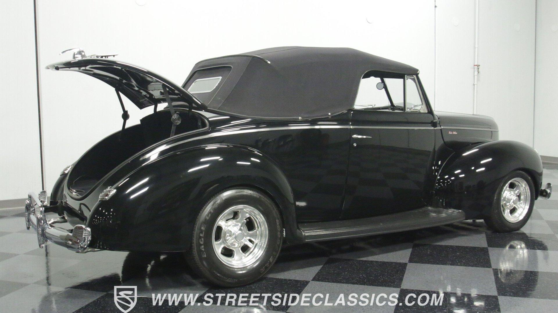 This show-stopping, sinister 1940 Ford Deluxe Convertible is the epitome of a grown-up hotrod. No gaudy flames, no goofy body mods, no obnoxious exhaust, just a show-quality custom build that likely cost thousands more than the asking price that delivers a professional level of performance and curb appeal. With a powerful 350 V8 under the hood, an upgraded sports suspension featuring power 4-wheel disc brakes, a luxurious black leather interior, and a super-slick, steel body covered in gallons of elegant black paint, this all-time favorite hotrod was built to show-or-go, and it does it all in a very BIG way. Everybody loves the iconic 1940 Ford, so much so that they're still cranking out fiberglass replicas today. Fortunately, this one has a steel body and fenders, so it feels incredibly substantial and was put together by professionals so it looks loads better than it did when it was new. The pointed hood and grille are icons in the hobby and despite the amazing build and practically flawless performance of this car, they decided to keep things low-key and let the paint do all the talking. When it comes to a black finish, you better ensure the body is laser-straight and free of flaws because dark colors are very unforgiving when it comes to poor prep-work, and it's obvious the builders spent countless hours getting this one lined up just right. It's been driven and enjoyed since the restoration was completed, so it's no longer perfect, but any imperfections are very minor and can barely be seen by the naked eye. The miles-deep, shiny black finish accentuates the Ford's generous curves without hiding anything, and the traditional color will never look dated and always bring out the crowds. That's good news, because fit and finish are fantastic as well, with excellent gaps and a spectacular luster that should most of the trophies at your local car show. They didn't shave or chop anything, and the original brightwork and trim was restored and reinstalled, so it looks like a 1940 Ford in every way. Stock chrome bumpers fore and aft, teardrop headlights, and chevron-style taillights all give this Ford a very high-quality look and feel, and it looks slick-as-can-be with the top up or down. Open those long, heavy doors and take a look inside where the stunning black leather interior is essentially a work of art. Subtle and sophisticated, it was custom crafted to maximize space inside, so just about anyone can get comfortable behind the wheel or in the passenger's seat. The black leather hides are almost completely unmarked (other than a few minor comfort marks), and the supportive bucket seats up front and matching rear seat in the back make this '40 Ford all-day comfortable for the whole crew. Sculpted door panels integrate billet door handles and modern power window switches, plush black carpets line the floors and insulate things inside, and the dash was beautifully painted to match and really pops thanks to those chrome accents. A custom chrome bezel houses a host of VDO gauges ahead of the driver, and they do a great job keeping an eye on the motor up ahead while still giving the cabin a very 1940s look. The leather-wrapped, banjo-style steering wheel feels great in the hands of the driver, and thanks to the tilt column it can be adjusted to accommodate just about anyone, and even the billet pedals were carefully selected to match the theme of the interior. A Lokar shifter manages the automatic transmission below, and there's a beautifully stitched black cloth convertible top that's power-actuated and seals up the cabin from the outside world. Out back, the spacious trunk was lined with plush black carpets to match the cabin, and there's plenty of room inside to account for most travel plans. Under all that chrome, there's a 350 cubic inch V8, chosen specifically because of its low demands for the new owner. Plenty powerful, it's a crate motor from GM Performance Parts that's reported to have been stroked to 383 cubes (although, unfortunately we don't have any paperwork to prove this claim), and with all that added horsepower and torque it moves the Ford with effortless ease. Performance parts include GM Performance heads, an Edelbrock 4-barrel carburetor, a polished aluminum intake, and long-tube headers at the flanks that make the small block extremely responsive. Just about everything you can see was polished or plated, including the finned valve covers and matching air cleaner, and the builders went to great lengths to hide all the wiring and plumbing. Backed by a TH350 3-speed automatic transmission and a swapped-in Corvette C3 rear end, it's an effortless high-speed tourer that rides and handles like a modern car, and a big aluminum radiator up front keeps the whole show nice and cool. The front suspension is all independent and features tubular A-arms with coilovers and rack-and-pinion steering, and there's a power disc brake at each corner. The frame is heavily reinforced while the custom stainless exhaust system tucks up underneath for excellent ground clearance, and it sounds amazing, too. Staggered chrome alloys with spinners carry 165/15 front and 235/70/15 rear Dunlop radials that really fill the fenders perfectly in the classic big-and-little stance. This isn't your average hotrod, but if you're an adult who is tired of the same-old, same-old at all the car shows, this stunning 1940 Ford convertible is the antidote. Call today!