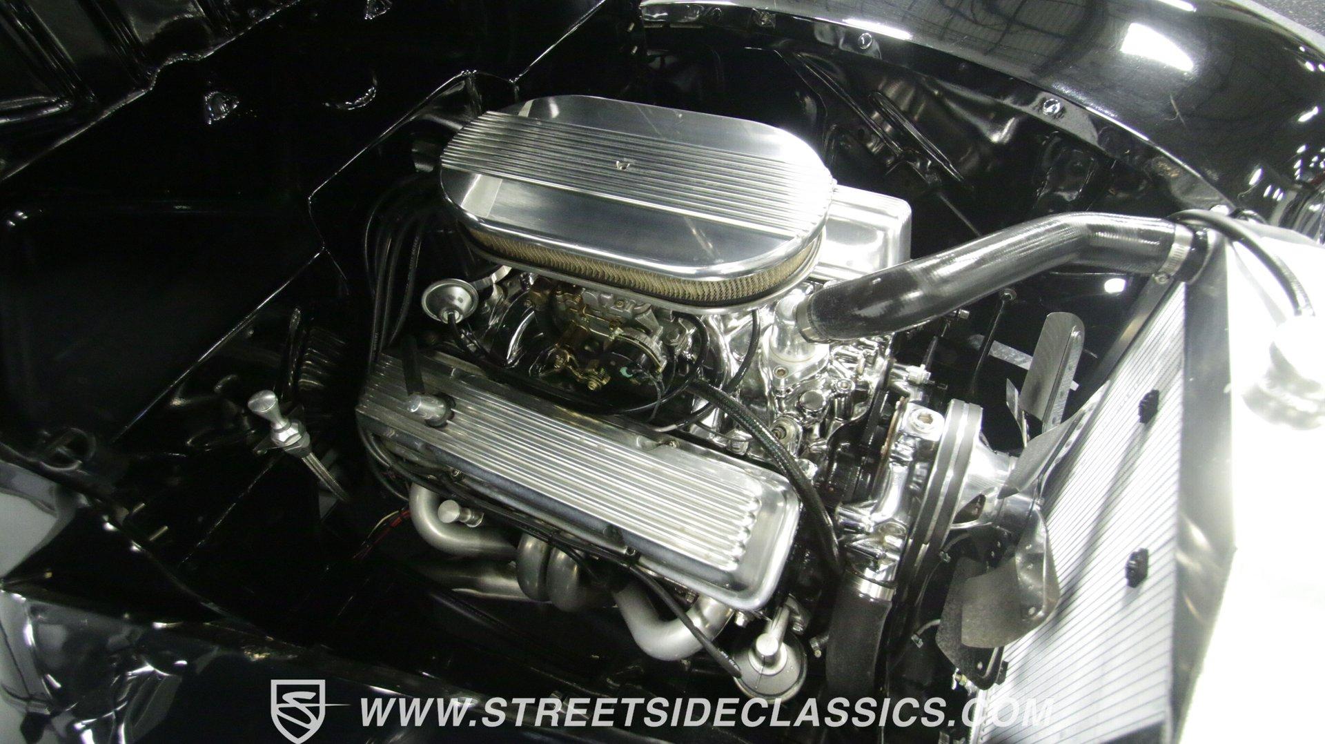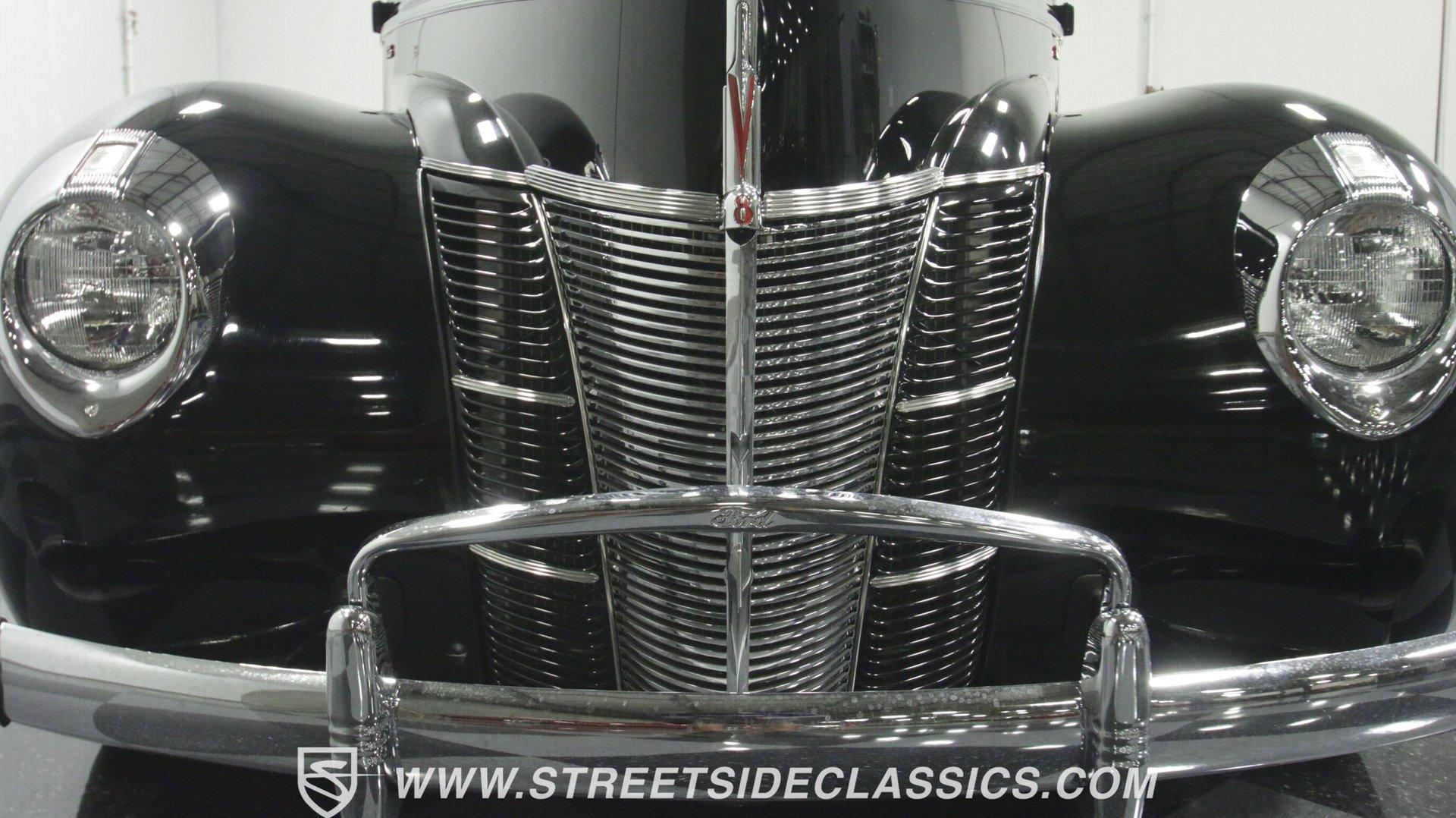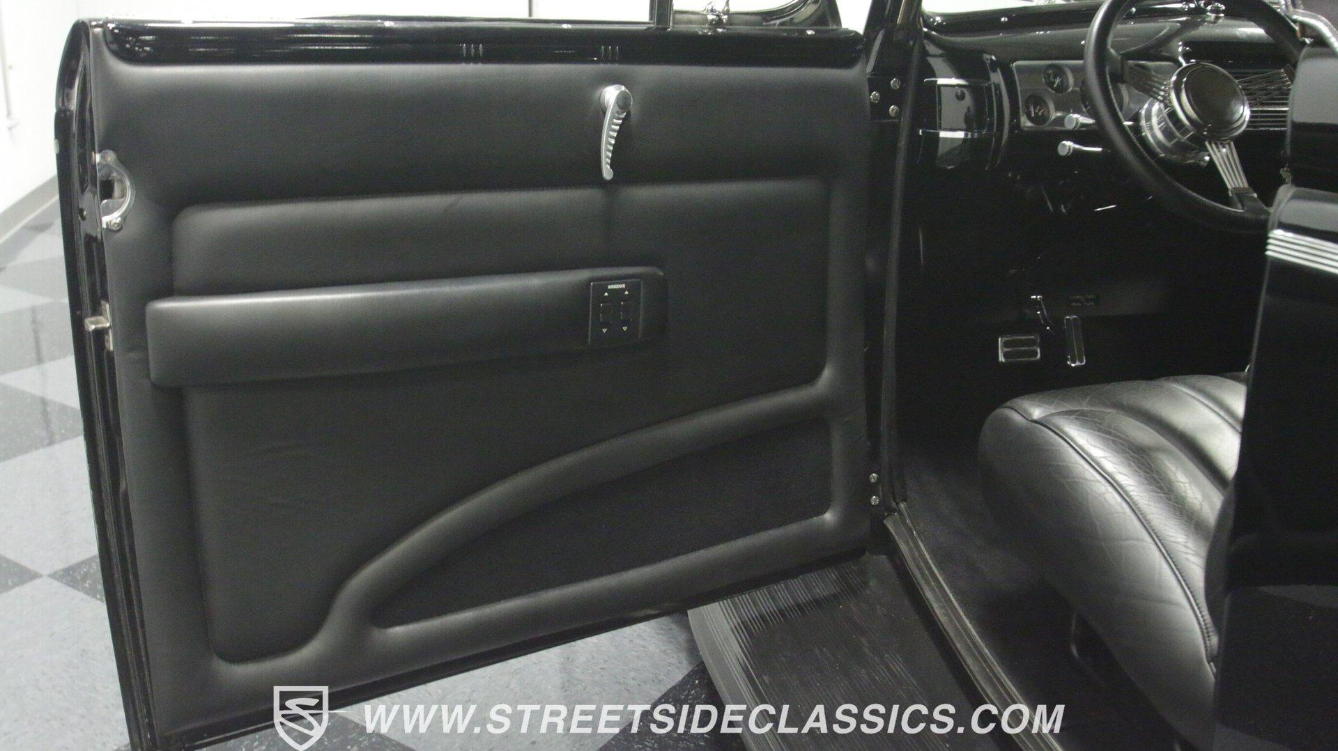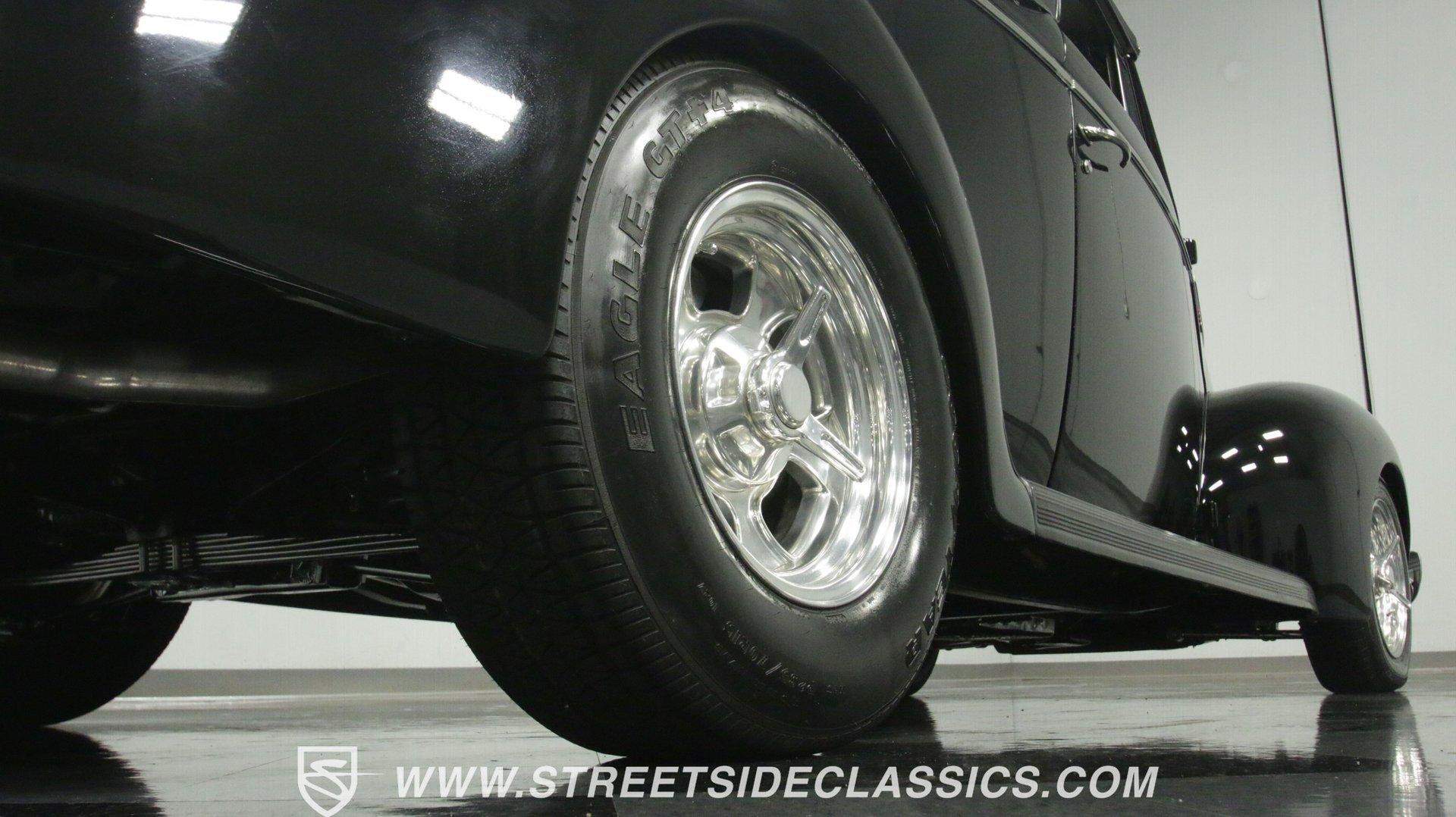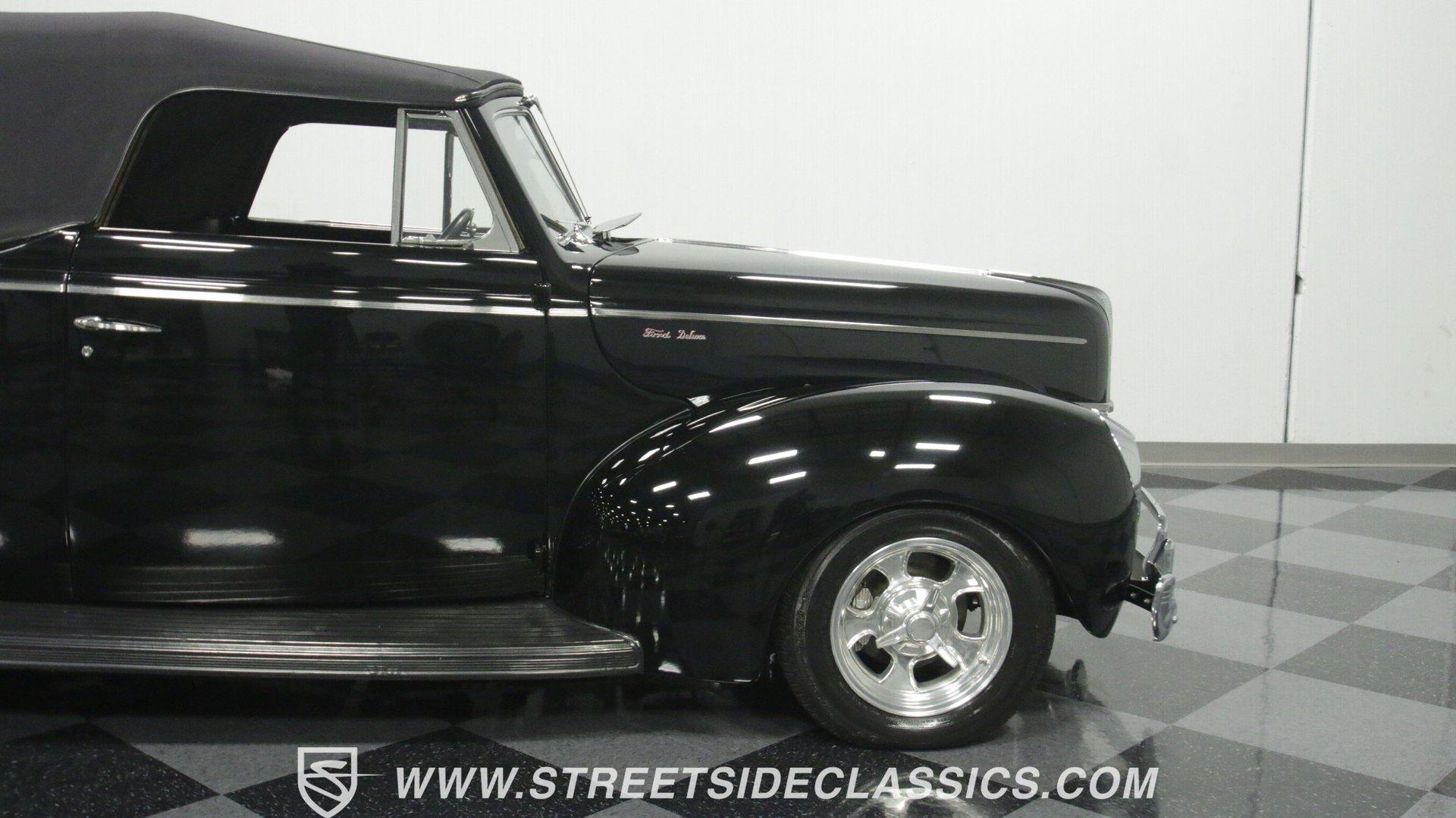 This show-stopping, sinister 1940 Ford Deluxe Convertible is the epitome of a grown-up hotrod. No gaudy flames, no goofy body mods, no obnoxious exhaust, just a show-quality custom build that likely cost thousands more than the asking price that delivers a professional level of performance and curb appeal. With a powerful 350 V8 under the hood, an upgraded sports suspension featuring power 4-wheel disc brakes, a luxurious black leather interior, and a super-slick, steel body covered in gallons of elegant black paint, this all-time favorite hotrod was built to show-or-go, and it does it all in a very BIG way. Everybody loves the iconic 1940 Ford, so much so that they're still cranking out fiberglass replicas today. Fortunately, this one has a steel body and fenders, so it feels incredibly substantial and was put together by professionals so it looks loads better than it did when it was new. The pointed hood and grille are icons in the hobby and despite the amazing build and practically flawless performance of this car, they decided to keep things low-key and let the paint do all the talking. When it comes to a black finish, you better ensure the body is laser-straight and free of flaws because dark colors are very unforgiving when it comes to poor prep-work, and it's obvious the builders spent countless hours getting this one lined up just right. It's been driven and enjoyed since the restoration was completed, so it's no longer perfect, but any imperfections are very minor and can barely be seen by the naked eye. The miles-deep, shiny black finish accentuates the Ford's generous curves without hiding anything, and the traditional color will never look dated and always bring out the crowds. That's good news, because fit and finish are fantastic as well, with excellent gaps and a spectacular luster that should most of the trophies at your local car show. They didn't shave or chop anything, and the original brightwork and trim was restored and reinstalled, so it looks like a 1940 Ford in every way. Stock chrome bumpers fore and aft, teardrop headlights, and chevron-style taillights all give this Ford a very high-quality look and feel, and it looks slick-as-can-be with the top up or down. Open those long, heavy doors and take a look inside where the stunning black leather interior is essentially a work of art. Subtle and sophisticated, it was custom crafted to maximize space inside, so just about anyone can get comfortable behind the wheel or in the passenger's seat. The black leather hides are almost completely unmarked (other than a few minor comfort marks), and the supportive bucket seats up front and matching rear seat in the back make this '40 Ford all-day comfortable for the whole crew. Sculpted door panels integrate billet door handles and modern power window switches, plush black carpets line the floors and insulate things inside, and the dash was beautifully painted to match and really pops thanks to those chrome accents. A custom chrome bezel houses a host of VDO gauges ahead of the driver, and they do a great job keeping an eye on the motor up ahead while still giving the cabin a very 1940s look. The leather-wrapped, banjo-style steering wheel feels great in the hands of the driver, and thanks to the tilt column it can be adjusted to accommodate just about anyone, and even the billet pedals were carefully selected to match the theme of the interior. A Lokar shifter manages the automatic transmission below, and there's a beautifully stitched black cloth convertible top that's power-actuated and seals up the cabin from the outside world. Out back, the spacious trunk was lined with plush black carpets to match the cabin, and there's plenty of room inside to account for most travel plans. Under all that chrome, there's a 350 cubic inch V8, chosen specifically because of its low demands for the new owner. Plenty powerful, it's a crate motor from GM Performance Parts that's reported to have been stroked to 383 cubes (although, unfortunately we don't have any paperwork to prove this claim), and with all that added horsepower and torque it moves the Ford with effortless ease. Performance parts include GM Performance heads, an Edelbrock 4-barrel carburetor, a polished aluminum intake, and long-tube headers at the flanks that make the small block extremely responsive. Just about everything you can see was polished or plated, including the finned valve covers and matching air cleaner, and the builders went to great lengths to hide all the wiring and plumbing. Backed by a TH350 3-speed automatic transmission and a swapped-in Corvette C3 rear end, it's an effortless high-speed tourer that rides and handles like a modern car, and a big aluminum radiator up front keeps the whole show nice and cool. The front suspension is all independent and features tubular A-arms with coilovers and rack-and-pinion steering, and there's a power disc brake at each corner. The frame is heavily reinforced while the custom stainless exhaust system tucks up underneath for excellent ground clearance, and it sounds amazing, too. Staggered chrome alloys with spinners carry 165/15 front and 235/70/15 rear Dunlop radials that really fill the fenders perfectly in the classic big-and-little stance. This isn't your average hotrod, but if you're an adult who is tired of the same-old, same-old at all the car shows, this stunning 1940 Ford convertible is the antidote. Call today!