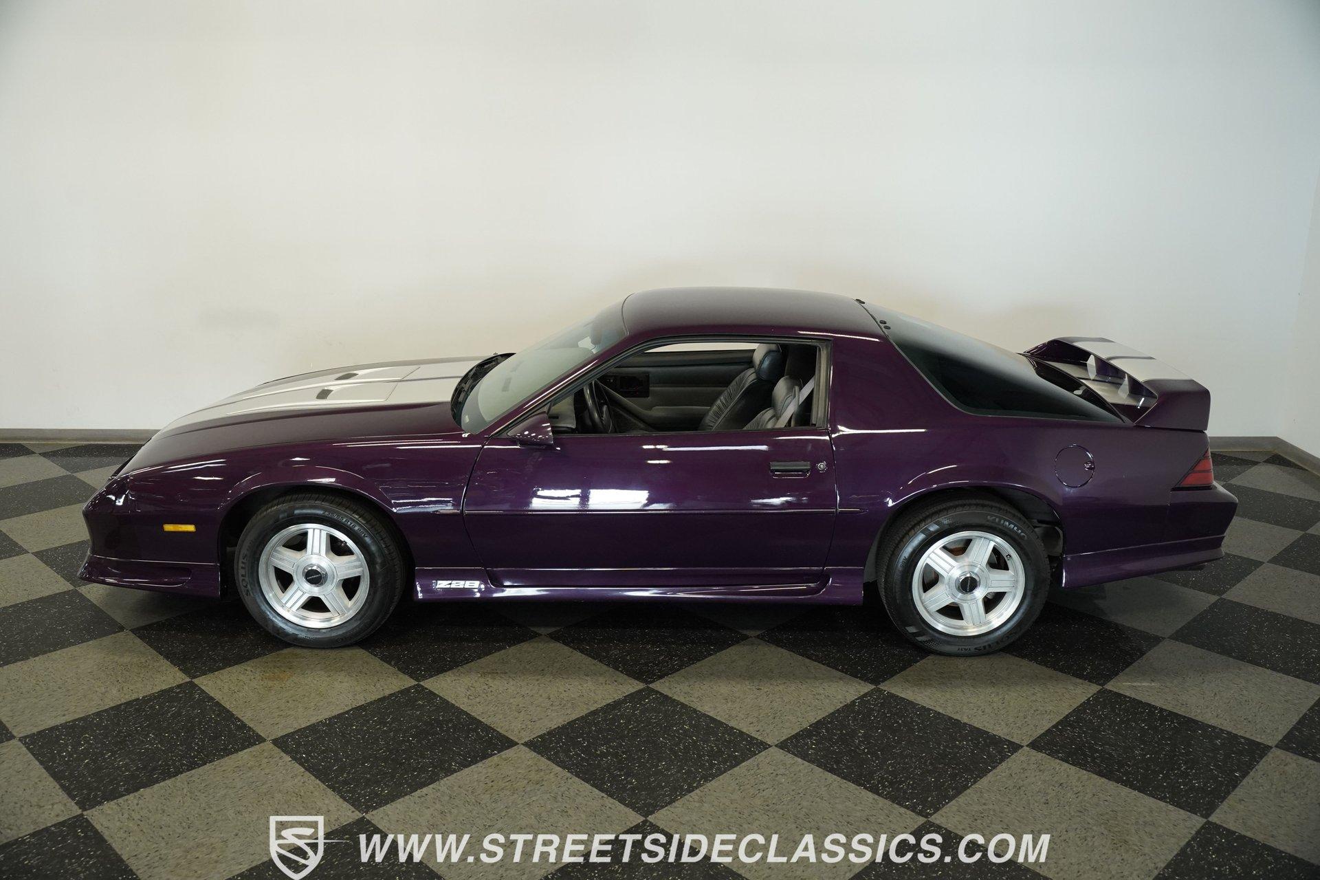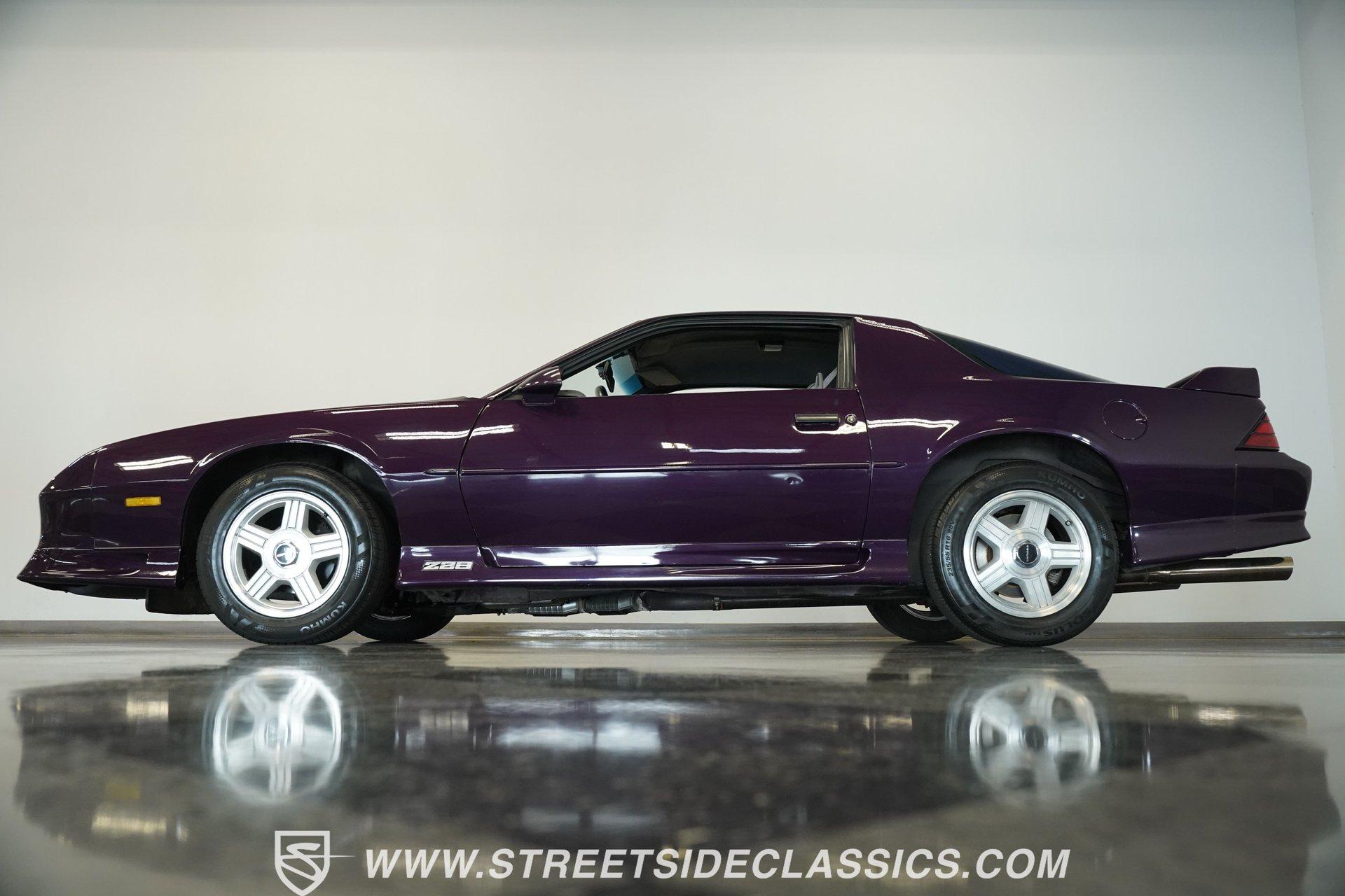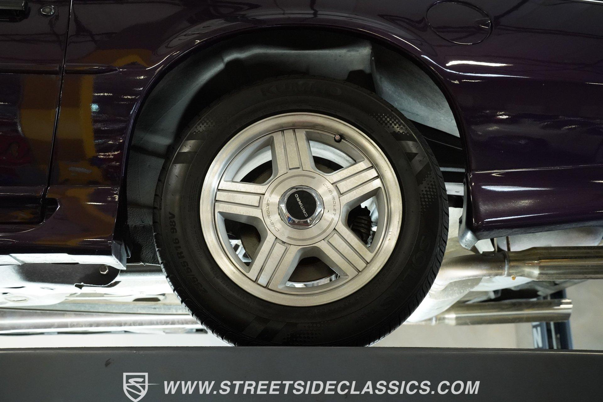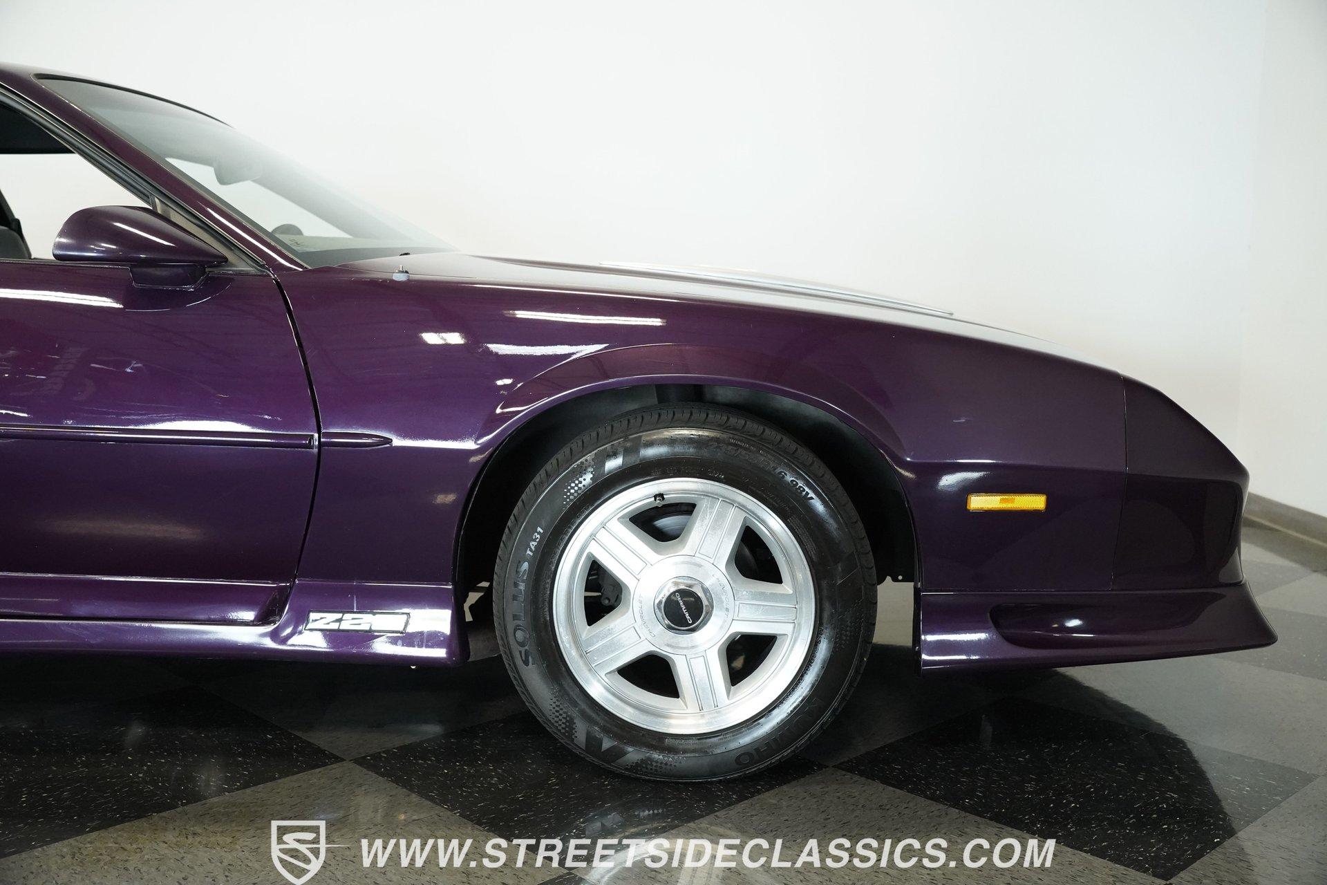 Anniversaries are meant to be celebrated. Few cars make it to the quarter-century mark, and even fewer with the style and legacy that this 1992 Chevrolet Camaro Z28 25th Anniversary brings to the table. First-gen hood and deck lid stripes, trick faux hood scoops, black headlamp pockets, and a big decklid spoiler -this third-generation Pony Car has a mere 118,912 actual miles on its odometer. Fully repainted in its factory Purple Haze Metallic, this super rare Camaro is one of just 55 offered in this color and one of only 15 to come in Purple as a hardtop, as if this anniversary model needs any more reasons to be celebrated. Inside, we find a cool grey leather interior that looks great for its age. A center console separates a pair of plush and supportive bucket seats, with the driver's seat getting power adjustment. The padded and power-assisted four-spoke steering wheel sits just forward of the original six-pod analog gauge cluster, which features a 140 mph speedometer and a 7,000 RPM tach. Reminding you of how easy driving used to be, the slider and knob HVAC controls allow simple temperature control and include functioning air conditioning. Thankfully, though, the stereo has embraced modern tech and been upgraded to a Pioneer AM/FM/CD/AUX head unit. Power locks, windows, and mirrors along with cruise control offer plenty of modern amenities for an early 1990s vehicle. A well-placed 25th Anniversary Commemorative Edition sits on the glove box door panel to remind you that this is no ordinary Z/28. Under that expansive hood, we find a 350-cubic-inch overhead-valve crate V-8 engine. With electronic fuel injection, shorty headers, and a MagnaFlow exhaust, this small block sends power to the rear wheels via a 700R4 four-speed automatic transmission and ten bolt rear end. Sixteen-inch five-spoke factory wheels wrapped in Kumho rubber complete the aggressive style this modern muscle car embodies. HIGHLIGHTS: One of 55 Painted Purple Haze Metallic One of 15 Purple Metallic Hardtops 118,912 Actual Miles Deck Spoiler Racing Stripes 350 CID V8 Crate Motor EFI Shorty Headers MagnaFlow Exhaust 700R4 Four Speed Auto Ten Bolt Rear Tubular A-Arms Tubular Factory Style Links Sway Bars Adjustable Rear Shocks Four Wheel Power Discs ABS Factory 16 Inch Wheels Power Steering Grey Leather Bucket Seats Power Driver's Seat Power Windows Power Locks Power Mirrors Air Conditioning Cruise Pioneer AM/FM/CD/AUX Head Unit Receipts This 1992 Chevrolet Camaro Z28 25th Anniversary rides on an upgraded suspension that consists of tubular upper and lower A-arms, sway bar, coils, and shocks in front and tubular factory-style links, sway bar, coils, and adjustable shocks in the rear. Power disc brakes at all four corners stand ready to scrub off speed at a moment's notice. If you've been looking for an incredibly rare Pony Car that looks as good as it goes, and is all but guaranteed not to see anywhere else, don't wait another second. Call today!