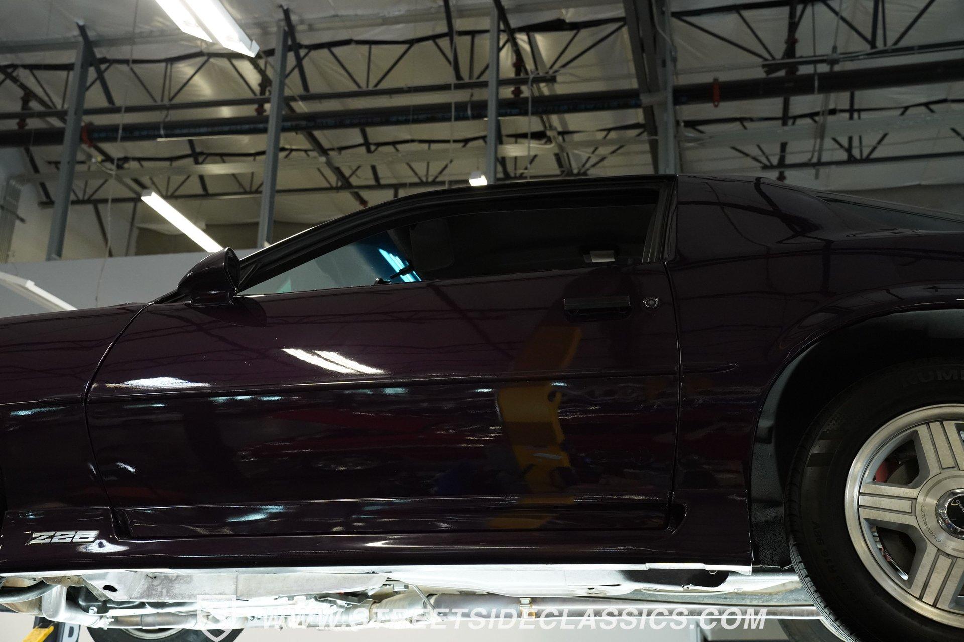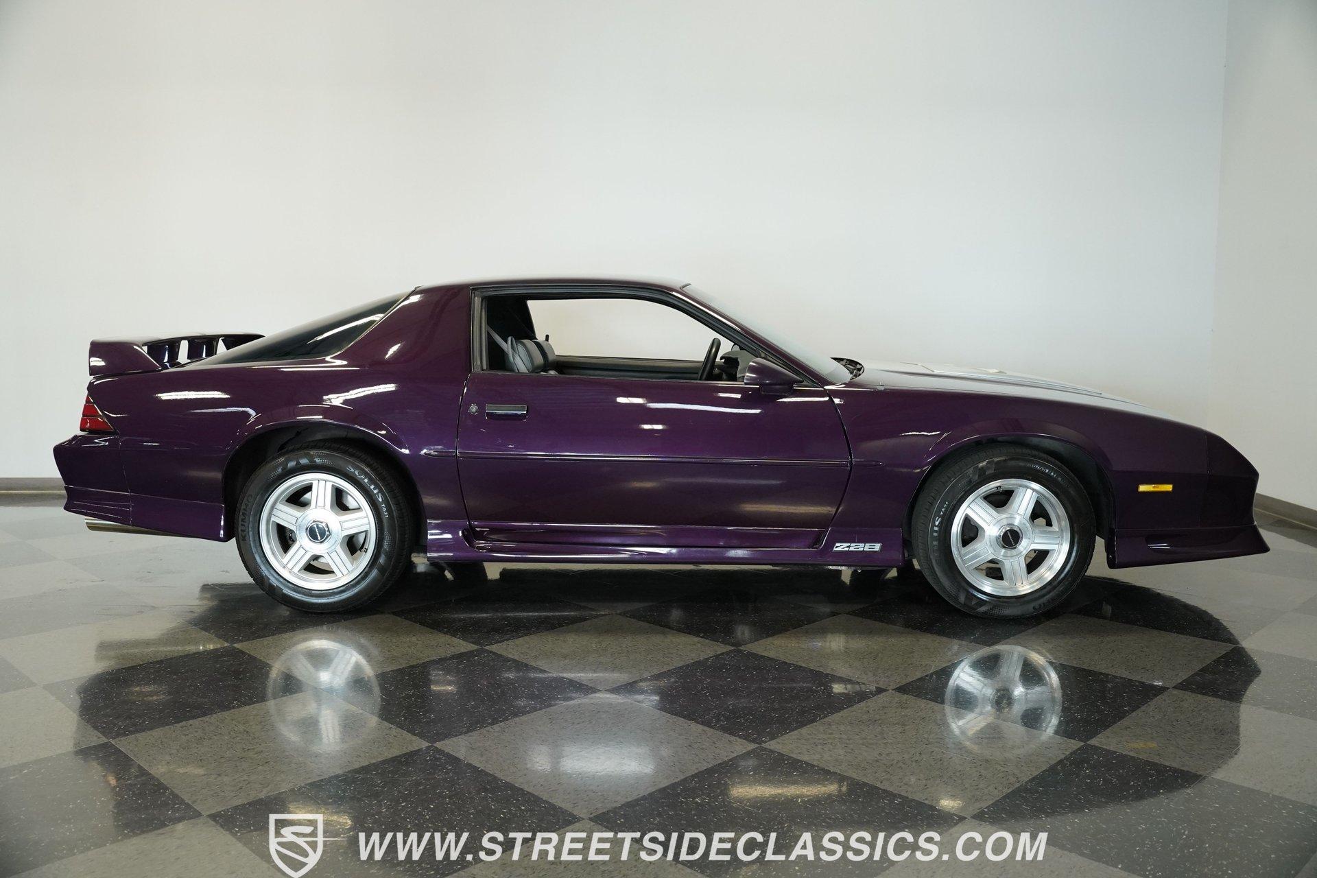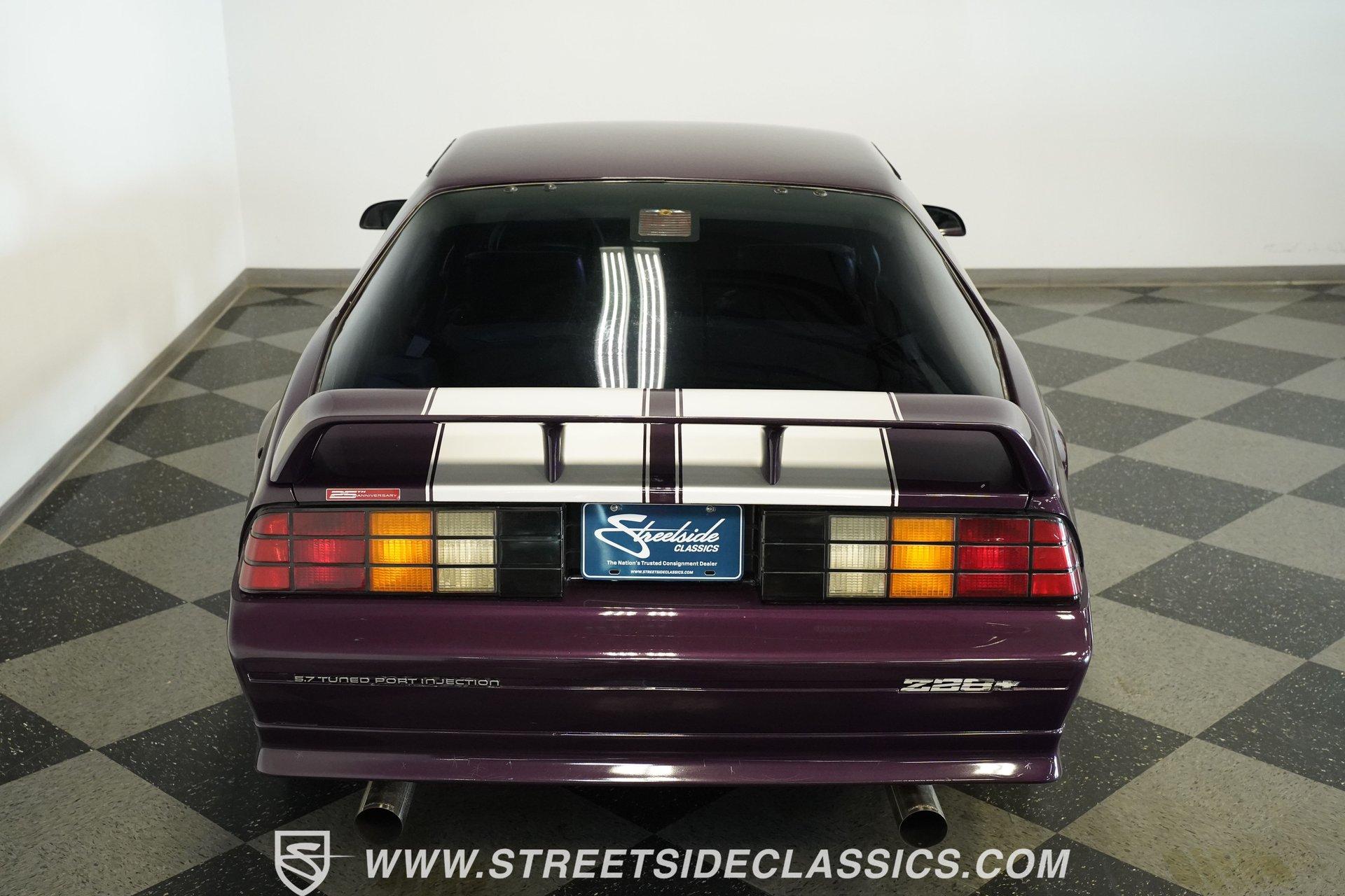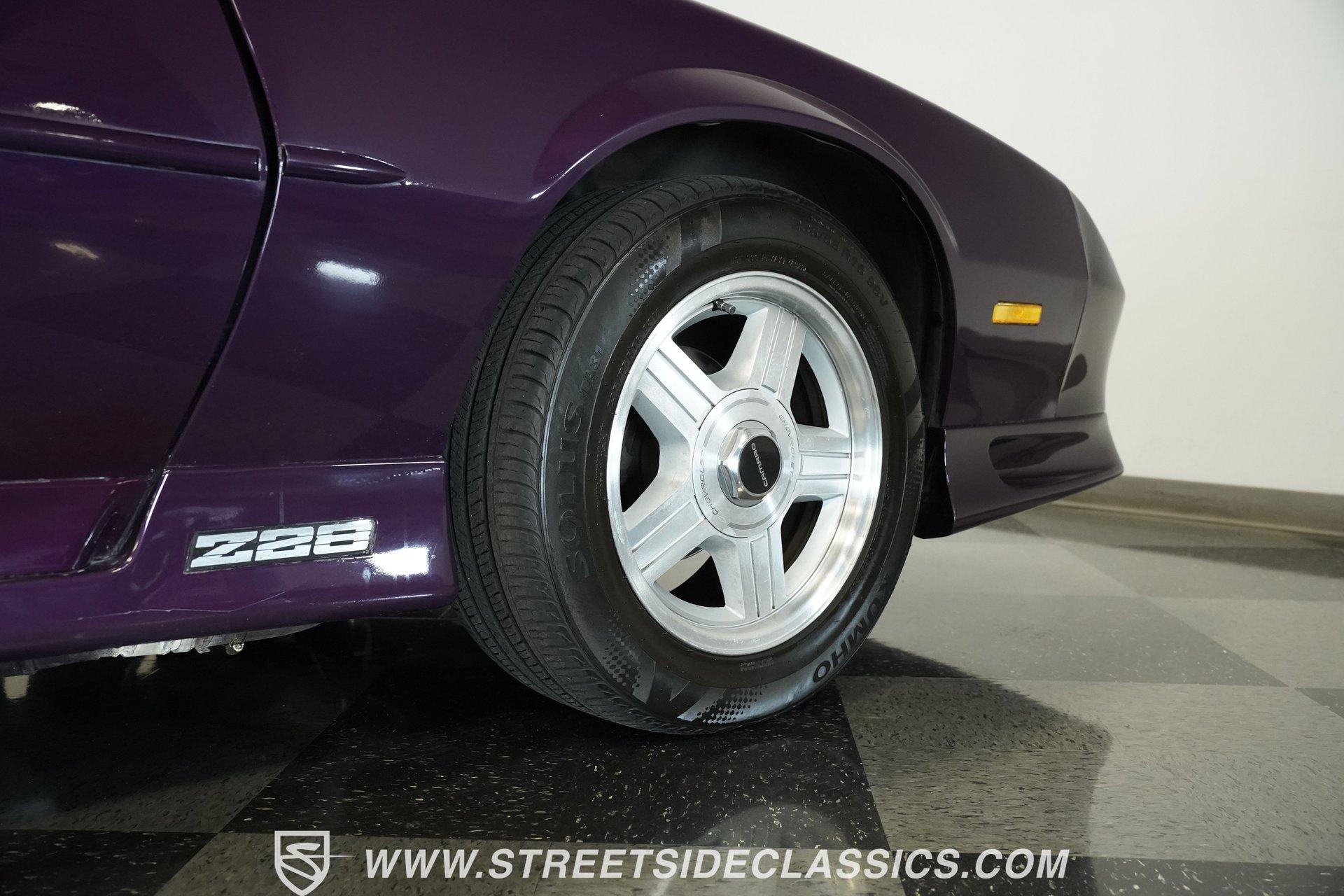 Anniversaries are meant to be celebrated. Few cars make it to the quarter-century mark, and even fewer with the style and legacy that this 1992 Chevrolet Camaro Z28 25th Anniversary brings to the table. First-gen hood and deck lid stripes, trick faux hood scoops, black headlamp pockets, and a big decklid spoiler -this third-generation Pony Car has a mere 118,912 actual miles on its odometer. Fully repainted in its factory Purple Haze Metallic, this super rare Camaro is one of just 55 offered in this color and one of only 15 to come in Purple as a hardtop, as if this anniversary model needs any more reasons to be celebrated. Inside, we find a cool grey leather interior that looks great for its age. A center console separates a pair of plush and supportive bucket seats, with the driver's seat getting power adjustment. The padded and power-assisted four-spoke steering wheel sits just forward of the original six-pod analog gauge cluster, which features a 140 mph speedometer and a 7,000 RPM tach. Reminding you of how easy driving used to be, the slider and knob HVAC controls allow simple temperature control and include functioning air conditioning. Thankfully, though, the stereo has embraced modern tech and been upgraded to a Pioneer AM/FM/CD/AUX head unit. Power locks, windows, and mirrors along with cruise control offer plenty of modern amenities for an early 1990s vehicle. A well-placed 25th Anniversary Commemorative Edition sits on the glove box door panel to remind you that this is no ordinary Z/28. Under that expansive hood, we find a 350-cubic-inch overhead-valve crate V-8 engine. With electronic fuel injection, shorty headers, and a MagnaFlow exhaust, this small block sends power to the rear wheels via a 700R4 four-speed automatic transmission and ten bolt rear end. Sixteen-inch five-spoke factory wheels wrapped in Kumho rubber complete the aggressive style this modern muscle car embodies. HIGHLIGHTS: One of 55 Painted Purple Haze Metallic One of 15 Purple Metallic Hardtops 118,912 Actual Miles Deck Spoiler Racing Stripes 350 CID V8 Crate Motor EFI Shorty Headers MagnaFlow Exhaust 700R4 Four Speed Auto Ten Bolt Rear Tubular A-Arms Tubular Factory Style Links Sway Bars Adjustable Rear Shocks Four Wheel Power Discs ABS Factory 16 Inch Wheels Power Steering Grey Leather Bucket Seats Power Driver's Seat Power Windows Power Locks Power Mirrors Air Conditioning Cruise Pioneer AM/FM/CD/AUX Head Unit Receipts This 1992 Chevrolet Camaro Z28 25th Anniversary rides on an upgraded suspension that consists of tubular upper and lower A-arms, sway bar, coils, and shocks in front and tubular factory-style links, sway bar, coils, and adjustable shocks in the rear. Power disc brakes at all four corners stand ready to scrub off speed at a moment's notice. If you've been looking for an incredibly rare Pony Car that looks as good as it goes, and is all but guaranteed not to see anywhere else, don't wait another second. Call today!