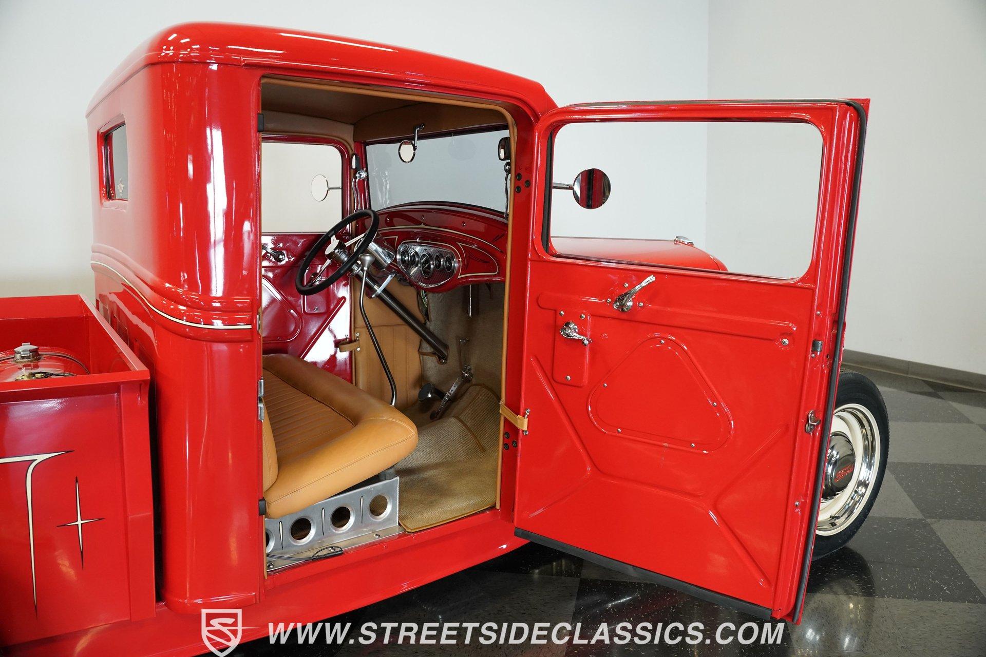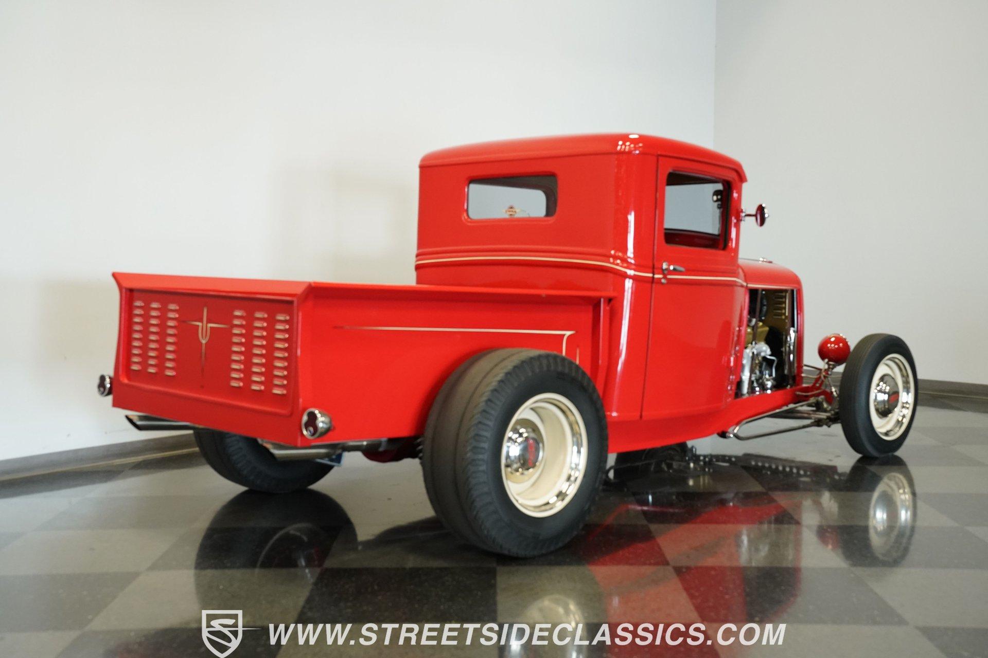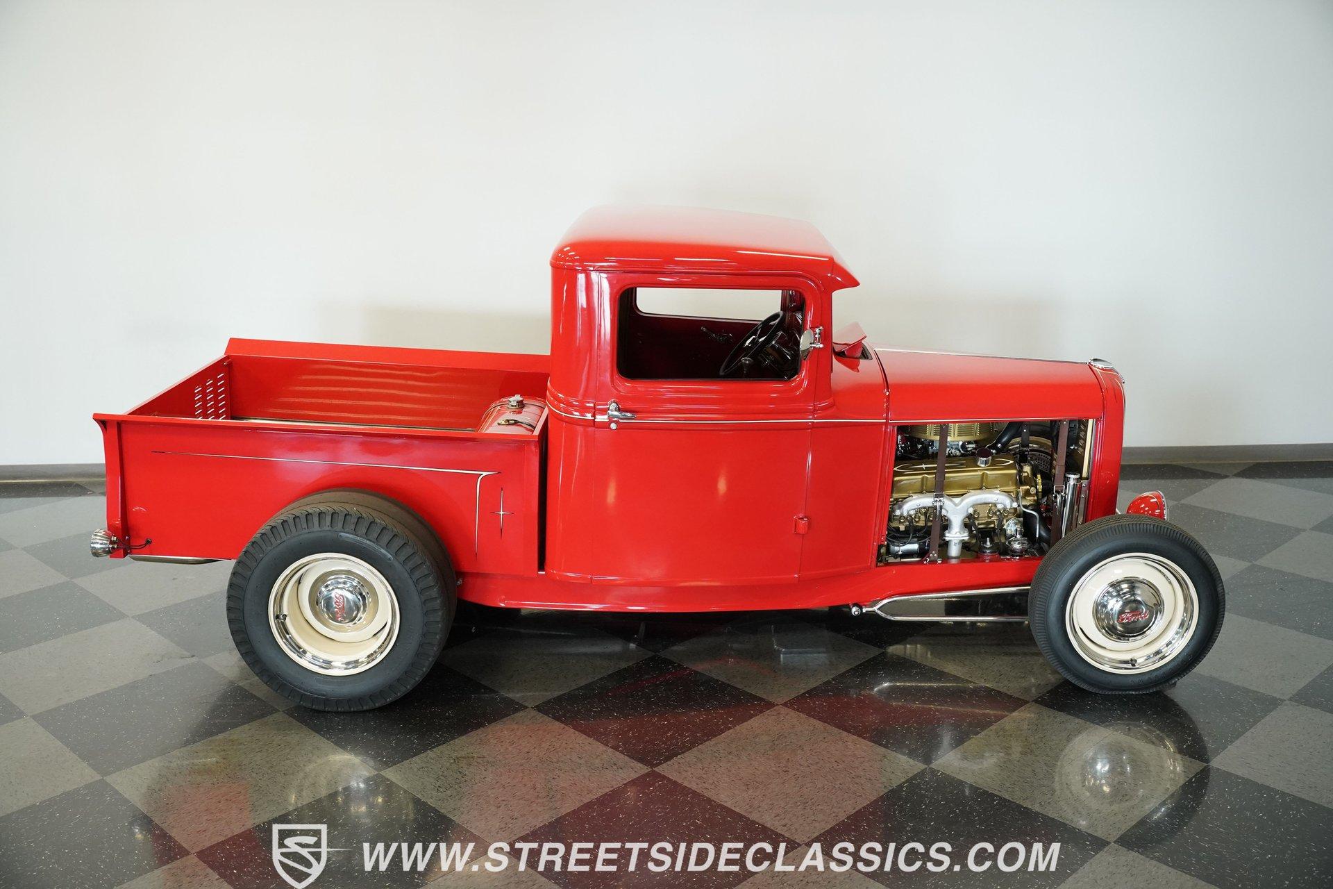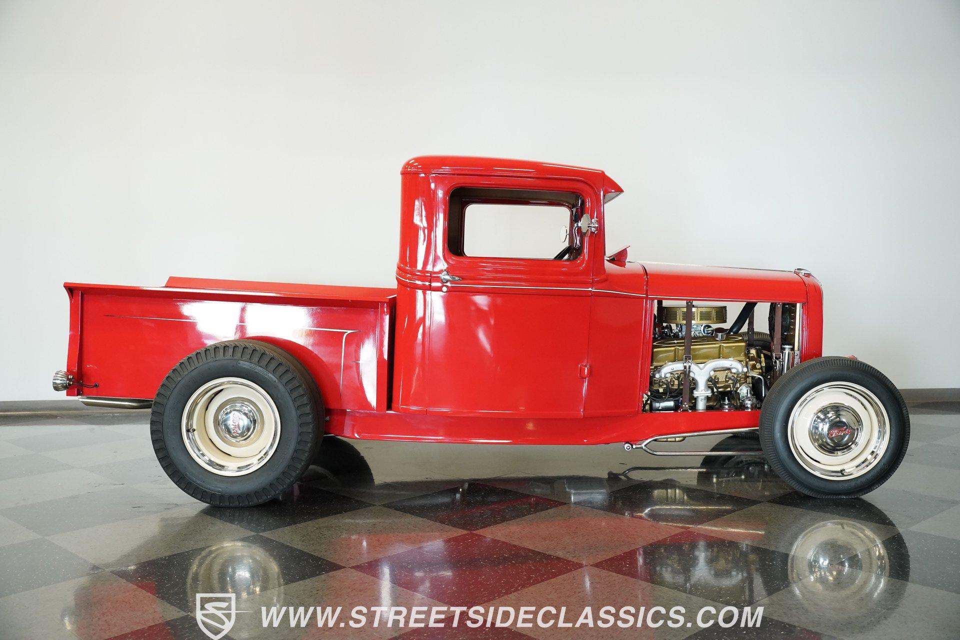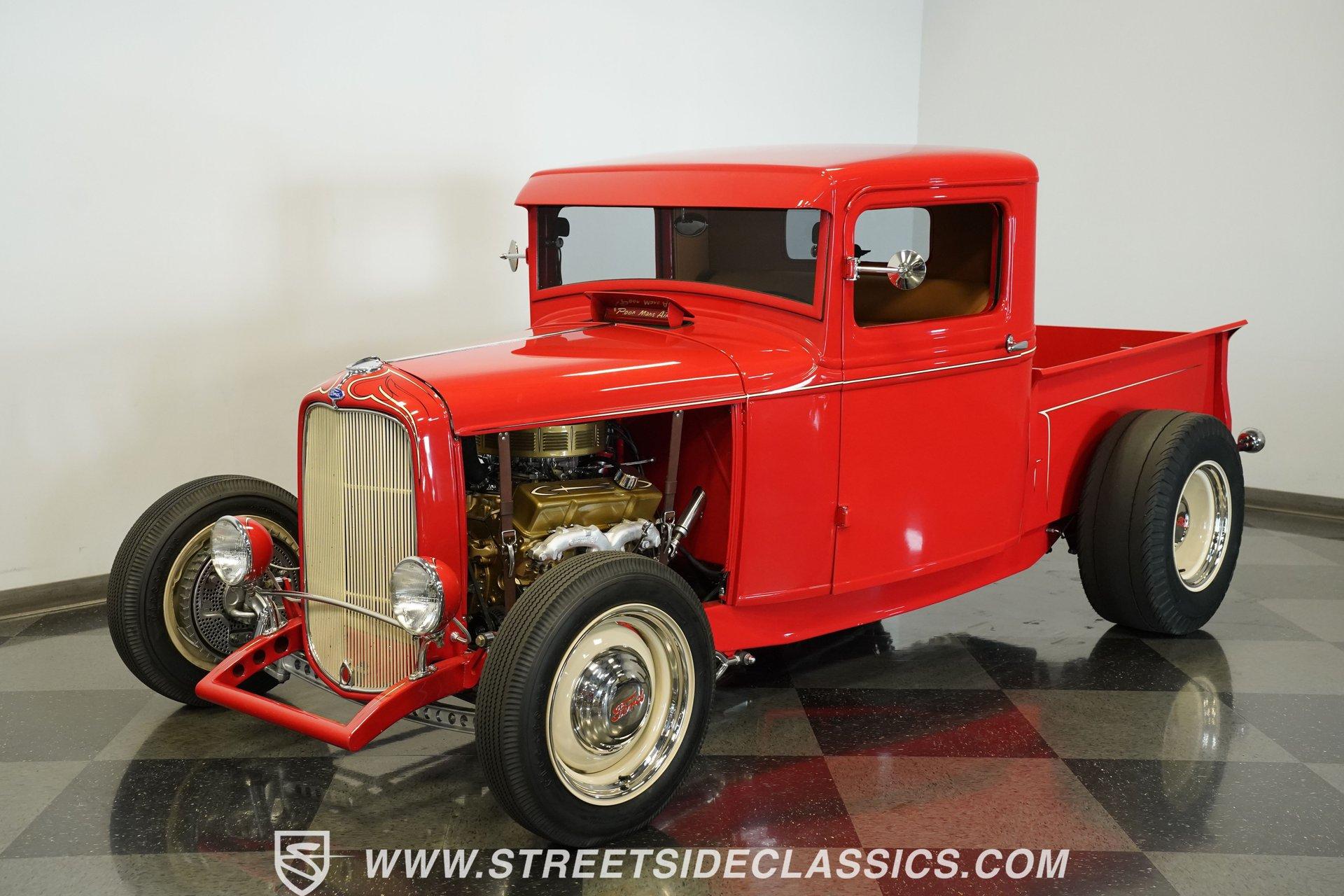 Even in basic form, its singularly striking appearance would be plenty to make this 1932 Ford Pickup Streetrod a constant conversation piece, but the skilled professionals charged with its build obviously weren't the complacent types. Inside and out, this stellar streetrod is a rolling example of aftermarket automotive awesomeness. Featuring sturdy, all-steel construction, its cab has been chopped by four inches and is dressed in bright red paint, and ornamented with hand-applied pinstripes, a combination that's sure to impress, even under the closest scrutiny. With narrow front wheels that give way to beefy racing slicks in back, and a tastefully lowered carriage, this vintage Ford is a lock to turn heads wherever it goes, while also featuring a level of drivability and craftsmanship you don't always see in this segment. Its stellar interior is another high point, featuring a tan bench seat with precise stitching and plenty of padding for even longer journeys that this classic Ford, with its strong running condition, will have no problem embarking upon. A closer look will reveal that the intricate exterior pinstriping carries into the painted steel surfaces of the cabin, and the brightly chromed door handles and window cranks really pop against this immaculate background. A Lokar shifter is positioned just in front of the seat, standing by to put this ride through its paces, and the assembly of Stewart Warner gauges recessed into the instrument panel is accompanied by a column-mounted tachometer to keep tabs on motoring functions. In back, the mahogany-lined bed reflects the same high standards applied to the rest of this truck's build. This streetrod has been configured not only to provide plenty of power, but also for a confidence-inspiring driving experience. The 350-cubic-inch V8 that anchors its drivetrain is fed by an Edelbrock 4-barrel carburetor, sitting atop an intake manifold by the same manufacturer, and runs smoothly, teaming with a rock-solid 3-speed automatic TH350 that shifts with no issues at all. Up front, a sizable aluminum radiator has been paired with dual electric fans to keep operating temperatures in check and sits under a custom shroud that adds a striking visual element beneath the hood. With a custom suspension at both ends, this classic Ford offers a refined ride that will make you look forward to getting behind the wheel at every opportunity. HIGHLIGHTS ONLY 2786 MILES ON THIS EXACTING BUILD 350-CUBIC-INCH V8 ENGINE EDELBROCK 4-BARREL CARBURETOR AND INTAKE MANIFOLD ALUMINUM RADIATOR, WITH DUAL ELECTRIC FANS 3-SPEED AUTOMATIC TH350 TRANSMISSION DUAL EXHAUST, WITH GLASSPACK STYLE MUFFLERS FULLY CUSTOM SUSPENSION SYSTEM AT BOTH ENDS 16" WHEELSMITH WHEELS HIGH-IMPACT RED EXTERIOR STURDY, ALL-STEEL CONSTRUCTION TINTED GLASS WINDOWS OUTSTANDING, FULLY-CUSTOM INTERIOR BENCH SEATING FLOOR SHIFTER Cruising on a set of powder-coated Wheelsmith steel wheels that position 4.5" wide Firestone Deluxe Champion tires in front and stout 10" wide Firestone Dragster slicks in back, this 1932 Ford Pickup Streetrod features a level of craftsmanship that must be seen in person to be fully appreciated. Call today!