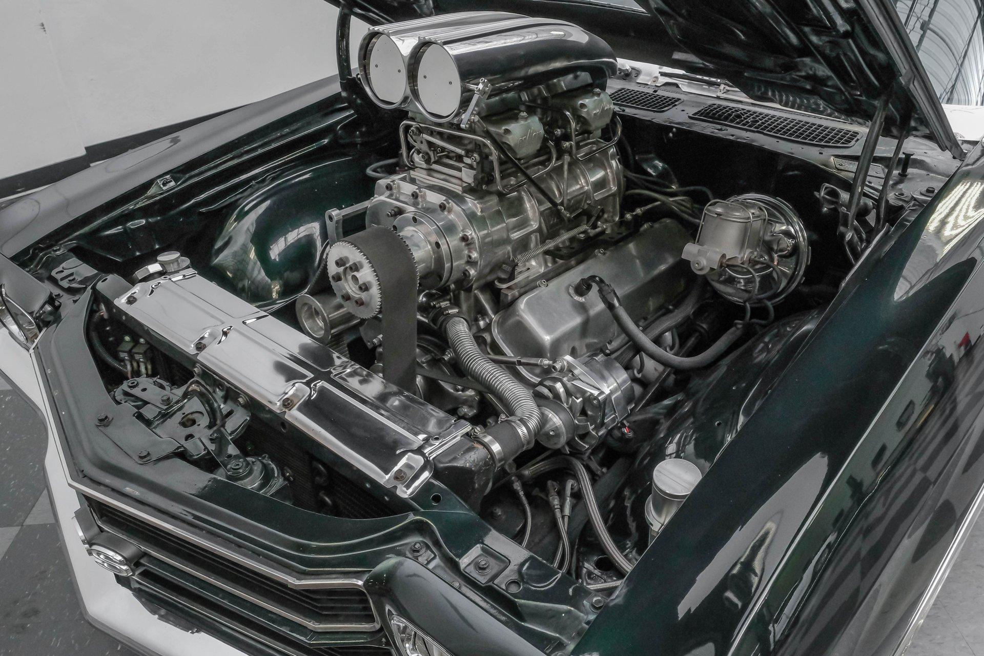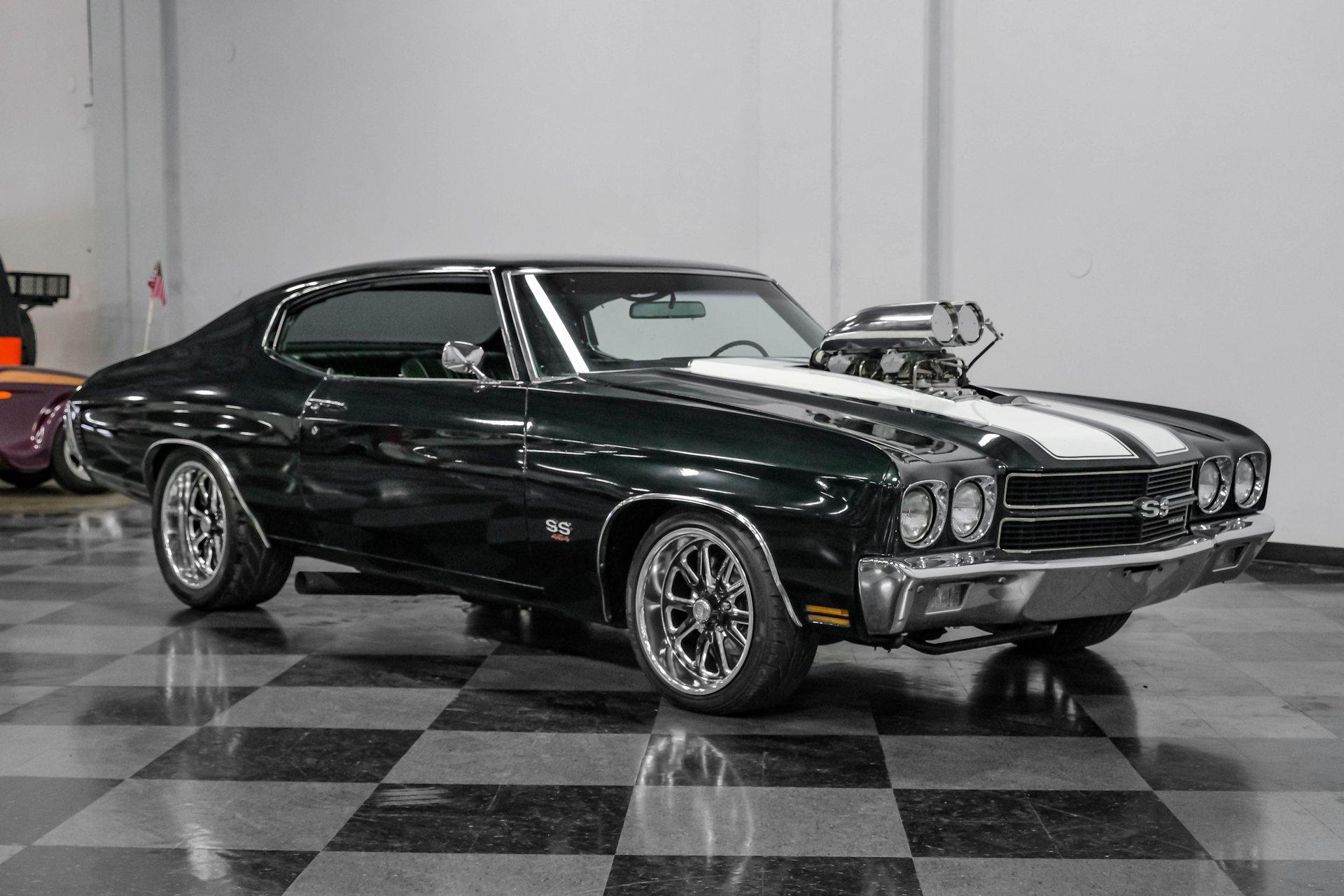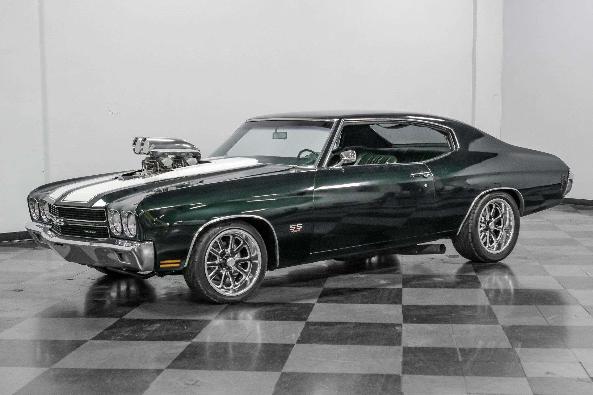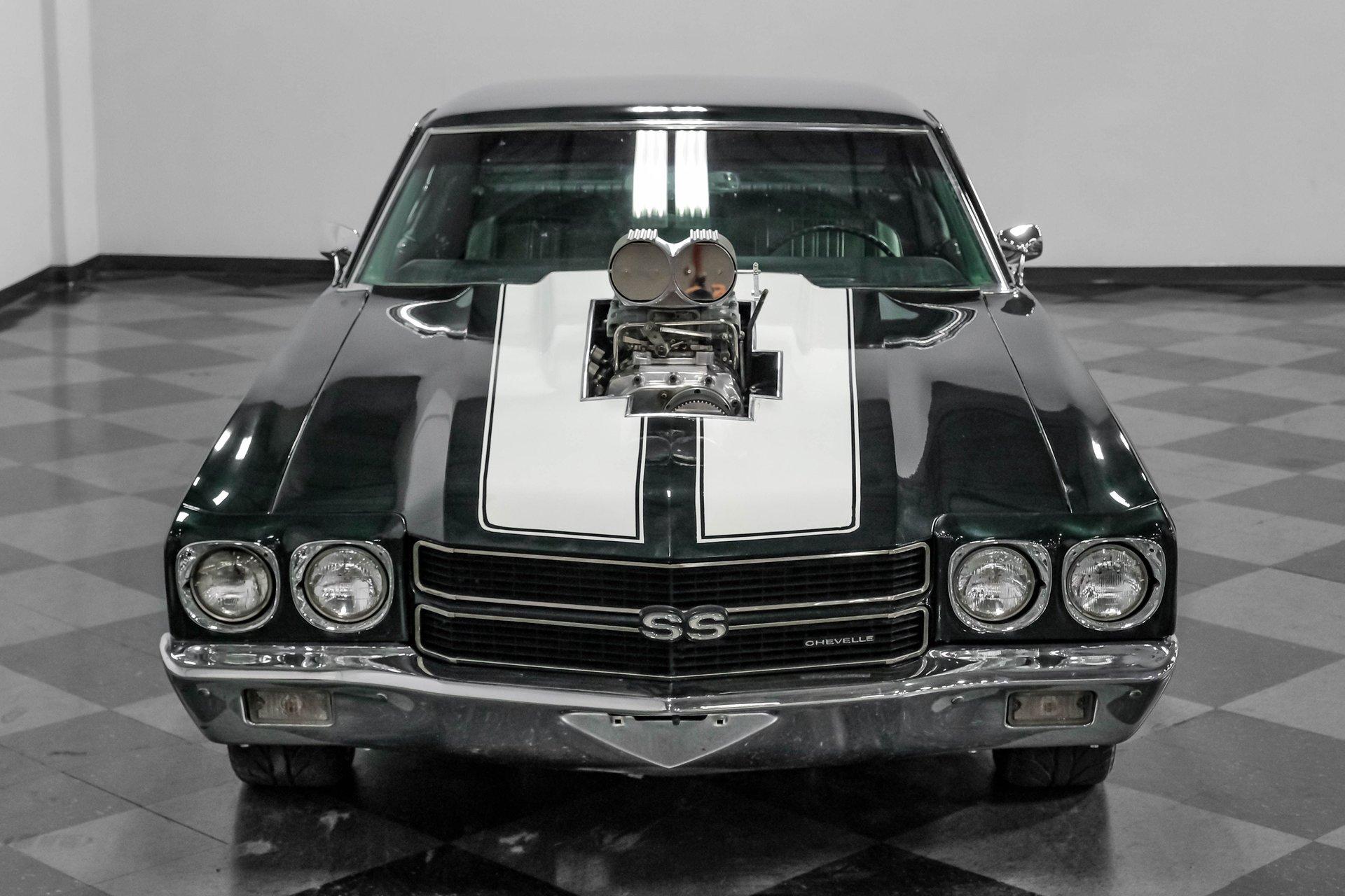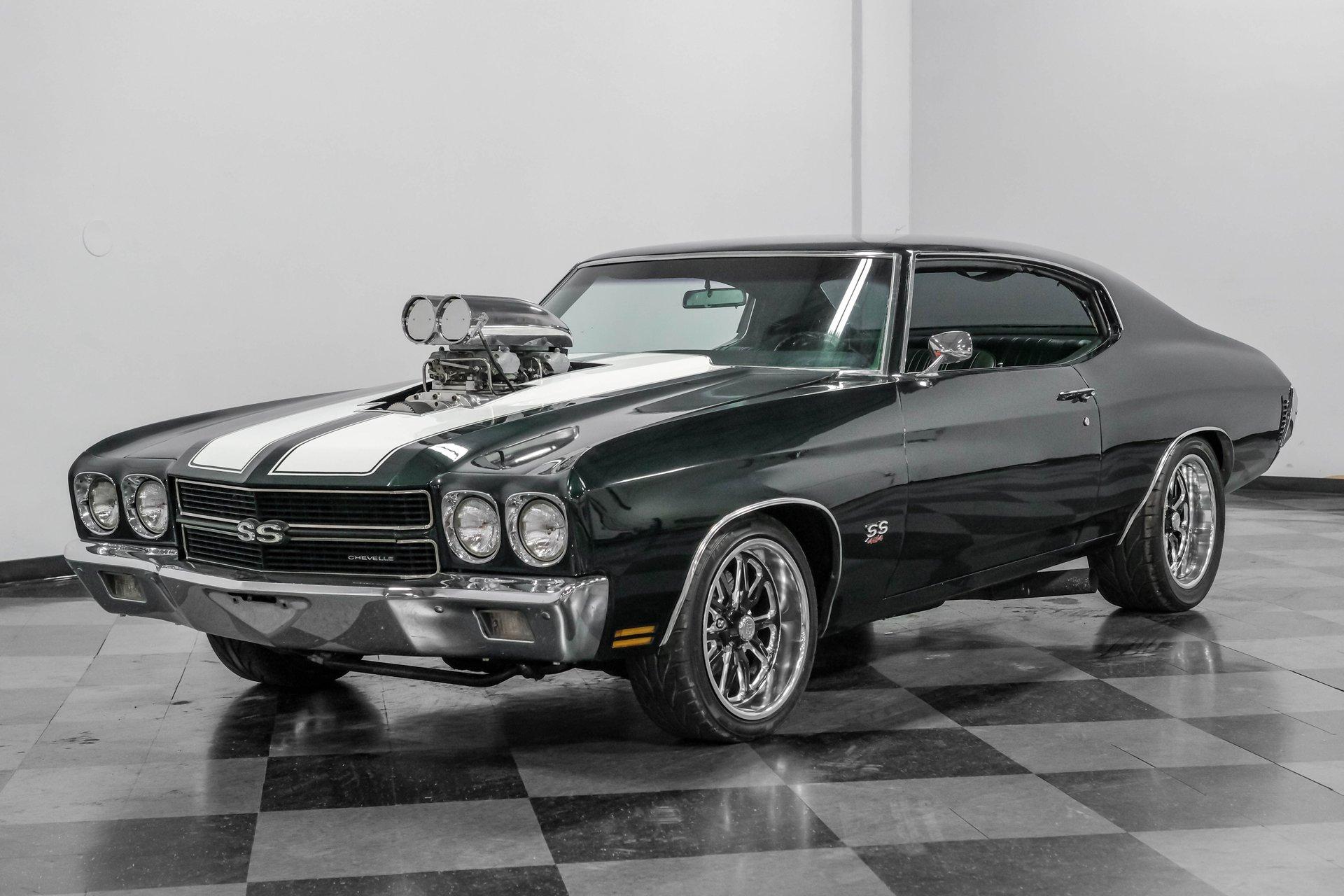 Experience the thrill of owning a true American muscle legend with this supercharged 1970 Chevrolet Chevelle SS Tribute. This iconic car represents the spirit of power and performance from the golden era of muscle cars, evoking memories of roaring engines and adrenaline-fueled drives. It's more than just a vehicle; it's a statement of passion and craftsmanship. With its aggressive stance and supercharged heart, this Chevelle commands attention wherever it goes. Imagine the exhilaration of driving a car that boasts an estimated 1200 horsepower on 110 fuel, yet can still daily on regular pump gas! Step inside to find a classic green vinyl interior that blends vintage charm with practical upgrades. The bucket seats offer good support, complemented by a middle console with a staple-style shifter and SS gauges featuring a tachometer. A Pioneer AM/FM/CD player with auxiliary input keeps your favorite tunes flowing while the tilt steering column enhances driving comfort, and the overall cabin retains much of its original character with some tasteful modern touches. Under the hood lies a powerhouse 540 V8 supercharged engine, recently rebuilt with approximately 600 miles on the build. This beast features a Weiand 871 supercharger, Dart Big M block, Dart aluminum ported heads, Comp Rockers, a hydraulic roller blower cam, flat top pistons, Eagle crank and rods, and MSD ignition. The 3-speed automatic transmission shifts smoothly, channeling immense power through a 12-bolt rear axle with factory-style lowered suspension and Hotchkis sway bars. The front sports power disc brakes with power steering, ensuring confident handling and stopping power. Highlights Estimated 1200HP on 110 Fuel 540 V8 Supercharged Engine Approximately 600 Miles Since Rebuild Weiand 871 Supercharger Dart Big M Block Engine Dart Aluminum Ported Heads Comp Rockers Hydraulic Roller Cam Flat Top Pistons, Eagle Crank and Rods MSD Ignition System 3-Speed Automatic Transmission Power Disc Front Brakes, Power Drum Rear Factory Style Lowered Suspension Tilt Steering Column Green Vinyl Bucket Seats Pioneer AM/FM/CD Player with Aux Input Financing Available Vehicle Protection Plans Available Worldwide Shipping This 1970 Chevrolet Chevelle SS Tribute is a fantastic opportunity for muscle car enthusiasts seeking a blend of classic style and power. It's ready to impress on the street or at the show, offering a driving experience that few can match. Don't miss your chance to own this remarkable machine. Call, email, or come visit our showroom today!
