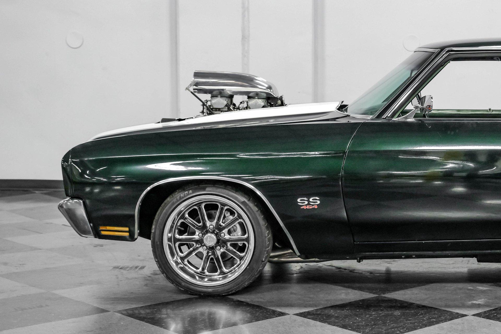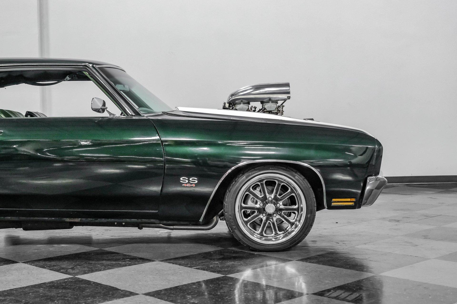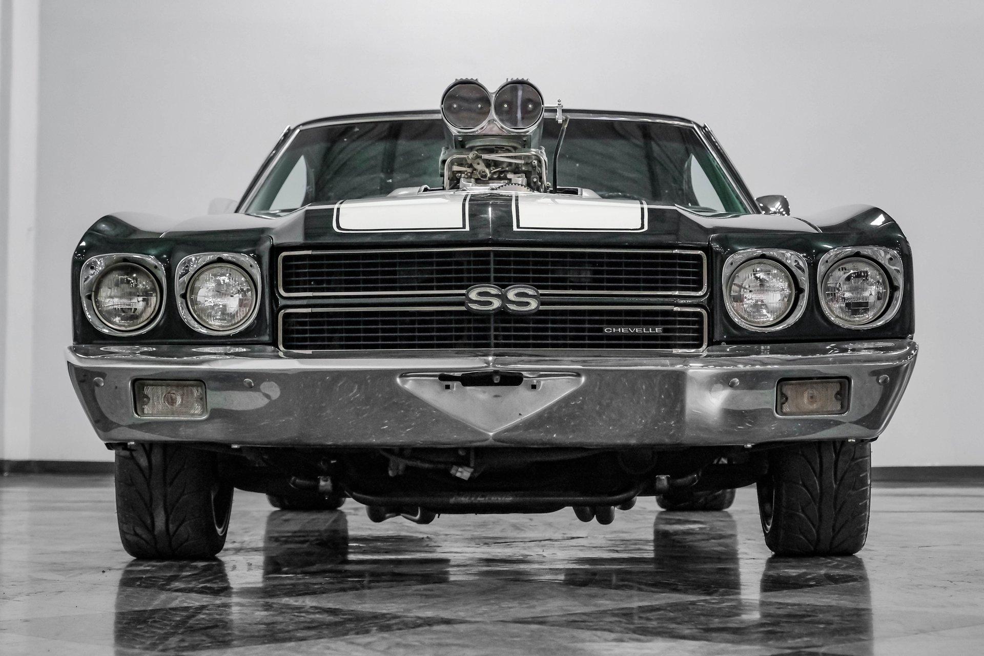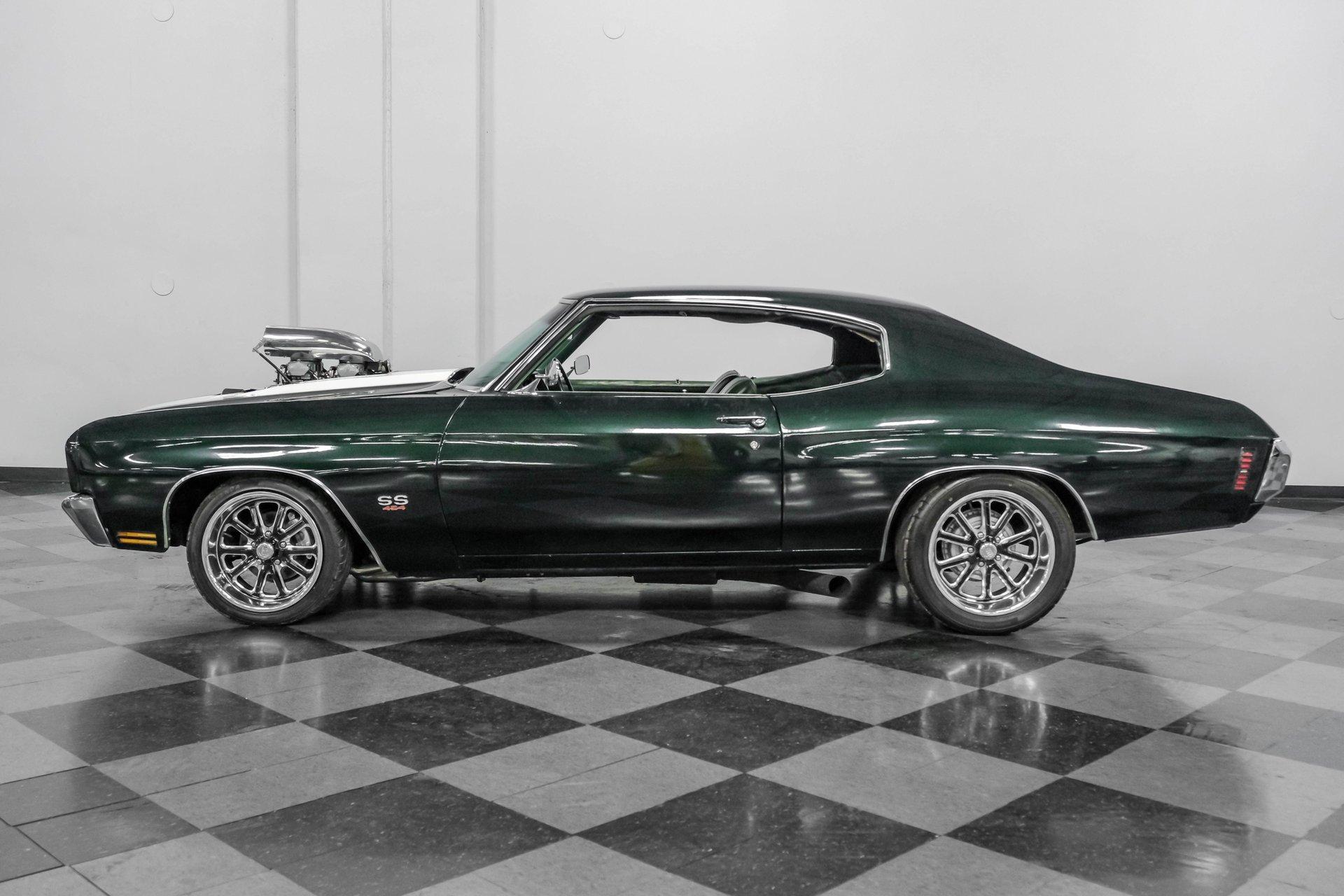 Experience the thrill of owning a true American muscle legend with this supercharged 1970 Chevrolet Chevelle SS Tribute. This iconic car represents the spirit of power and performance from the golden era of muscle cars, evoking memories of roaring engines and adrenaline-fueled drives. It's more than just a vehicle; it's a statement of passion and craftsmanship. With its aggressive stance and supercharged heart, this Chevelle commands attention wherever it goes. Imagine the exhilaration of driving a car that boasts an estimated 1200 horsepower on 110 fuel, yet can still daily on regular pump gas! Step inside to find a classic green vinyl interior that blends vintage charm with practical upgrades. The bucket seats offer good support, complemented by a middle console with a staple-style shifter and SS gauges featuring a tachometer. A Pioneer AM/FM/CD player with auxiliary input keeps your favorite tunes flowing while the tilt steering column enhances driving comfort, and the overall cabin retains much of its original character with some tasteful modern touches. Under the hood lies a powerhouse 540 V8 supercharged engine, recently rebuilt with approximately 600 miles on the build. This beast features a Weiand 871 supercharger, Dart Big M block, Dart aluminum ported heads, Comp Rockers, a hydraulic roller blower cam, flat top pistons, Eagle crank and rods, and MSD ignition. The 3-speed automatic transmission shifts smoothly, channeling immense power through a 12-bolt rear axle with factory-style lowered suspension and Hotchkis sway bars. The front sports power disc brakes with power steering, ensuring confident handling and stopping power. Highlights Estimated 1200HP on 110 Fuel 540 V8 Supercharged Engine Approximately 600 Miles Since Rebuild Weiand 871 Supercharger Dart Big M Block Engine Dart Aluminum Ported Heads Comp Rockers Hydraulic Roller Cam Flat Top Pistons, Eagle Crank and Rods MSD Ignition System 3-Speed Automatic Transmission Power Disc Front Brakes, Power Drum Rear Factory Style Lowered Suspension Tilt Steering Column Green Vinyl Bucket Seats Pioneer AM/FM/CD Player with Aux Input Financing Available Vehicle Protection Plans Available Worldwide Shipping This 1970 Chevrolet Chevelle SS Tribute is a fantastic opportunity for muscle car enthusiasts seeking a blend of classic style and power. It's ready to impress on the street or at the show, offering a driving experience that few can match. Don't miss your chance to own this remarkable machine. Call, email, or come visit our showroom today!
