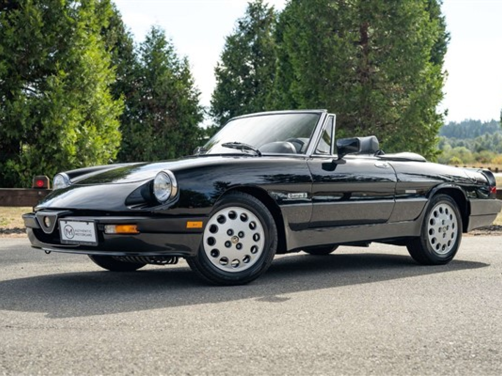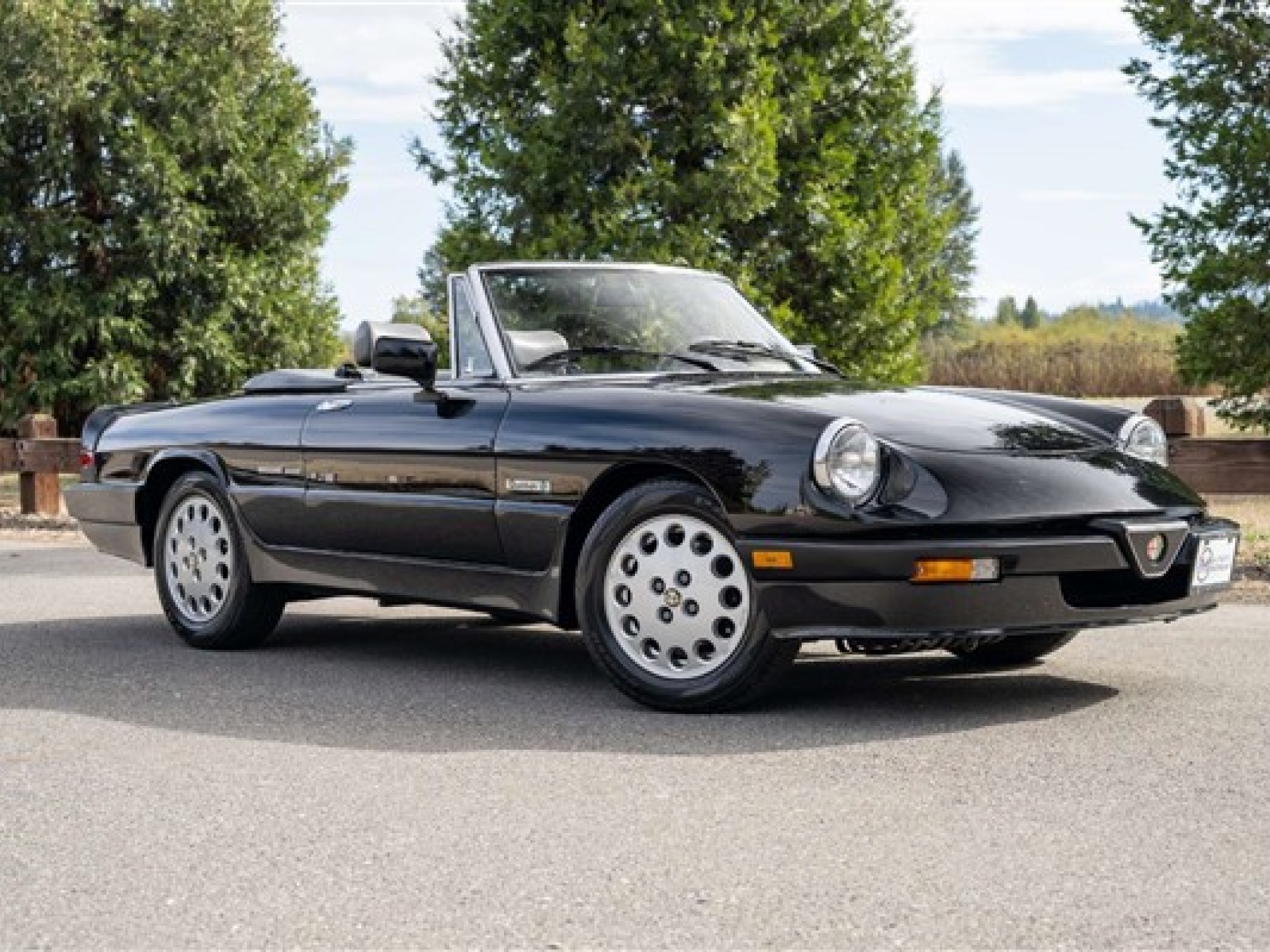This 1989 Spider was built December of 1988 in the Quadrifoglio trim level and first sold to the California area. The car has been in WA State since 1995 and the current owner purchased the car in June of 1999 with 65,000 miles from Bellevue Alfa Romeo and the car has lived in the dry climate of Eastern WA ever since. The exterior is finished in Nero (Black) over Grey leather trim, red stitching, red carpets, and black canvas soft top that was standard to all Quadrifoglio models. The car has its color matched, Pininfarina designed, removable hard top, black vinyl tonneau boot with red stitching, and 15-inch phone dial alloy wheels with colored center caps. The standard options include; reclining sport bucket seats, power windows, rear fog lamps, lighted passenger vanity mirror, Alfa branded Clarion am/fm radio cassette with 4 speakers, power antenna, digital clock, leather wrapped steering wheel, intermittent wipers, power mirrors, and full red carpeting in the trunk area. Service records from 1999 to current accompanys the car.