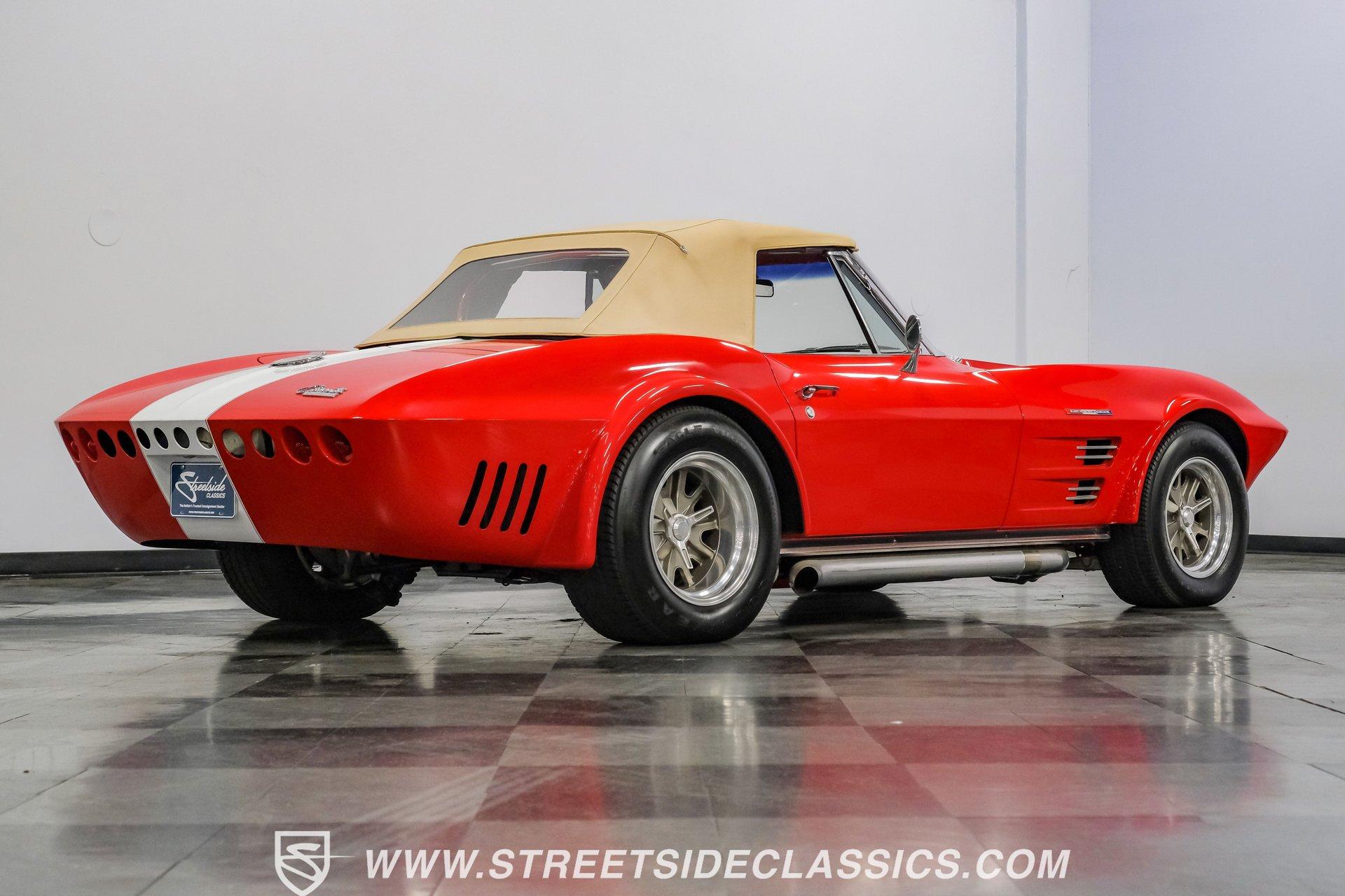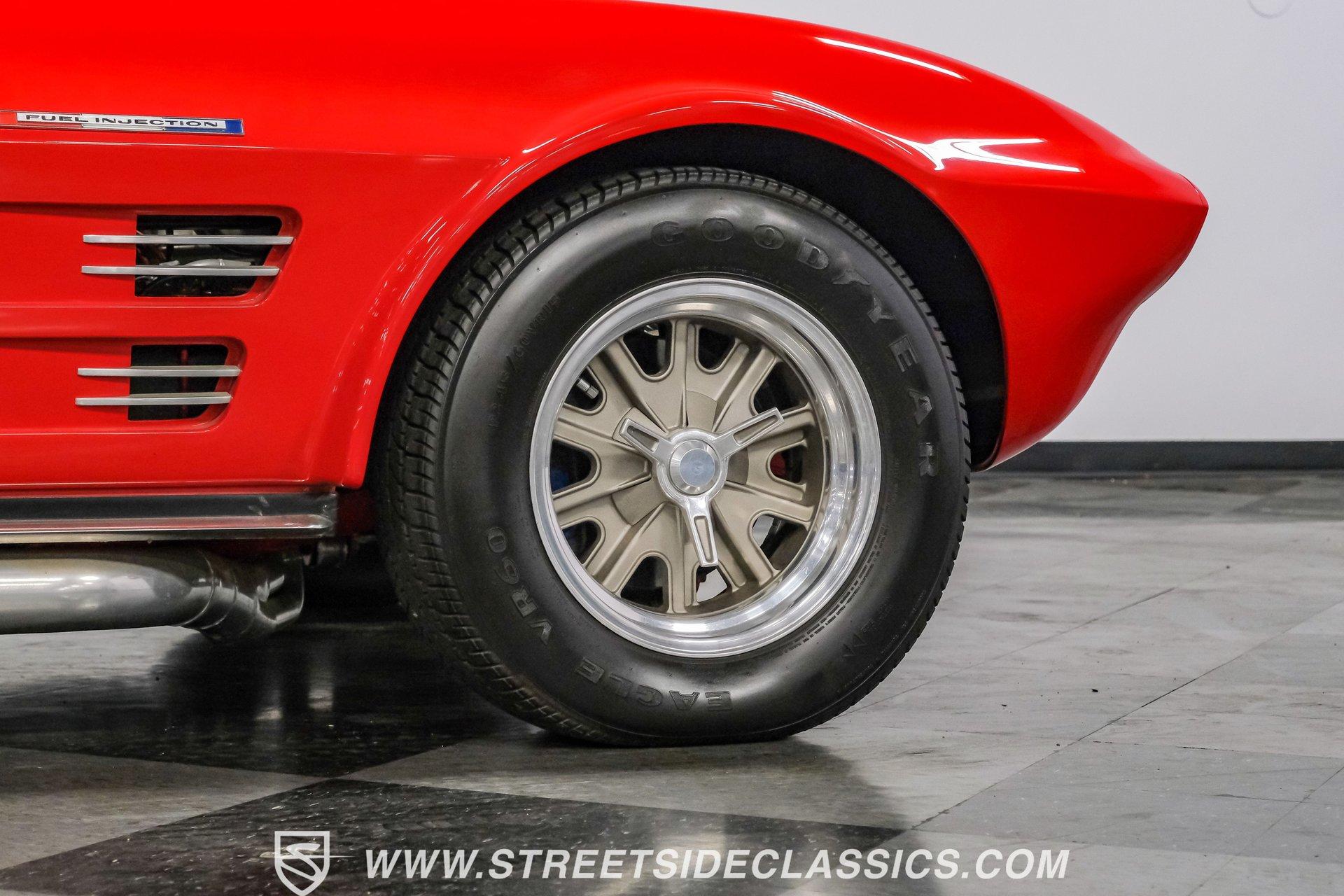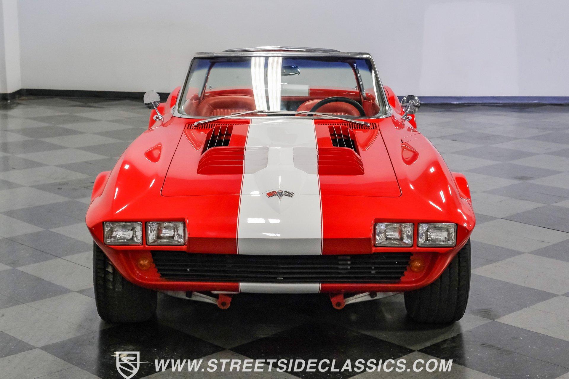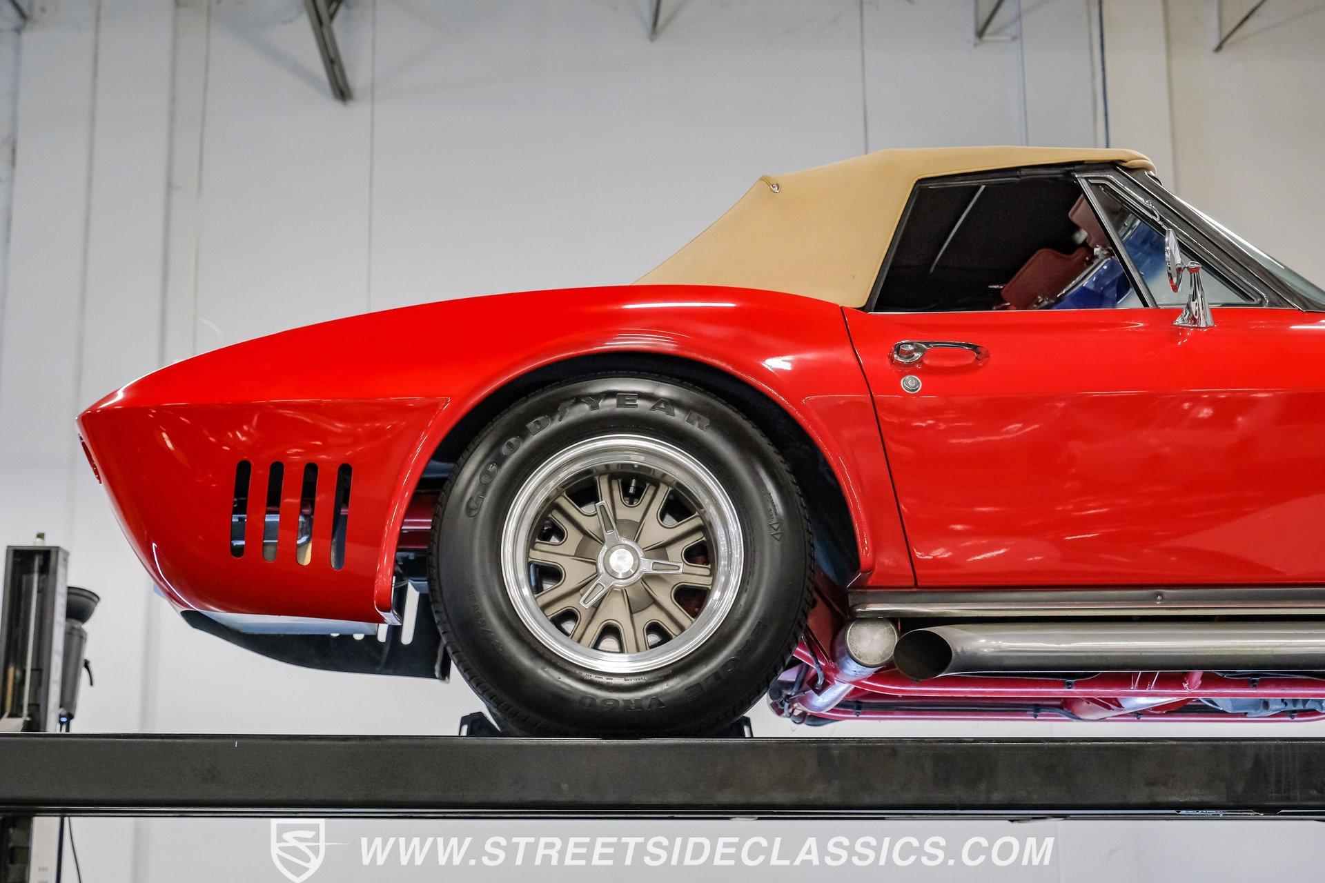 While every generation of GM's halo car has a strong argument for which one is best, the C2 is always in contention. Taking things a step further, arguably the best and most exciting version of the second-generation Corvette was the remarkable Grand Sport. That is why this 1963 Chevrolet Corvette Grand Sport Tribute had many of us stop dead in our tracks to appreciate this unique and rare ride. Sporting a custom Grand Sport nose, headlight, grille, front fenders, hood, and even a custom red powder-coated frame, this head-turning machine has been fully repainted in Riverside Red, complete with a single center white racing stripe, guaranteeing this car will be the center of attention anywhere it goes. Inside, we find a fully restored red leather interior that features even more custom parts. A chrome power-assisted wheel sits atop a custom tilt steering column, while a custom dash trim is home to a custom AutoMeter gauge cluster. A custom air conditioning control panel blow cool air through, you guessed it, custom AC outlets. A dash-mounted Audiovox AM/FM/CD head unit powers a set of concealed speakers, while the custom sound insulation makes it even easier to enjoy. Under that aggressive, louvered, front-hinged hood, we find a highly modified naturally aspirated 350 cubic-inch V-8 engine. Beginning with a Vortec block, this small block gets aluminum heads, a GM aluminum intake manifold, a single four-barrel Demon carburetor, an HEI ignition, an aluminum radiator, an electric fan, and long-tube headers feeding into those glorious-sounding side pipes. That power is routed through a Tremec TKO five-speed manual transmission before being sent out to the rear wheels. HIGHLIGHTS: Custom Red Powder Coated Frame Custom Grand Sport Nose Custom Headlights Custom Grille Custom Tail Lights Custom Rear Fenders Custom Grand Sport Hood Custom Front Fenders Full Riverside Red Repaint White Racing Stripe 350 CID V8 Vortec Block Aluminum Heads Demon Carburetor GM Aluminum Intake HEI Ignition Long Tubes Side Pipes Tremec TKO Five Speed Custom Suspension Custom A Arms Custom Front Sway Bar Adjustable Coilovers Four Wheel Power Discs Vented Rotors Rack and Pinion Power Steering Chrome Steering Wheel Custom Tilt Column Red Leather Custom AC Control Panel Billet HVAC Controls AM/FM/CD Head Unit Concealed Speaker System Custom Sound Insulation A True Head Turner For the first time in Corvette history, the C2 debuted with a fully independent suspension. This 1963 Chevrolet Corvette Grand Sport Tribute takes that sentiment and adds a custom front and rear suspension, A-arms, front sway bar, and adjustable coilovers at all four corners. A custom rack-and-pinion steering setup, along with four-wheel power disc brakes featuring vented front and rear discs, completes the performance package, ensuring this Grand Sport Tribute can live up to its namesake -stopping, going, and turning. If you were not able to get your hands on one of the five original Grand Sports made, then this is your chance to find out why so many believe this iteration of the Corvette may just be the best one yet. Don't wait, call today!