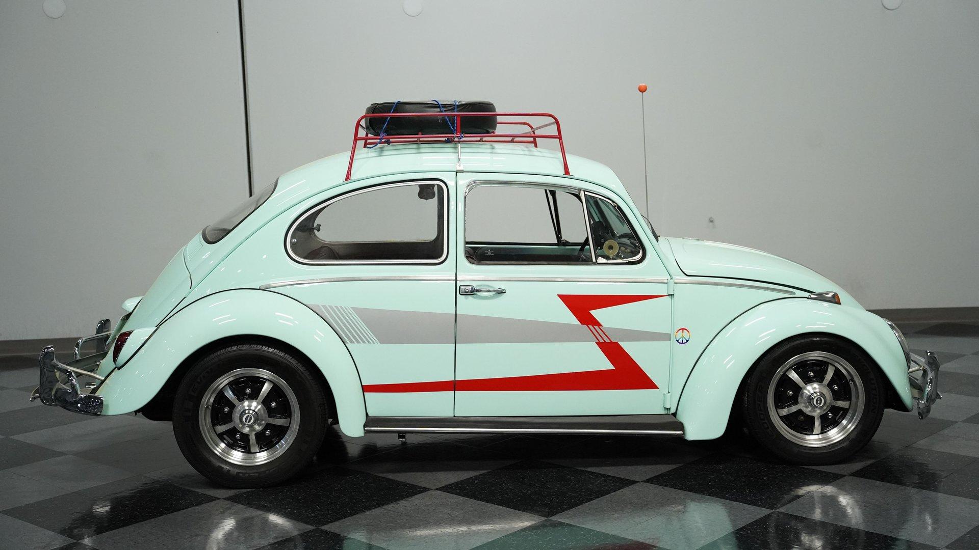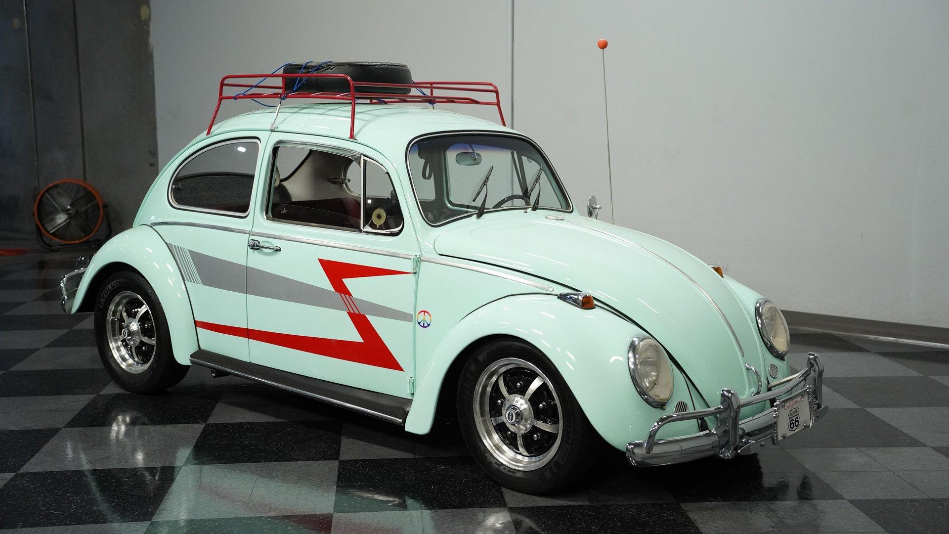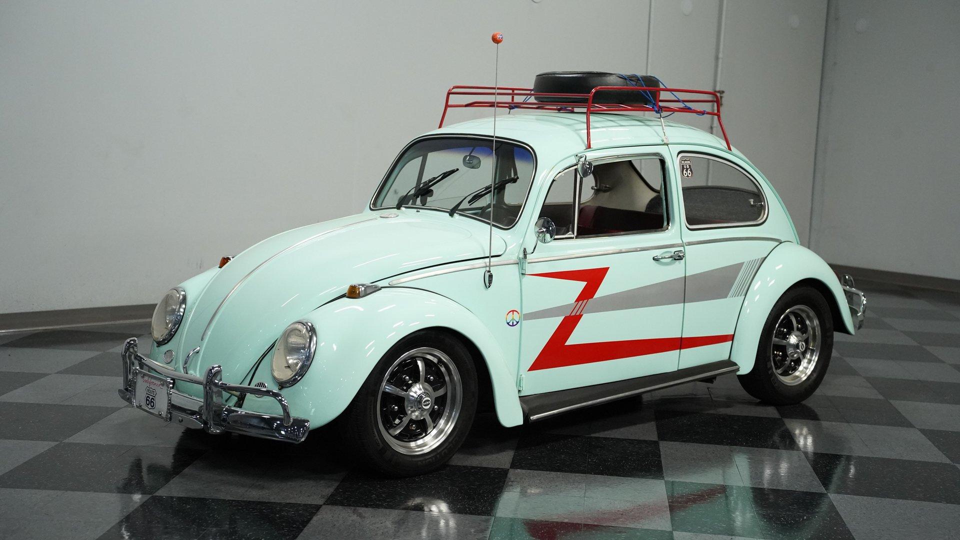 Finished in vibrant teal with racing-inspired red accents, this 1966 Volkswagen Beetle underwent a complete transformation by a skilled paint artisan. The body received full disassembly, metal stripping, epoxy primer, and premium PPG base/clear coat application for a superior finish. The red roof rack and coordinated side stripes give this Bug a rally-inspired appearance that's uniquely its own. Sitting deliberately low on 15" EMPI Sprintstar wheels with polished edges, the 175/65R15 front and 205/65R15 rear tires plant this German classic firmly on the asphalt with a purposeful stance. The maroon vinyl interior creates an inviting space that perfectly balances vintage appeal with select modern touches. The bucket seats offer ideal support for cruising, while custom additions like the wicker under-dash shelf and repurposed cup holder demonstrate thoughtful personalization. An EMPI shifter provides precise gear selection, complemented by the period-correct RetroSound AM/FM/AUX stereo. Additional speakers and a hidden amp under the rear seat elevate the audio experience without compromising the classic aesthetic, while fresh carpet rounds out the cabin's comprehensive update. A newly constructed 1600 CC engine from Freeman Automotive (April 2024) powers this German icon with less than 2,500 miles on the build. Representing a substantial $5,800 investment, the powerplant features modern electronic ignition for improved starting and operation. The classic 4-speed manual transmission and original VW transaxle provide authentic driving dynamics while front disc brakes with 2.5" drop spindles deliver superior stopping capability. New shocks at all corners and fresh steering components ensure precise handling for confident motoring. HIGHLIGHTS: 1600 CC Engine (Rebuilt April 2024) 4 Speed Manual Transmission VW Transaxle Electronic Ignition Front Disc Brakes 2.5" Drop Spindles Four New Shocks New Tie Rods and Ends New Starter and Battery Teal Paint with Red and Gray Design Red Roof Rack 15" EMPI Sprintstar Wheels with Polished Lip 175/65R15 Front, 205/65R15 Rear Tires Lowered Stance Fresh Weatherstripping New Front and Rear Bumpers Maroon Interior with Bucket Seats Wicker Shelf Under Dash Custom Cup Holder RetroSound AM/FM/AUX Stereo Amp Under Back Seat New Speakers EMPI Shifter New Carpet $5,800 Receipt for Engine Build Authentic German engineering with significant performance upgrades, this 1966 Volkswagen Beetle stands ready. From its professional paint application to the expertly built engine and thoughtfully modified cabin, this iconic machine offers classic motoring with enhanced reliability. Call today!
