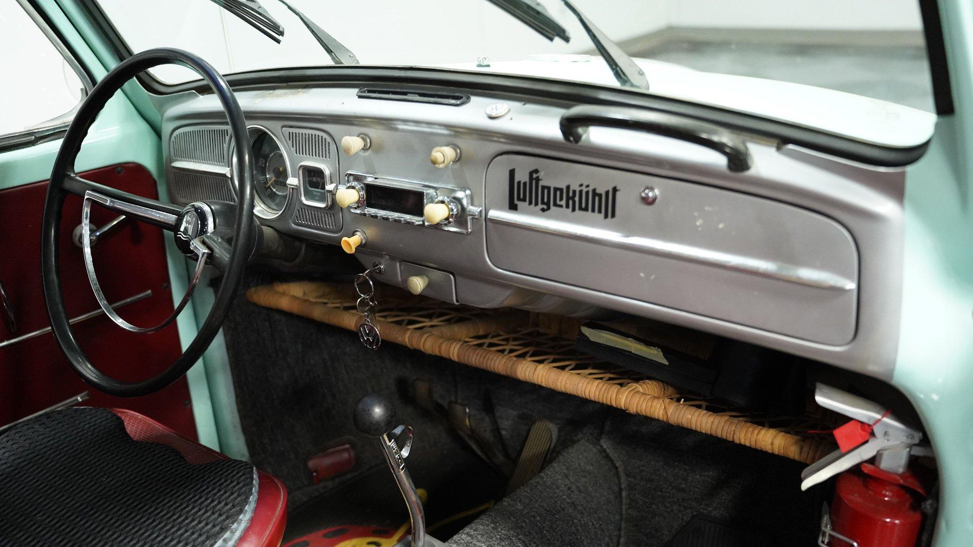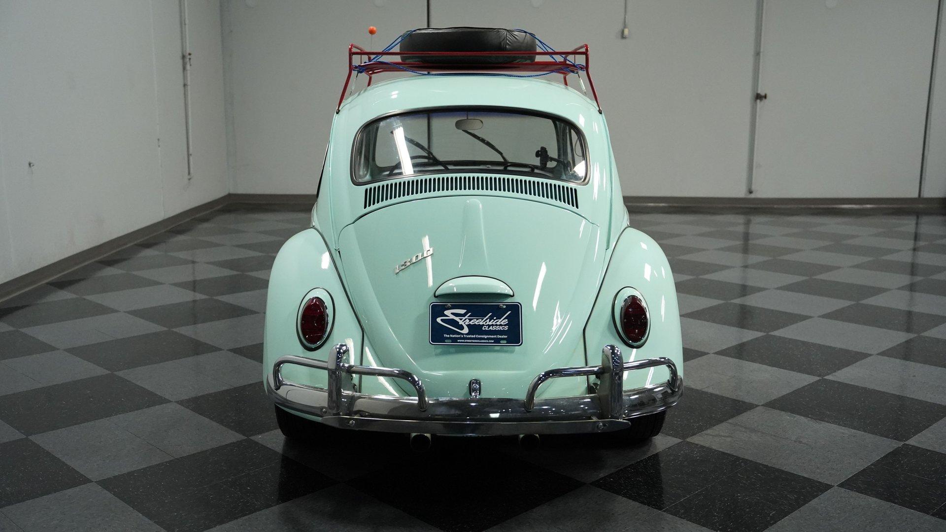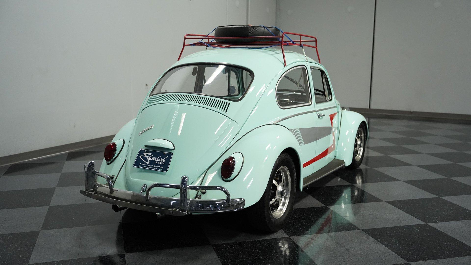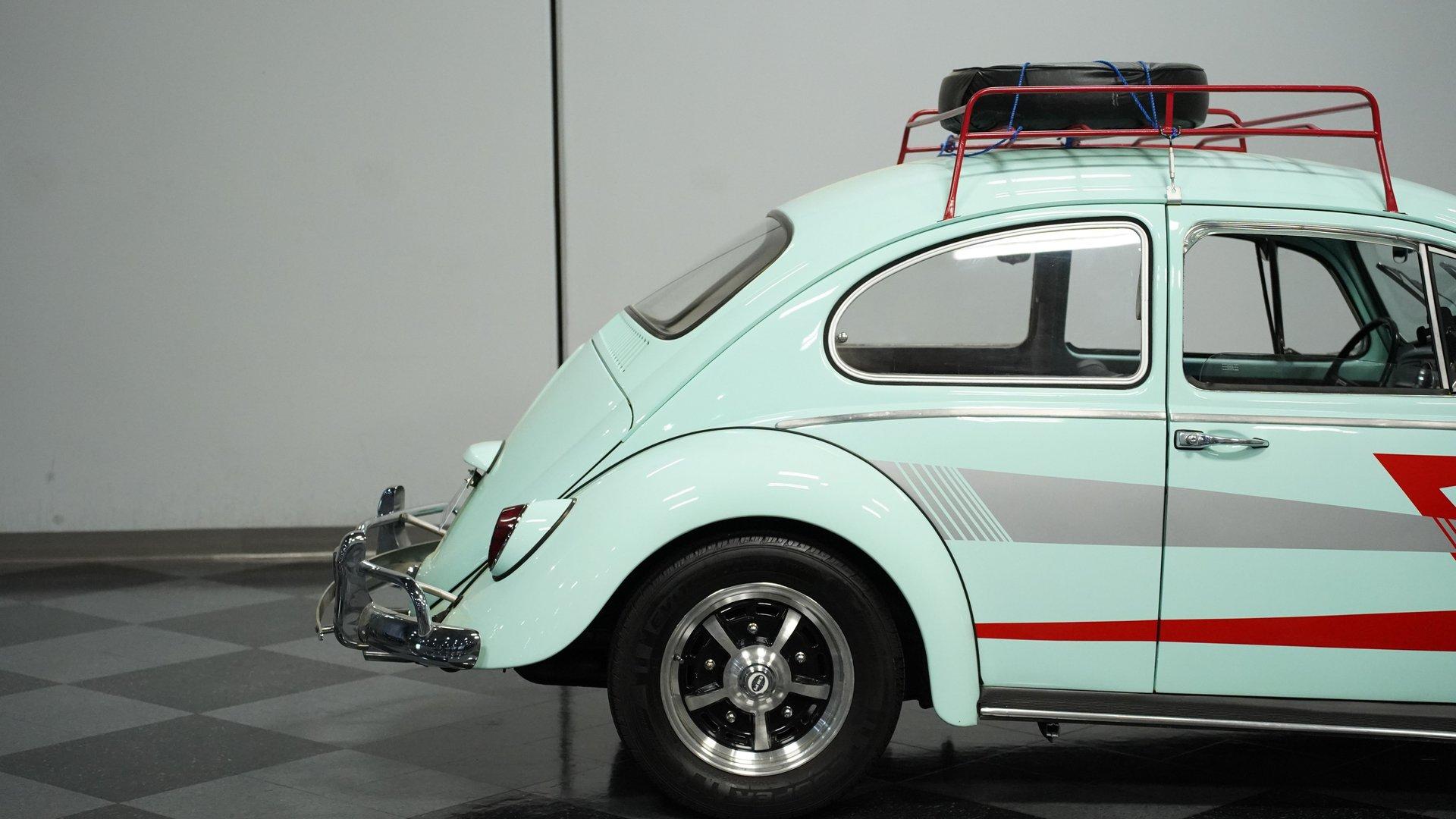 Finished in vibrant teal with racing-inspired red accents, this 1966 Volkswagen Beetle underwent a complete transformation by a skilled paint artisan. The body received full disassembly, metal stripping, epoxy primer, and premium PPG base/clear coat application for a superior finish. The red roof rack and coordinated side stripes give this Bug a rally-inspired appearance that's uniquely its own. Sitting deliberately low on 15" EMPI Sprintstar wheels with polished edges, the 175/65R15 front and 205/65R15 rear tires plant this German classic firmly on the asphalt with a purposeful stance. The maroon vinyl interior creates an inviting space that perfectly balances vintage appeal with select modern touches. The bucket seats offer ideal support for cruising, while custom additions like the wicker under-dash shelf and repurposed cup holder demonstrate thoughtful personalization. An EMPI shifter provides precise gear selection, complemented by the period-correct RetroSound AM/FM/AUX stereo. Additional speakers and a hidden amp under the rear seat elevate the audio experience without compromising the classic aesthetic, while fresh carpet rounds out the cabin's comprehensive update. A newly constructed 1600 CC engine from Freeman Automotive (April 2024) powers this German icon with less than 2,500 miles on the build. Representing a substantial $5,800 investment, the powerplant features modern electronic ignition for improved starting and operation. The classic 4-speed manual transmission and original VW transaxle provide authentic driving dynamics while front disc brakes with 2.5" drop spindles deliver superior stopping capability. New shocks at all corners and fresh steering components ensure precise handling for confident motoring. HIGHLIGHTS: 1600 CC Engine (Rebuilt April 2024) 4 Speed Manual Transmission VW Transaxle Electronic Ignition Front Disc Brakes 2.5" Drop Spindles Four New Shocks New Tie Rods and Ends New Starter and Battery Teal Paint with Red and Gray Design Red Roof Rack 15" EMPI Sprintstar Wheels with Polished Lip 175/65R15 Front, 205/65R15 Rear Tires Lowered Stance Fresh Weatherstripping New Front and Rear Bumpers Maroon Interior with Bucket Seats Wicker Shelf Under Dash Custom Cup Holder RetroSound AM/FM/AUX Stereo Amp Under Back Seat New Speakers EMPI Shifter New Carpet $5,800 Receipt for Engine Build Authentic German engineering with significant performance upgrades, this 1966 Volkswagen Beetle stands ready. From its professional paint application to the expertly built engine and thoughtfully modified cabin, this iconic machine offers classic motoring with enhanced reliability. Call today!