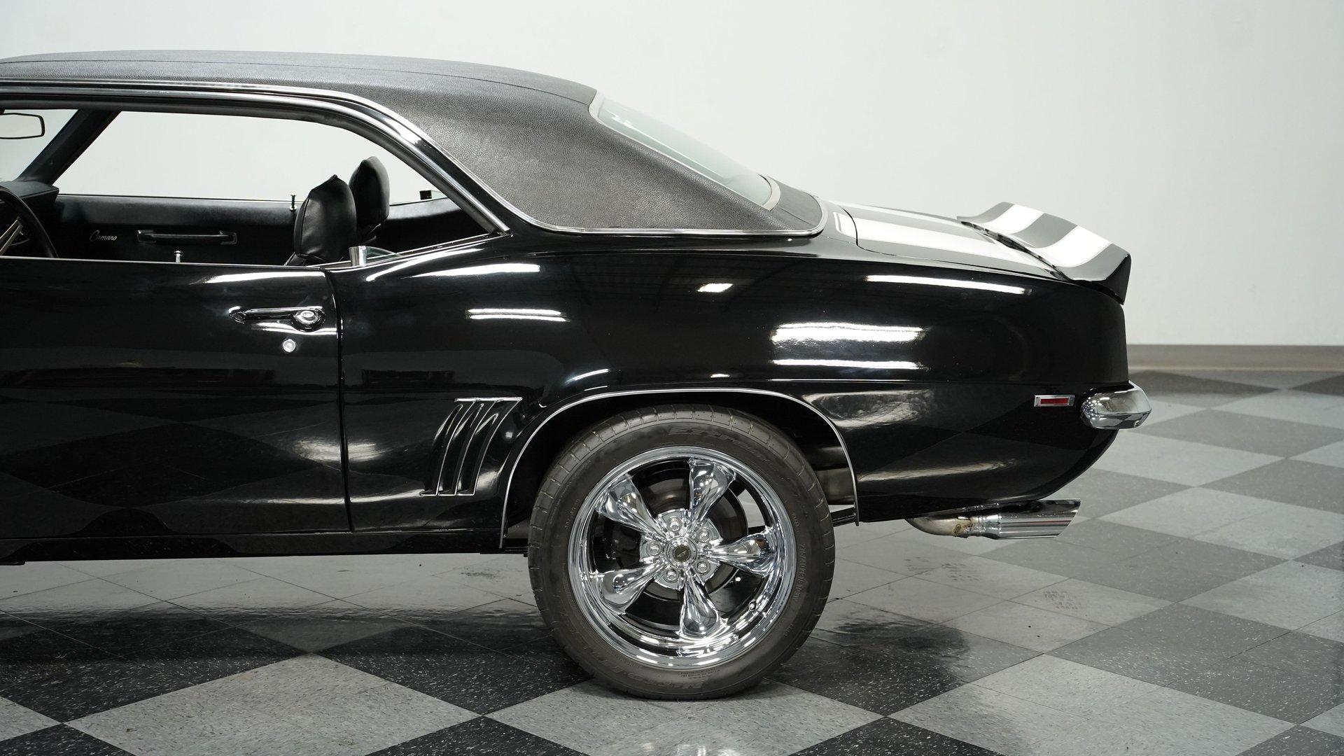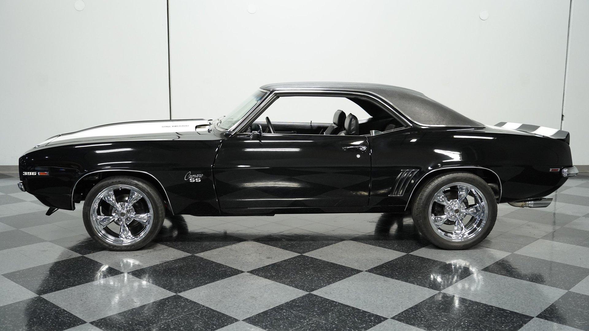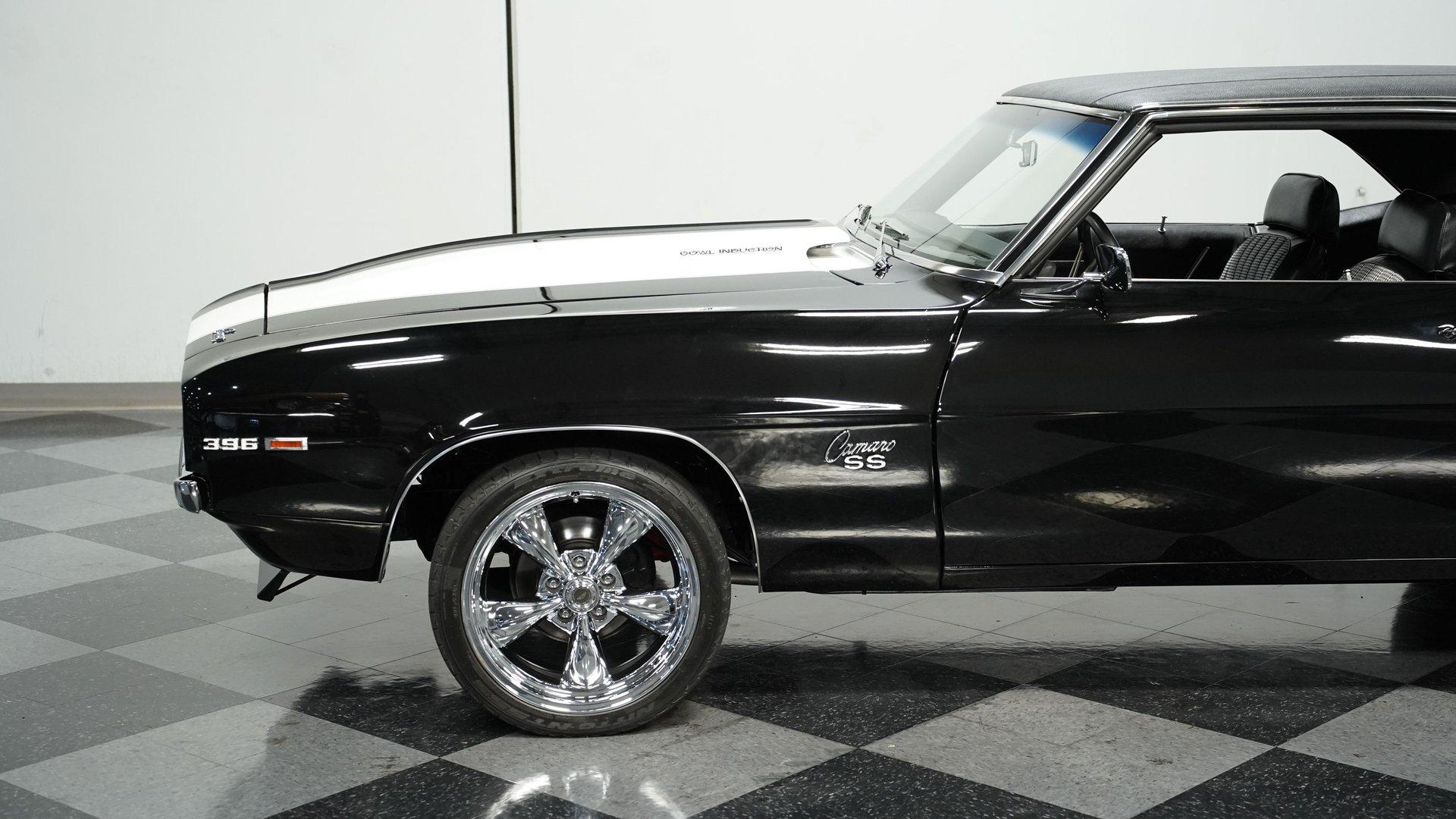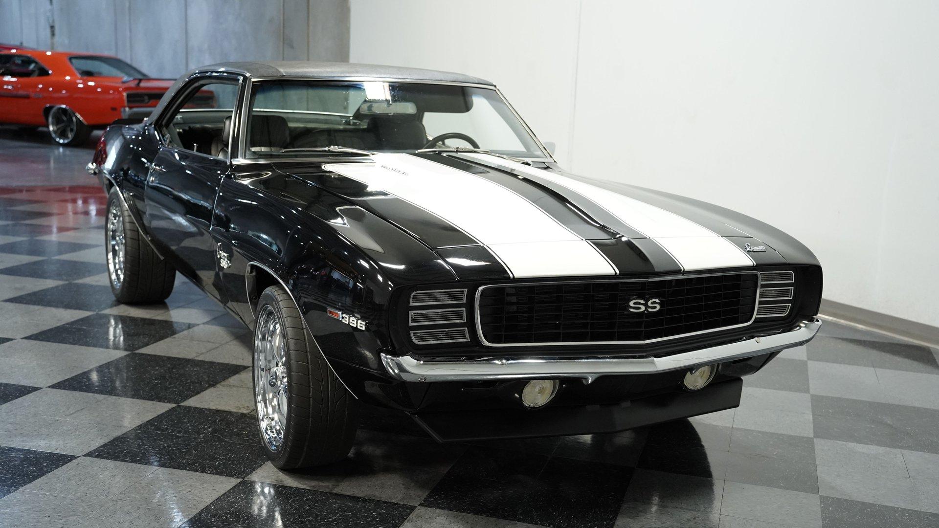 Finished in deep black with contrasting white stripes, this 1969 Chevrolet Camaro RS/SS 396 Tribute with aggressive styling is complemented by a sleek vinyl top that gives this Camaro a distinctive profile. The clean body lines follow the classic Camaro design that defined an era of performance cars. Sitting on 18-inch wheels wrapped in 235/40R18 front and 275/40ZR18 rear tires. Every exterior detail has been meticulously finished, from the chrome brightwork to the glass elements, creating a cohesive look that emphasizes the car's performance heritage. The black and white houndstooth interior perfectly balances comfort and sportiness with its bucket seats and center console arrangement. Vinyl and cloth upholstery provides both durability and classic style, while the dashboard displays clear digital gauges for easy monitoring of vital information. Creature comforts include power windows for added convenience, and a tilt wheel for optimal driving position. The AM/FM cassette player allows for soundtrack selection as you pilot this muscle car down your favorite roads. Door panels and carpeting complete the well-appointed cabin. The 396 V8 engine provides substantial power through a TH400 3-speed automatic transmission, making this Camaro as capable on the straightaway as it is enjoyable for cruising. Mechanical upgrades include an Edelbrock carburetor for improved fuel delivery and a Champion aluminum radiator to keep operating temperatures in check. The suspension system features coil springs, shocks, and a sway bar up front with leaf springs and shocks in the rear for balanced handling. The braking system has been upgraded to four-wheel power disc brakes, while FlowMaster mufflers and long tube manifolds with dual exhaust provide both performance benefits and an appropriate soundtrack for this V8-powered Camaro. HIGHLIGHTS: 396 V8 Engine 3 Speed Automatic Transmission (TH400) Single 4 Barrel Carburetor Edelbrock Carburetor Champion Aluminum Radiator Long Tube Manifolds Dual Exhaust FlowMaster Mufflers Four-Wheel Disc Brakes 10 Bolt Rear Axle Black Paint with White Stripes Black Vinyl Top 18" Front & 18" Rear Wheels 235/40R18 Front & 275/40ZR18 Rear Tires Black & White Houndstooth Interior with Bucket Seats and Console Power Steering Power Windows Tilt Wheel AM/FM Cassette Player Digital Gauges This 1969 Chevrolet Camaro RS/SS 396 Tribute combines authentic muscle car design with thoughtful upgrades. With its potent 396 V8 engine, distinctive black and white color scheme, and driver-focused interior with modern conveniences, this Camaro delivers performance and style in equal measure. Call today!