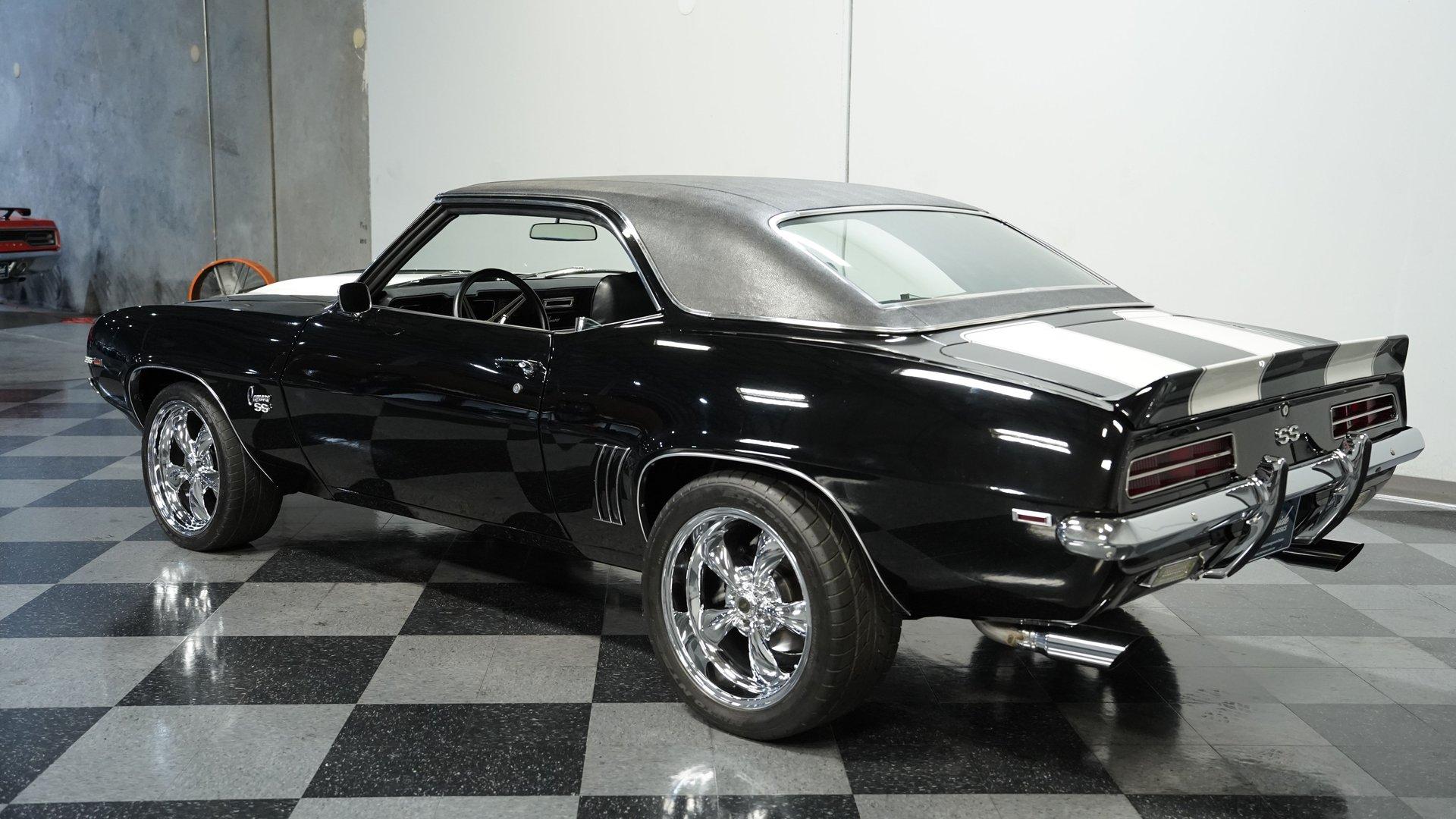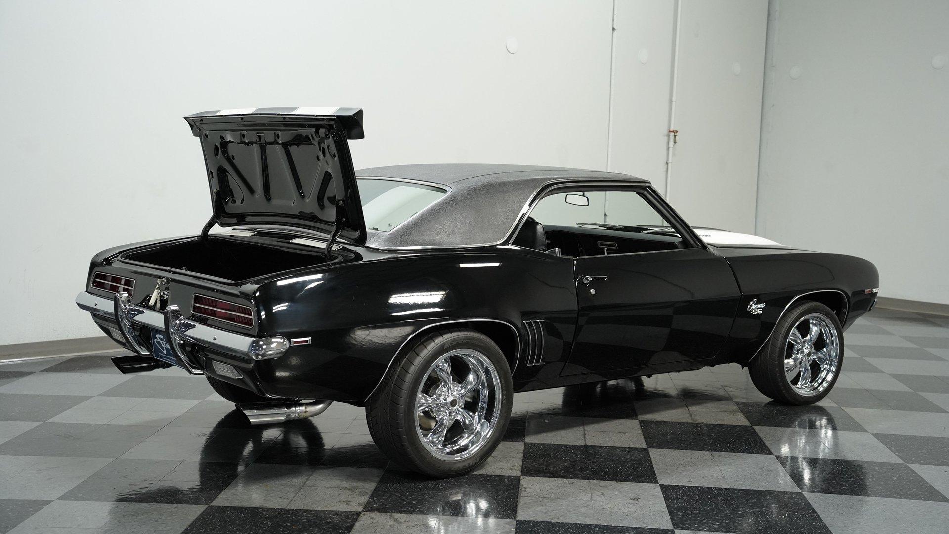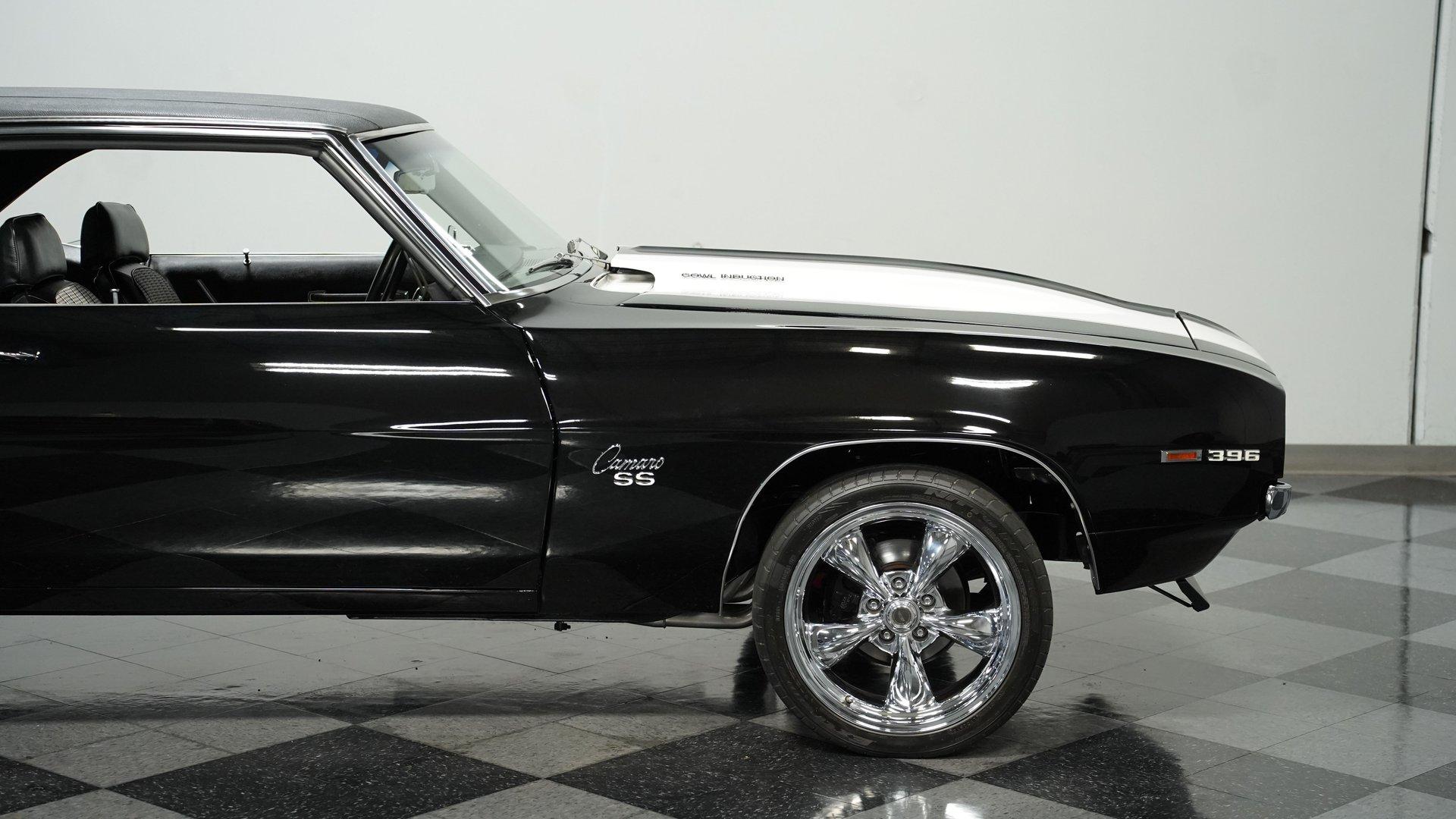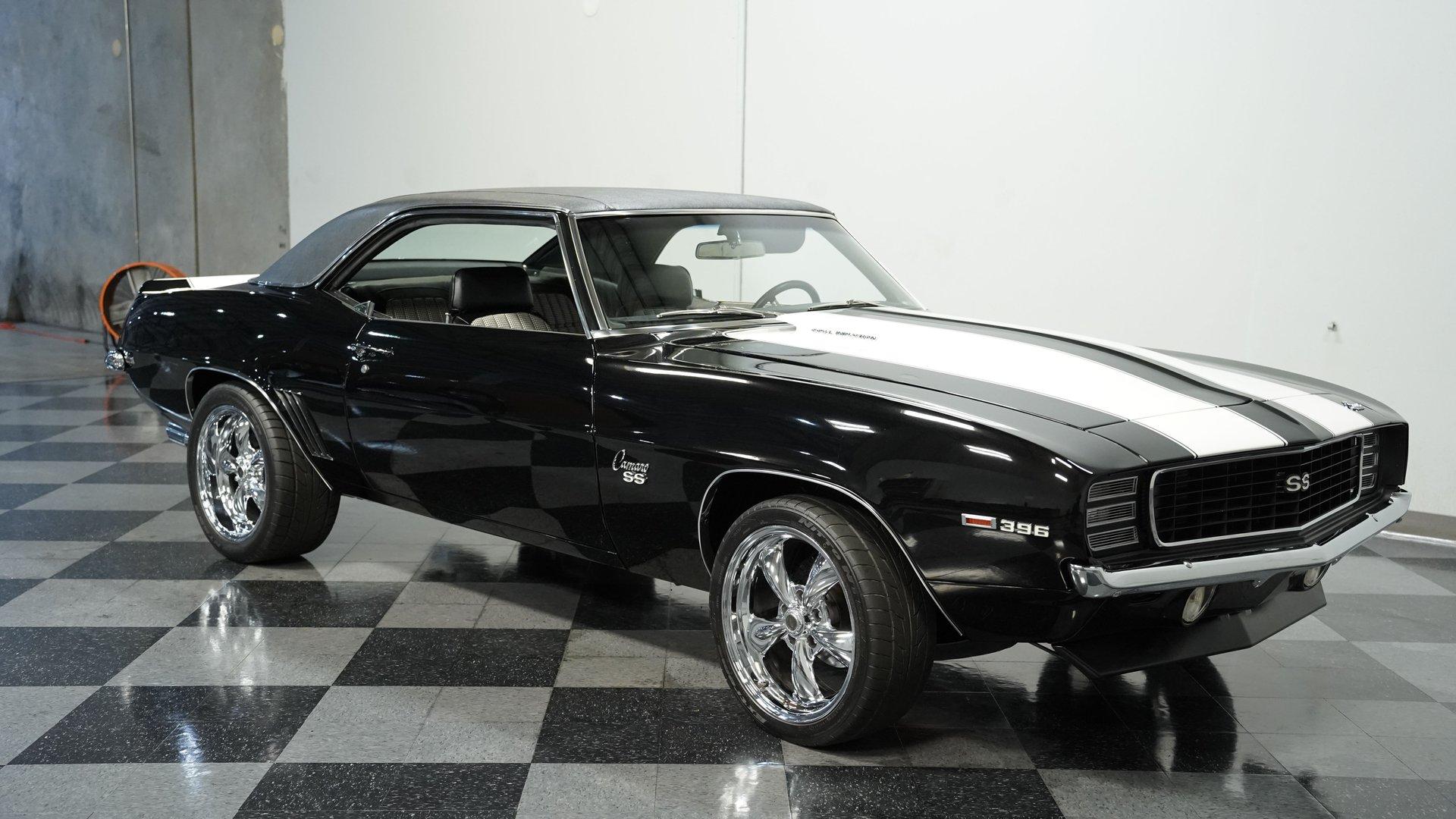 Finished in deep black with contrasting white stripes, this 1969 Chevrolet Camaro RS/SS 396 Tribute with aggressive styling is complemented by a sleek vinyl top that gives this Camaro a distinctive profile. The clean body lines follow the classic Camaro design that defined an era of performance cars. Sitting on 18-inch wheels wrapped in 235/40R18 front and 275/40ZR18 rear tires. Every exterior detail has been meticulously finished, from the chrome brightwork to the glass elements, creating a cohesive look that emphasizes the car's performance heritage. The black and white houndstooth interior perfectly balances comfort and sportiness with its bucket seats and center console arrangement. Vinyl and cloth upholstery provides both durability and classic style, while the dashboard displays clear digital gauges for easy monitoring of vital information. Creature comforts include power windows for added convenience, and a tilt wheel for optimal driving position. The AM/FM cassette player allows for soundtrack selection as you pilot this muscle car down your favorite roads. Door panels and carpeting complete the well-appointed cabin. The 396 V8 engine provides substantial power through a TH400 3-speed automatic transmission, making this Camaro as capable on the straightaway as it is enjoyable for cruising. Mechanical upgrades include an Edelbrock carburetor for improved fuel delivery and a Champion aluminum radiator to keep operating temperatures in check. The suspension system features coil springs, shocks, and a sway bar up front with leaf springs and shocks in the rear for balanced handling. The braking system has been upgraded to four-wheel power disc brakes, while FlowMaster mufflers and long tube manifolds with dual exhaust provide both performance benefits and an appropriate soundtrack for this V8-powered Camaro. HIGHLIGHTS: 396 V8 Engine 3 Speed Automatic Transmission (TH400) Single 4 Barrel Carburetor Edelbrock Carburetor Champion Aluminum Radiator Long Tube Manifolds Dual Exhaust FlowMaster Mufflers Four-Wheel Disc Brakes 10 Bolt Rear Axle Black Paint with White Stripes Black Vinyl Top 18" Front & 18" Rear Wheels 235/40R18 Front & 275/40ZR18 Rear Tires Black & White Houndstooth Interior with Bucket Seats and Console Power Steering Power Windows Tilt Wheel AM/FM Cassette Player Digital Gauges This 1969 Chevrolet Camaro RS/SS 396 Tribute combines authentic muscle car design with thoughtful upgrades. With its potent 396 V8 engine, distinctive black and white color scheme, and driver-focused interior with modern conveniences, this Camaro delivers performance and style in equal measure. Call today!