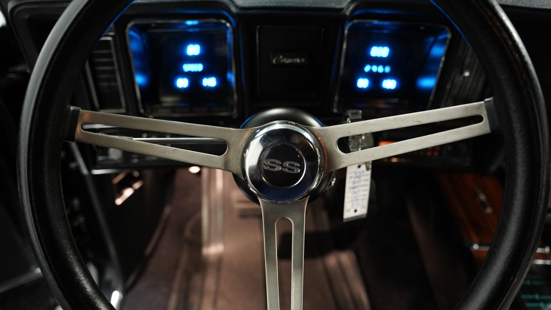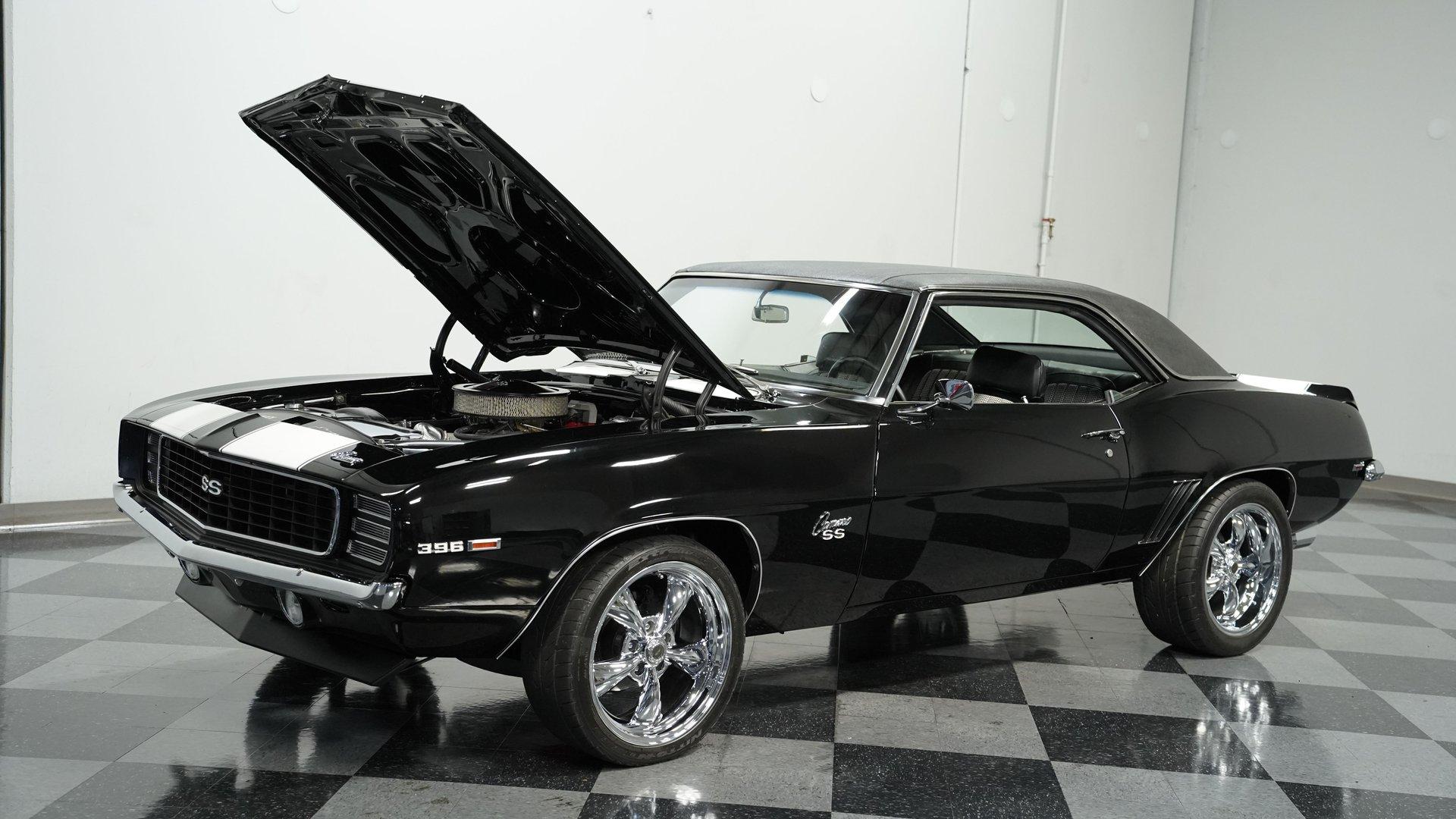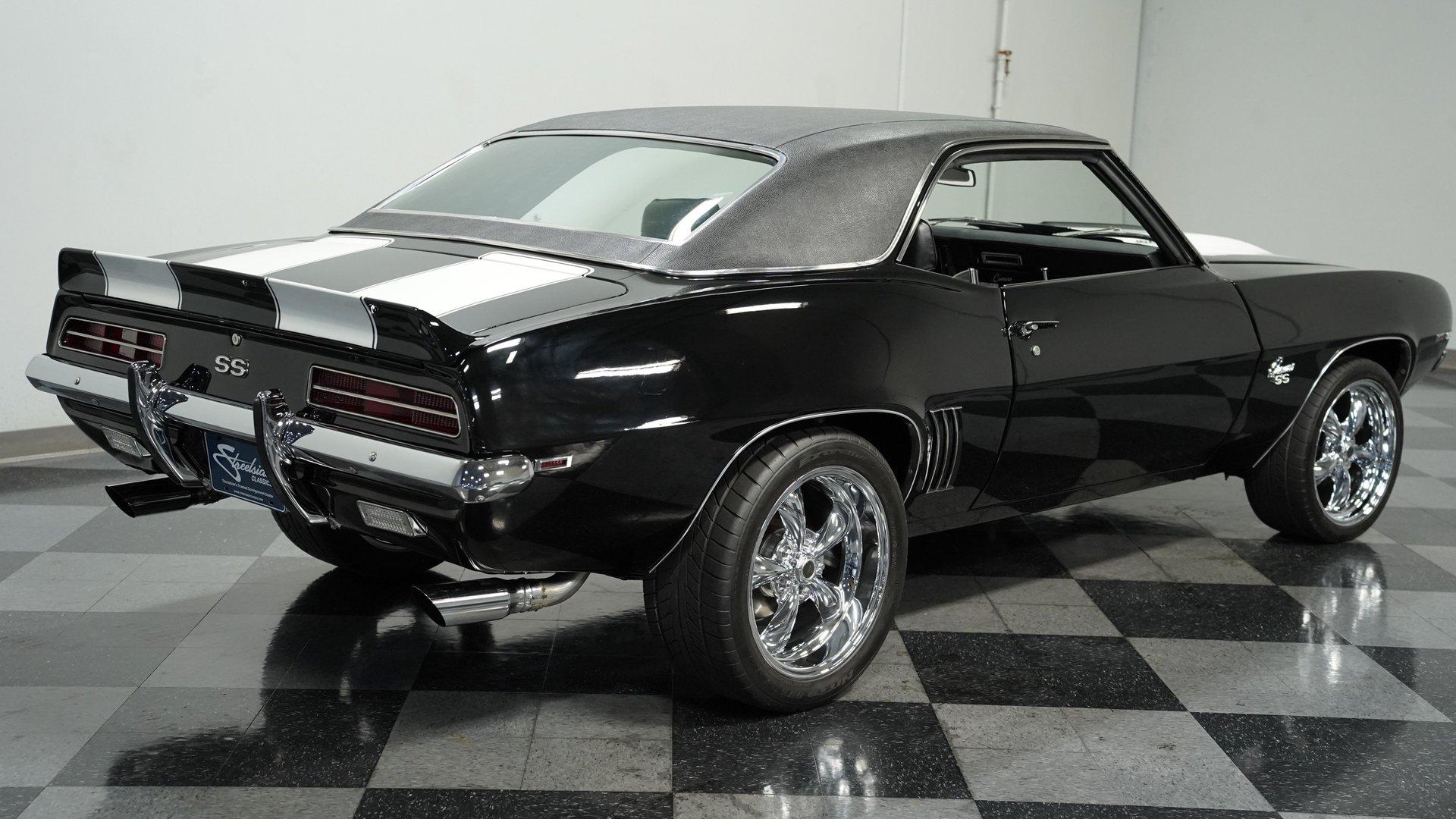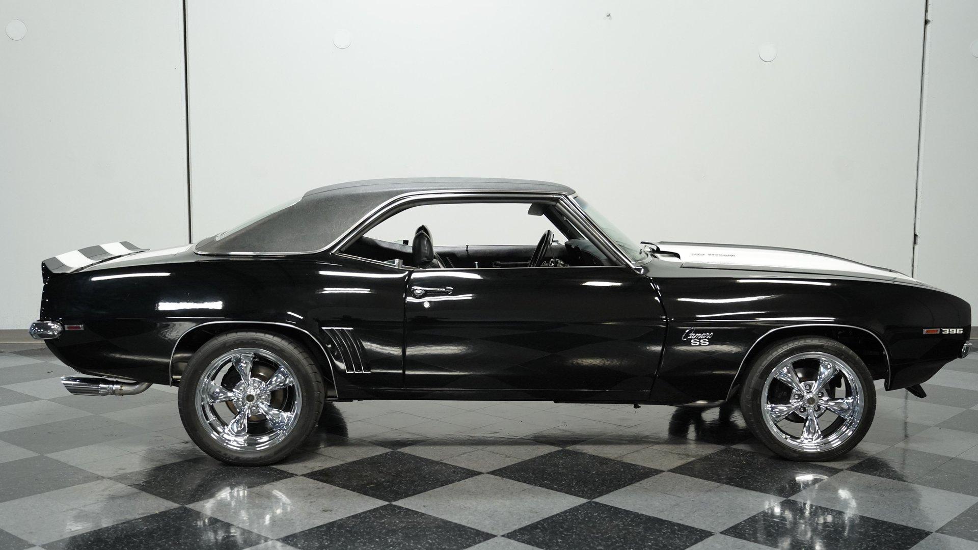 Finished in deep black with contrasting white stripes, this 1969 Chevrolet Camaro RS/SS 396 Tribute with aggressive styling is complemented by a sleek vinyl top that gives this Camaro a distinctive profile. The clean body lines follow the classic Camaro design that defined an era of performance cars. Sitting on 18-inch wheels wrapped in 235/40R18 front and 275/40ZR18 rear tires. Every exterior detail has been meticulously finished, from the chrome brightwork to the glass elements, creating a cohesive look that emphasizes the car's performance heritage. The black and white houndstooth interior perfectly balances comfort and sportiness with its bucket seats and center console arrangement. Vinyl and cloth upholstery provides both durability and classic style, while the dashboard displays clear digital gauges for easy monitoring of vital information. Creature comforts include power windows for added convenience, and a tilt wheel for optimal driving position. The AM/FM cassette player allows for soundtrack selection as you pilot this muscle car down your favorite roads. Door panels and carpeting complete the well-appointed cabin. The 396 V8 engine provides substantial power through a TH400 3-speed automatic transmission, making this Camaro as capable on the straightaway as it is enjoyable for cruising. Mechanical upgrades include an Edelbrock carburetor for improved fuel delivery and a Champion aluminum radiator to keep operating temperatures in check. The suspension system features coil springs, shocks, and a sway bar up front with leaf springs and shocks in the rear for balanced handling. The braking system has been upgraded to four-wheel power disc brakes, while FlowMaster mufflers and long tube manifolds with dual exhaust provide both performance benefits and an appropriate soundtrack for this V8-powered Camaro. HIGHLIGHTS: 396 V8 Engine 3 Speed Automatic Transmission (TH400) Single 4 Barrel Carburetor Edelbrock Carburetor Champion Aluminum Radiator Long Tube Manifolds Dual Exhaust FlowMaster Mufflers Four-Wheel Disc Brakes 10 Bolt Rear Axle Black Paint with White Stripes Black Vinyl Top 18" Front & 18" Rear Wheels 235/40R18 Front & 275/40ZR18 Rear Tires Black & White Houndstooth Interior with Bucket Seats and Console Power Steering Power Windows Tilt Wheel AM/FM Cassette Player Digital Gauges This 1969 Chevrolet Camaro RS/SS 396 Tribute combines authentic muscle car design with thoughtful upgrades. With its potent 396 V8 engine, distinctive black and white color scheme, and driver-focused interior with modern conveniences, this Camaro delivers performance and style in equal measure. Call today!