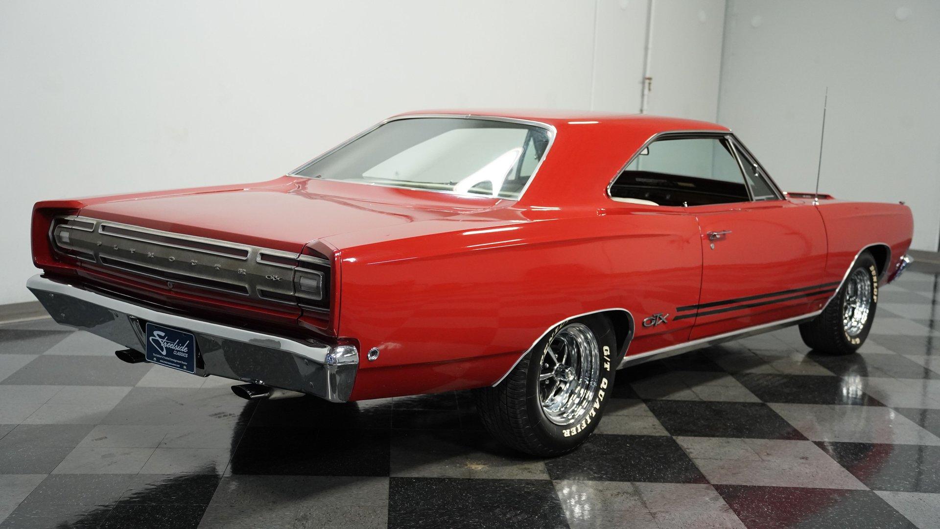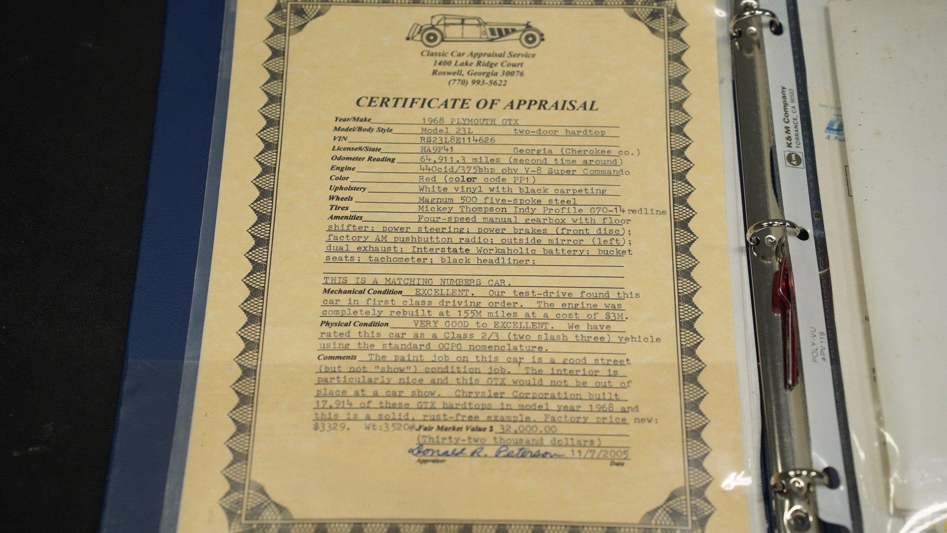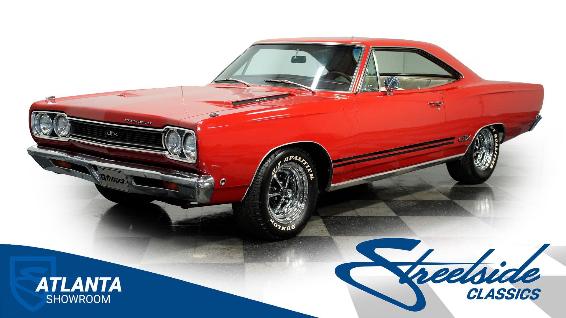 Factory S1 black horizontal sport stripes accentuate the aggressive lines of this 1968 Plymouth GTX 440. Dressed in Matador Red, this American muscle car exemplifies the golden age of performance. The sleek profile is complemented by 15" Magnum 500 wheels wrapped in 255/60/R15 tires. The dual exhaust exits cleanly through the rear valance, while the front grille and trim elements add the right amount of flash to this formidable Mopar machine. Inside the cabin, white vinyl bucket seats with red accents create a striking interior aesthetic that's both sporty and period-correct. This GTX features the rare buddy center seat option, allowing for three-across seating when needed. The floor shifter sits ready for gear changes while the factory AM radio provides entertainment. White door panels and a matching headliner maintain the clean interior theme, while power steering ensures easy maneuverability. All gauges remain clearly visible in the driver-focused dash layout. The 440 Super Commando V8 engine produces 375 horsepower and was built with meticulous attention to detail. Blueprinted in the 1990s, this numbers-matching powerplant received a roller timing chain, factory cam and tappet replacement, valve springs, oil pump, head bolts, and a complete gasket set. The single 4-barrel carburetor feeds the mighty V8, while the numbers-matching A833 4-speed manual transmission puts the power to the Dana 60 rear end with factory 3.54 gears. Four-wheel power brakes with front discs provide stopping power. HIGHLIGHTS: 440 Super Commando V8 Engine (375 HP) Blueprinted Engine A833 4-Speed Manual Transmission Numbers Matching Engine and Transmission 4-Barrel Carburetor Dana 60 Rear Axle with 3.54 Gears Power Disc Brakes Dual Exhaust Matador Red Paint Black Horizontal Sport Stripe Decals 15" Magnum 500 Wheels 255/60/R15 Tires White with Red Accents Interior with Bucket Seats Rare Buddy Center Seat Option Floor Shifter AM Radio Power Steering Galen Govier Documentation Original Warranty Card (Certicard) Owner's Manual Maintenance Records A classic Mopar muscle car that defines American performance, this 1968 Plymouth GTX 440 combines raw power, striking looks, and documented authenticity with its numbers-matching drivetrain and rare buddy seat option. Call today!