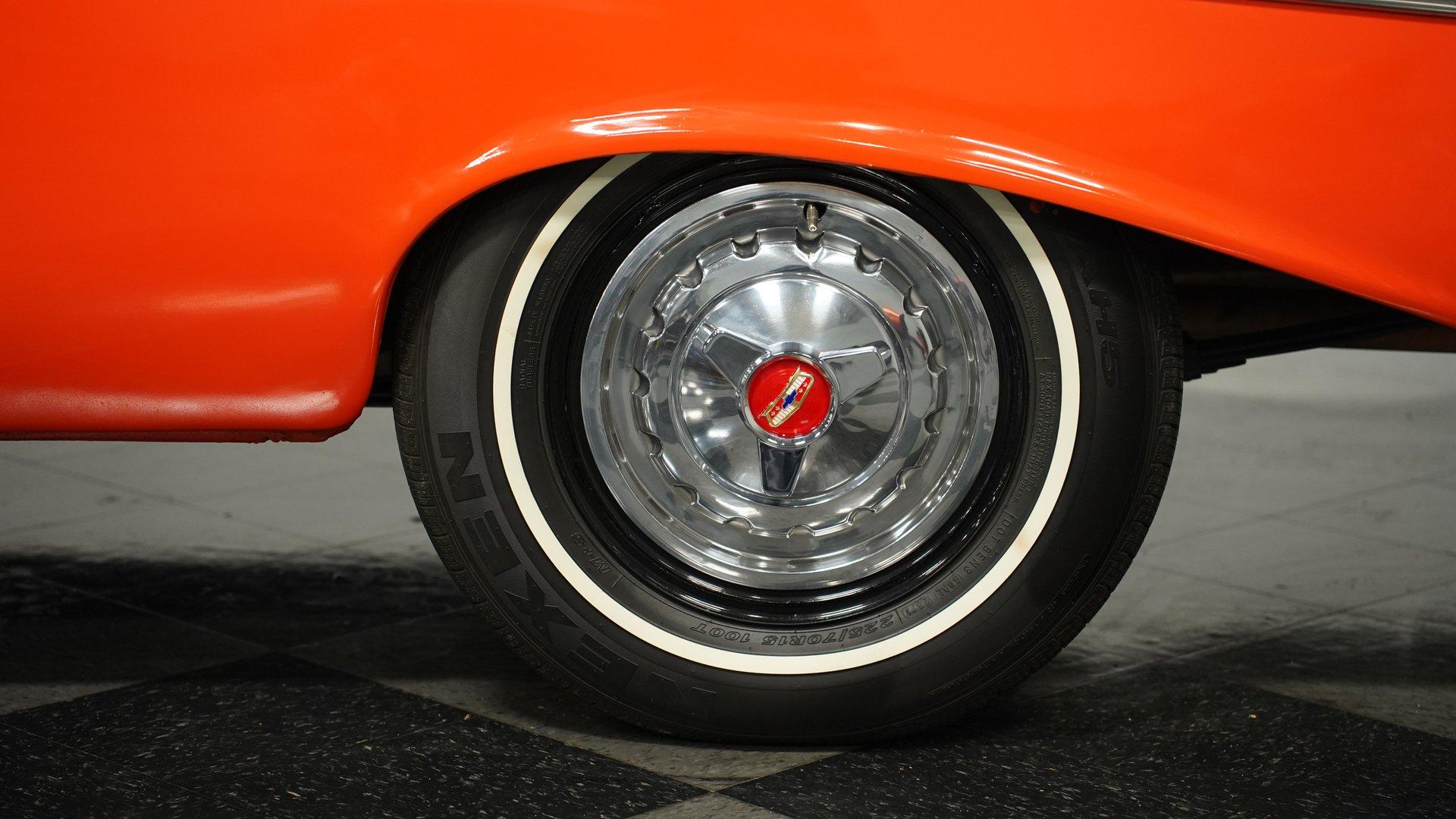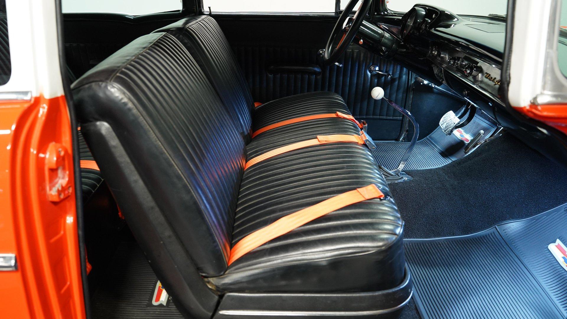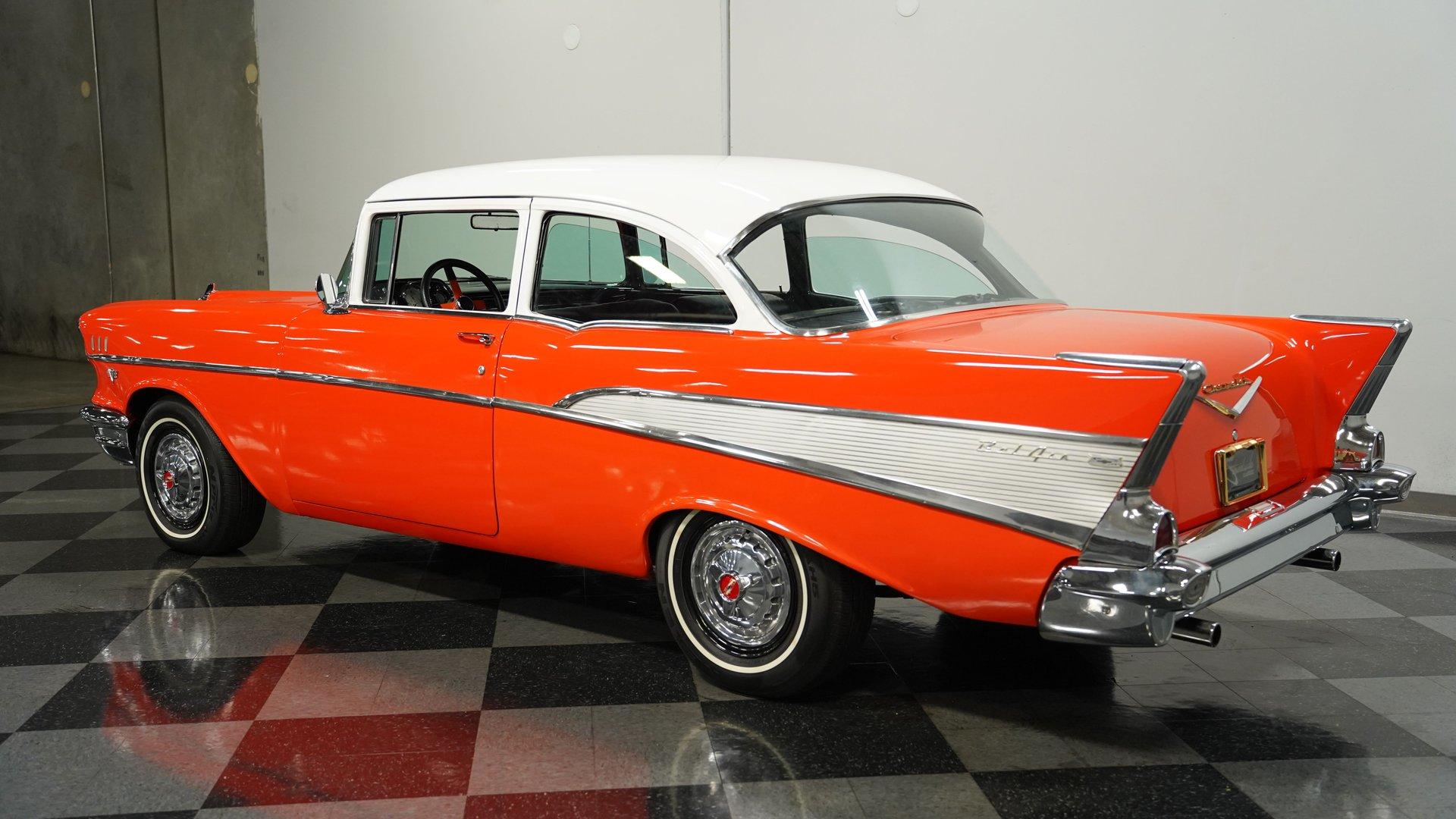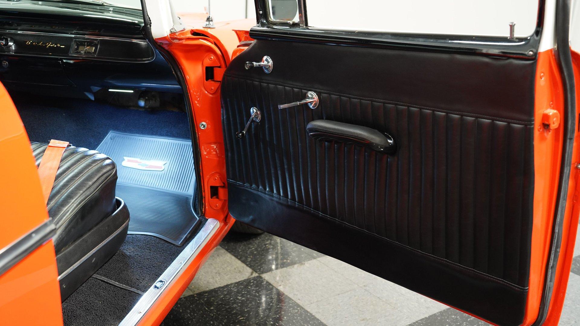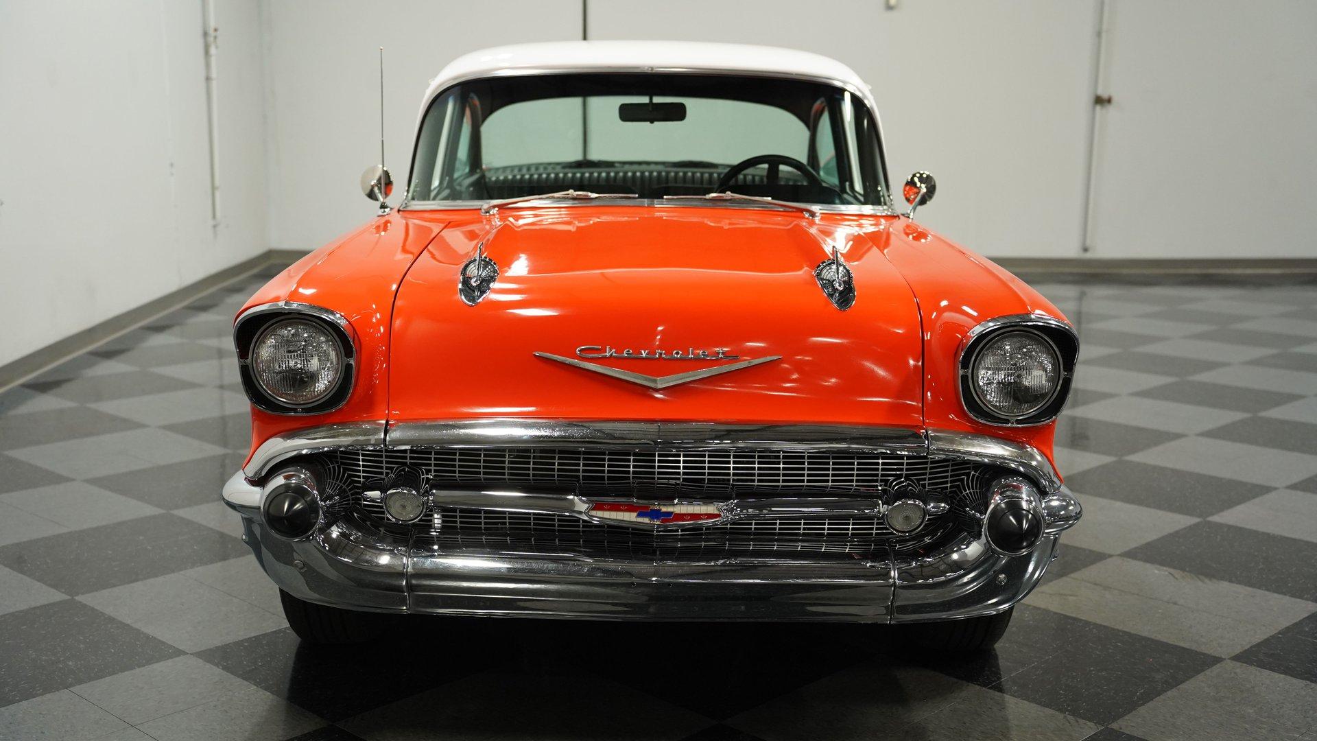 This 1957 Chevrolet 210, a fiery burst of orange and white, whispers tales of classic car shows, burger joints buzzing with neon, and rockabilly rhythms. Rolling on custom-made 15" wheels cloaked in classic Tri-5 hubcaps, this Chevy is the epitome of timeless hot rod cool. With the chrome-accented Bel Air trim sparkling in the sun, it's a head-turner that blends classic style with a touch of rebel attitude. Slide inside this Tri-Five icon and take a trip back in time. The black leather upholstery showcases a playful tuck-and-roll vibe, punctuated by vibrant orange seat belts that echo the car's exterior swagger. A Hurst shifter juts boldly from the floor, promising a hands-on driving experience. The classic instrument gauges add a touch of vintage charm, while the hidden Bluetooth radio hints at modern-day cruising comfort. Lift the hood, and the growl of a potent 383 Stroker V8 rumbles to life. Gleaming MSD ignition components, a polished high-rise intake manifold, and a Holley carburetor proclaim that this Chevy isn't just about looks-it's built for power. A symphony of polished chrome from the alternator and water pump pulleys adds a touch of showmanship. Tubular A-arms and Aldan coilovers promise a responsive ride, while power disc brakes ensure confident control, and electric exhaust cutouts offer a symphony of sound at will. HIGHLIGHTS 383 Stroker V8 engine 4-Speed manual transmission High-rise intake manifold Holley carburetor MSD billet distributor MSD 6AL ignition box Polished alternator Polished water pump pulleys Headers Electric exhaust cutouts Tubular A-arms with coilovers Leaf spring rear with air shocks 12-Bolt rear end Power disc brakes Two-tone orange and white paint Bel Air trim Custom 15" wheels with Tri-Five hubcaps 225/70-15 tires Black leather tuck-and-roll upholstery Orange seat belts Hurst floor shifter Classic instrument gauges Bluetooth-equipped AM/FM radio Air conditioning (Needs Service) This 1957 Chevrolet 210 is a ticket to an era where drive-ins and drag strips reigned supreme. With its rumbling V8, two-tone paint, and hot rod aesthetic, it's ready to ignite your automotive passions. Call today!