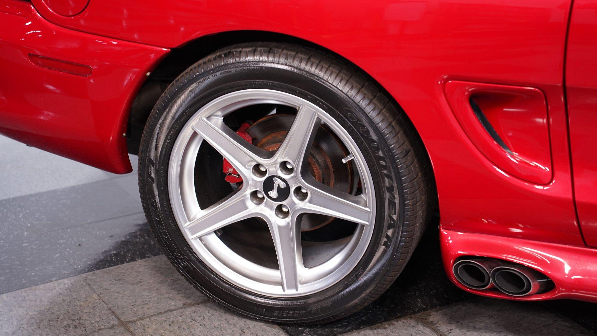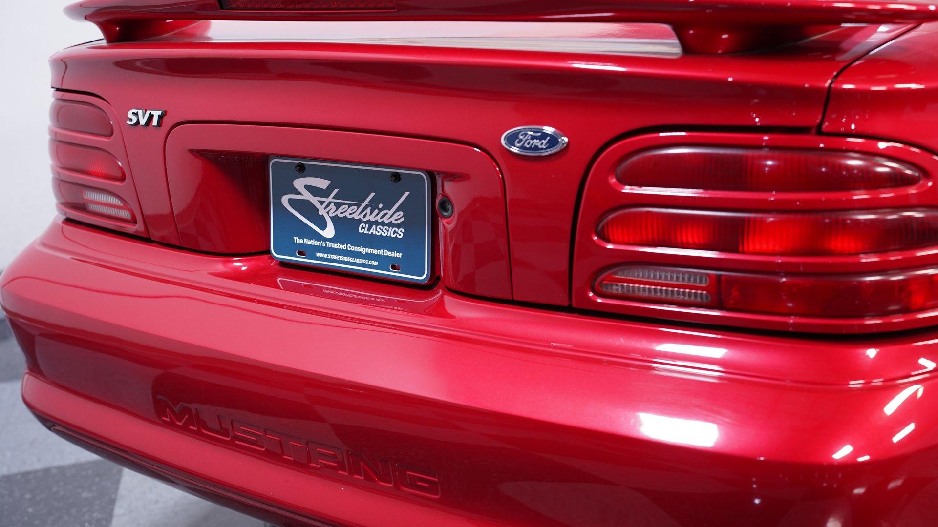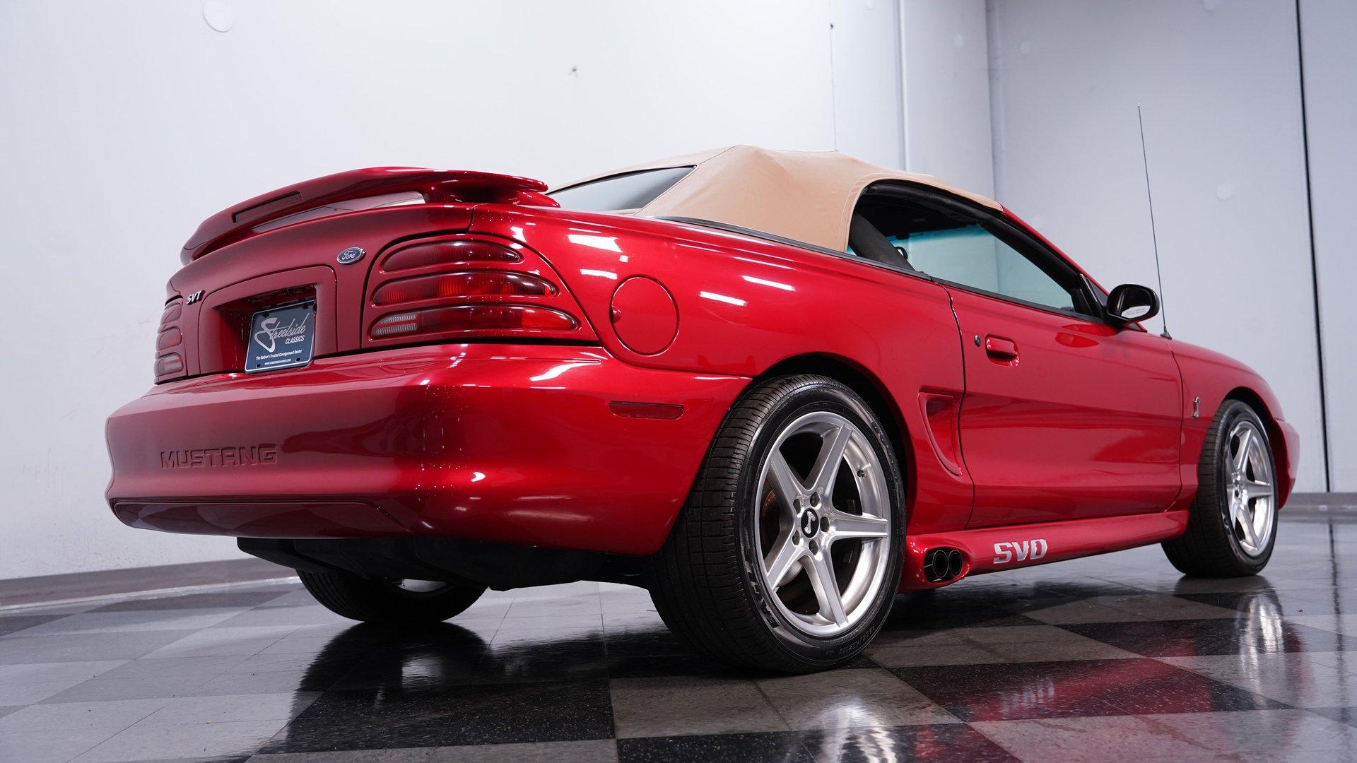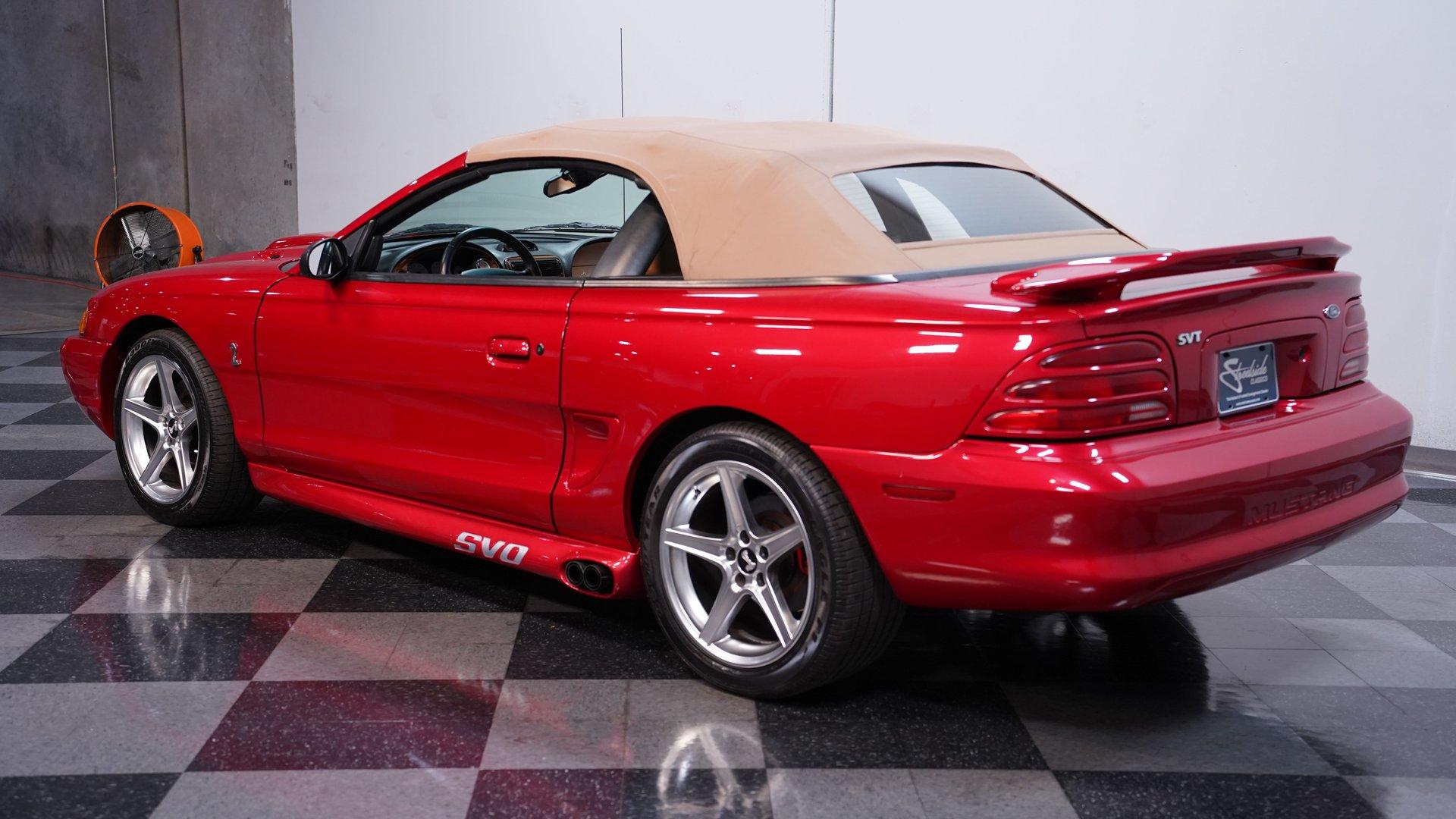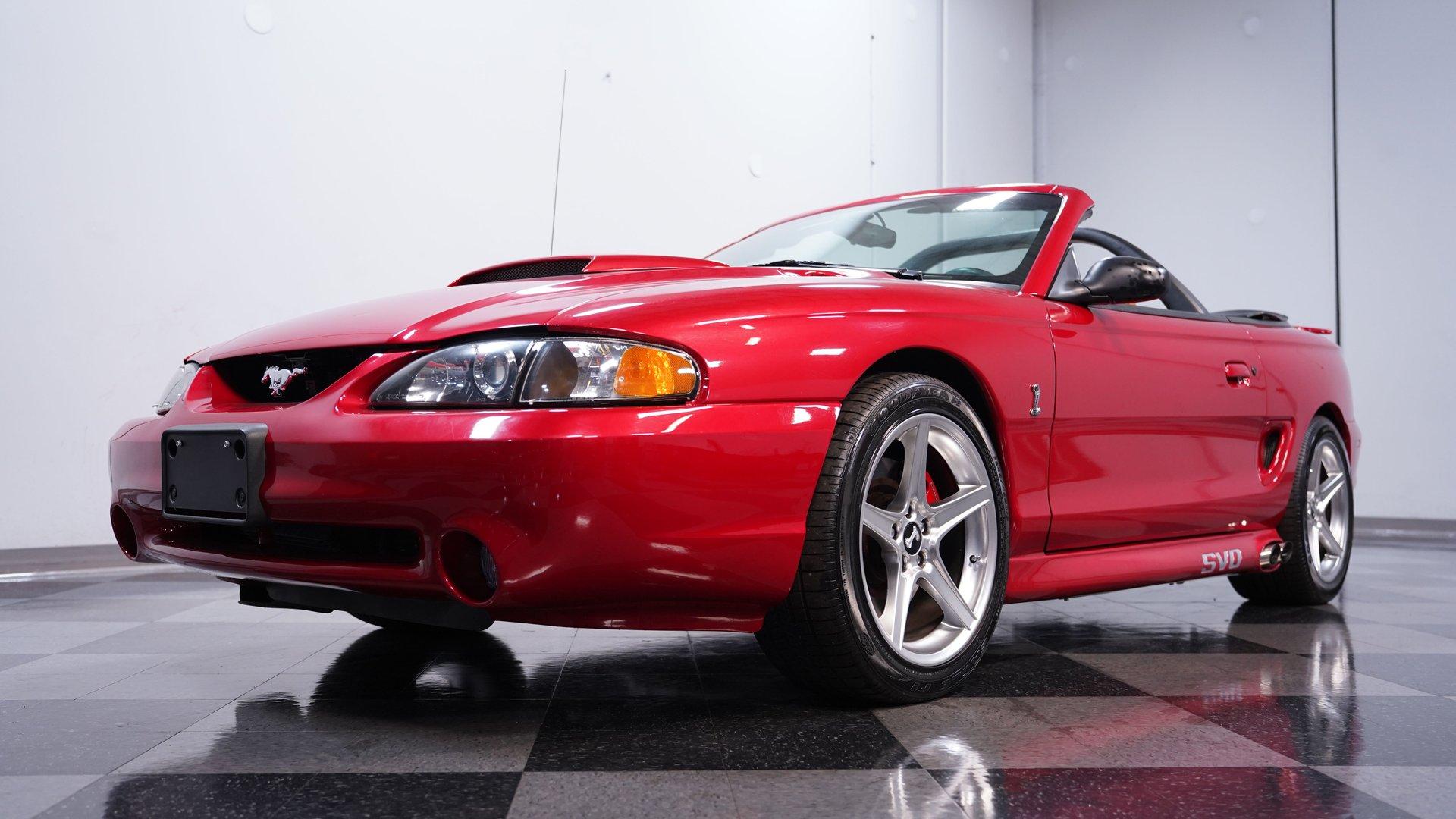 In the world of modern muscle cars, finding a rare or unique ride that stands out will always be in high demand. This 1994 Ford Mustang Cobra Pace Car Convertible Tribute comes decked out in a full Lazer Red repaint, complemented by a tan power top. An aftermarket scooped hood looks at home with the Cobra front fascia, SVO side pipes, and big 18-inch Saleen wheels. This highly modified droptop has been meticulously transitioned into being as close to the 1994 Pace Car as possible, and comes with plenty of receipts and documentation to back it up. Inside, we find a well-done Saddle vinyl interior. A center console separates a pair of plush and supportive buckets and features a power driver's side seat. A four-spoke, power-assisted Cobra steering wheel sits ahead of a set of racy white-faced gauges, showcasing a column-mounted boost gauge, a 160 mph speedometer, and a 7,000 rpm tachometer, flanked by a pair of auxiliary gauges just beyond. Power windows, locks, and mirrors, along with air conditioning and cruise control, offer all the modern amenities anyone could want from a mid-1990s muscle car. An AM/FM/Cassette/CD player offers almost as much entertainment as the chrome B&M shifter. Under that bulging hood, we find a supercharged 5.0-liter V-8 engine. Outfitted with a Ford Motorsports blower, GT40 heads, roller lifters and rockers, SpeedPro forged pistons, a TrickFlow cam, ARP bolts, high volume oil pump, and FlowTech headers, this built motor should have no problem eclipsing the stock 302's horsepower. Whatever the number, that power is funneled through an AOD-E four-speed automatic transmission featuring a shift kit and a 2,700-rpm stall converter, before being sent to a 4.10-geared rear end. HIGHLIGHTS: Highly Modified Full Lazer Red Repaint Supercharged 5.0 V8 Ford Motorsports Blower MSD Distributor Vortech Ignition Boost Control Forged Rods Forged Pistons ARP Bolts Built GT40 Heads TrickFlow Cam High Volume Oil Pump Upgraded Pulleys FlowTech Headers SVO Side Pipes AOD-E Four Speed Auto Shift Kit and 2700 RPM Stall 4.10 Rear Bullitt Style Suspension Subframe Connectors Shock Tower Braces Poly Bushings Saddle Vinyl Power Locks Power Windows Power Mirrors Power Driver's Seat AC Cruise Power Top Power Steering Four Wheel Power Discs This 1994 Ford Mustang Cobra Pace Car Convertible Tribute rides on a Bullitt-style suspension featuring Ford Racing Performance Parts upper and lower control arms, polyurethane bushings, subframe connectors, shock tower, and trunk-mounted braces. If you have been searching for a truly unique modern muscle car, it's a fair assumption that you shouldn't expect to come across another like this. Don't wait, call today!
