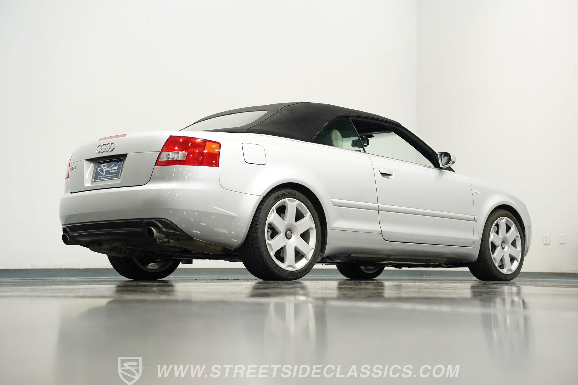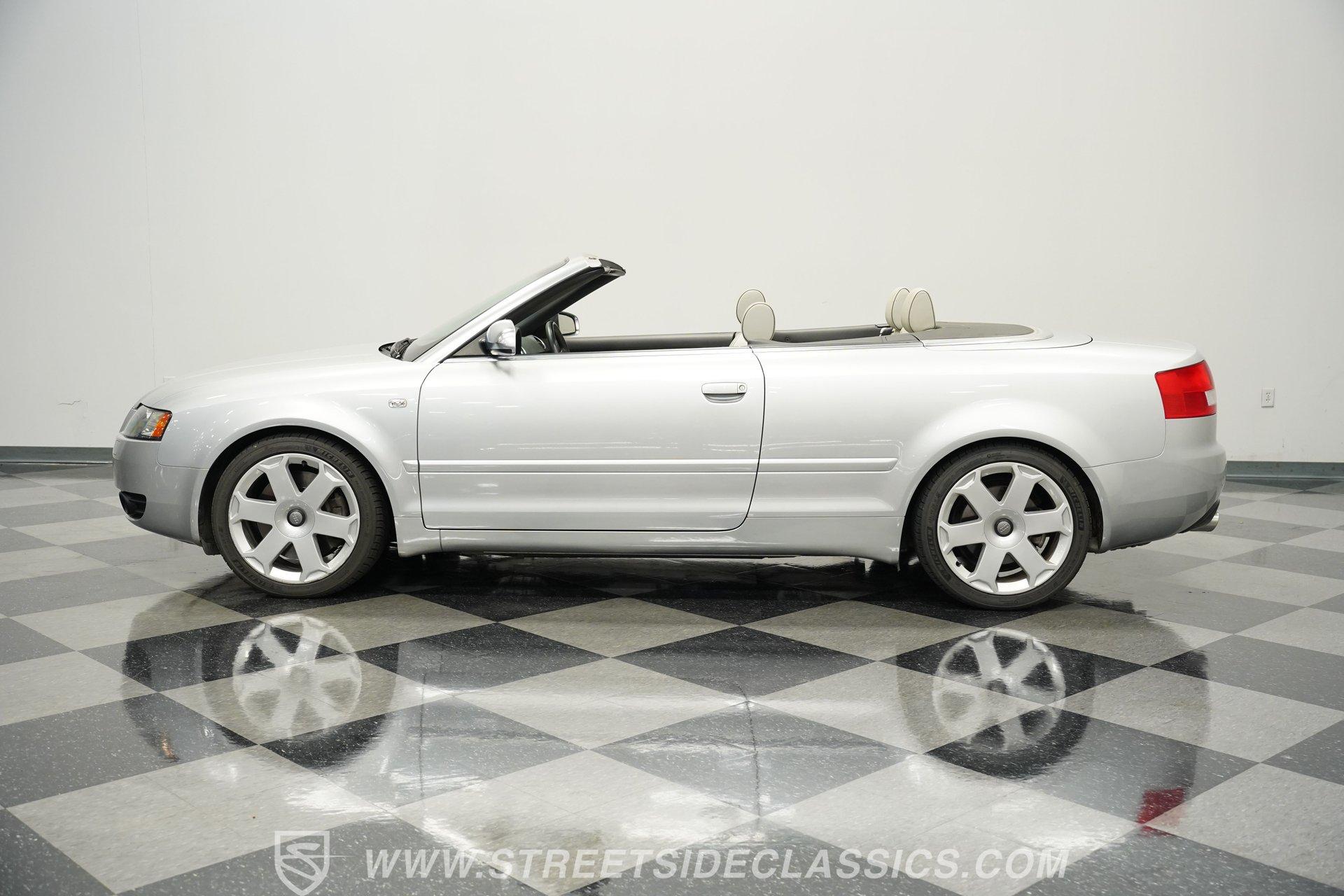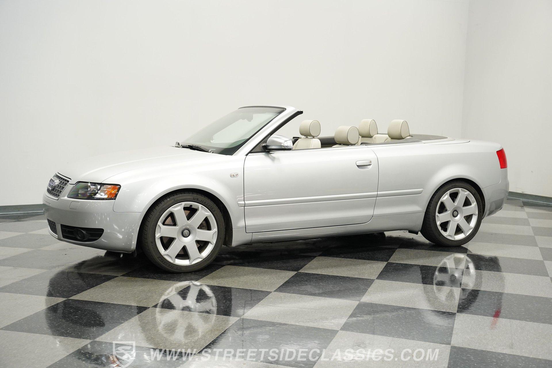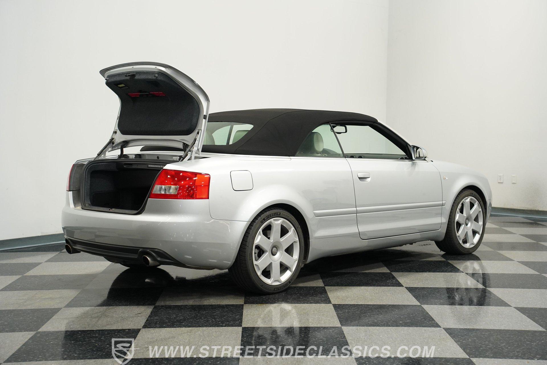 There's something undeniably captivating about driving a classic convertible that effortlessly blends performance, style, and open-air freedom. This 2004 Audi S4 Cabriolet is a refined expression of that thrill, offering a rare opportunity to own a well-preserved example that has been lightly enjoyed. With its timeless design and the promise of exhilarating drives on warm days, this Audi represents not just a car, but a lifestyle statement. It's a vehicle that invites you to create memories while appreciating the craftsmanship of a true performance convertible. Step inside to discover a gray leather interior that balances comfort with sophistication. The cabin features premium touches like heated front seats and carbon fiber trim that add a sporty flair. This S4 is equipped with the Audi navigation system and Bose premium audio package, ensuring entertainment and convenience accompany every journey. The multifunction steering wheel, memory seats, and auto-dimming mirrors enhance the driving experience, while the overall interior quality reflects very good restoration with slight use, making it both inviting and stylish. Under the hood, this Audi S4 sports a 4.2-liter V8 engine paired with a 6-speed manual transmission, both likely original and in very good condition. Known for its smooth acceleration and responsive handling, this drivetrain delivers a classic yet thrilling performance. The power steering, four-wheel disc brakes, and fuel injection system work harmoniously to provide confident control and a dynamic driving experience. Recent maintenance includes new tires and a battery, ensuring this convertible is ready for the road with reliability and spirited performance. Highlights: 2004 Audi S4 Cabriolet 4.2 Liter V8 Engine 6 Speed Manual Transmission 31,839 Actual Miles Original Paint Gray Leather Interior Heated Front Seats Audi Navigation System Bose Premium Audio Package Power Convertible Top Power Steering Four Wheel Disc Brakes New Tires and Battery Financing Available Vehicle Protection Plans Available Worldwide Shipping This 2004 Audi S4 Cabriolet offers a unique blend of classic style and modern performance that makes it a standout choice for enthusiasts and casual drivers alike. Its low mileage, well-maintained condition, and tasteful features make it a compelling buy for anyone seeking a quality convertible experience. Call, email, or come visit our showroom today!