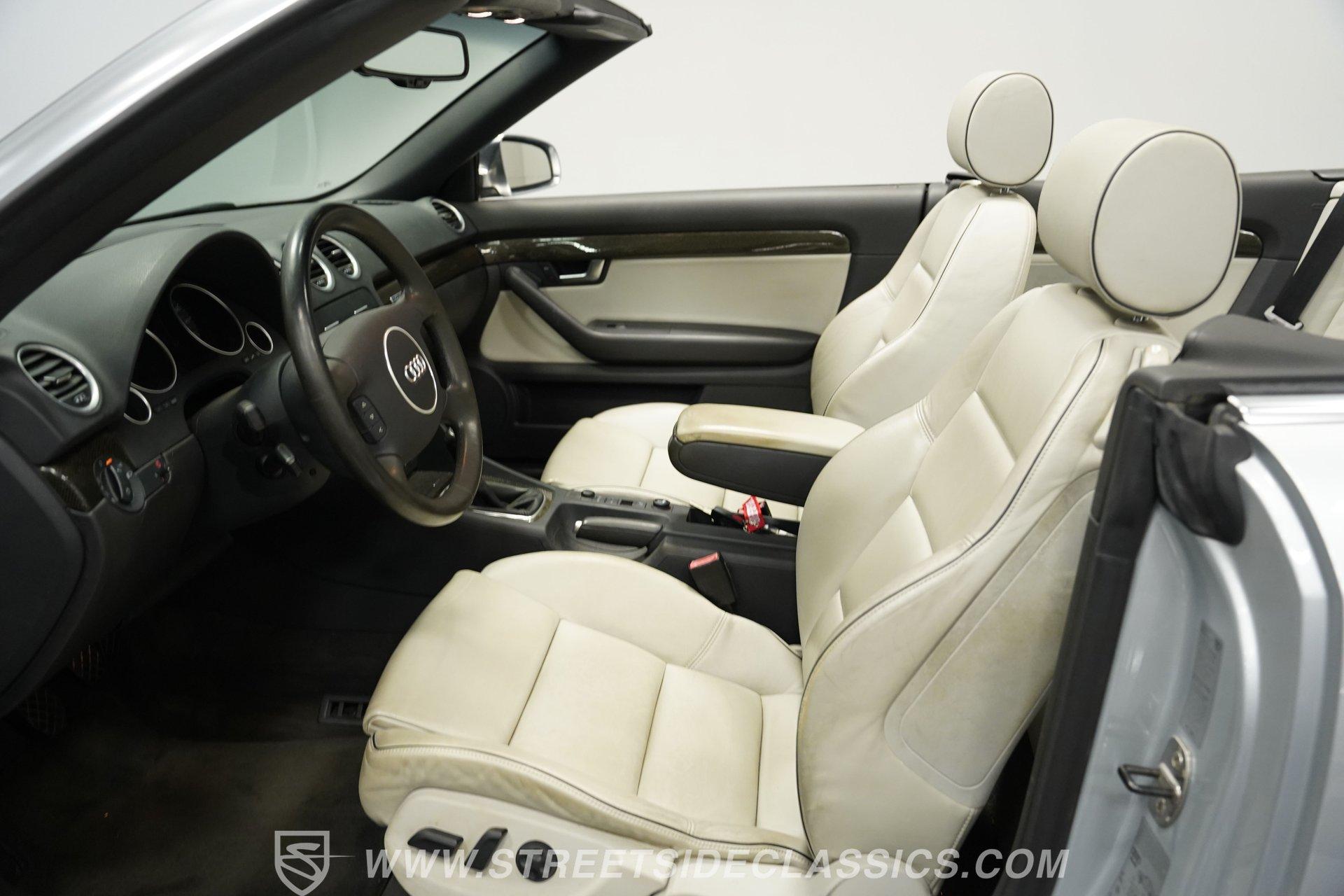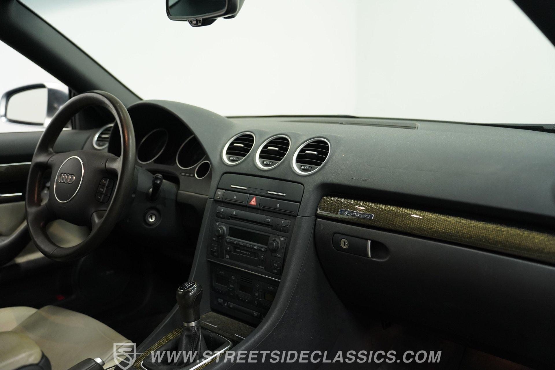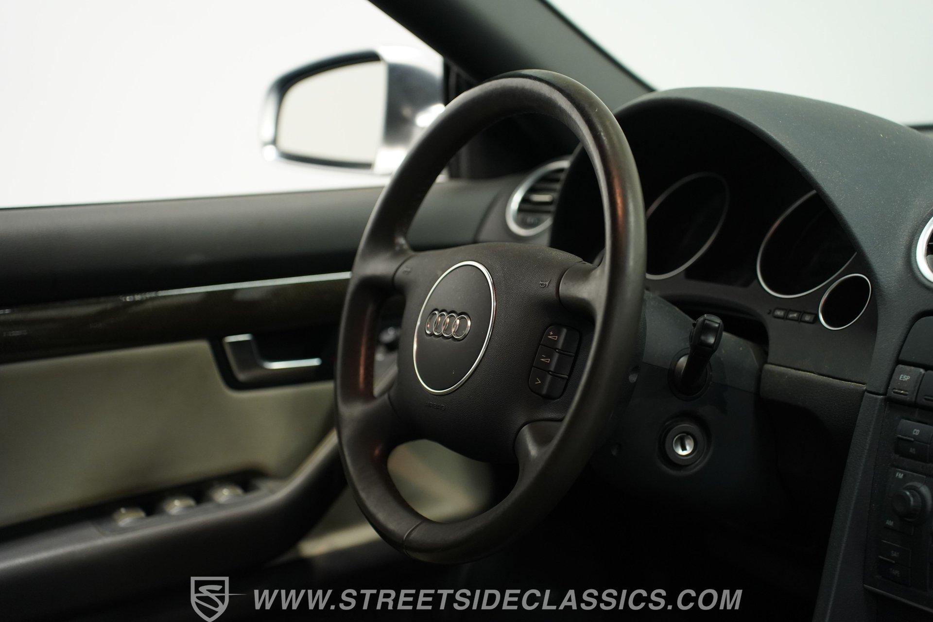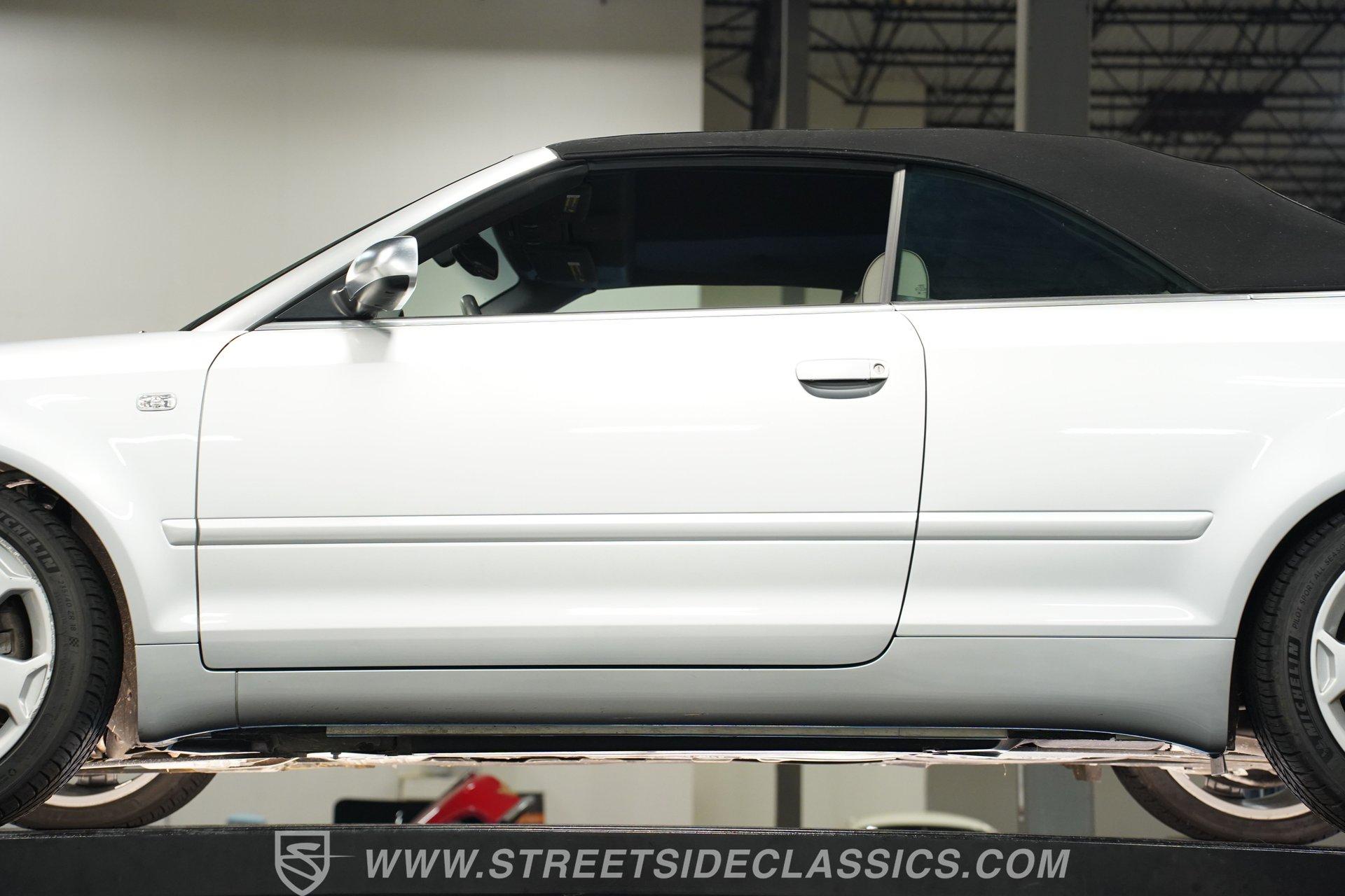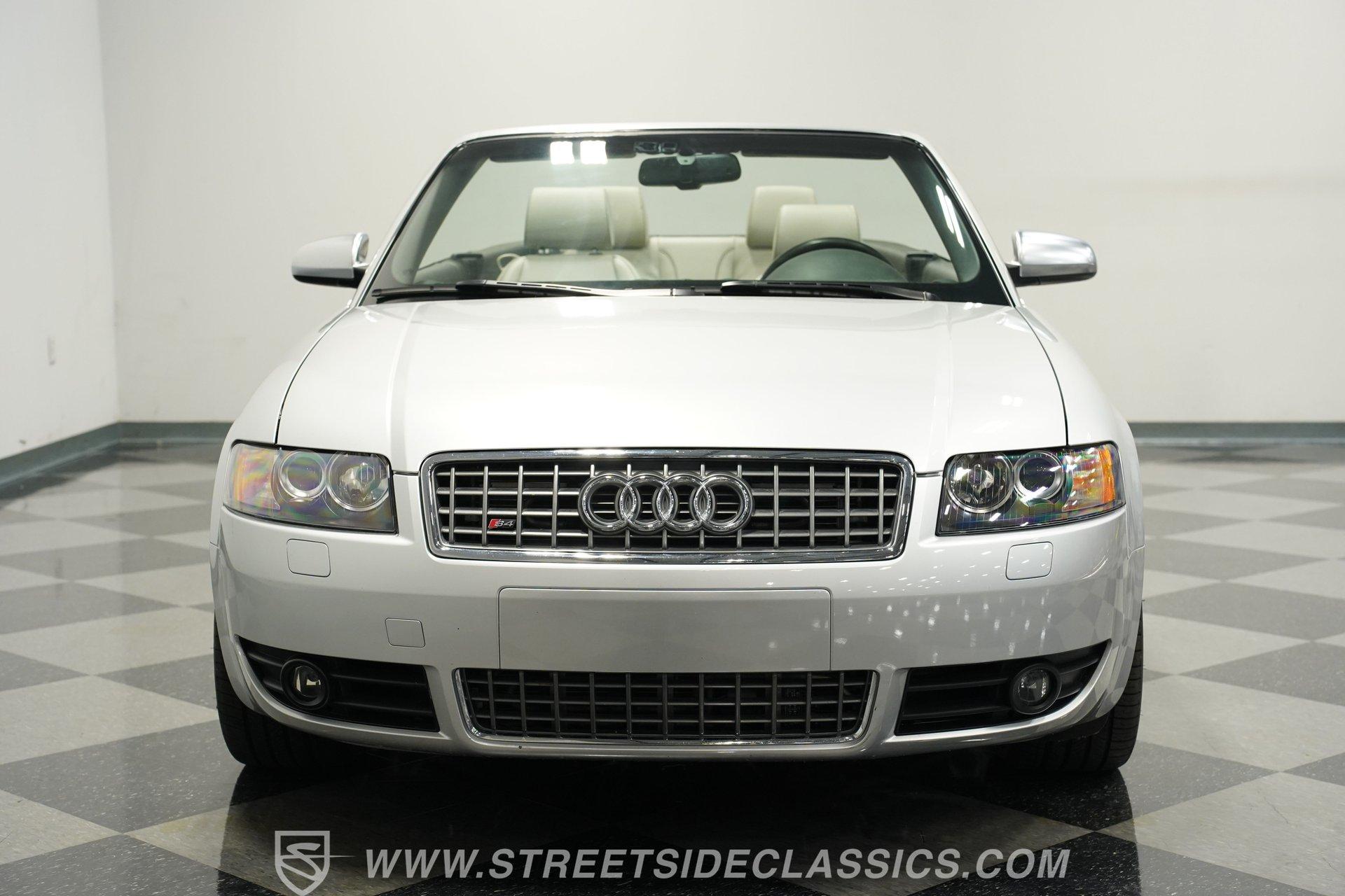 There's something undeniably captivating about driving a classic convertible that effortlessly blends performance, style, and open-air freedom. This 2004 Audi S4 Cabriolet is a refined expression of that thrill, offering a rare opportunity to own a well-preserved example that has been lightly enjoyed. With its timeless design and the promise of exhilarating drives on warm days, this Audi represents not just a car, but a lifestyle statement. It's a vehicle that invites you to create memories while appreciating the craftsmanship of a true performance convertible. Step inside to discover a gray leather interior that balances comfort with sophistication. The cabin features premium touches like heated front seats and carbon fiber trim that add a sporty flair. This S4 is equipped with the Audi navigation system and Bose premium audio package, ensuring entertainment and convenience accompany every journey. The multifunction steering wheel, memory seats, and auto-dimming mirrors enhance the driving experience, while the overall interior quality reflects very good restoration with slight use, making it both inviting and stylish. Under the hood, this Audi S4 sports a 4.2-liter V8 engine paired with a 6-speed manual transmission, both likely original and in very good condition. Known for its smooth acceleration and responsive handling, this drivetrain delivers a classic yet thrilling performance. The power steering, four-wheel disc brakes, and fuel injection system work harmoniously to provide confident control and a dynamic driving experience. Recent maintenance includes new tires and a battery, ensuring this convertible is ready for the road with reliability and spirited performance. Highlights: 2004 Audi S4 Cabriolet 4.2 Liter V8 Engine 6 Speed Manual Transmission 31,839 Actual Miles Original Paint Gray Leather Interior Heated Front Seats Audi Navigation System Bose Premium Audio Package Power Convertible Top Power Steering Four Wheel Disc Brakes New Tires and Battery Financing Available Vehicle Protection Plans Available Worldwide Shipping This 2004 Audi S4 Cabriolet offers a unique blend of classic style and modern performance that makes it a standout choice for enthusiasts and casual drivers alike. Its low mileage, well-maintained condition, and tasteful features make it a compelling buy for anyone seeking a quality convertible experience. Call, email, or come visit our showroom today!