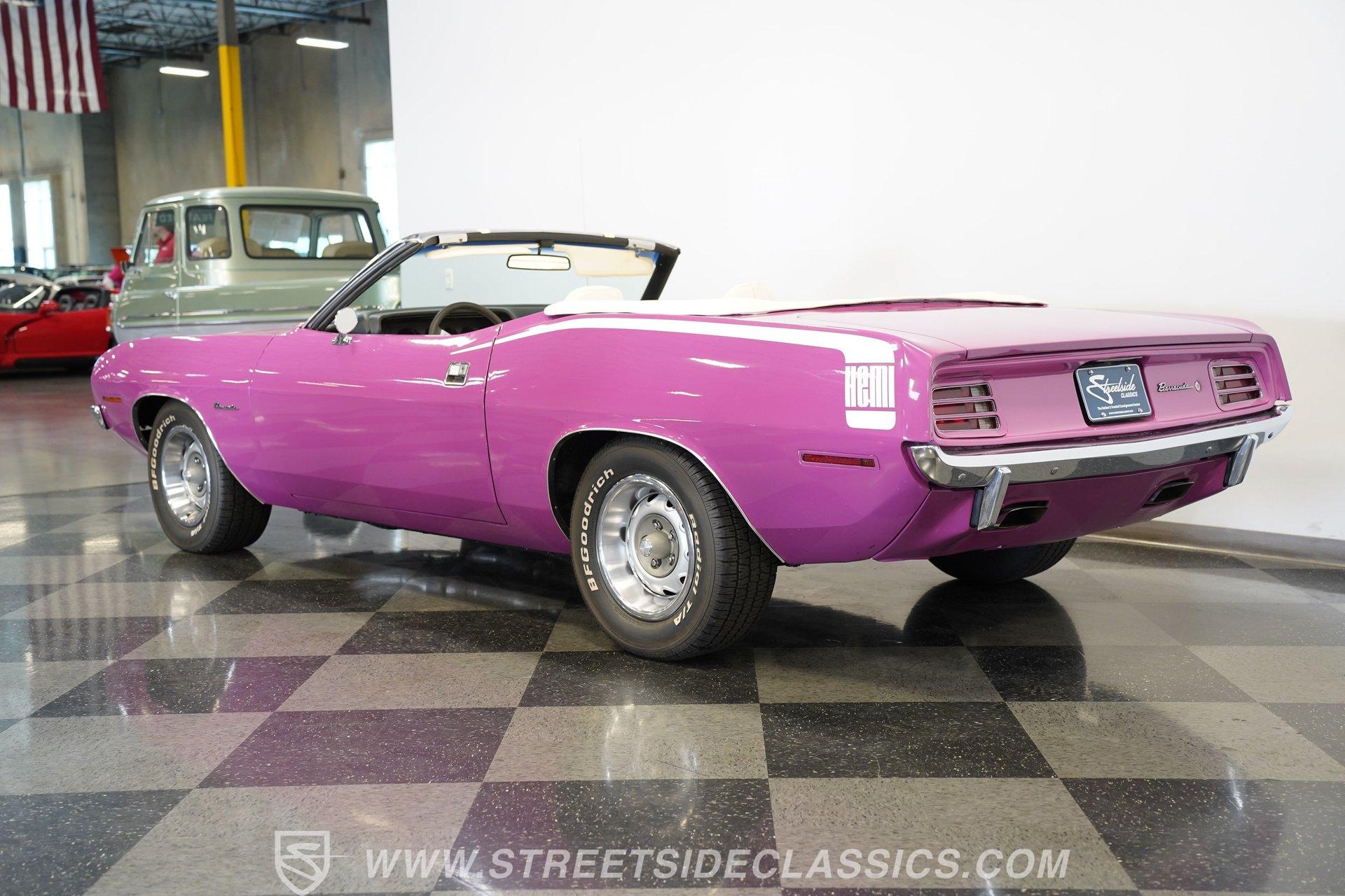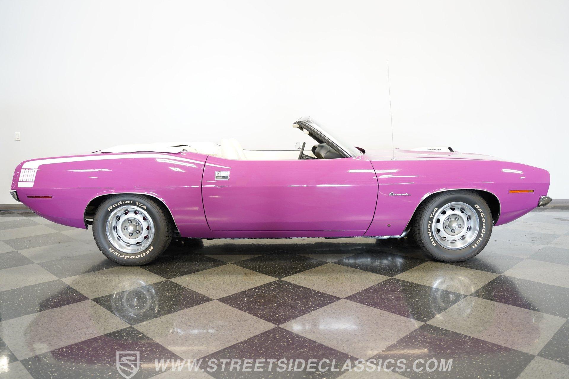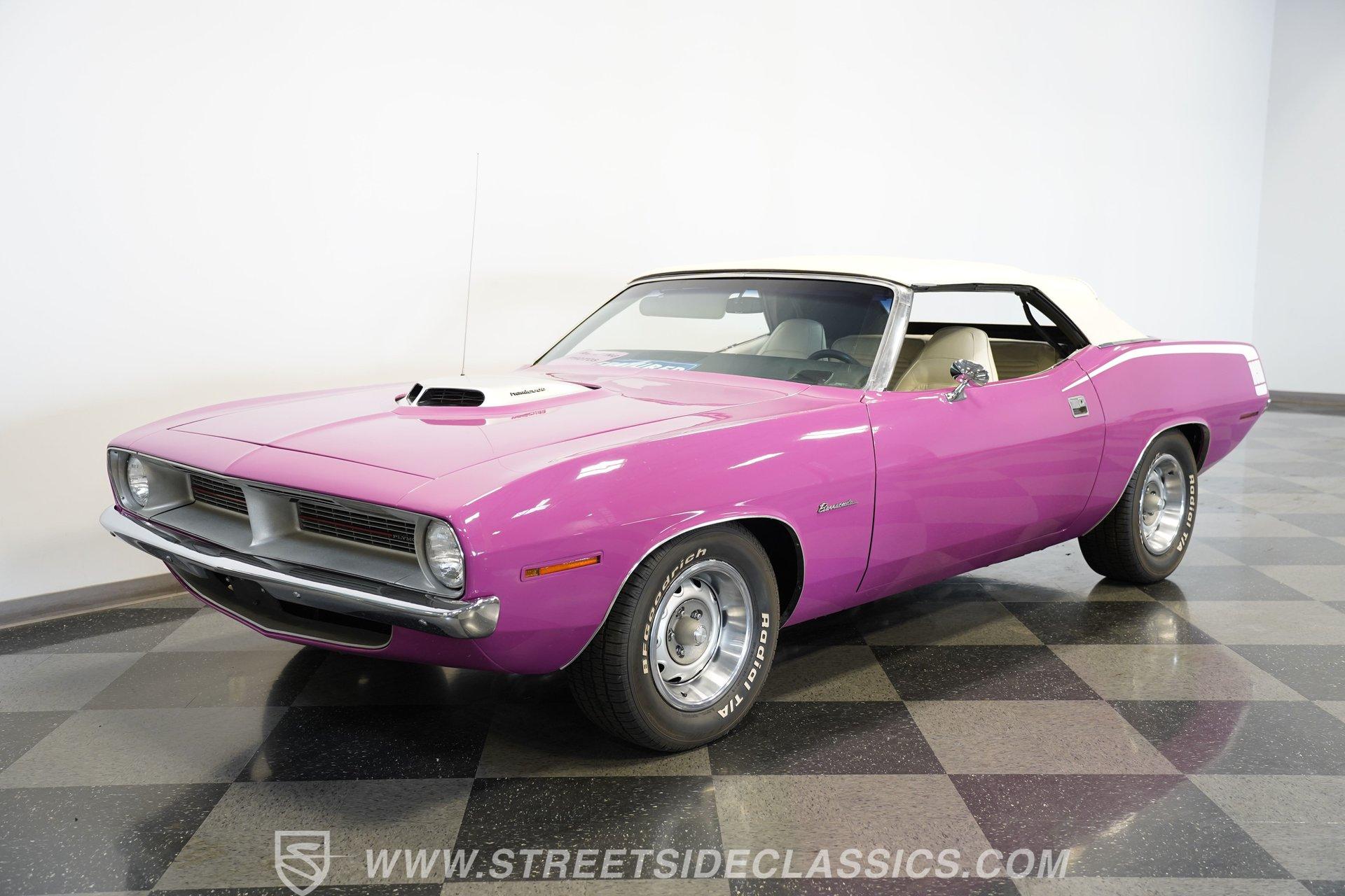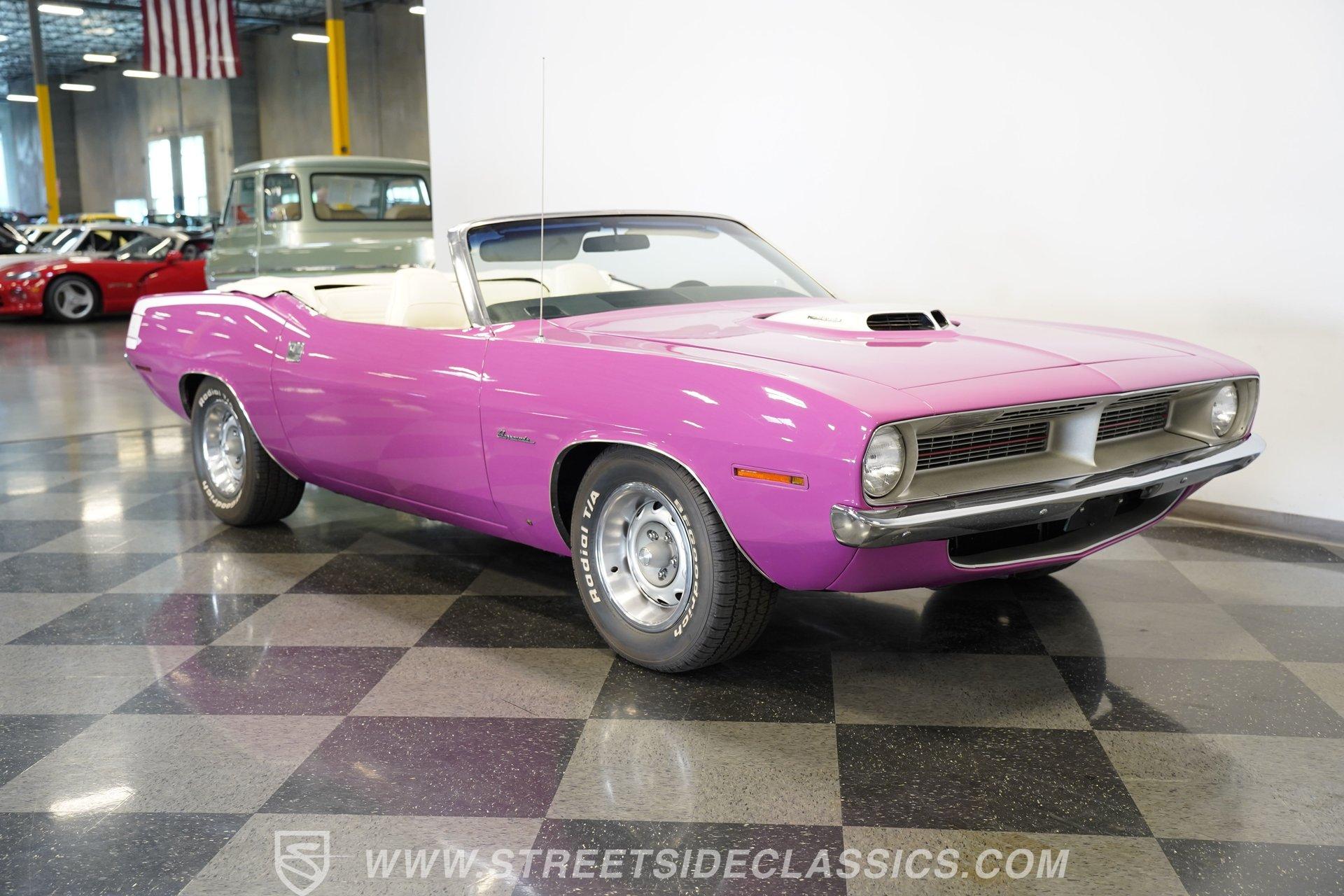 Experience the thrill and nostalgia of American muscle with this stunning 1970 Plymouth Barracuda Convertible, a true icon of its era. Painted in the rare and striking Moulin Rouge color, this 'Cuda embodies the spirit of the muscle car golden age, turning heads wherever it goes. With its bold white "HEMI" stripe and custom air scoop, it's a machine that commands attention and respect. Owning this convertible is not just about driving; it's about making a statement and creating memories that last a lifetime. This 426 Hemi-powered Barracuda Convertible invites you to embrace the power and style that only a classic muscle car can deliver. Step inside to find a clean, well-preserved interior featuring crisp white vinyl seats up front and a matching rear bench. The door panels complement the seats perfectly, creating a cohesive and stylish cabin. The carpet is in good condition, and the interior retains its factory gauge cluster and original radio, now upgraded with an auxiliary input for modern convenience. A floor-mounted shifter and "Cuda" floor mats add to the authentic muscle car ambiance, making every drive both comfortable and exhilarating. Under the hood, this Barracuda roars with a 426 Hemi V8 engine, paired with an Edelbrock single 4-barrel carburetor on an aluminum Mopar intake manifold. The power is delivered through a 4-speed #matching A833 manual transmission, providing a true hands-on driving experience. Equipped with an 8 3/4 rear axle featuring a 3.23 sure grip differential, it offers excellent traction and control. Front disc brakes and power steering enhance the handling, while the BFG Radial T/A tires ensure a smooth and confident ride. Highlights: 1970 Plymouth Barracuda Convertible Moulin Rouge Single-Year Color 426 Hemi V8 Engine Edelbrock Single 4-Barrel Carburetor Aluminum Mopar Intake Manifold 4-Speed A833 Manual Transmission Numbers-Matching 318 Engine with the sale 8 3/4 Rear Axle with 3.23 Sure Grip Front Disc and Rear Drum Brakes Power Steering White Vinyl Interior Auxiliary Input with AM/FM Radio Manual Convertible Top Full Repaint with Original Body Panels 5,013 Actual Miles Since Rebuild Financing Available Vehicle Protection Plans Available Worldwide Shipping This 1970 Plymouth Barracuda Convertible is a fantastic opportunity to own a rare and powerful muscle car that combines classic style with impressive performance. Don't miss your chance to make this iconic 'Cuda yours. Call, email, or come visit our showroom today!