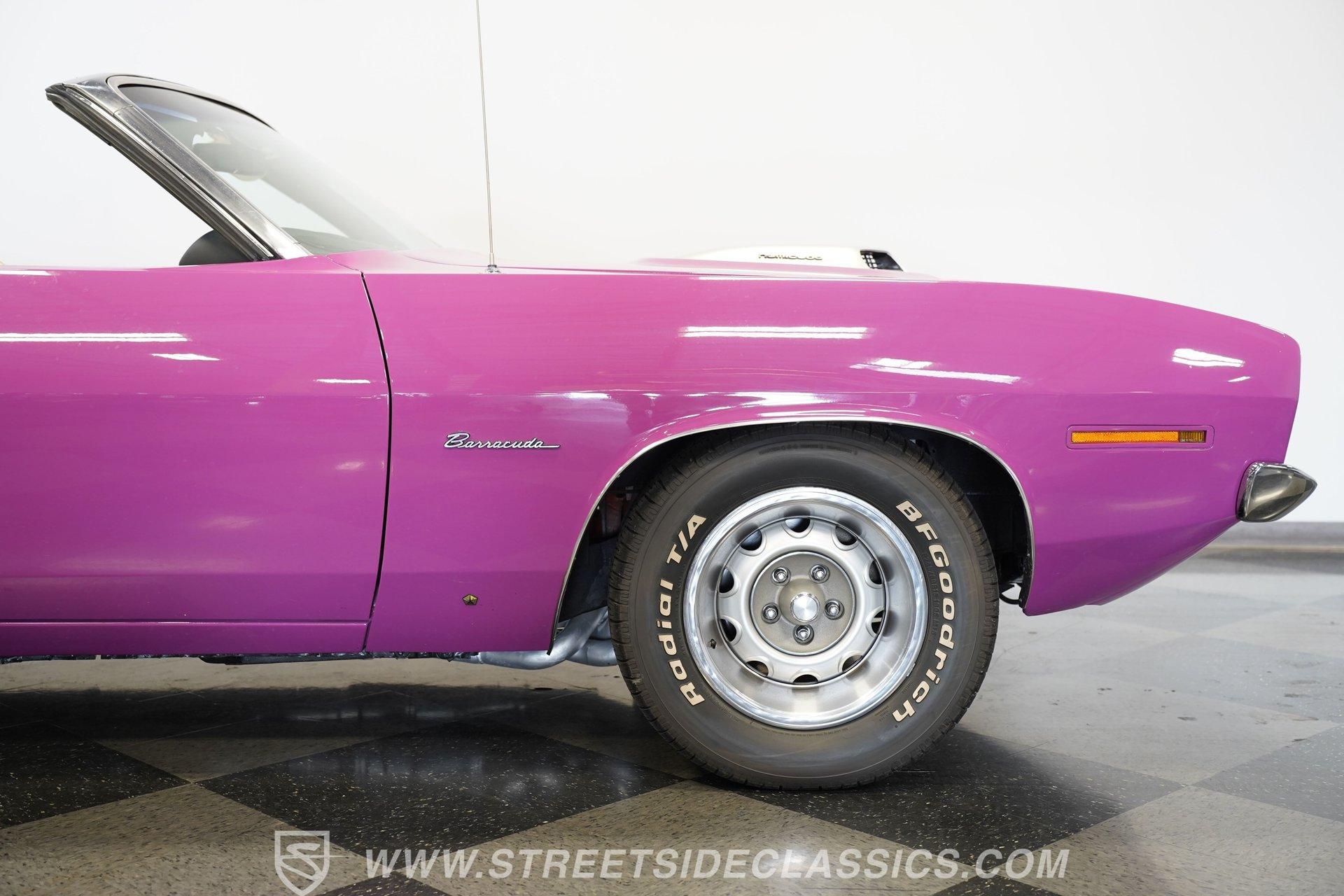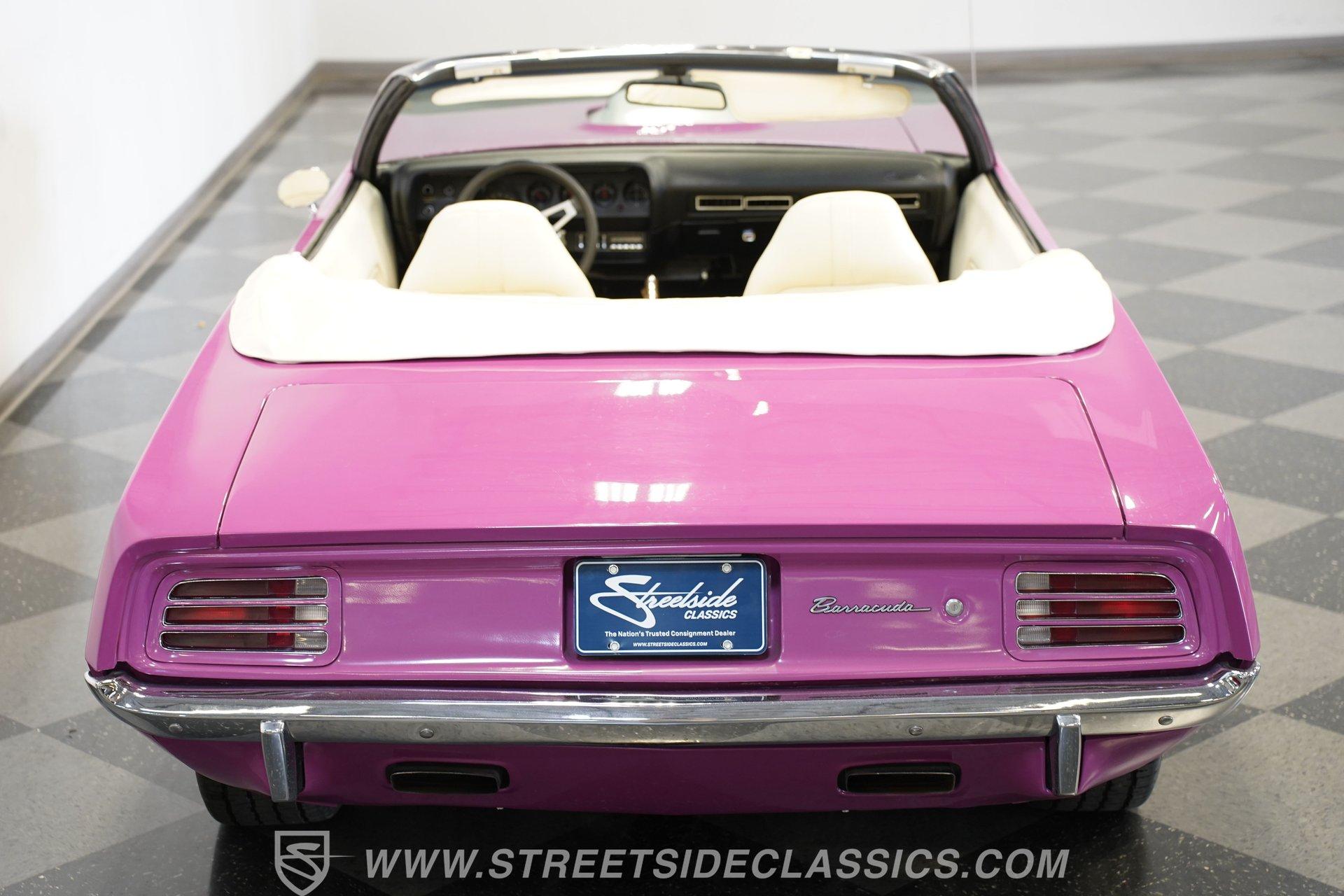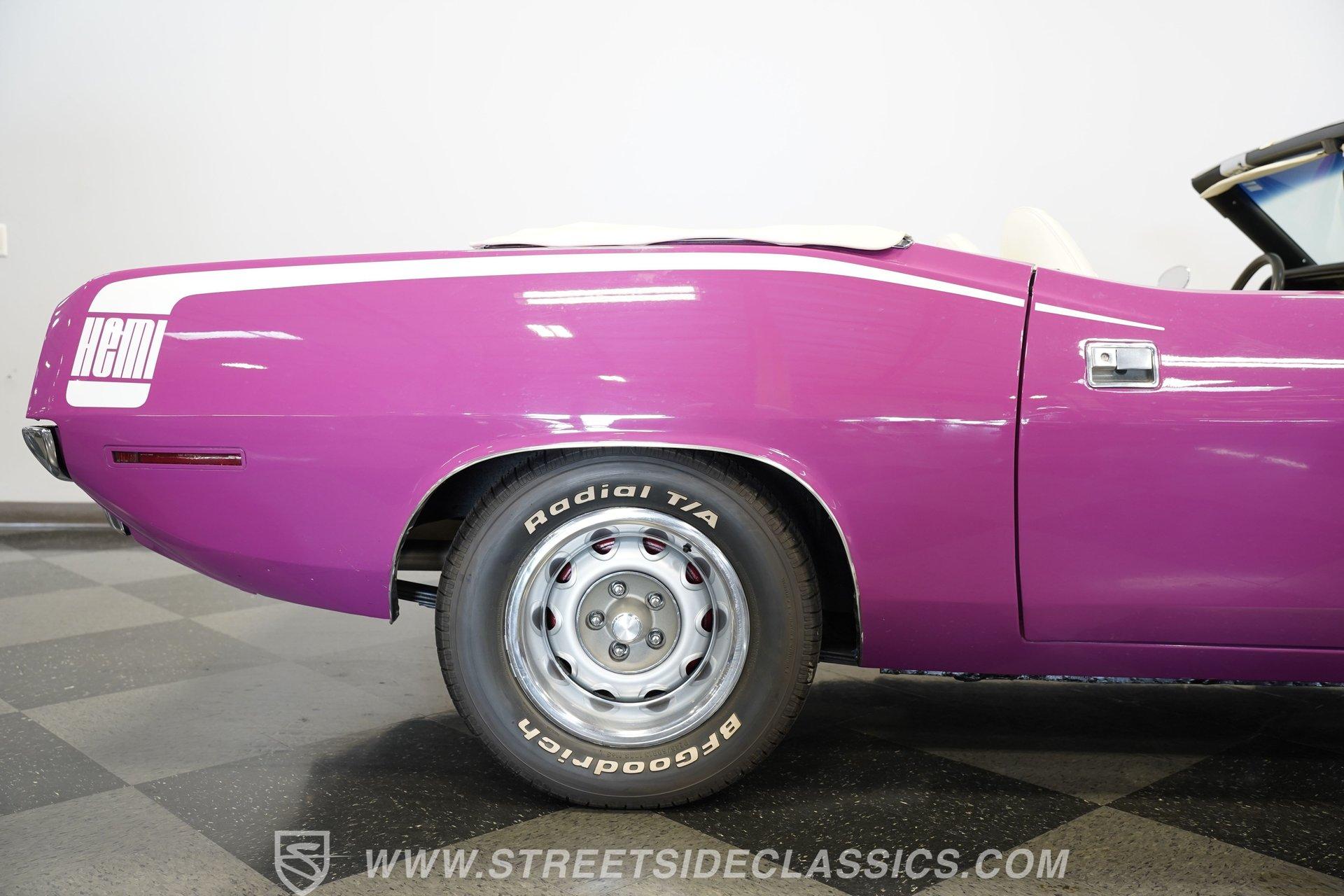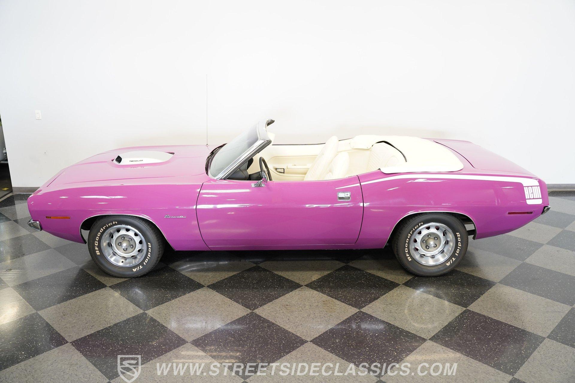 Experience the thrill and nostalgia of American muscle with this stunning 1970 Plymouth Barracuda Convertible, a true icon of its era. Painted in the rare and striking Moulin Rouge color, this 'Cuda embodies the spirit of the muscle car golden age, turning heads wherever it goes. With its bold white "HEMI" stripe and custom air scoop, it's a machine that commands attention and respect. Owning this convertible is not just about driving; it's about making a statement and creating memories that last a lifetime. This 426 Hemi-powered Barracuda Convertible invites you to embrace the power and style that only a classic muscle car can deliver. Step inside to find a clean, well-preserved interior featuring crisp white vinyl seats up front and a matching rear bench. The door panels complement the seats perfectly, creating a cohesive and stylish cabin. The carpet is in good condition, and the interior retains its factory gauge cluster and original radio, now upgraded with an auxiliary input for modern convenience. A floor-mounted shifter and "Cuda" floor mats add to the authentic muscle car ambiance, making every drive both comfortable and exhilarating. Under the hood, this Barracuda roars with a 426 Hemi V8 engine, paired with an Edelbrock single 4-barrel carburetor on an aluminum Mopar intake manifold. The power is delivered through a 4-speed #matching A833 manual transmission, providing a true hands-on driving experience. Equipped with an 8 3/4 rear axle featuring a 3.23 sure grip differential, it offers excellent traction and control. Front disc brakes and power steering enhance the handling, while the BFG Radial T/A tires ensure a smooth and confident ride. Highlights: 1970 Plymouth Barracuda Convertible Moulin Rouge Single-Year Color 426 Hemi V8 Engine Edelbrock Single 4-Barrel Carburetor Aluminum Mopar Intake Manifold 4-Speed A833 Manual Transmission Numbers-Matching 318 Engine with the sale 8 3/4 Rear Axle with 3.23 Sure Grip Front Disc and Rear Drum Brakes Power Steering White Vinyl Interior Auxiliary Input with AM/FM Radio Manual Convertible Top Full Repaint with Original Body Panels 5,013 Actual Miles Since Rebuild Financing Available Vehicle Protection Plans Available Worldwide Shipping This 1970 Plymouth Barracuda Convertible is a fantastic opportunity to own a rare and powerful muscle car that combines classic style with impressive performance. Don't miss your chance to make this iconic 'Cuda yours. Call, email, or come visit our showroom today!