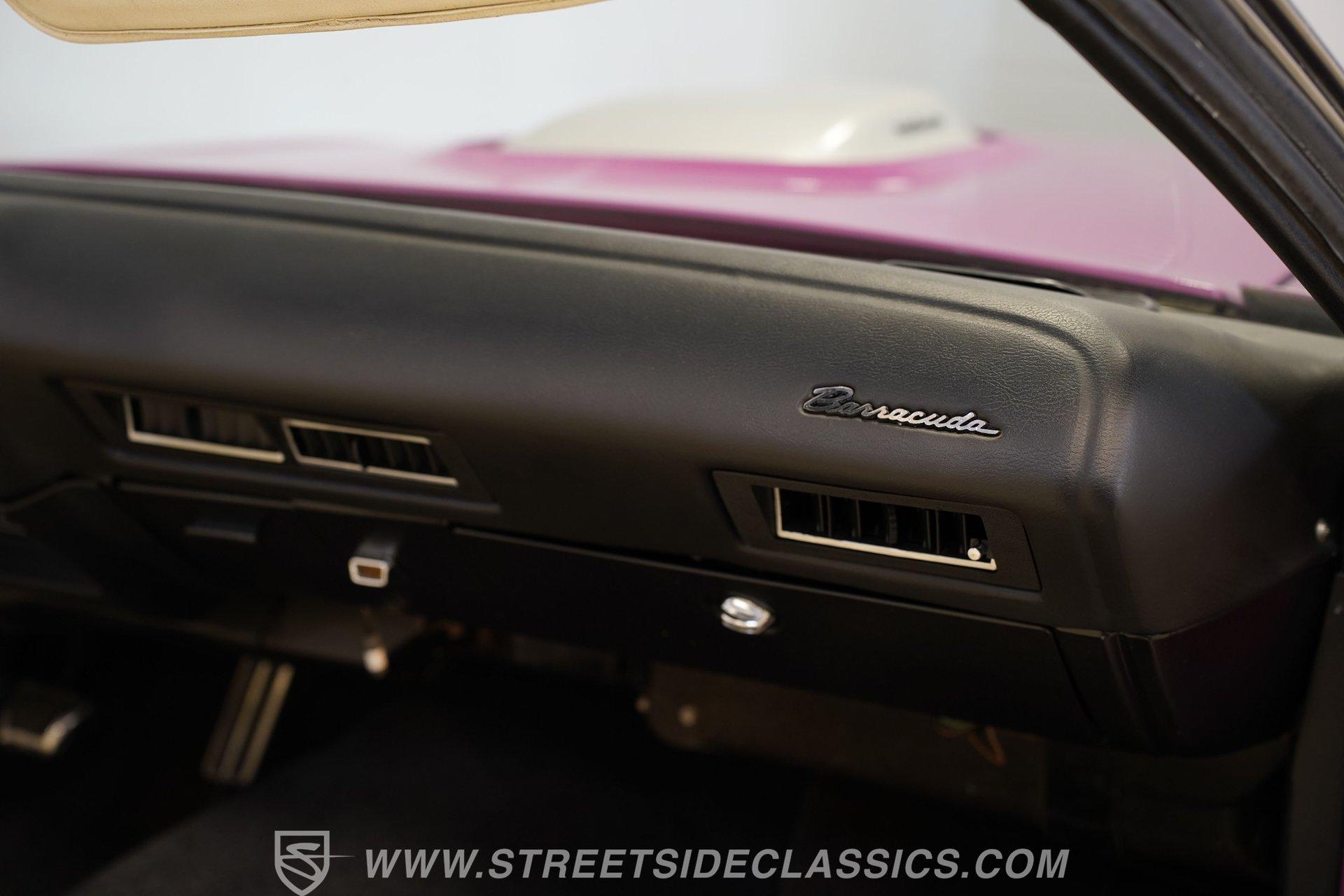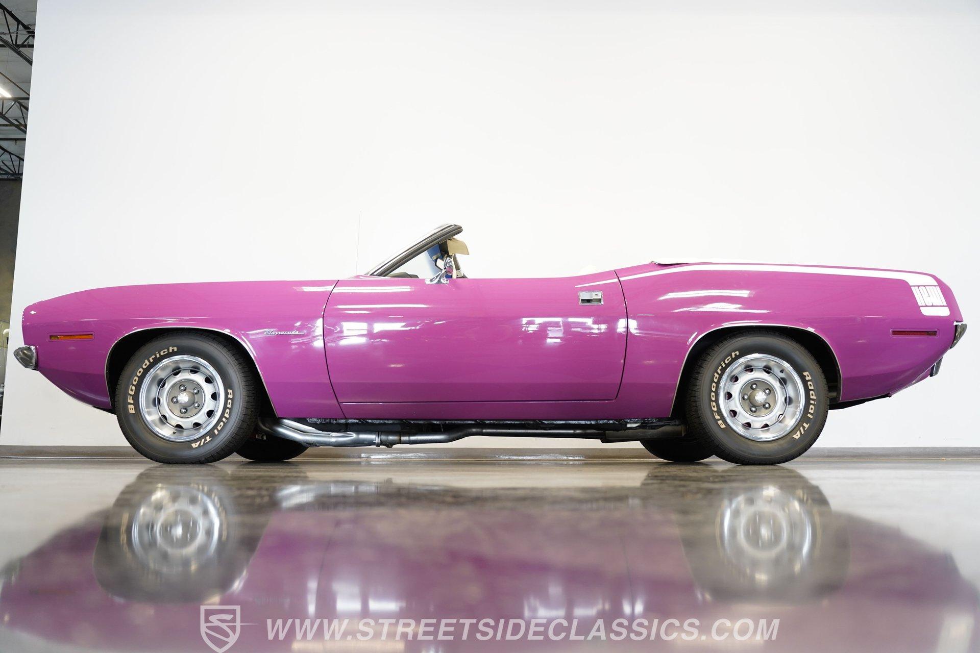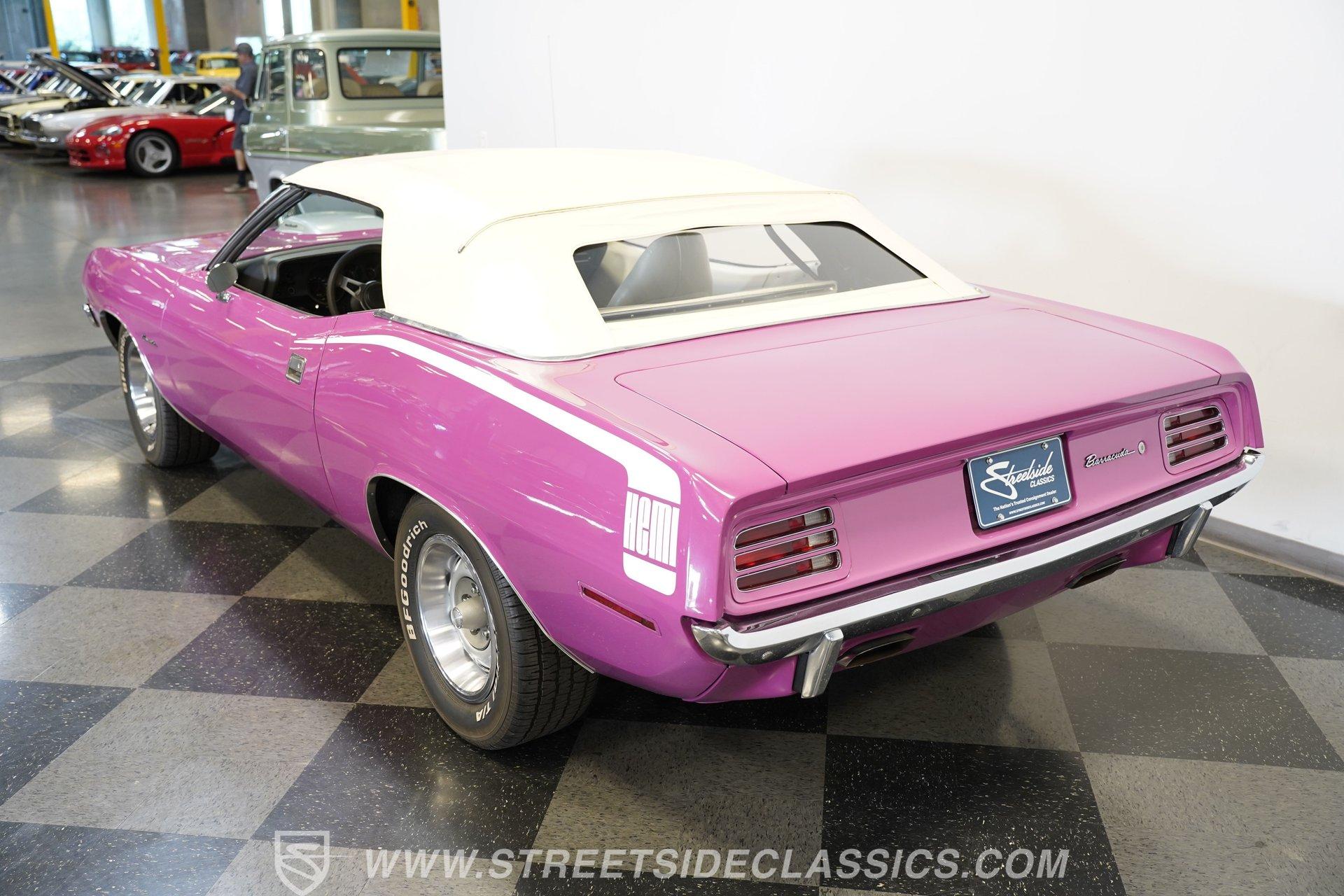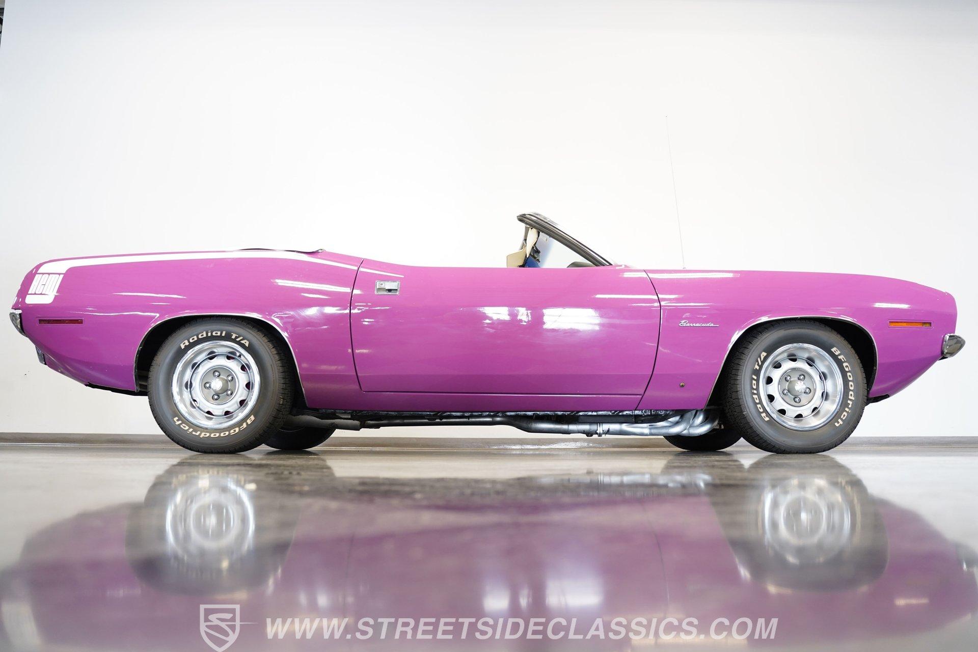 Experience the thrill and nostalgia of American muscle with this stunning 1970 Plymouth Barracuda Convertible, a true icon of its era. Painted in the rare and striking Moulin Rouge color, this 'Cuda embodies the spirit of the muscle car golden age, turning heads wherever it goes. With its bold white "HEMI" stripe and custom air scoop, it's a machine that commands attention and respect. Owning this convertible is not just about driving; it's about making a statement and creating memories that last a lifetime. This 426 Hemi-powered Barracuda Convertible invites you to embrace the power and style that only a classic muscle car can deliver. Step inside to find a clean, well-preserved interior featuring crisp white vinyl seats up front and a matching rear bench. The door panels complement the seats perfectly, creating a cohesive and stylish cabin. The carpet is in good condition, and the interior retains its factory gauge cluster and original radio, now upgraded with an auxiliary input for modern convenience. A floor-mounted shifter and "Cuda" floor mats add to the authentic muscle car ambiance, making every drive both comfortable and exhilarating. Under the hood, this Barracuda roars with a 426 Hemi V8 engine, paired with an Edelbrock single 4-barrel carburetor on an aluminum Mopar intake manifold. The power is delivered through a 4-speed #matching A833 manual transmission, providing a true hands-on driving experience. Equipped with an 8 3/4 rear axle featuring a 3.23 sure grip differential, it offers excellent traction and control. Front disc brakes and power steering enhance the handling, while the BFG Radial T/A tires ensure a smooth and confident ride. Highlights: 1970 Plymouth Barracuda Convertible Moulin Rouge Single-Year Color 426 Hemi V8 Engine Edelbrock Single 4-Barrel Carburetor Aluminum Mopar Intake Manifold 4-Speed A833 Manual Transmission Numbers-Matching 318 Engine with the sale 8 3/4 Rear Axle with 3.23 Sure Grip Front Disc and Rear Drum Brakes Power Steering White Vinyl Interior Auxiliary Input with AM/FM Radio Manual Convertible Top Full Repaint with Original Body Panels 5,013 Actual Miles Since Rebuild Financing Available Vehicle Protection Plans Available Worldwide Shipping This 1970 Plymouth Barracuda Convertible is a fantastic opportunity to own a rare and powerful muscle car that combines classic style with impressive performance. Don't miss your chance to make this iconic 'Cuda yours. Call, email, or come visit our showroom today!