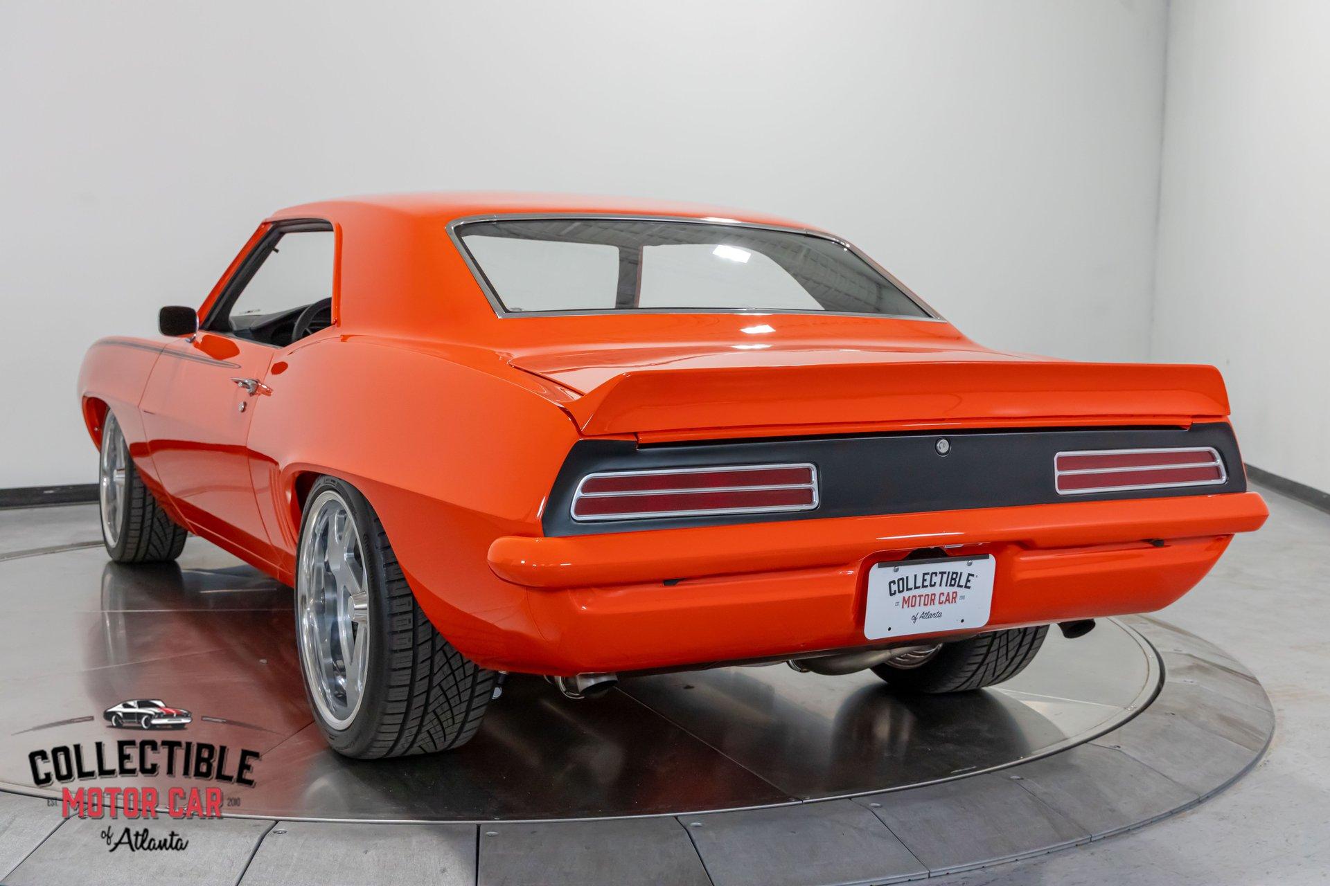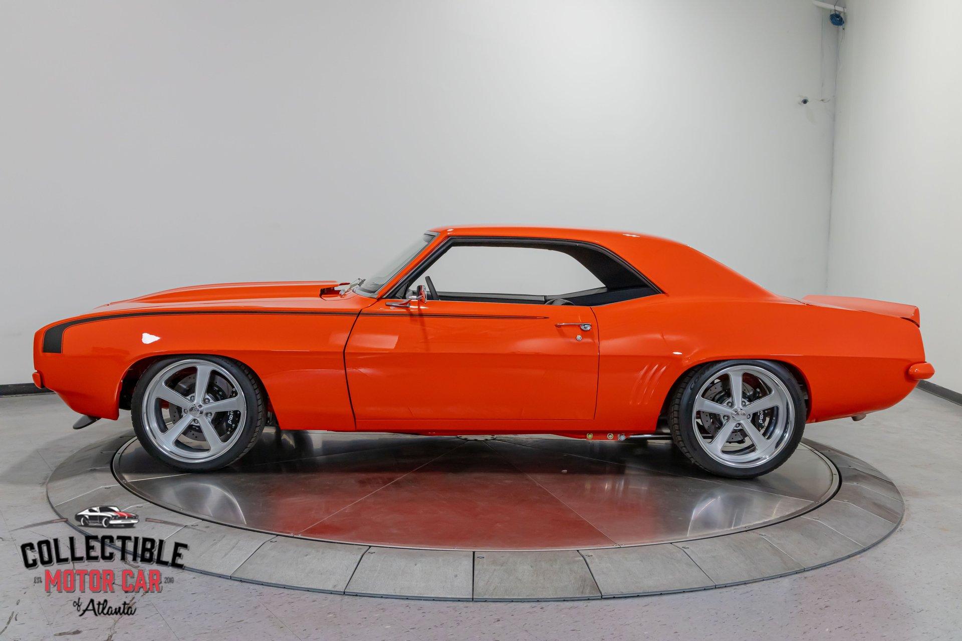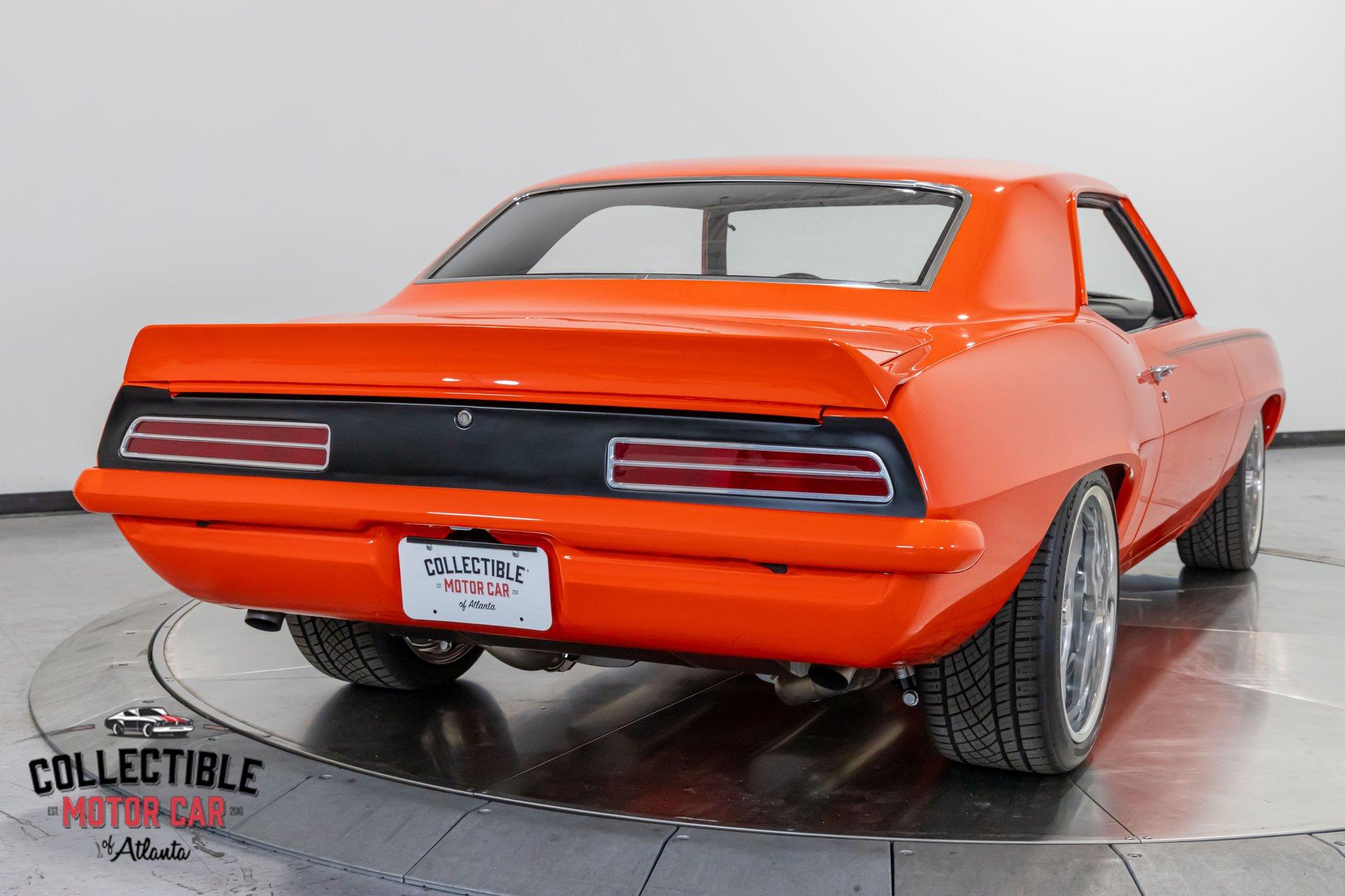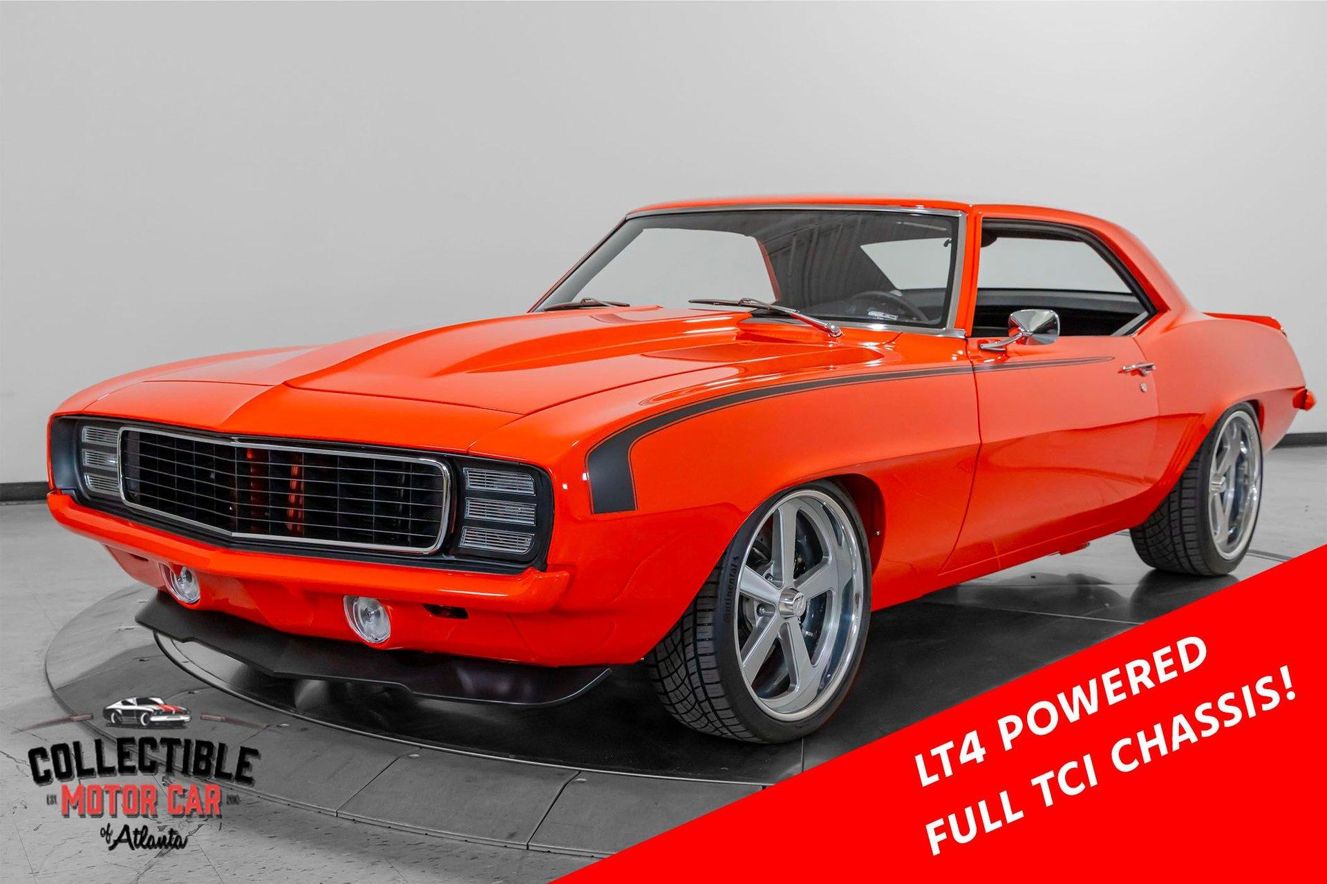 ? 1969 Chevrolet Camaro Restomod – LT4-Powered, No-Expense-Spared Masterpiece ? Offered by Collectible Motorcar of Atlanta Introducing one of the most exceptional first-gen Camaros to hit the market — a nine-year, no-expense-spared build that merges timeless design with cutting-edge performance. Beneath its iconic Hugger Orange finish lies a supercharged LT4 crate engine, a Tremec Magnum 6-speed, and a custom chassis engineered for total domination. This is not just a restomod. This is a statement. ? Power Meets Precision Under the hood is a Chevrolet Performance LT4 crate engine — the same supercharged monster found in the C7 Z06 — producing a jaw-dropping 650 horsepower and 650 lb-ft of torque. 6.2L Supercharged LT4 V8 (10:1 compression, Eaton TVS 1.7L blower) GM Rotocast heads with titanium valves Drive Junky serpentine system DeWitts radiator, SPAL fans, C&R heat exchanger Custom large-diameter exhaust with X-pipe and turbo mufflers Billet detailing and color-keyed closeout panel The LT4 feeds into a Tremec T56 Magnum 6-speed manual, connected to a 9-inch rear axle via a Coleman Racing aluminum driveshaft, ensuring this car can put every bit of power to the pavement reliably and confidently. ? Engineered to Handle This Camaro isn’t just fast — it’s surgically sharp: TCI tubular front clip (120 lbs lighter than stock) 4-link rear suspension QA1 adjustable coilovers front and rear Wilwood 4-wheel power disc brakes (6-piston front, 4-piston rear) Power rack-and-pinion steering Rick’s stainless fuel tank with Aeromotive pump 19” Intro wheels wrapped in BFGoodrich g-Force tires (255/35ZR19 front, 285/35ZR19 rear) The entire chassis is reinforced with TCI subframe connectors, making this F-body feel tight, planted, and modern — while retaining the aggressive, analog feel you crave. ? Luxury Meets Legacy Inside, the cabin is a masterclass in custom craftsmanship and modern convenience. Wrapped in premium leather and LED ambient lighting, every surface has been thoughtfully executed: Custom fiberglass dash and console Touchscreen Bluetooth JVC head unit Vintage Air with automatic climate control Push-button start, tilt column, billet steering wheel Power windows, power door locks, keyless entry JBL processor, dual Kicker amps, multiple Kicker speakers Custom headliner, sills, foot pedals, and an integrated backup camera This interior isn’t just built for the driver — it’s a full sensory experience, combining show-car detail with daily-driver usability. ? Final Details Hugger Orange two-stage paint with black hockey stripes Shaved bumpers, billet lights, and Detroit Speed RS headlight system Seamless roll pan, painted drip rails, and cowl hood All vehicles from Collectible Motorcar of Atlanta receive a comprehensive, multi-point inspection We can arrange shipment of your purchase anywhere in the world ? Why This Car? Owning a classic Camaro is special. Owning one that’s been built to this standard, with a modern LT4 heart, a race-ready chassis, and a show-stopping interior, puts you in a league of your own. Whether you’re a collector, a weekend warrior, or someone who simply appreciates the best — this is the car that ends the search. ? Call us today at Collectible Motorcar of Atlanta to schedule your private showing or to discuss transportation to your garage. Don’t miss your chance to own one of the most exhilarating, high-end Camaros ever built.