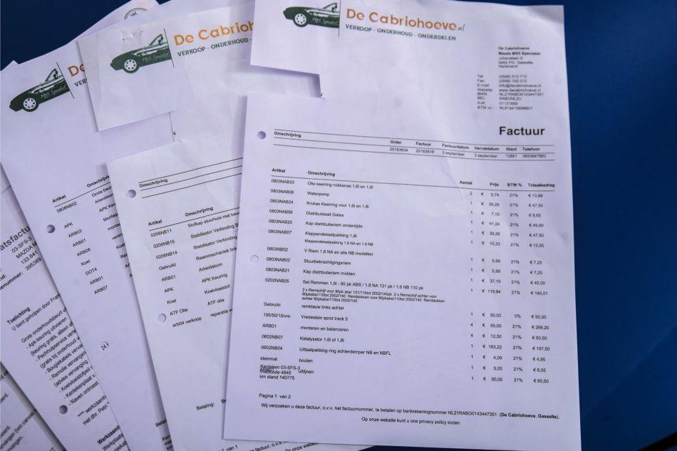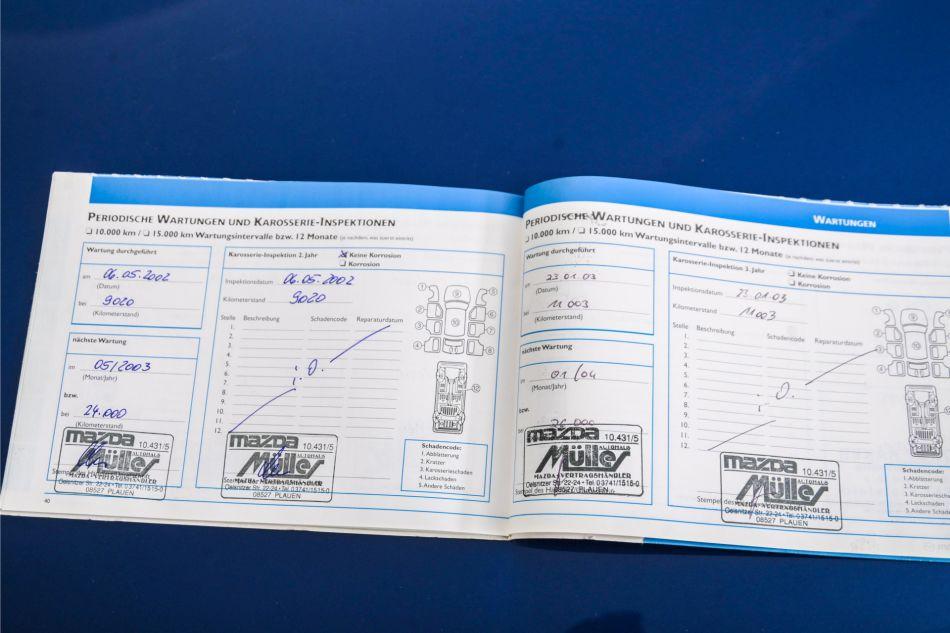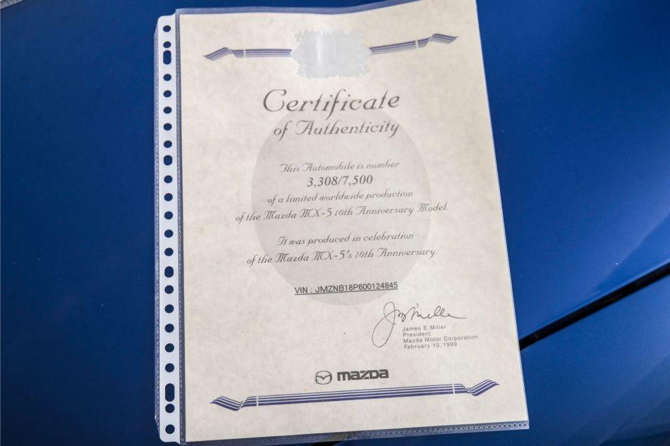 The world-famous second-generation Mazda MX-5 in probably the most beautiful edition! In honour of the tenth anniversary that the Mazda MX-5 could celebrate, the 10th Anniversary edition was released in an edition of 7500 of which this example is number 3308. All were finished in dark blue metallic paint and a luxurious interior with seat covers in half leather and half suede. Under the bonnet is the familiar 1800 cc powerplant good for 140 hp and connected to a 6-speed manual gearbox. Standard with the 10 The Anniversary package , the suspension was fitted with Bilstein shock absorbers. The whole makes a thoroughbred roadster with low weight and rear-wheel drive but very complete and luxuriously equipped. Equipped with the original chrome alloy wheels and extensive service history. Handling on the road is grandiose and extremely stable, a lovely young timer !
