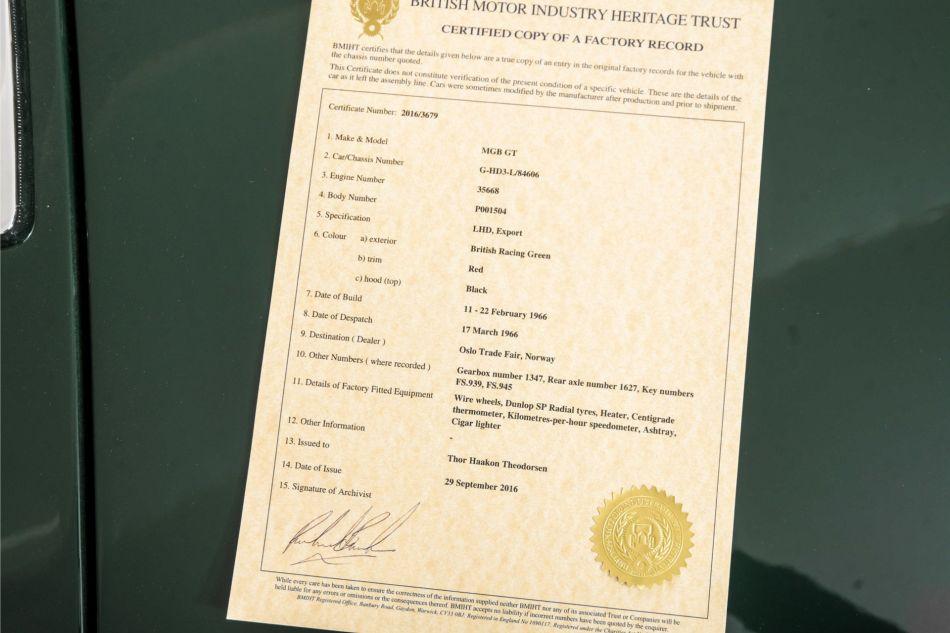This MGB GT is from the 1st generation 1965-1967, with the beautiful steel dashboard. The car combines sporty performance with the practicality of a coupe. With its timeless Pininfarina design, reliable 1.8-litre engine, overdrive gearbox and with rear-wheel drive, it offers a pure and lively driving experience. The stylish interior, distinctive clocks and extra luggage space make this classic both elegant and functional. The car comes in the beautiful colour British Racing green, the interior is finished with red leather upholstery. Factory-fitted with wire wheels, the car was fitted with a beautiful wooden Motolita steering wheel by the last owner. A true English sports car, ideal for enthusiasts looking for a reliable classic with charm and ease of use.