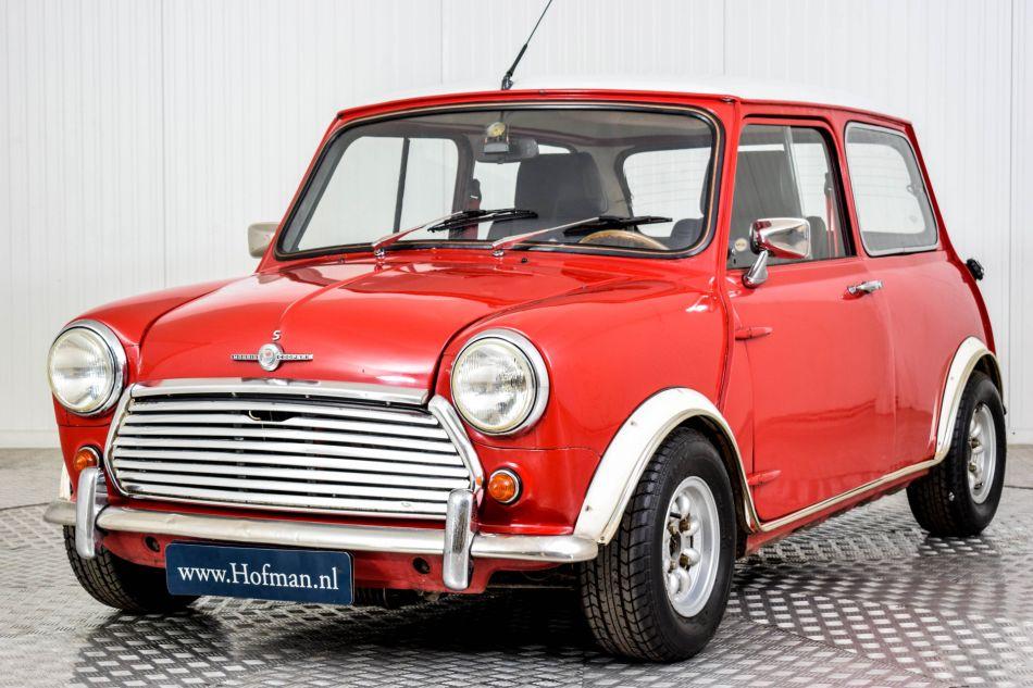 Neat Mini Cooper 1300 S replica, equipped with the very rare option hydrolastic suspension, low rust and tax free. With disc brakes, alloy wheels , leather sports seats. From 1964 to 1971, Minis had the Alex Moulton-designed hydrolastic suspension system. After that, mainly for cost reasons, they went back to the original rubber elements for the suspension.