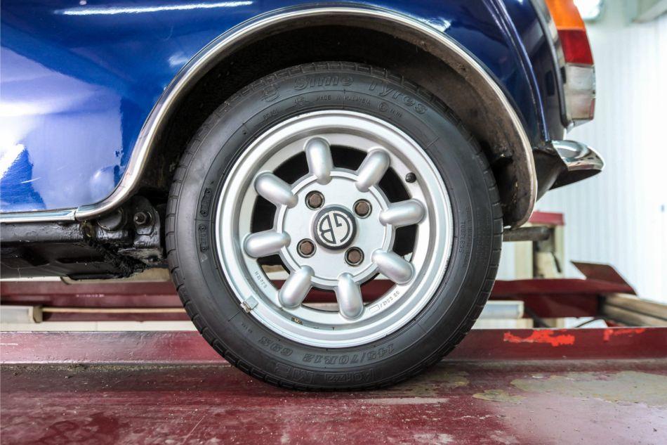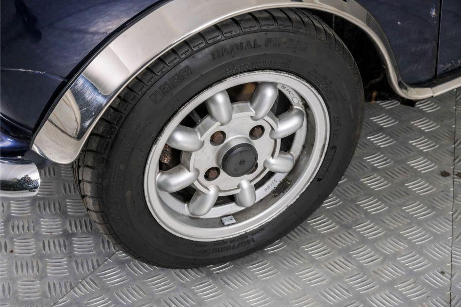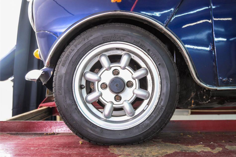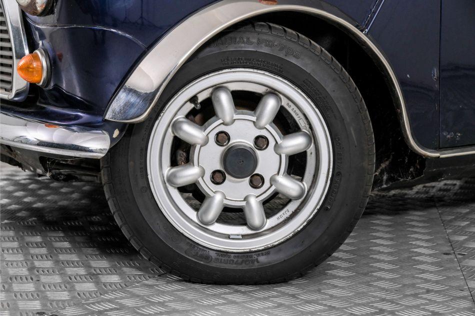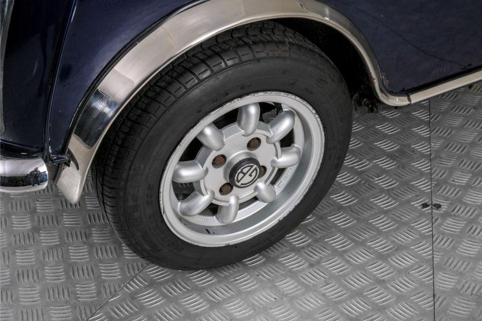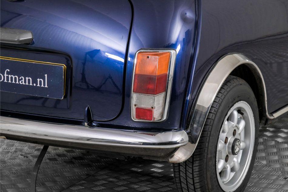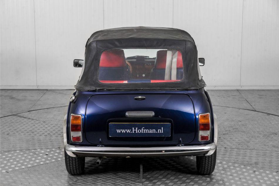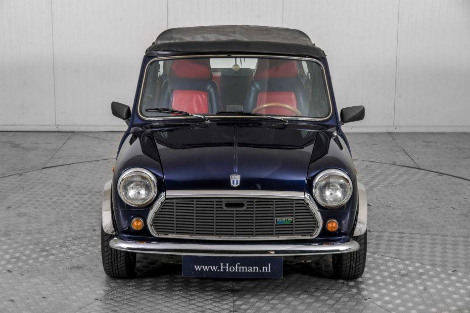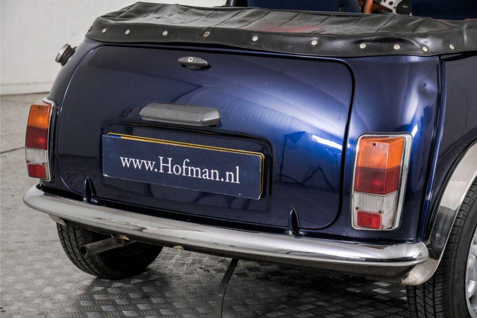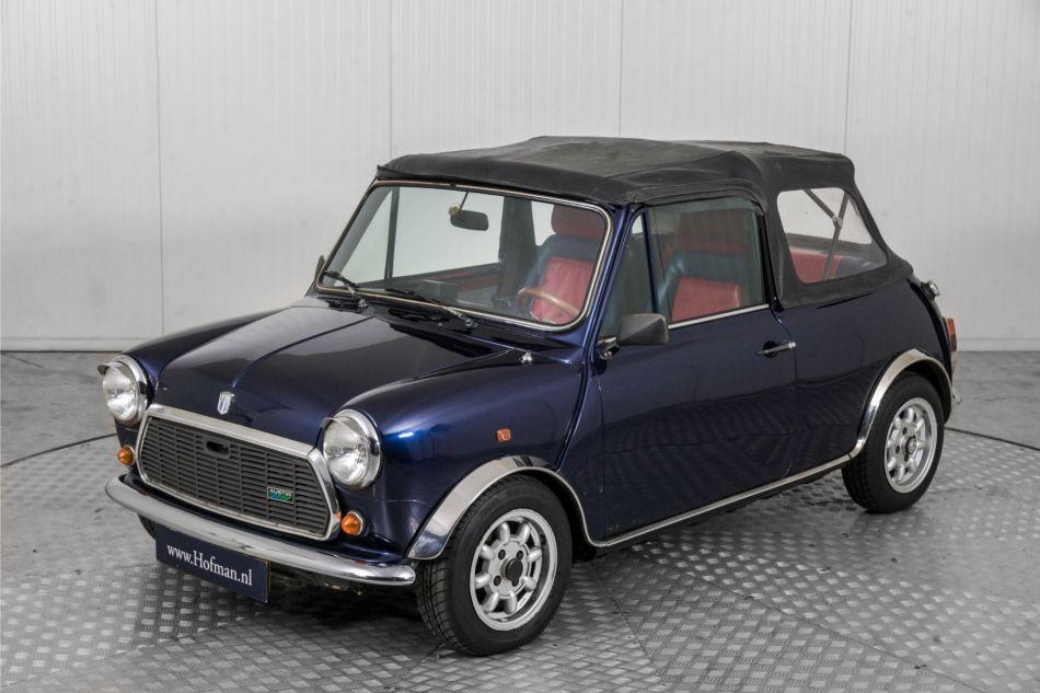 For sale Mini 1000 convertible. Nice and sporty dressed 1986 Mini Classic Convertible. Concerns a nice appearance due to the blue metallic paint and two-coloured interior. Equipped with 12-inch Minilite rims. Together with the chrome wing extensions, it gets a cool look. The interior features a beautiful wooden dashboard. A wooden sports steering wheel and wooden gear stick were also installed. The mini drives well and the driving experience with an open roof is to be enjoyed! Neatly converted to convertible in the past and approved by the RDW. The Mini 1000 HLE was updated in 1983 and came standard with disc brakes on the front wheels and had a longer transmission in the gearbox for comfortable and quieter cruising.