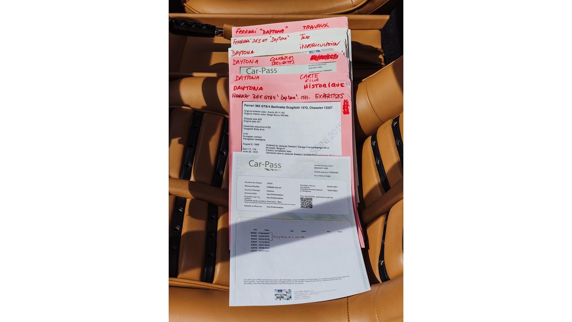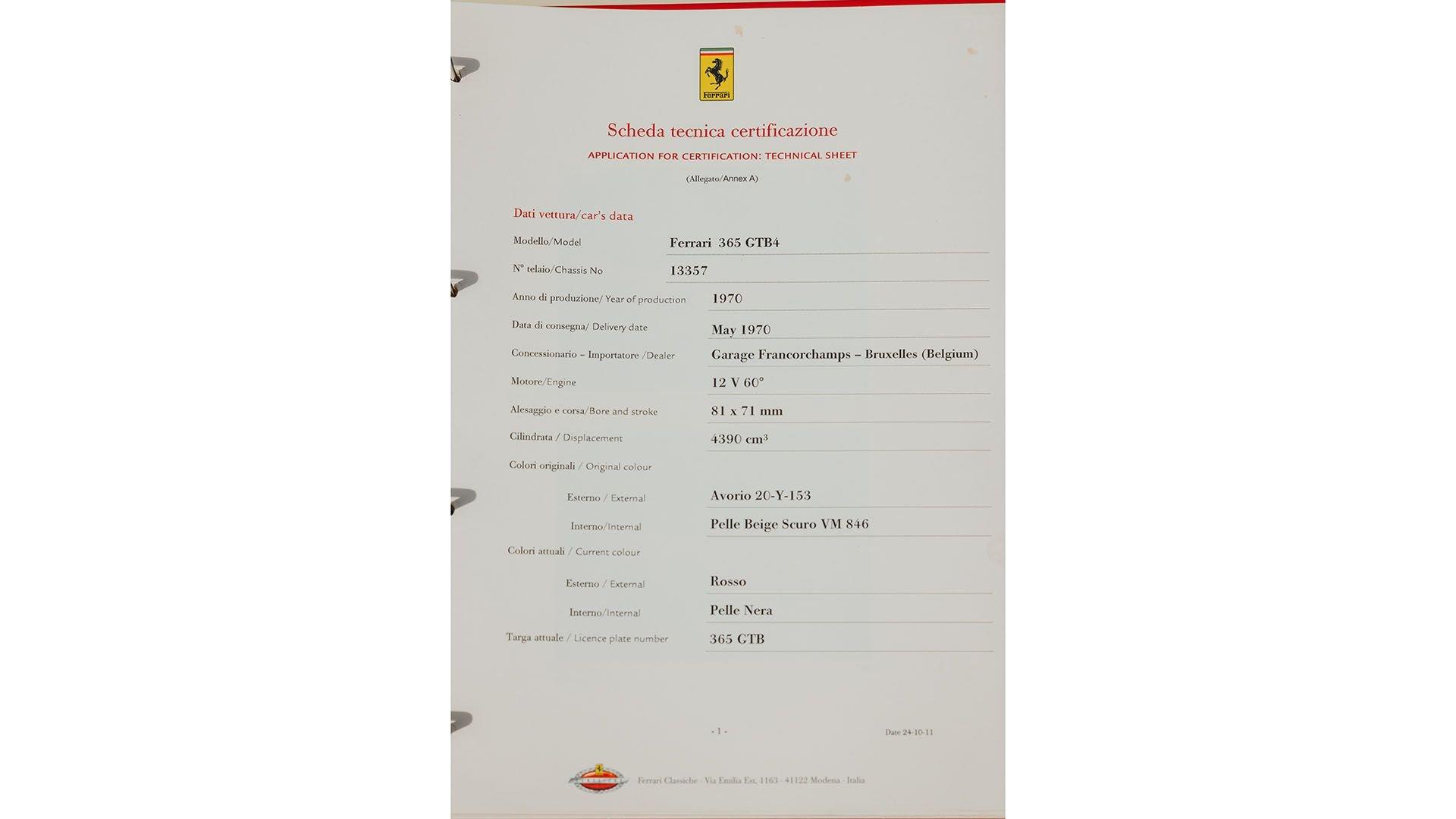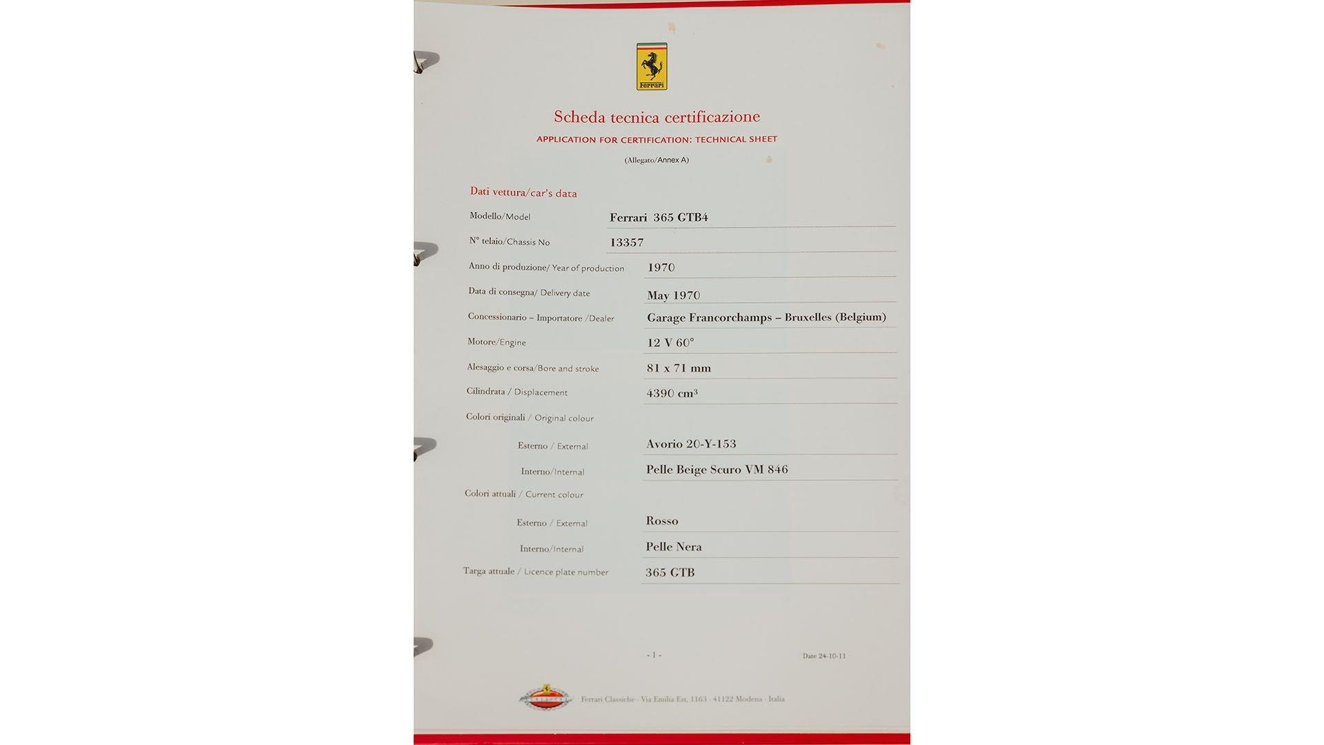 Engine No. B 262 Ferrari publicly introduced the 365 GTB/4 “Daytona” in the autumn of 1968—but this announcement was preceded by three prototypes featuring varying design cues. While the first two prototypes, chassis 10287 and 11001, featured a frontal treatment resembling its 275 GTB/4 predecessor—exhibiting the classic oval eggcrate grille and covered headlamps—the final prototype and the definitive production model debuted a much more radical design. Penned by Leonardo Fioravanti, the Daytona’s Scaglietti-built body featured an expansive hood section that swept down into a wedge-shaped, full-width Plexiglas panel covering fixed headlights. This dramatic pinstripe effect extended into the side indicator assemblies and around the leading edges of the front wings—a now-iconic styling detail recently revived in Ferrari’s latest V12 flagship, the 12Cilindri. At the rear, a set-back cabin flowed into a steeply-raked fastback profile punctuated by a Kamm tail. The result was a stunning conclusion to a legendary lineage of short-block Colombo V12-powered Ferraris, and the last flagship model produced before Fiat assumed control of the production of Ferrari road cars in 1969. Unfortunately, the Daytona’s original Plexiglas nose treatment only enjoyed a brief moment in the sun before it became the target of the U.S. Federal Safety Standards of the late 1960s. Among other things, the new regulations resulted in the covered headlamp arrangement being replaced by paired retractable units in mid-1971—an alteration made in all markets for the sake of uniformity. Therefore, approximately 400 of 1,406 total GTB/4 and GTS/4 Daytonas produced—affectionately named “Plexi” Daytonas—are estimated to have left Maranello before the change took effect, made even more rare by the fact that some Plexi cars were later converted to a retractable configuration. This Belgian-delivery example, completed on 17 April 1970, is one of these desirable early Plexi Daytonas. Chassis number 13357 is further distinguished as one of a mere two examples finished in the exceedingly rare shade of Avorio (Ivory) paintwork according to Ferrari historian Marcel Massini, which was paired with a Beige Scuro Connolly leather interior. Chassis 13357 was delivered on 25 June 1970 to Jacques Swaters’ Garage Francorchamps SA in Brussels, selling later that year to its first owner. By the early 1980s, the car passed to its second Belgian owner—a member of Ferrari Club Belgio and the Daytona’s sole caretaker for the next three decades. In this ownership, chassis 13357 was restored in 2006 by Carrozzeria Francorchamps in Zaventem, Belgium, which saw the car refinished in red with a black interior. The berlinetta was subsequently submitted for Ferrari Classiche certification which it received in October 2011, with its “Red Book” noting that the car retains its original, matching-numbers Tipo 251 Colombo V12 engine and a correct-type transaxle. The car passed to the current caretaker in 2015, and after ten years of enjoyment, in early 2025, the Daytona was desirably returned to its original Avorio over Beige Scuro leather with Nero inserts under the supervision of Gipimotor in Evere, Belgium. The bare-metal respray was entrusted to Carrozzeria Piemontaise in Evere while a full re-trimming of the interior was undertaken by the artisans at Interni Auto Maieli in Mantua, Italy. Today, chassis 13357 emerges as one of the most compelling examples of Ferrari's iconic Daytona, combining the coveted early "Plexi" nose configuration with this exceptionally rare factory color combination—a specification shared by only one other example. With its matching-numbers engine, Ferrari Classiche certification, documented ownership by just three Belgian owners, and concours-level restoration to original specification, this Daytona exemplifies the perfect intersection of rarity, authenticity, and intriguing motorsport heritage in one of the most defining sports cars of the era.