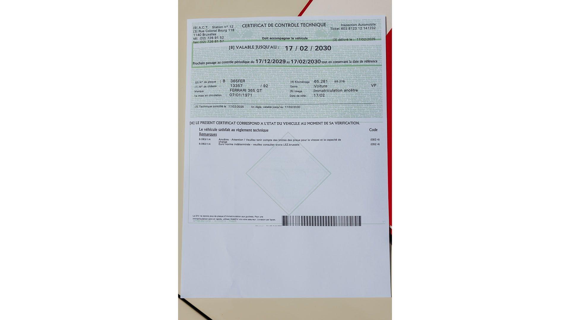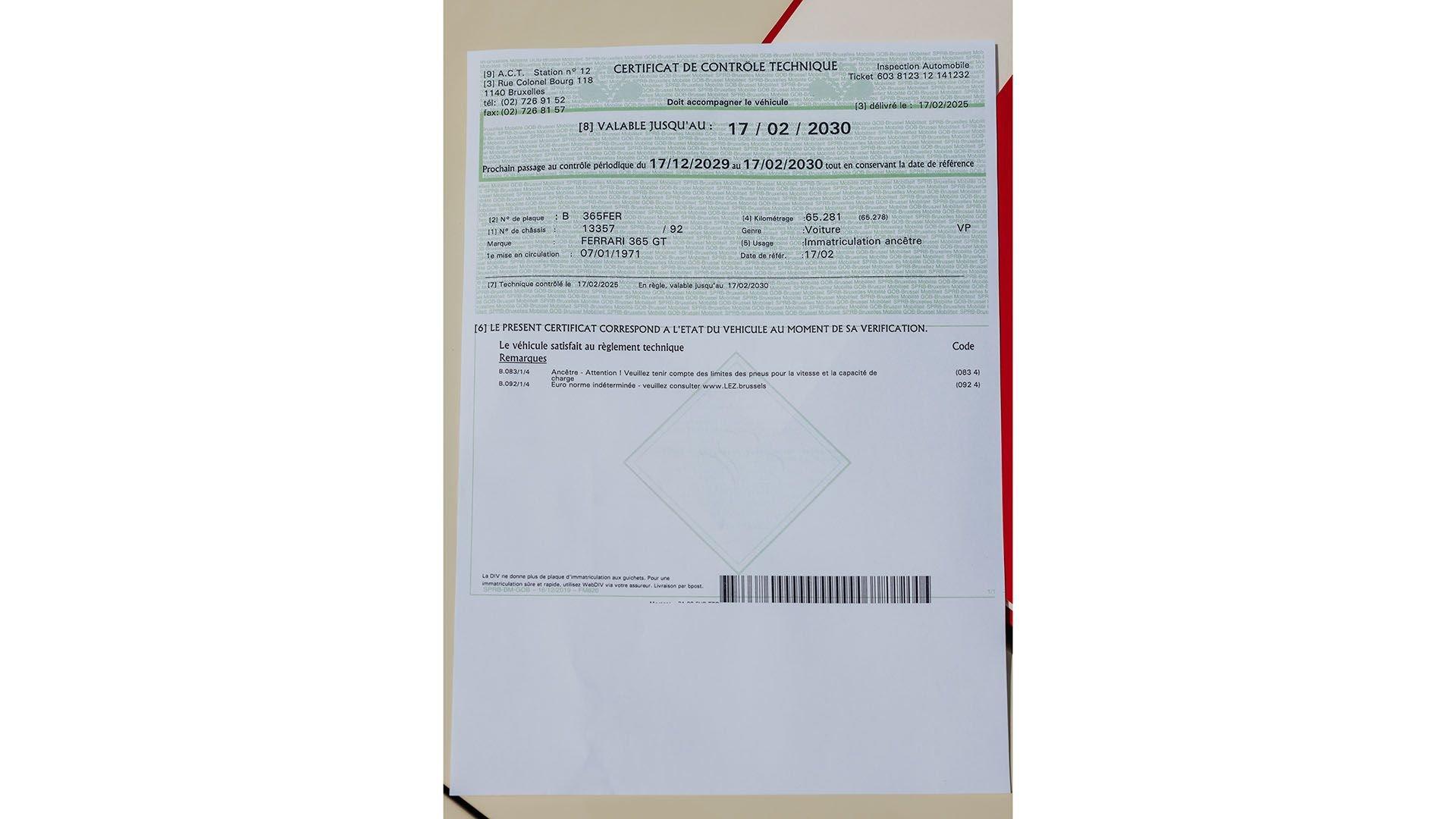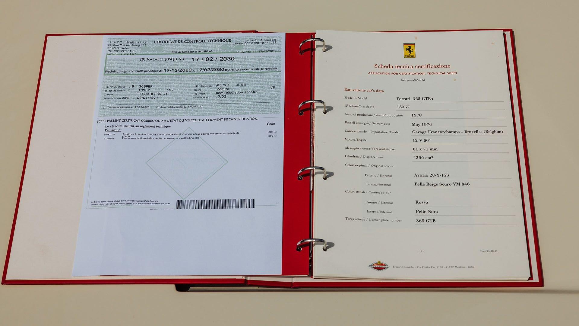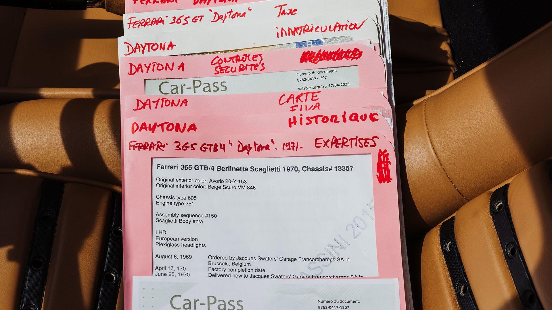 Engine No. B 262 Ferrari publicly introduced the 365 GTB/4 “Daytona” in the autumn of 1968—but this announcement was preceded by three prototypes featuring varying design cues. While the first two prototypes, chassis 10287 and 11001, featured a frontal treatment resembling its 275 GTB/4 predecessor—exhibiting the classic oval eggcrate grille and covered headlamps—the final prototype and the definitive production model debuted a much more radical design. Penned by Leonardo Fioravanti, the Daytona’s Scaglietti-built body featured an expansive hood section that swept down into a wedge-shaped, full-width Plexiglas panel covering fixed headlights. This dramatic pinstripe effect extended into the side indicator assemblies and around the leading edges of the front wings—a now-iconic styling detail recently revived in Ferrari’s latest V12 flagship, the 12Cilindri. At the rear, a set-back cabin flowed into a steeply-raked fastback profile punctuated by a Kamm tail. The result was a stunning conclusion to a legendary lineage of short-block Colombo V12-powered Ferraris, and the last flagship model produced before Fiat assumed control of the production of Ferrari road cars in 1969. Unfortunately, the Daytona’s original Plexiglas nose treatment only enjoyed a brief moment in the sun before it became the target of the U.S. Federal Safety Standards of the late 1960s. Among other things, the new regulations resulted in the covered headlamp arrangement being replaced by paired retractable units in mid-1971—an alteration made in all markets for the sake of uniformity. Therefore, approximately 400 of 1,406 total GTB/4 and GTS/4 Daytonas produced—affectionately named “Plexi” Daytonas—are estimated to have left Maranello before the change took effect, made even more rare by the fact that some Plexi cars were later converted to a retractable configuration. This Belgian-delivery example, completed on 17 April 1970, is one of these desirable early Plexi Daytonas. Chassis number 13357 is further distinguished as one of a mere two examples finished in the exceedingly rare shade of Avorio (Ivory) paintwork according to Ferrari historian Marcel Massini, which was paired with a Beige Scuro Connolly leather interior. Chassis 13357 was delivered on 25 June 1970 to Jacques Swaters’ Garage Francorchamps SA in Brussels, selling later that year to its first owner. By the early 1980s, the car passed to its second Belgian owner—a member of Ferrari Club Belgio and the Daytona’s sole caretaker for the next three decades. In this ownership, chassis 13357 was restored in 2006 by Carrozzeria Francorchamps in Zaventem, Belgium, which saw the car refinished in red with a black interior. The berlinetta was subsequently submitted for Ferrari Classiche certification which it received in October 2011, with its “Red Book” noting that the car retains its original, matching-numbers Tipo 251 Colombo V12 engine and a correct-type transaxle. The car passed to the current caretaker in 2015, and after ten years of enjoyment, in early 2025, the Daytona was desirably returned to its original Avorio over Beige Scuro leather with Nero inserts under the supervision of Gipimotor in Evere, Belgium. The bare-metal respray was entrusted to Carrozzeria Piemontaise in Evere while a full re-trimming of the interior was undertaken by the artisans at Interni Auto Maieli in Mantua, Italy. Today, chassis 13357 emerges as one of the most compelling examples of Ferrari's iconic Daytona, combining the coveted early "Plexi" nose configuration with this exceptionally rare factory color combination—a specification shared by only one other example. With its matching-numbers engine, Ferrari Classiche certification, documented ownership by just three Belgian owners, and concours-level restoration to original specification, this Daytona exemplifies the perfect intersection of rarity, authenticity, and intriguing motorsport heritage in one of the most defining sports cars of the era.
