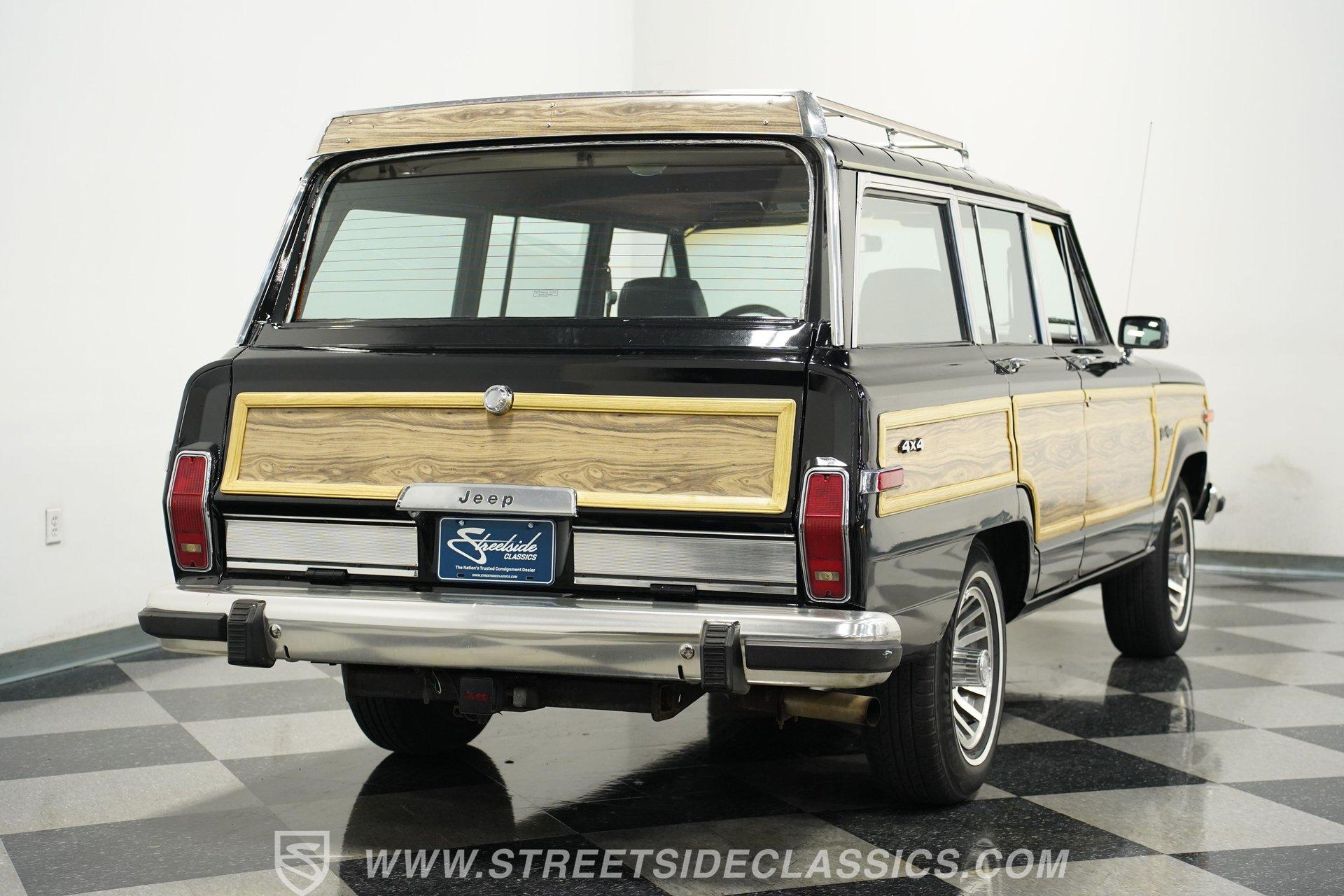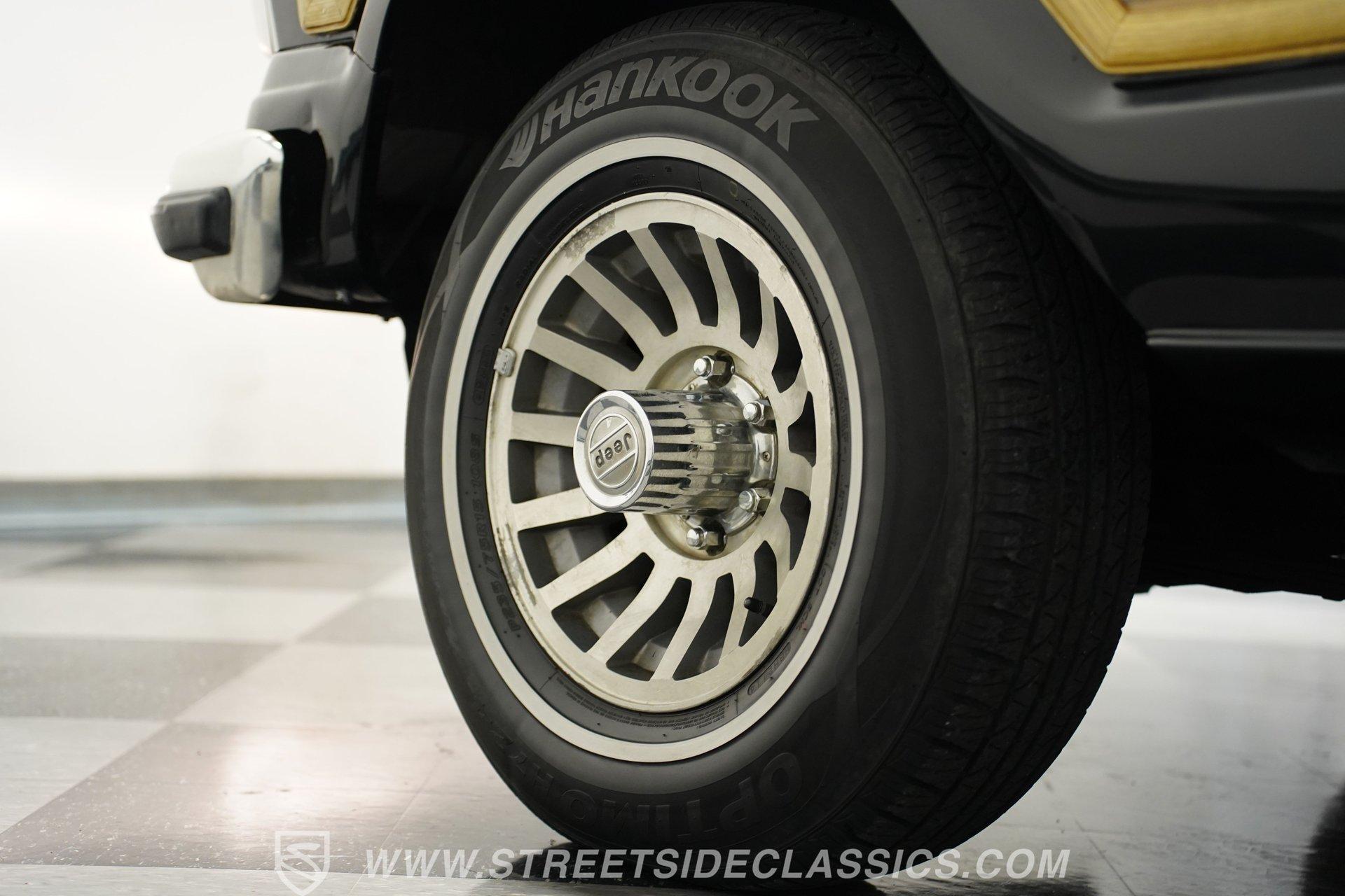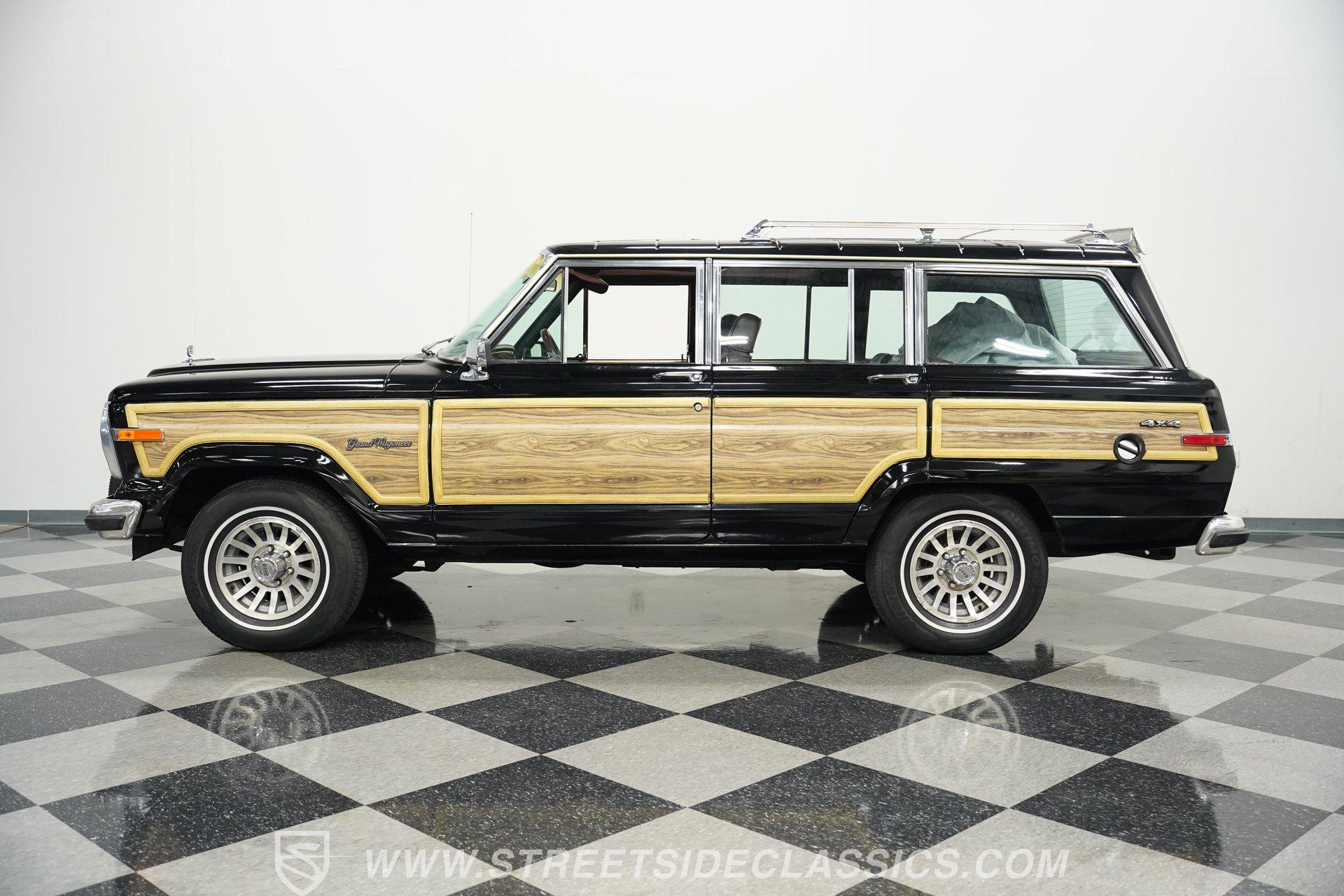 Although the CJ and Wrangler get much of the attention when it comes to Jeep vehicles, this 1988 Jeep Grand Wagoneer reminds us that the iconic manufacturer was also capable of producing a memorable luxury SUV. With only 149,521 believed actual miles on its odometer, this big sport utility vehicle is fully repainted in black, complemented by its unmistakable signature woodgrain paneling. With its full tow hitch, trailer brake controller, four-wheel-drive, and big 20-gallon fuel tank, this Grand Wagoneer is ready to go wherever your imagination can dream up. Inside, we find a mostly stock, possibly original, maroon vinyl-and-cloth interior. A folding armrest and a custom cupholder over the transmission tunnel separate a pair of plush bucket seats. A two-spoke, power-assisted steering wheel sits just ahead of a five-pod gauge cluster, featuring a square 100 mph speedometer flanked by a pair of rectangular auxiliary gauges on either side. An upgraded Pioneer AM/FM/CD/AUX head unit also offers Bluetooth connectivity, providing a significant upgrade in entertainment options over the original unit it replaces. Power seats, locks, and windows, along with a sunroof, air conditioning and cruise control, offer all the modern amenities anyone could ask for in the late 1980s. Under the hood, we find a big 5.9-liter overhead valve Jasper V-8 engine. This replacement motor has approximately 10,000 miles on it, leaving plenty of life left for its next owner. Power is routed through an A727 Torqueflite three-speed automatic transmission before heading out to either the rear wheels or all four corners via a pair of Dana front and rear axles. HIGHLIGHTS: Woodgrain Paneling Full Black Repaint 149,521 Believed Actual Miles 360 CID Jasper V8 10K Miles on Motor Single Two Barrel Carb A727 Three Speed Auto Four Wheel Drive Power Brakes Front Disc Brakes Power Steering Mostly Stock Maroon Interior Power Seats Power Windows Power Locks AC Cruise Custom Cupholder Pioneer AM/FM/CD/AUX Bluetooth Sunroof This 1988 Jeep Grand Wagoneer rides on a factory-style suspension, while power brakes featuring a pair of front discs stand ready to scrub off speed whenever needed. Whether it is to drive or collect, this woodgrain Wagoneer will forever stand out in the memories of everyone who had the pleasure of seeing it riding down the highway or over the trails. So if you have been looking for one, this is the truck for you. But don't wait, call today!