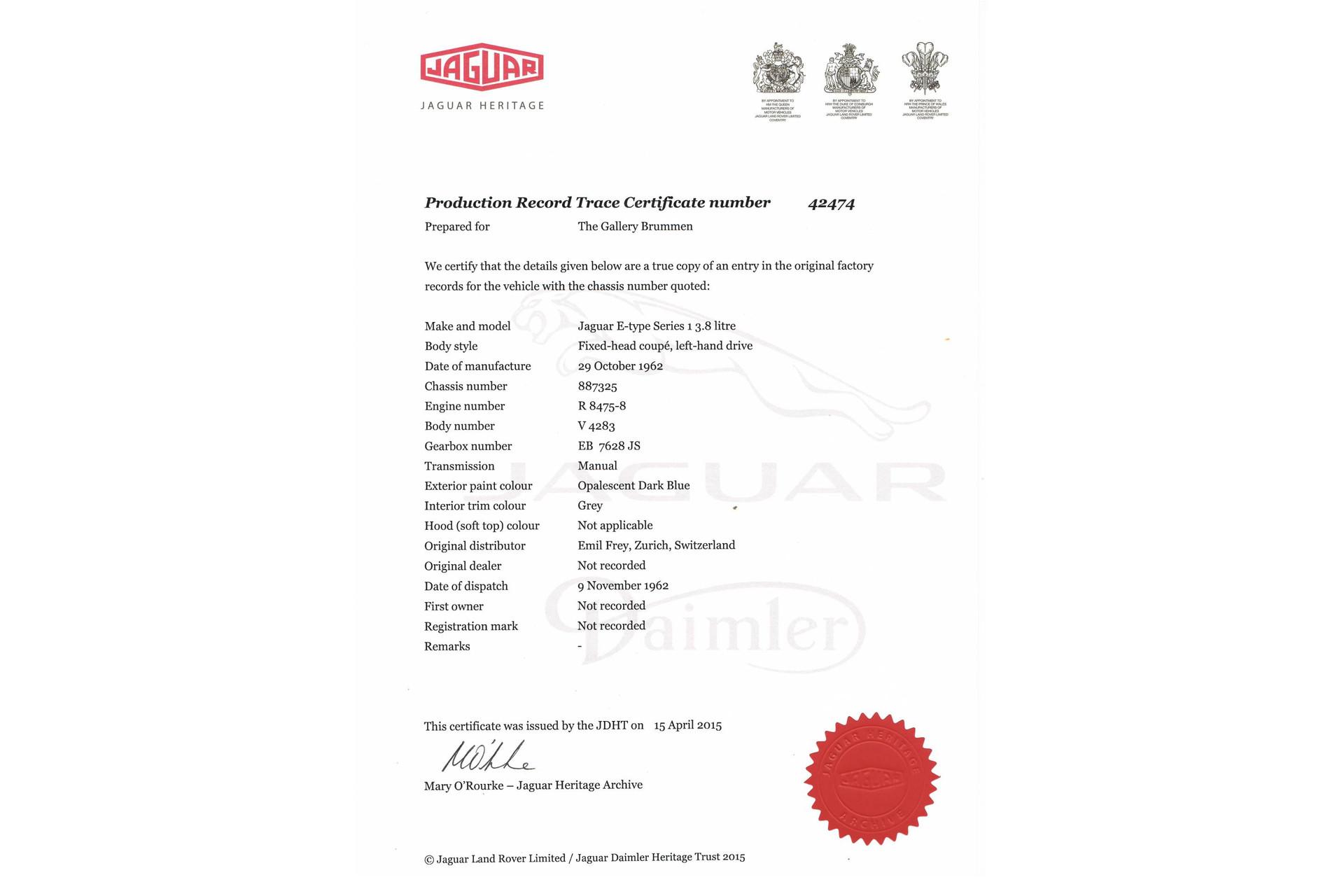 This E-Type was delivered new in Lucerne, Switzerland, to its first and only owner—a true enthusiast who purchased it as the successor to his XK150 and then cared for it with extraordinary dedication for more than six decades. The result is a car that still retains its original paint and has covered only 57,000 kilometers since new. Its complete documentation is present and verifiable, from the original purchase invoice to the service booklets and the Swiss Abgaswartung records.