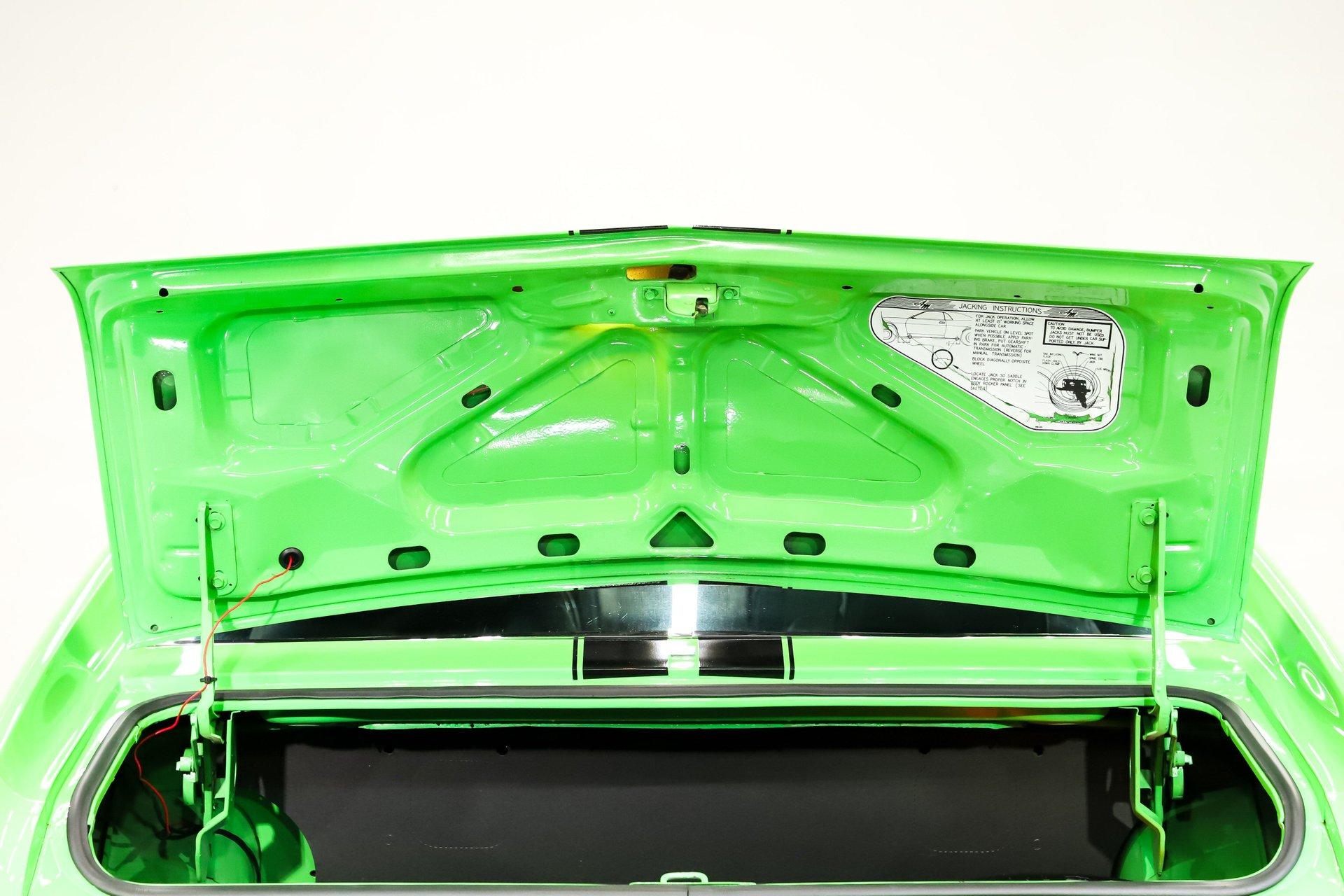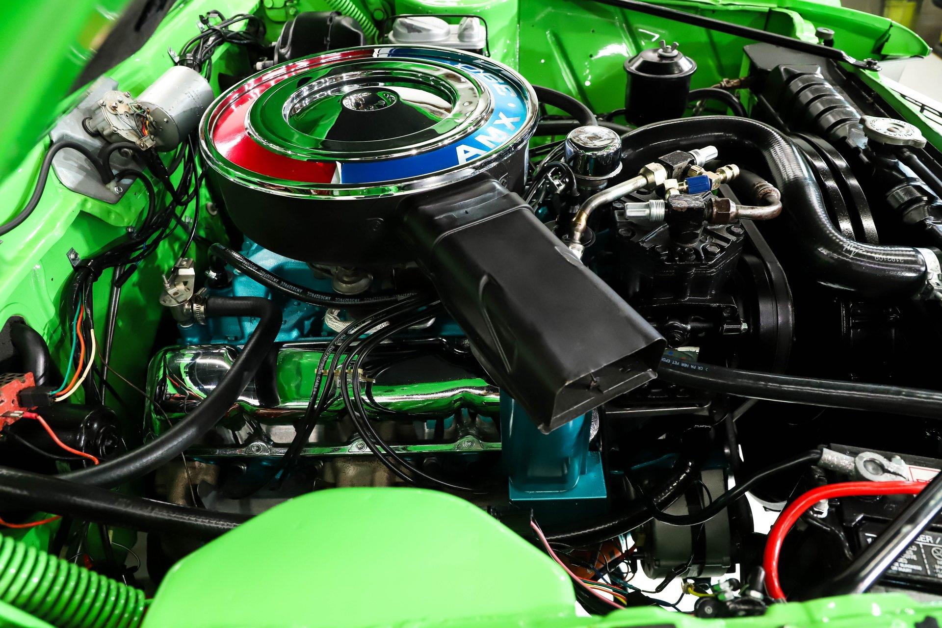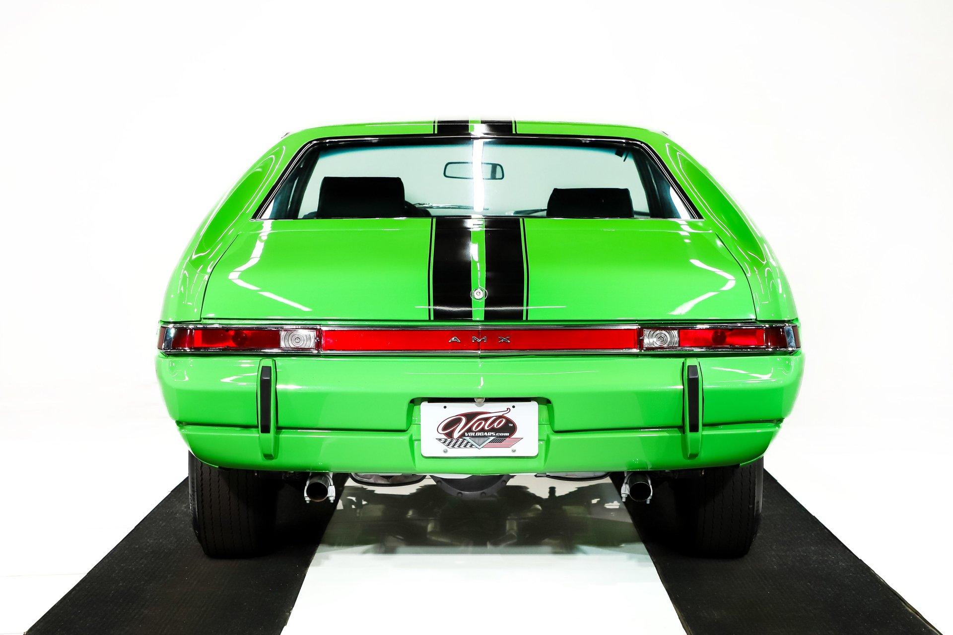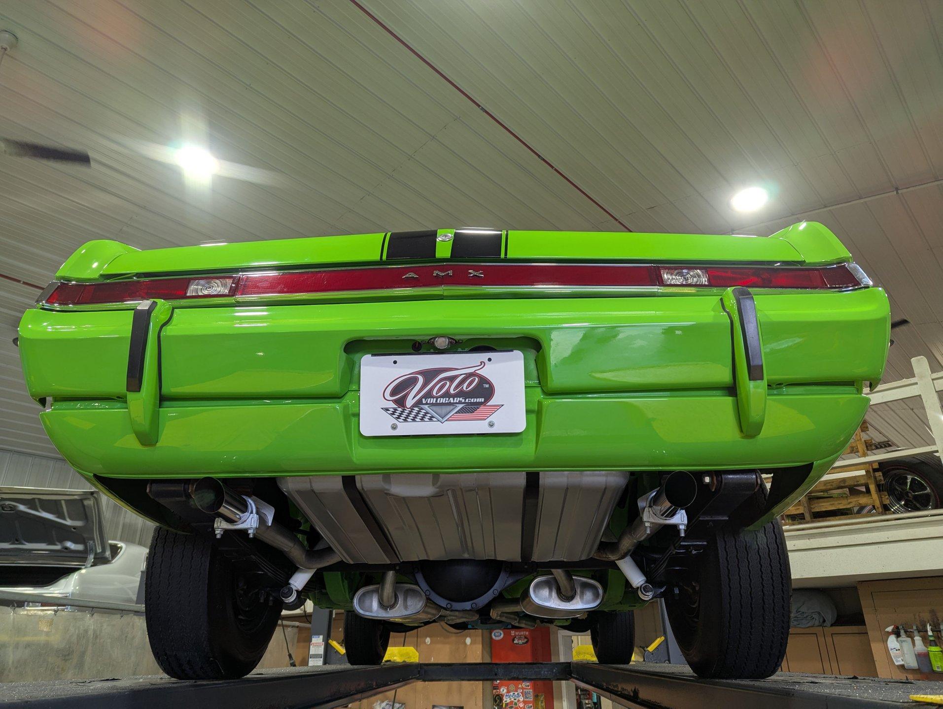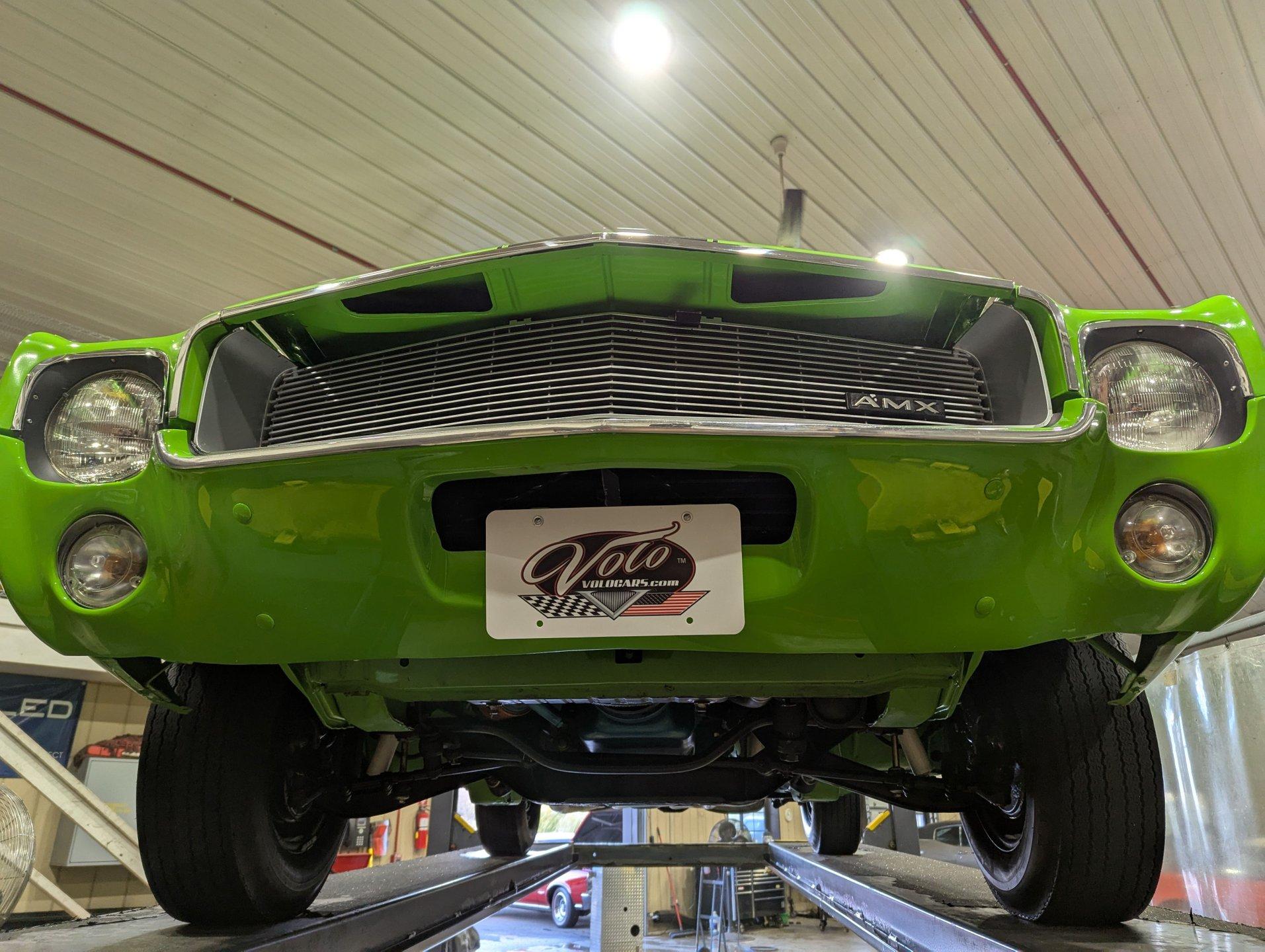 Celebrating our 65 year anniversary! This family owned and operated business was established in 1960, making us the oldest classic car dealership in America. Special thank you to all our customers for entrusting us to park the car of your dreams in your driveway while preserving automotive history for future generations to embrace and enjoy. -Grams family & Volo Museum staff INTRODUCTION: 1 of 283 Big Bad Green AMXs made! Throw in all the other factory options and this is one extremely rare car. Only 2,530 miles since the detailed rotisserie restoration. $80,000 and 5 years were invested, photos and very detailed receipts are included. Get in, turn the key, have some fun, and look badass! EXTERIOR: Make a bold statement! The Big Bad Green paint stands out in a crowd on top of being super rare. It was applied with great attention to detail and polished to a slick and shiny reflection. The black stripes are a vinyl decal just like the factory did it. When looking down the side of the laser straight body you'll be satisfied with all the smooth contours and crisp lines. The panels have been painstakingly aligned with good gaps that are well above average. Part of the Big Bad green package are the color matching bumpers and the rear is equipped with bumper guards on this one. The hood with dual bulges and fish gills provides a pleasant, yet aggressive aesthetic. The tail lights appear to have been replaced and look like new. All the brightwork has a glorious shine and the emblems are in great shape. The entire ensemble is rolling on 14” steel wheels were stripped and powder coated in the correct glitter finish, the trim rings and caps were replaced. They are wrapped in reproduction Goodyear Polyglass redline tires. INTERIOR: Nicely restored and it's a factory leather seat car! The bucket seats were taken down to bare and rebuilt. The springs were blasted and painted, then they were recushioned, and reupholstered including the headrests with genuine leather. The center folding armrest is an extremely practical option. The door panels, watershields and armrests were replaced and the driver side is equipped with a remote mirror. The gauges, steering wheel, 4 speed manual shifter, radio, and climate control all appear to be original but in great shape. The wiring harness was replaced and the clock was rebuilt with quartz movement. It is equipped with a tilt steering column. The sun visors, headliner and carpet have all been replaced. It also has really nice AMX embroided floor mats. Behind the seats has been properly recarpeted and upgraded 5.5” speakers were added. The kick panel lights and clock are also working. ENGINE COMPARTMENT: What a proper looking engine bay! The 390 cubic inch V8 was completely remachined and is making at least 315hp. It is handsomely dressed with a chrome AMX pie tin and chrome valve covers too. Very well equipped with factory air conditioning, power steering, and power brakes. The a/c was rebuilt, wiper system was rebuilt. All the hoses and belts have been replaced. The horns and squirters are hooked up plus it even has the original style washer fluid bag. The battery is properly secured and the radiator appears to be rebuilt or replaced. The underside of the body color painted hood is complete with insulation. Additionally the fenderwells and firewall have been painted just like the exterior. TRUNK COMPARTMENT: The underside of the trunk lid and inside the jamb are painted slick just like the body. The weather stripping was replaced and the trunk light works. Inside had a space saver spare tire on a powder coated rim, inflation canister, and vinyl trunk mat. Under the mat is all rust free solid steel that is painted body color as well. UNDERSIDE: Rotisserie restored! Solid body colored floorboards! Every detail has been attended to on the underside. The steering system has been rebuilt, and many components were replaced. It is equipped with a sway bar and the front suspension fully restored with new parts including trunnion springs and shocks. The rear suspension was also restored with new leaf springs and shocks too. It has refreshed front disc brakes with new lines and the emergency brake is hooked up too. The dual exhaust system was completely replaced with fresh tubes, mufflers, and polished tips exiting under the rear bumper. The gas tank was also replaced and has new fuel lines front to back. When looking up at the rebuilt engine it is nicely painted metallic blue just like when it left the factory, and the starter was replaced. The four-speed manual transmission was rebuilt by Southern Gear. The driveshaft has been rebuilt and transfers power back to a rebuilt 3.54 Twin Grip rear end. SERVICE: We take pride in our cars and reputation. Therefore, we built a 2 million dollar, 10,000 square ft service center, and hired a team of technicians to service the essentials on every car we sell. CONCLUSION: This AMX checks all the boxes! It's extremely rare, it's rotisserie restored, it's fully loaded, and it's gorgeous! Not to mention fast and fun! For nearly 30 years, I, Jay Grams, have personally written the highlights for almost every car in our collection. What I provide is my professional opinion based on my experience with these vehicles. However, opinions can vary, and I strongly recommend a personal inspection to form your own view. Our sales team is always available to answer any questions you may have. One great option is to request a personalized walk-around video, where we can showcase the car and share our team’s insights. **Our cars are displayed within a museum setting. If you are interested in a specific vehicle, please schedule an appointment with a salesperson to view it. Without an appointment, there is an admission fee to enter the showroom. If you decide to purchase a car, your admission will be refunded, and you'll receive a one-year museum membership. ☎️ 815 385 3644 9-5 central ? Sales@volocars.com Answered ASAP Air conditioning Power s