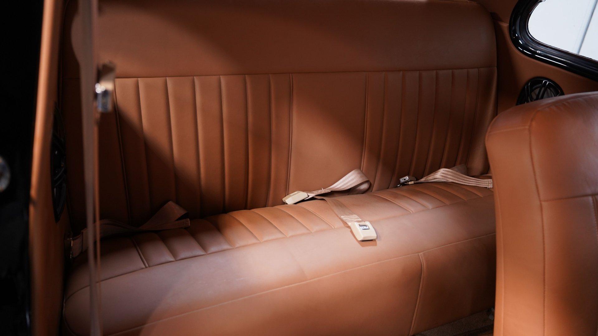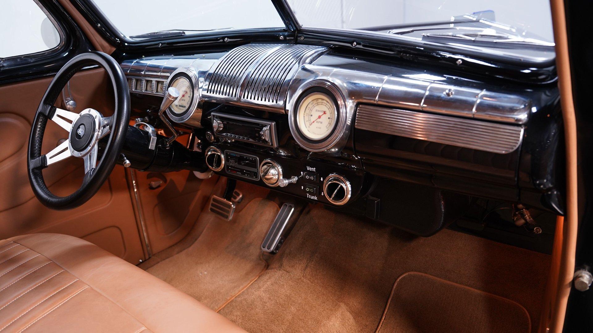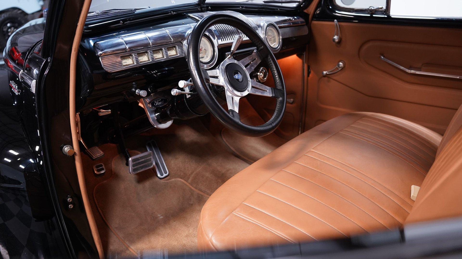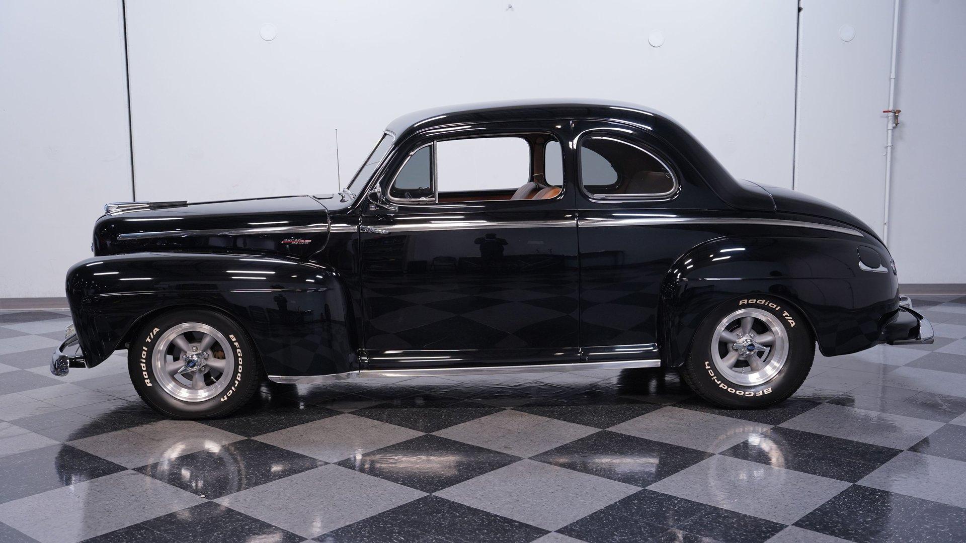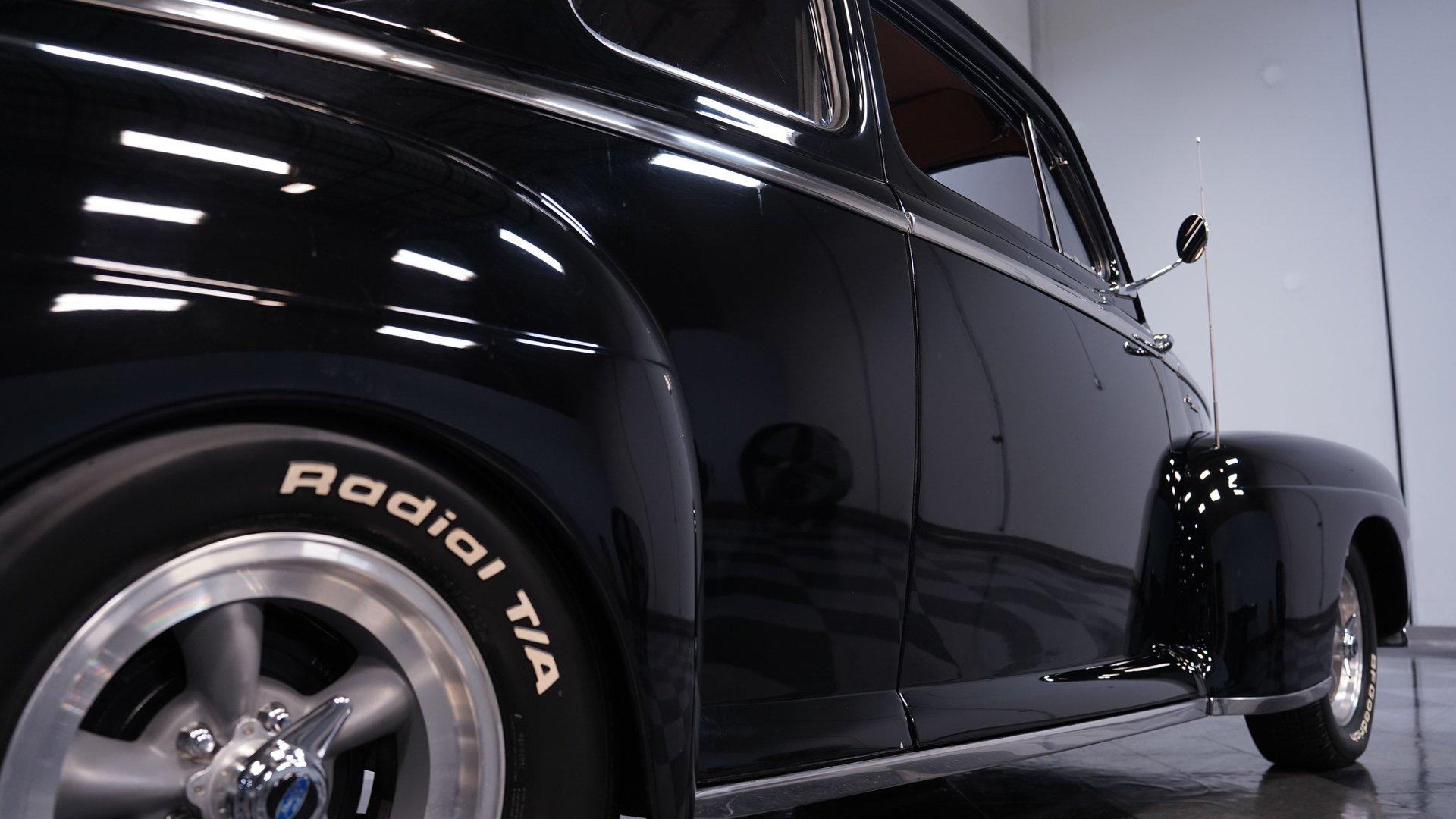 With its outstanding array of chrome trim nearly radiating against its dark metallic background, this 1947 Ford Deluxe Coupe marks its manufacturer's artistry at an important point in its evolution. This is a great-looking ride that's just chock full of post-war automotive style. And with just a little more than 2,000 miles logged on its build, it's in top-notch condition both inside and out and features some key upgrades that enhance its drivability while adding a distinctive restomodded touch to its already magnetic appearance. Its stunning black paint is looking sharp, ornamented by custom pinstriping and really showing nicely. Upgraded headlights illuminate the road ahead, while frenched taillights add a standout look from the back. Climb in and you'll be surrounded by a showpiece of an interior, with a split bench seat in front and a bench seat in back whose tan vinyl surfaces are in just the pristine shape you might expect from this classic's light usage. Some great details on display in this cabin show just how innovative designers were during this era. In front of the aftermarket wheel perched on its tilting column, the expansive chrome instrument panel is a strong example, with its notched surfaces surrounding a collection of Classic Industries gauges that blend perfectly with their surroundings. There's a Vintage Air climate control system on board to keep you and your passengers comfortable throughout the year, and a JVC AM/FM/CD stereo sits at the center of the dash to offer a quality audio experience. This stylish Ford features an array of mechanical components that make it well-suited for frequent driving in everyday conditions. Its 327-cubic-inch V8 sits at the center of a well-maintained engine compartment and is fed by an Edelbrock 4-barrel carburetor perched on top of an Edelbrock Performer intake manifold. Tap on the accelerator, and it sends a deep, resonant exhaust note out of the shorty Headman headers leading to a pair of FlowMaster mufflers. The added Mustang II front end brings a host of benefits, including adjustable coilovers, power rack and pinion steering, and power front disc brakes that provide fade-resistant stopping ability. An MSD coil has been added to the mix to maximize available spark, and there's an aluminum radiator up front to help keep operating temperatures under control. HIGHLIGHTS ONLY 2146 ON THIS BUILD 327-CUBIC-INCH V8 ENGINE 4-BARREL EDELBROCK CARBURETOR AND INTAKE MANIFOLD 3-SPEED AUTOMATIC TH350 TRANSMISSION MUSTANG II FRONT END POWER RACK AND PINION STEERING POWER BRAKES, WITH DISCS UP FRONT SHORTY HEADMAN HEADERS DUAL EXHAUST, WITH FLOWMASTER MUFFLERS OUTSTANDING BLACK EXTERIOR UPGRADED HEADLIGHTS FRENCHED TAILLIGHTS SUICIDE DOORS TAN VINYL UPHOLSTERY SPLIT BENCH FRONT SEAT JVC AM/FM/CD STEREO AIR CONDITIONING A great combination of post-war style and modern drivability, this 1947 Ford Deluxe Coupe cruises on a set of 15" wheels with Ford-emblazoned knock-off style centers and is waiting to escort you on miles and miles of future asphalt adventures. Call today!